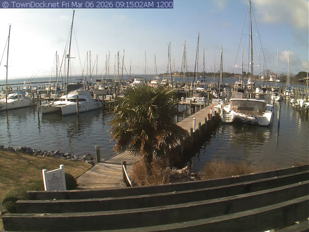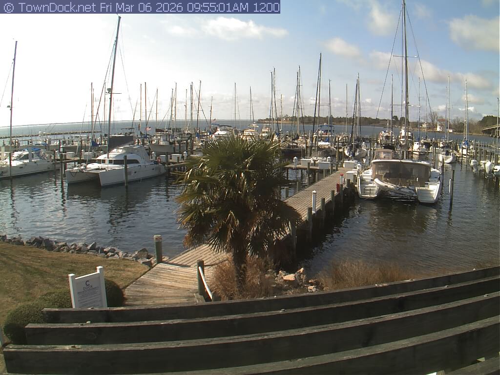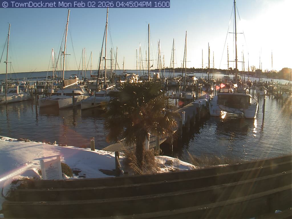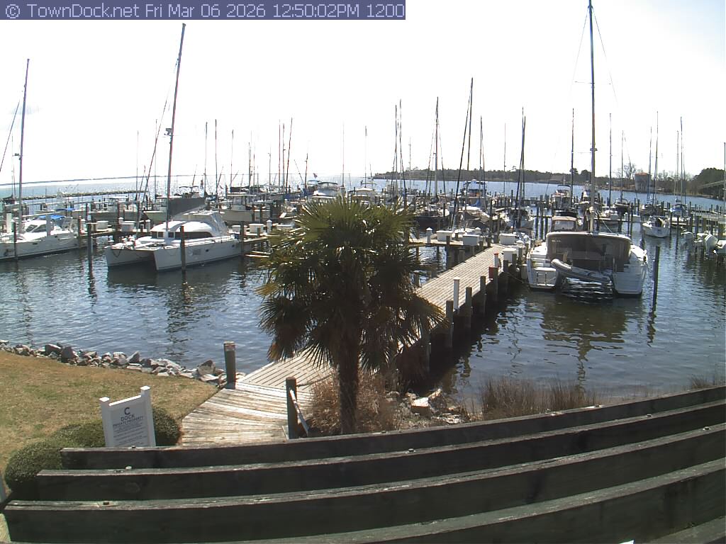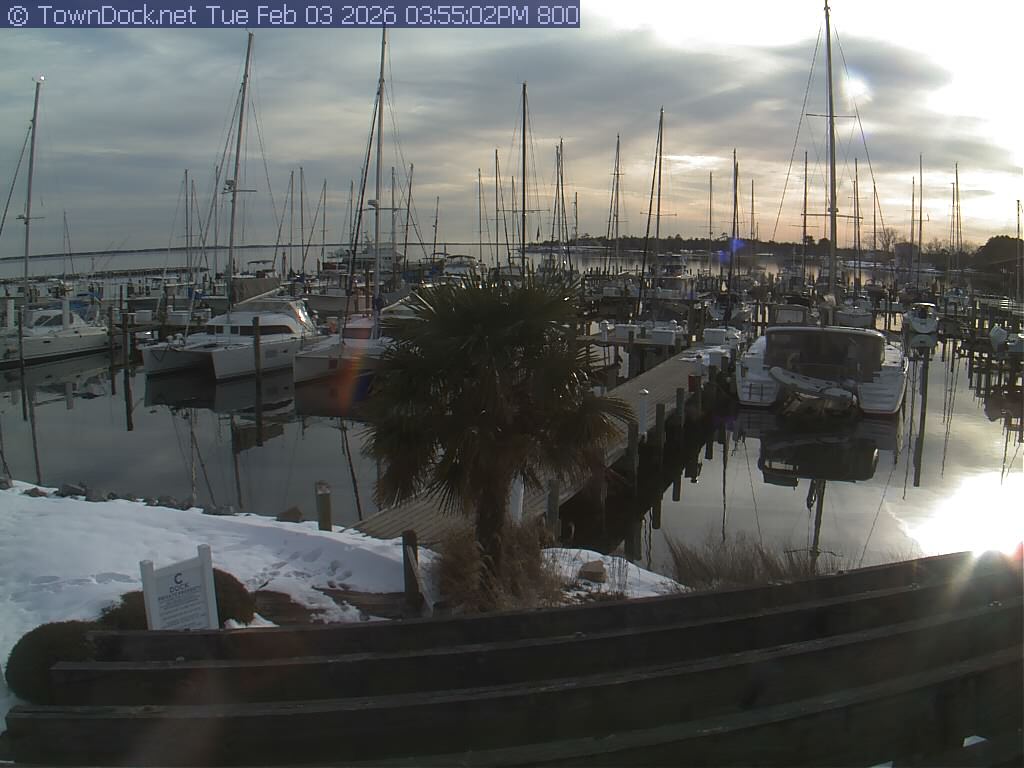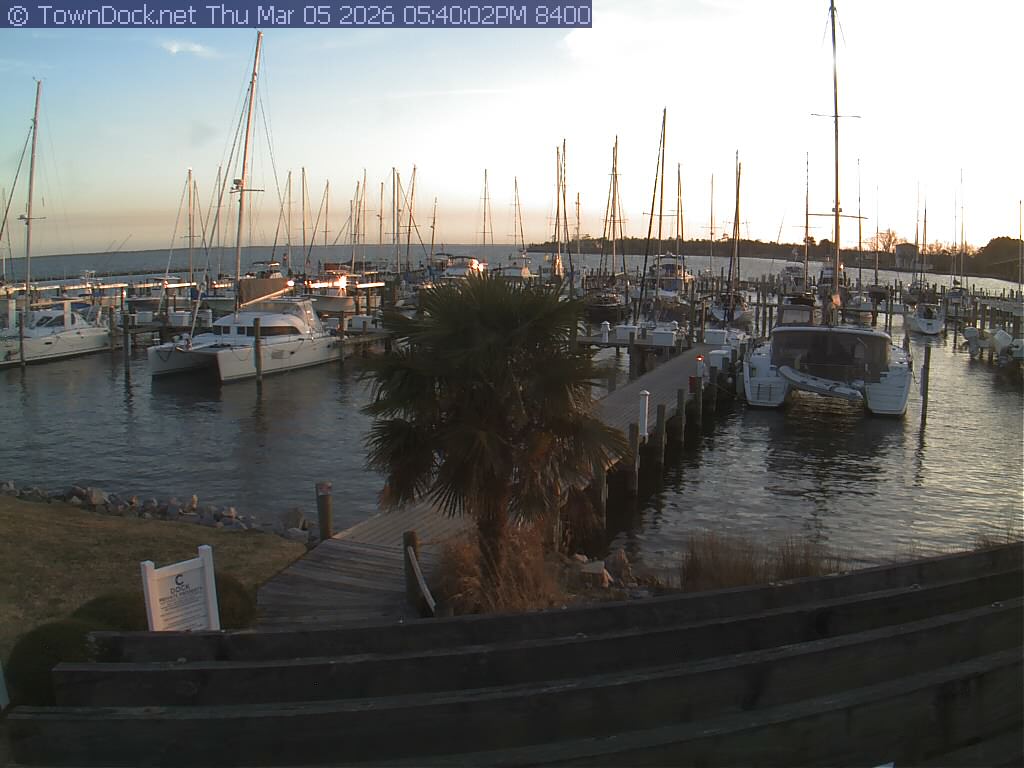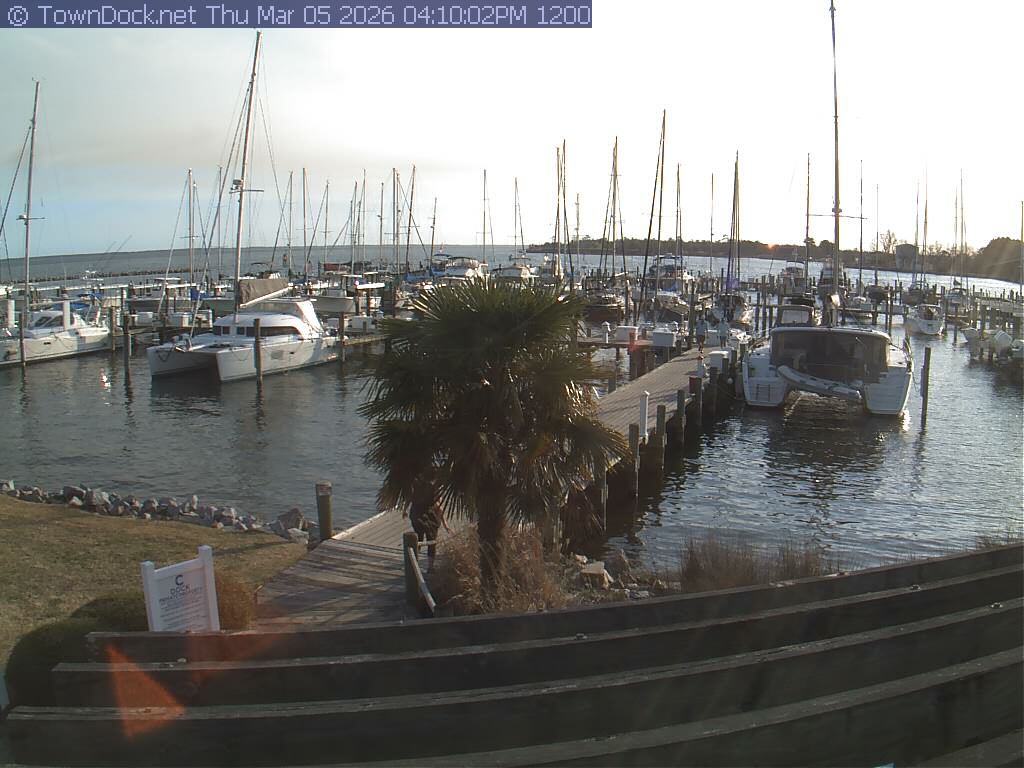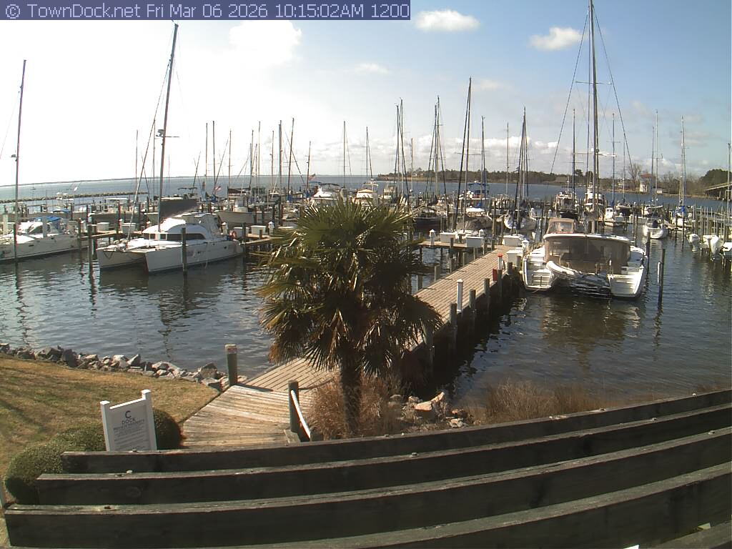 shows Oriental Harbor Village Marina, with the Oriental anchorage & Neuse River in the background. OHVM Cam takes a new picture every five minutes from dawn til just before dusk. Click on the image to see a larger version. Once you see that larger version, you can click (see arrow at right) to go back in time and see recent photos. Harbor Cam currently takes photos from 6:30am to 5:30pm.