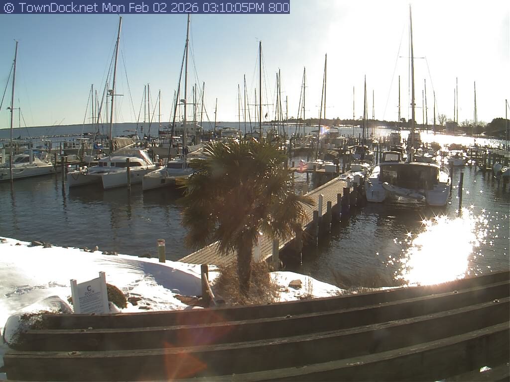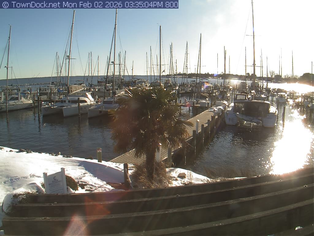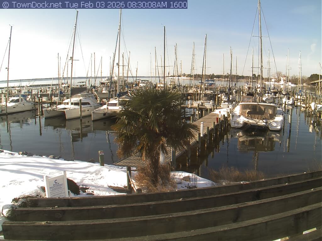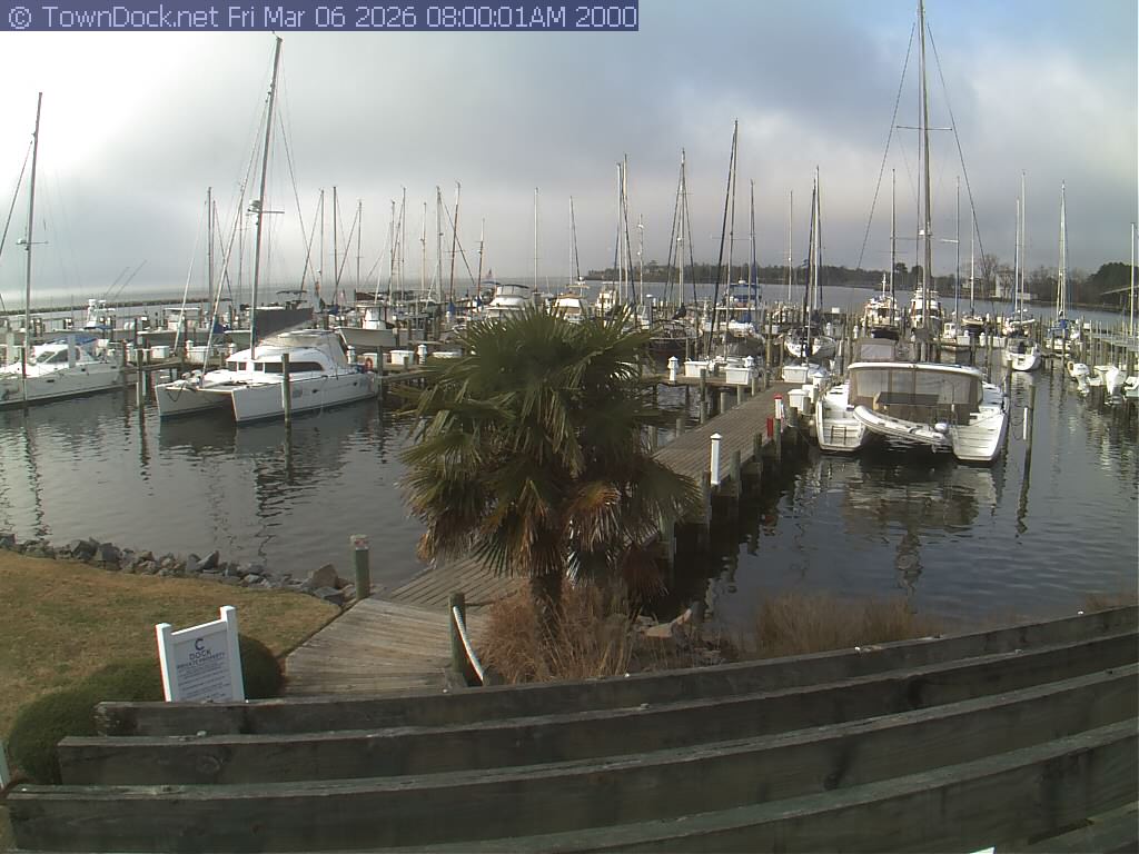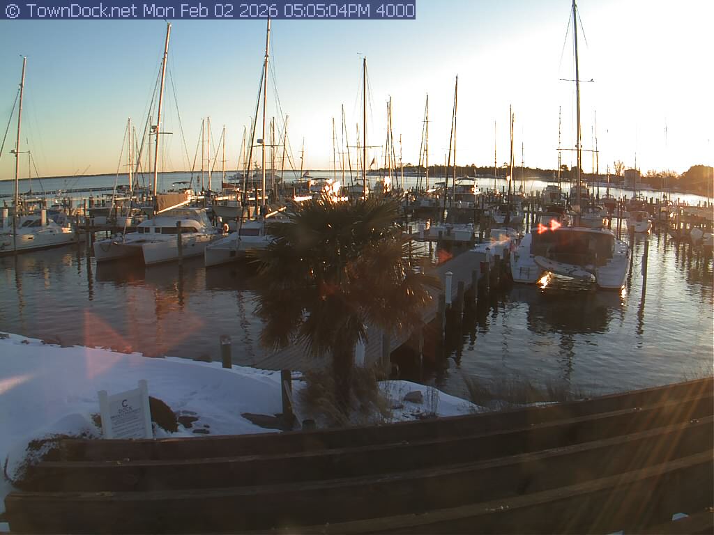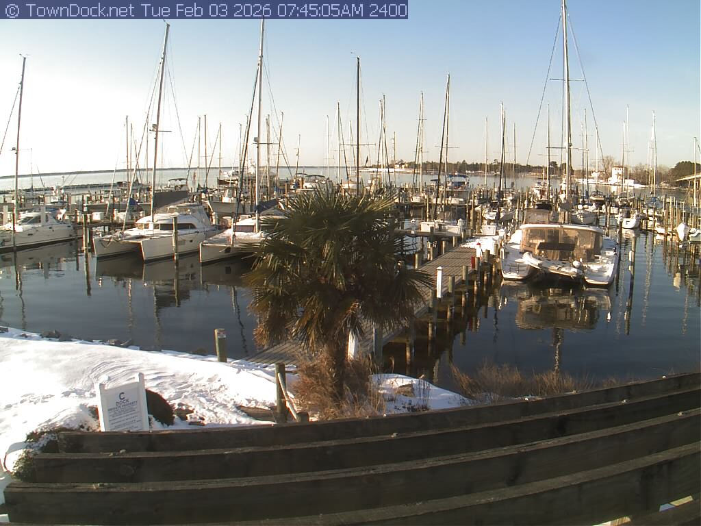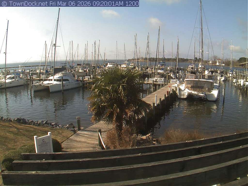 shows Oriental Harbor Village Marina, with the Oriental anchorage & Neuse River in the background. OHVM Cam takes a new picture every five minutes from dawn til just before dusk. Click on the image to see a larger version. Once you see that larger version, you can click (see arrow at right) to go back in time and see recent photos. Harbor Cam currently takes photos from 6:30am to 5:30pm.