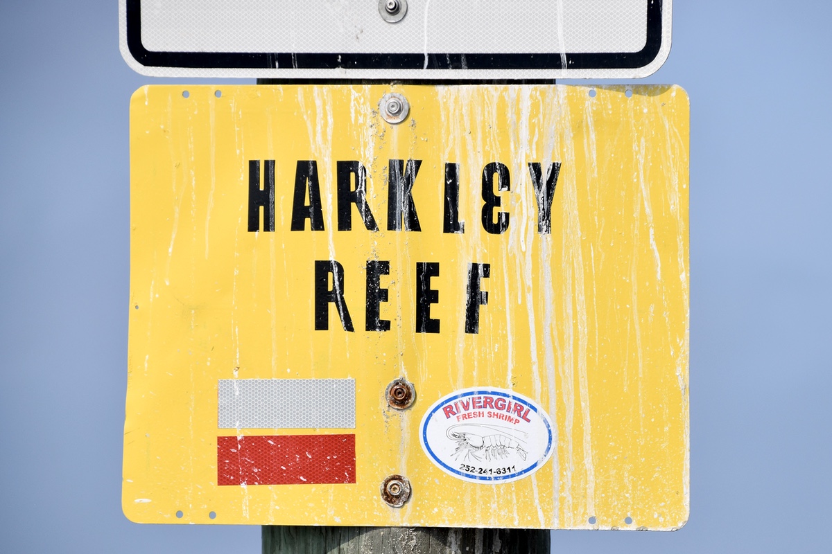 There’s a new marker on the Neuse. You’ll find it beyond the Garbacon Marker, near the entrance to South River. Someone (not the Coast Guard) went to considerable effort to mark “Harkley Reef”, and its generous speed limit. (click the sign for more views and a chart)
