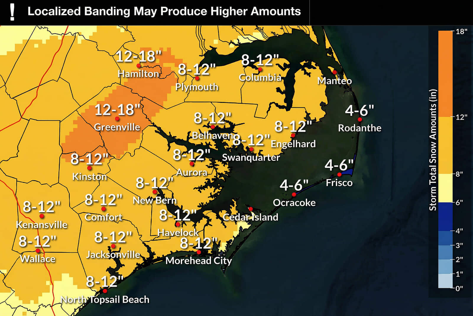 Fri 4p: The latest snow forecast, 8-12 inches. Max snowfall will be late Saturday night through Sunday morning. NOAA says “worst case” for Oriental: 14 inches. TownDock Senior Management refers to that as “best case”.
