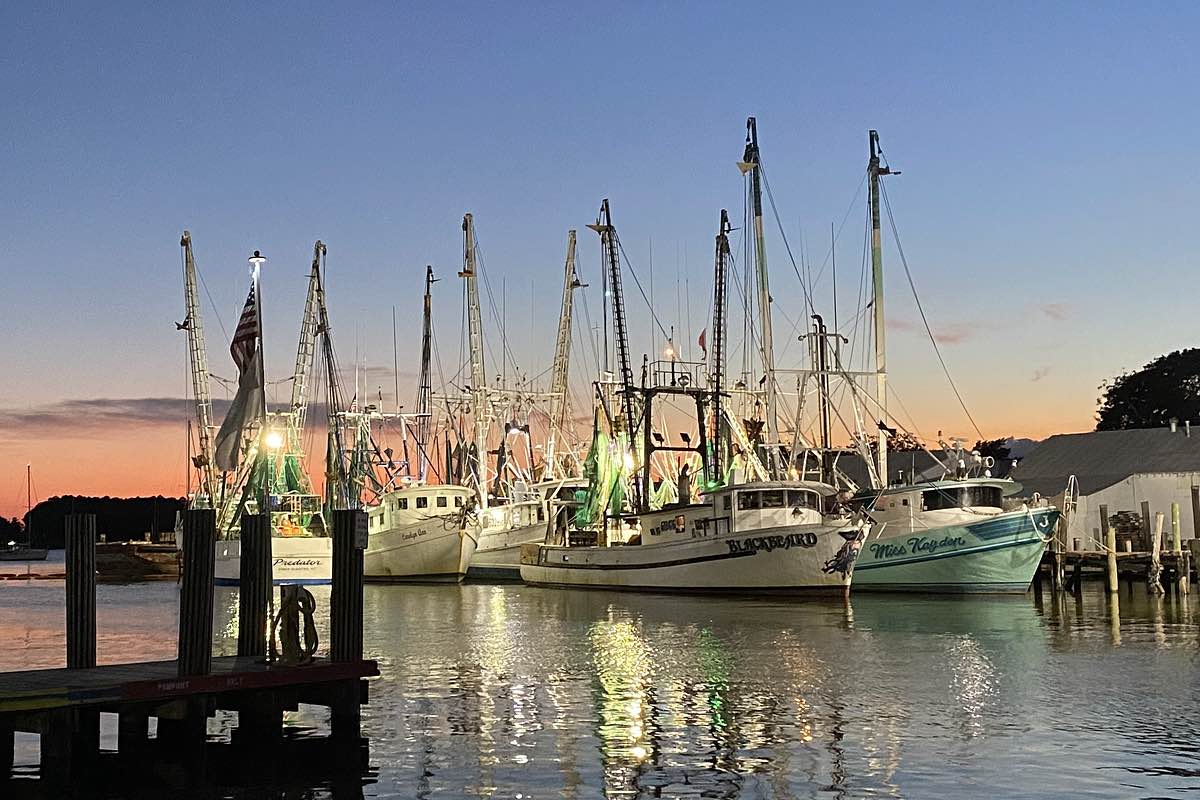 Trawlers at the Garland-Fulcher docks, lit up at sunset. (Christel Monmoine photo)