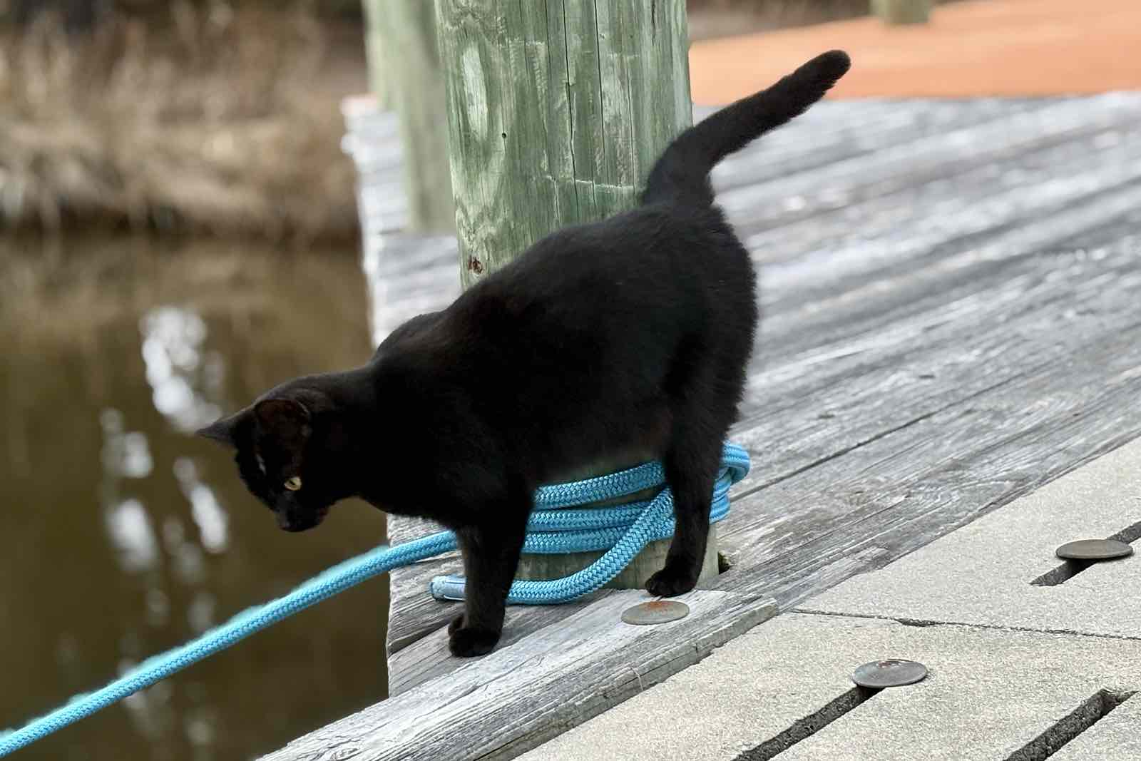 Luna, at home on the docks.Luna, the January Pet of the Month is a short haired and muscular, three-year-old, all black (aka Bombay) cat. With eyes as green as the grassy marina grounds she roams. Her black coat, in certain spots, is starting to toast brown from the endless locations to lay in the sun. Though still lean, her primordial pouch has also begun to form, bouncing ever so slightly as Luna wanders between her preferred sun bathing sites.