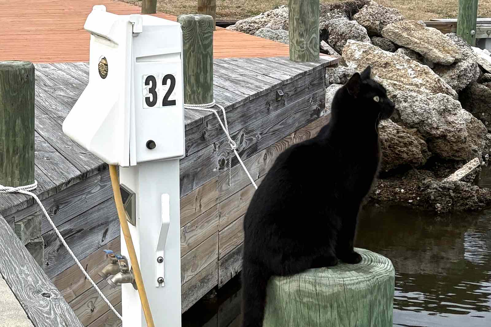 Perched on a piling, Luna surveys the water around Marine Craft.“Luna loves to be scratched and petted on pretty days by the residents and guests at Marine Craft,” said Lisa Spicer, owner and operator of the Marine Craft Supply store on site. “She is cautious of newcomers but quickly warms up. You’ll know when she wants attention because she will sashay over, meowing and head bunting for affection.”