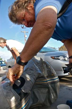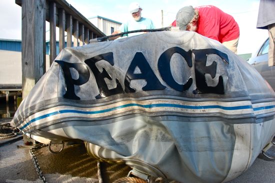 Annie Clement gets to work, salvaging the five letters, PEACE. They’d been cut from an already curbed inner tube and were a good fit on the curve of the Avon. A little adhesive, she said, and they’ll be on the new dink.At the Farmers Market just down the street, Jayne Stasser was selling biodegradeable bags and said she saw the “Emily Brooke“s bow approaching and thought, “That’s so pretty.” Then, a second later, another thought: “No that’s not. It’s coming in too fast.” Linda Parker said it brought to mind one of the “Airport” movies where a 737 plows through an airport terminal.