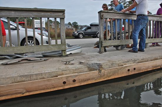 The trawler “Emily Brooke” hit the concrete wall at Oriental’s Town Dock around 8:45 Saturday morning. The 83-foot long trawler crushed a 9-foot inflatible dinghy that visiting cruisers had tied to the wharf just moments earlier.