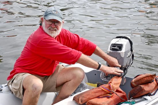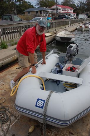 Neville Clement, after tucking the gear from the crushed dinghy in to the brand new one that the trawler owner bought for him.A few hours later, Neville Clement was transferring the life jackets and other gear from the busted dink to the replacement. He and Annie were singing the praises of how folks had pitched in. It was, said Annie, “a nice ending to the morning.”