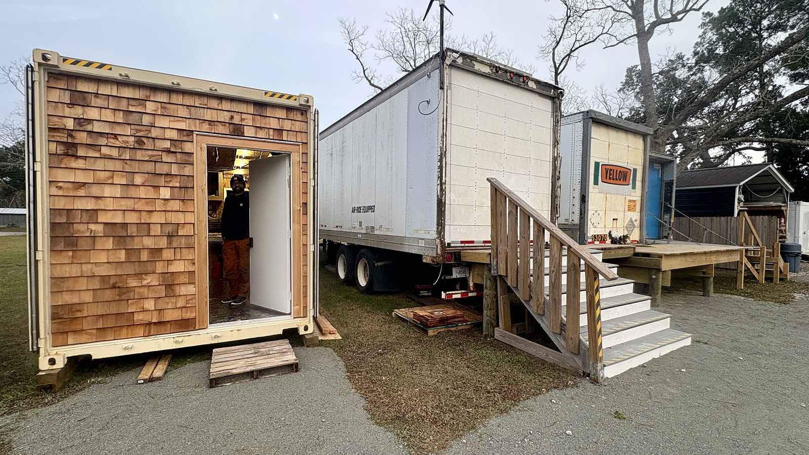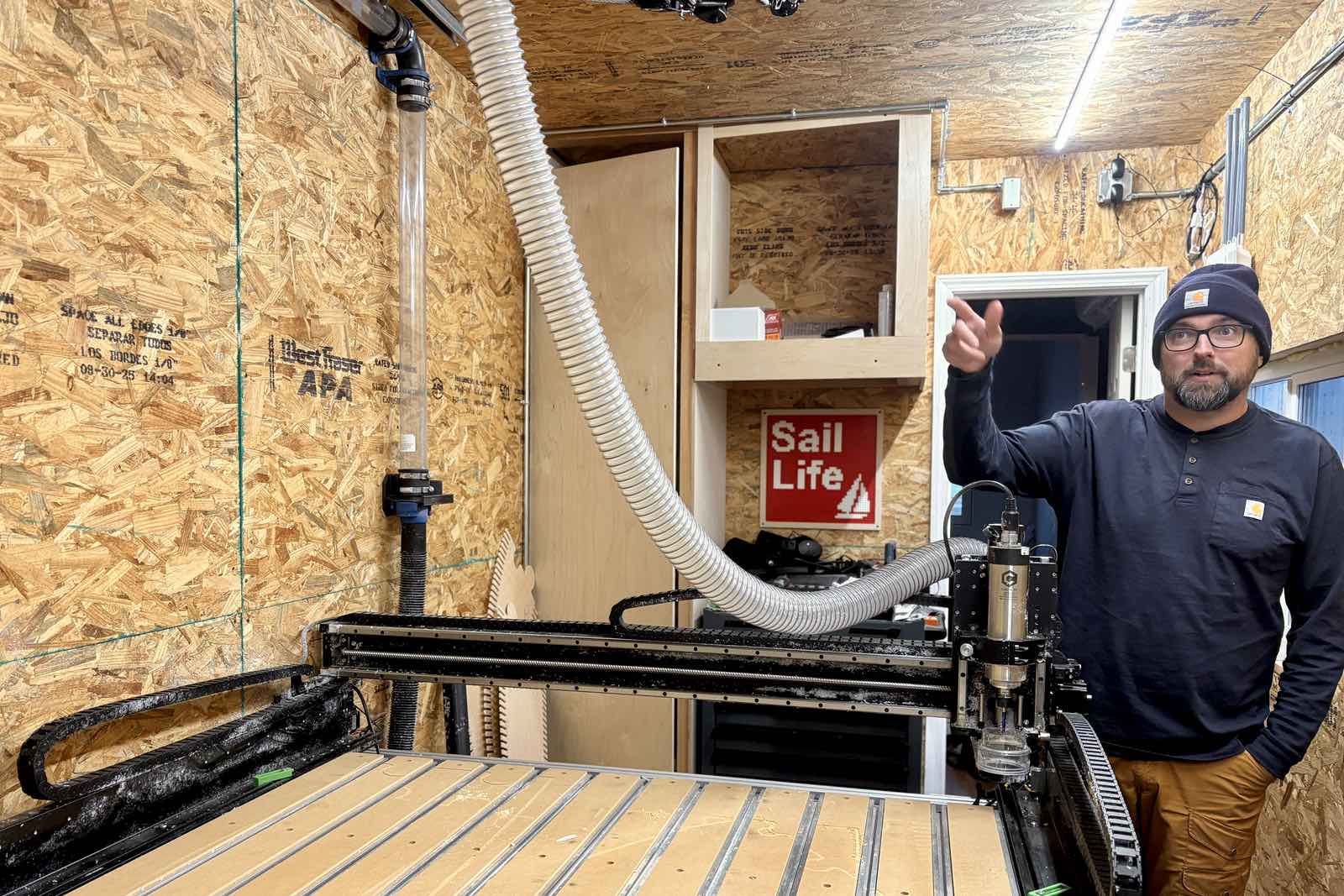 Mads explains the customized collection system for the C&C machine – another DIY project that made it onto the Sail Life channel.An impression that could last a lifetime. Officially arriving by boats ( Athena and Spiffy) in July and August 2025, and launching The Box in September, the Sail Life crew is currently scouting property to purchase in Pamlico County. By Spring 2025, the plan is to haul the catamaran, shipping container, plus a second container, to the land they purchase and finish the rebuild there over the following four years or so.