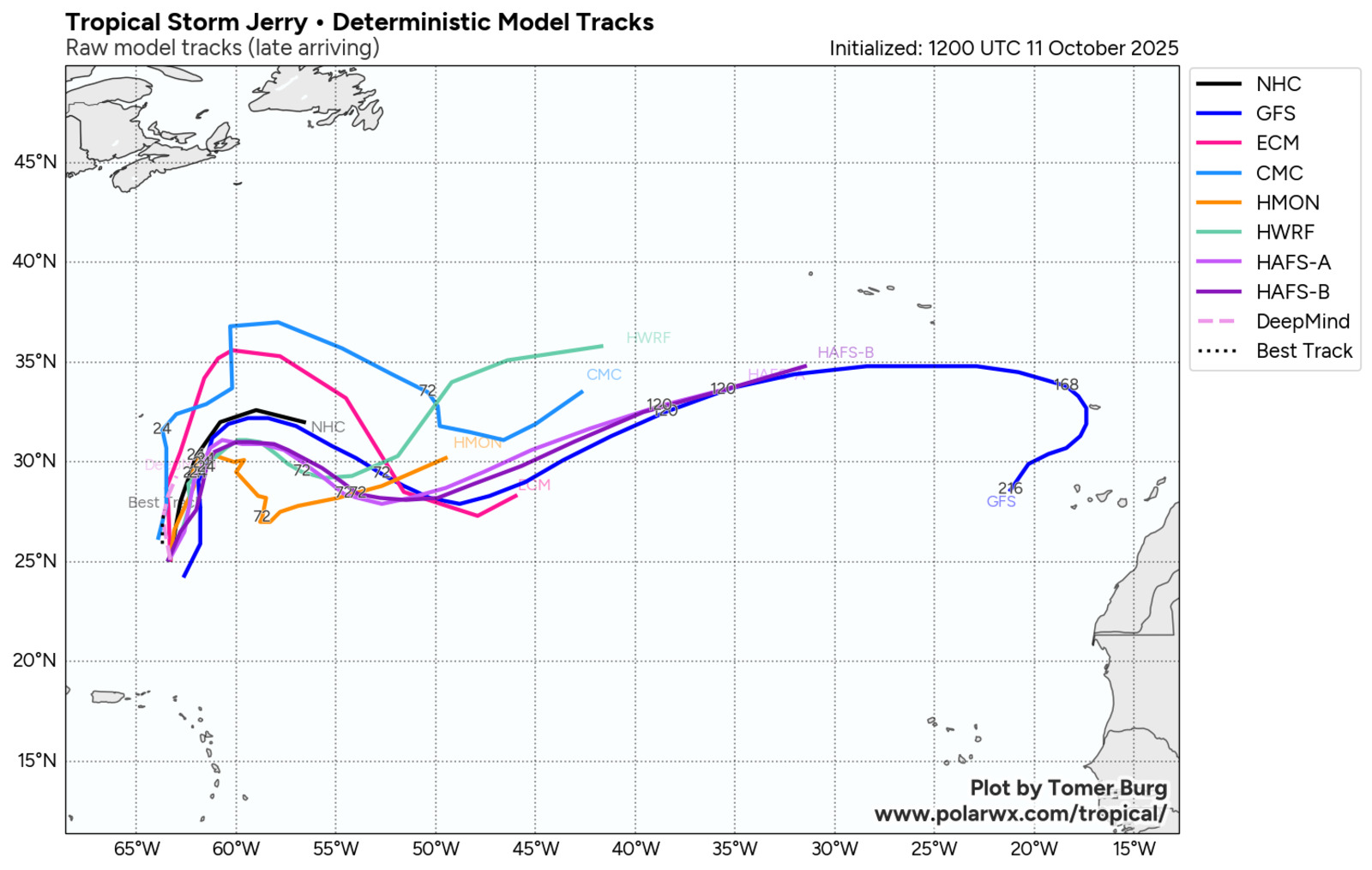 Remnants Of Jerry Discussion Number 18 NWS National Hurricane Center Miami FL AL102025 500 PM AST Sat Oct 11 2025 A combination of scatterometer data, GOES-East derived motion winds, and a recent GPM microwave pass seems to confirm that Jerry does not have a well-defined center and has degenerated into a trough with deep convection located at the southeastern end of the axis. As a result, this will be the last NHC advisory on this system. Maximum winds are estimated to be 40 kt based on ASCAT data from this morning. The rough motion estimate is northward, or 360/14 kt. The remnant trough is expected to move northward and then northeastward, with the European, Canadian, and UKMET models showing it merging with a frontal boundary to its north in 24-36 hours. Gale-force winds are likely to continue to the east and north of the trough until it merges with the front. The GFS continues to keep the remnants as a distinct feature, but given that its initial position of the remnants is too far to the southeast, it is still considered an outlier solution. Additional information on this system can be found in High Seas Forecasts issued by the National Weather Service, under AWIPS header NFDHSFAT1, WMO header FZNT01 KWBC, and online at ocean.weather.gov/shtml/NFDHSFAT1.php FORECAST POSITIONS AND MAX WINDS INIT 11/2100Z 27.6N 63.6W 40 KT 45 MPH 12H 12/0600Z...DISSIPATED $$ Forecaster Berg |