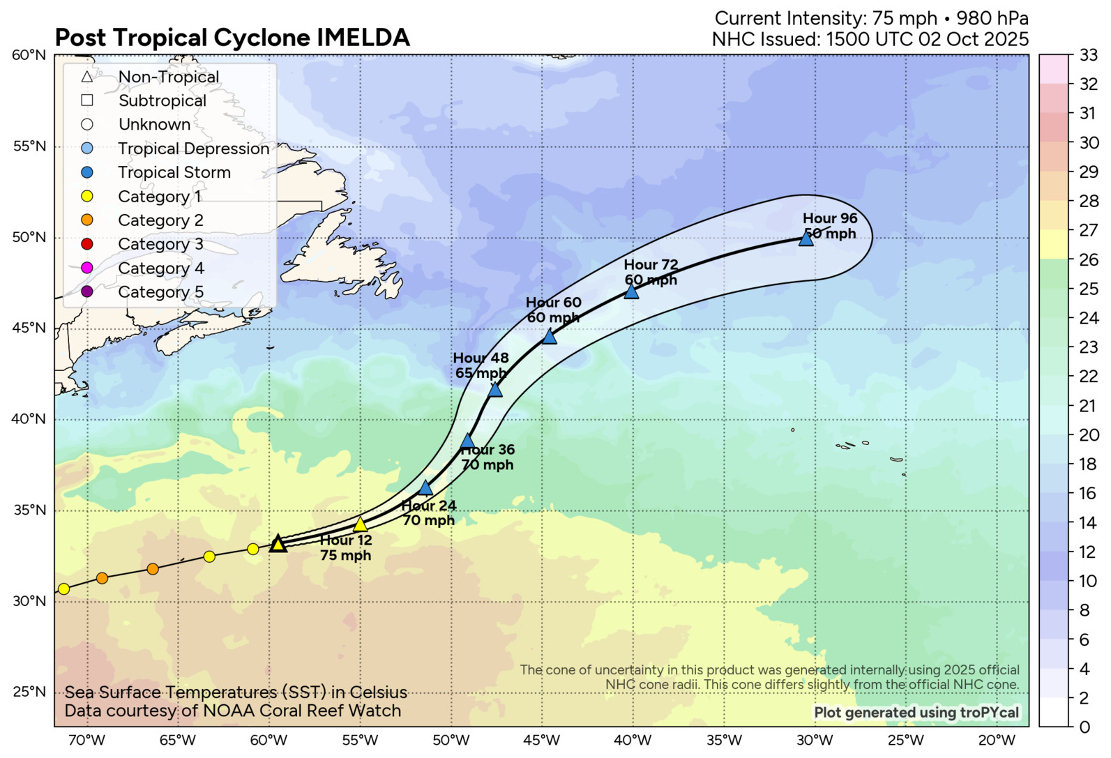 | 1500 UTC THU OCT 2 2025 | 33.2N | 59.5W | ENE | 29 | 980 | 75 |