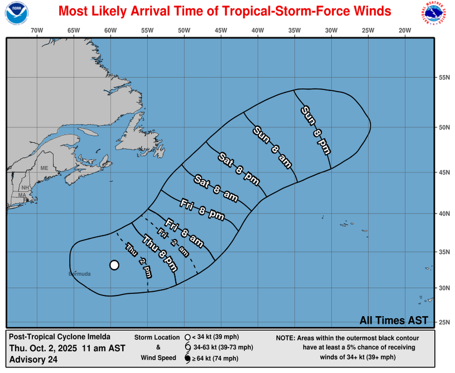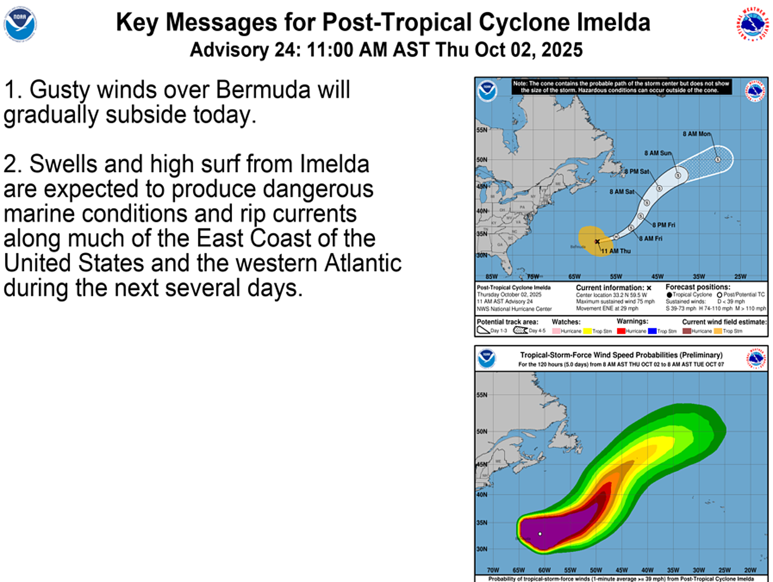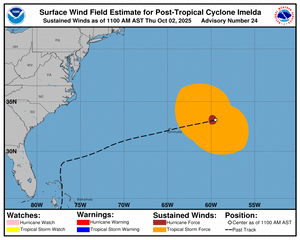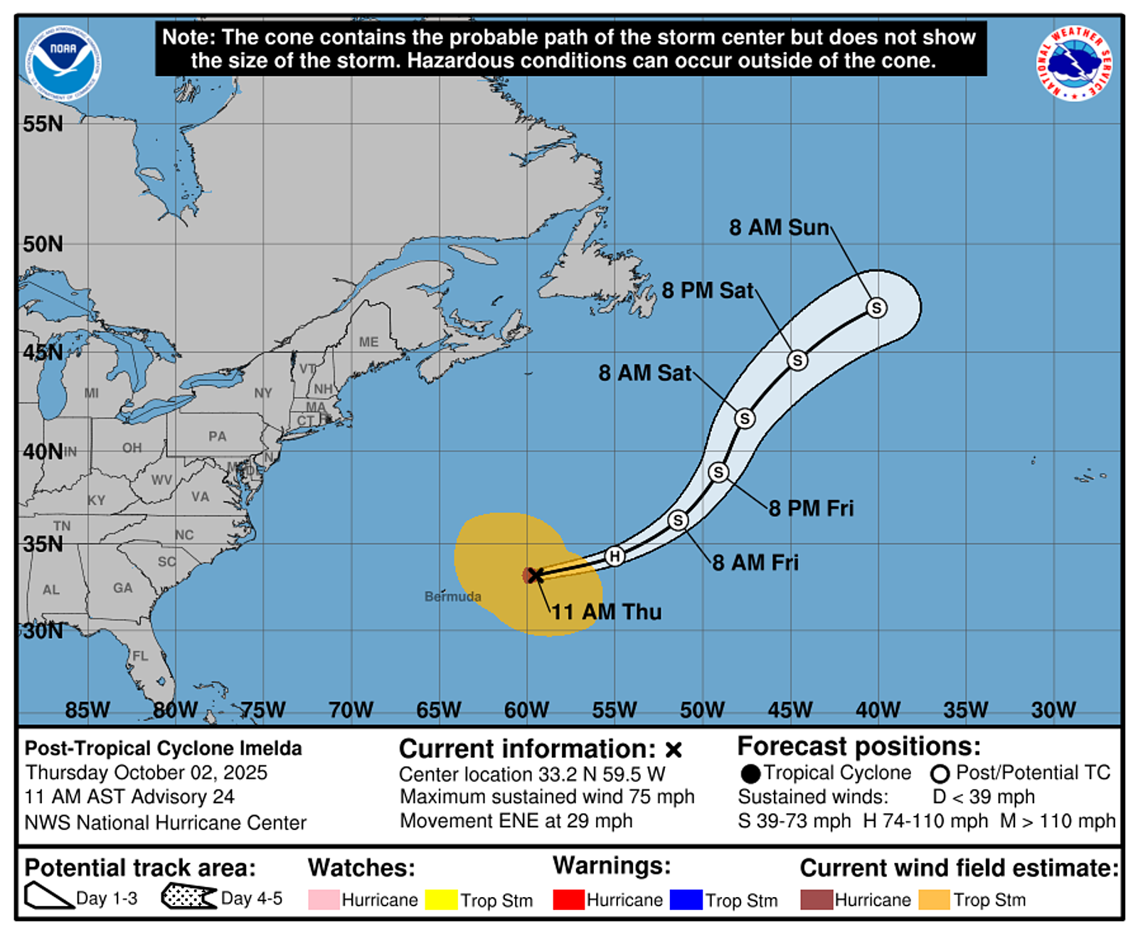 | 24 | 1500 THU OCT 2 | Category 1 Post-Tropical Cyclone Imelda | 33.2N | 59.5W | ENE | 29 | 980 | 75 |