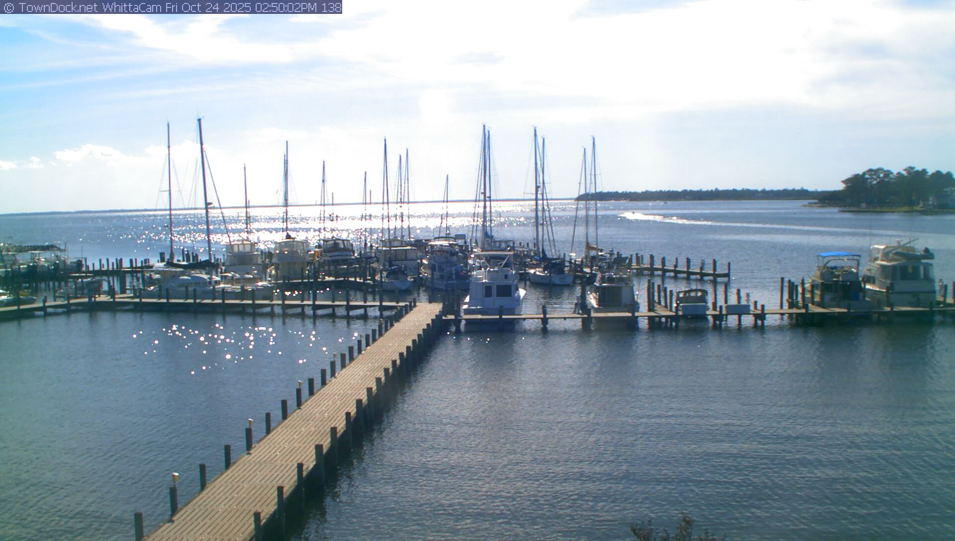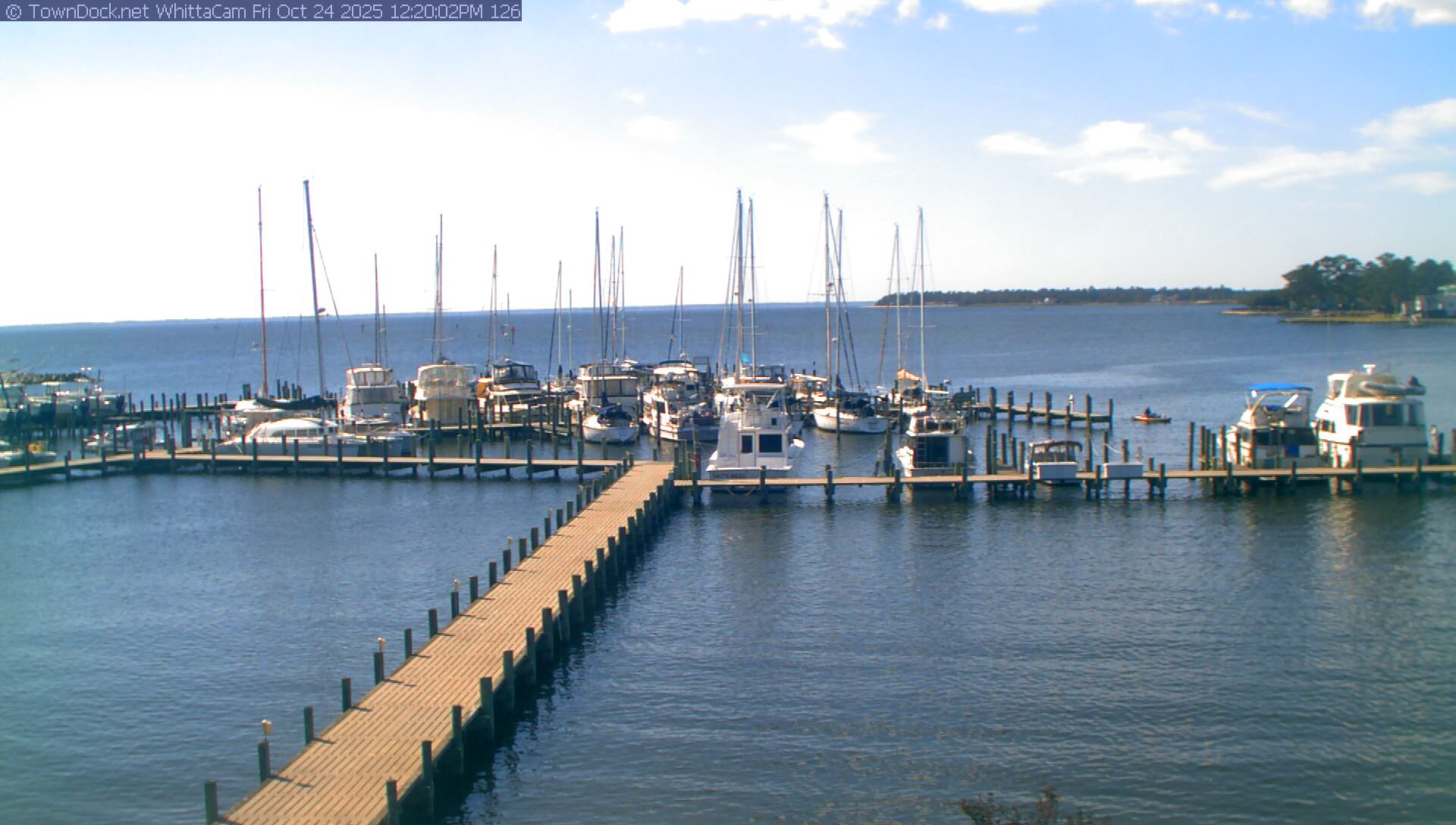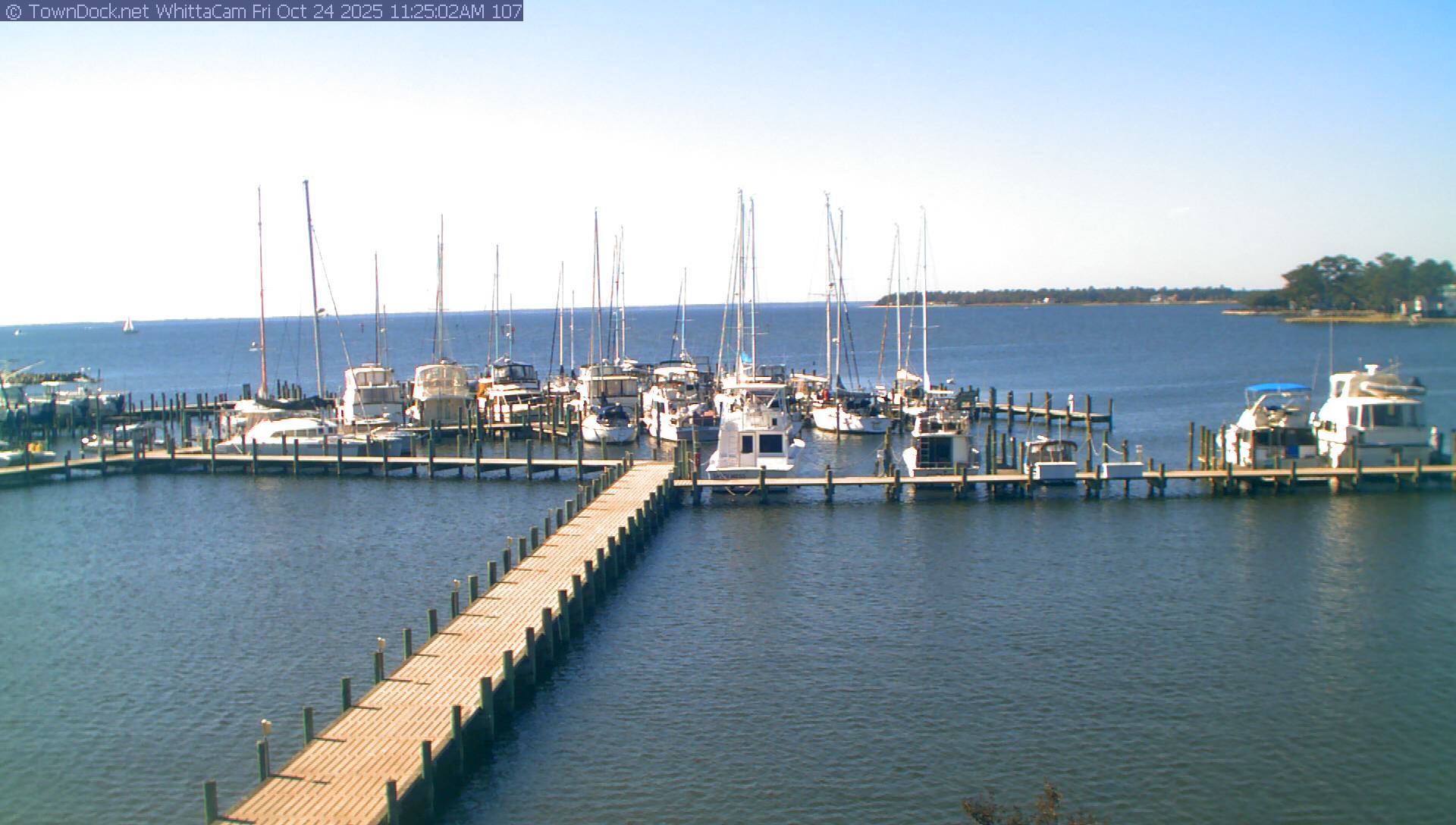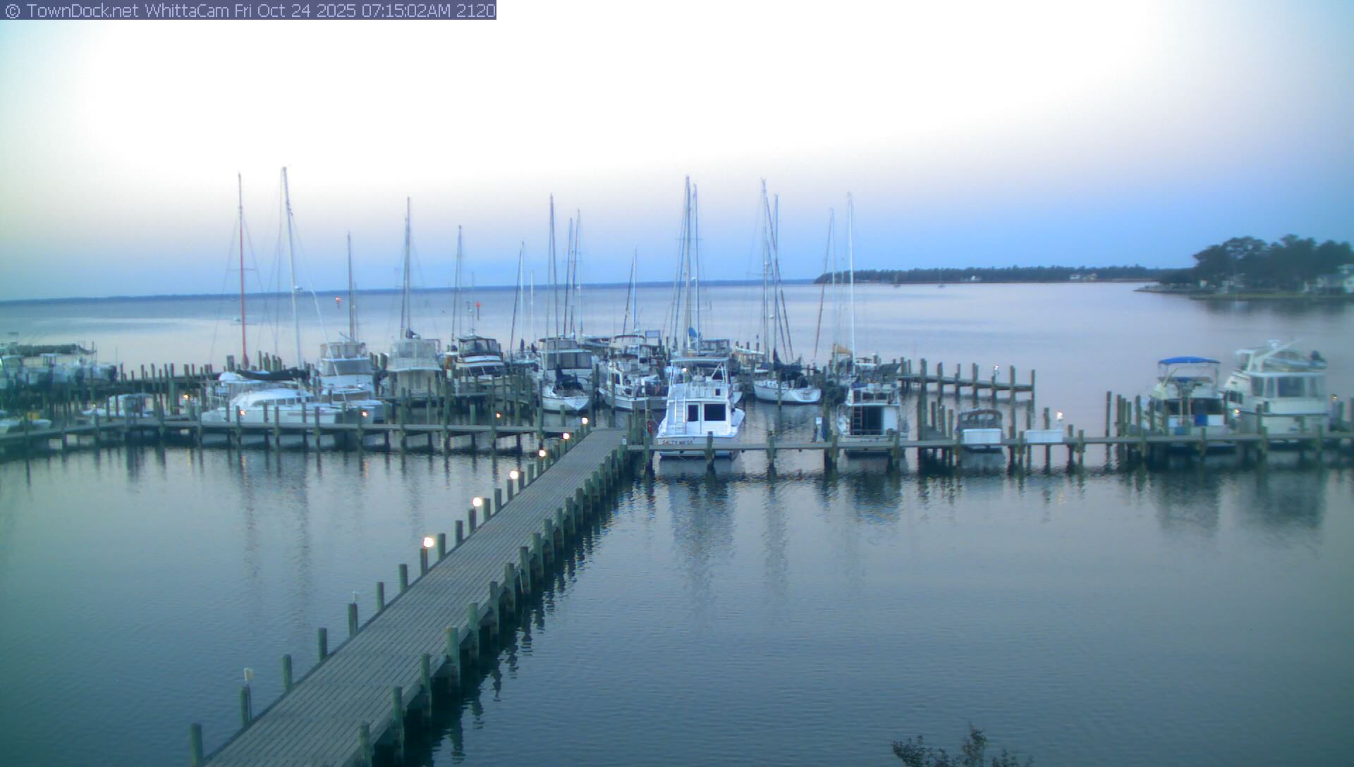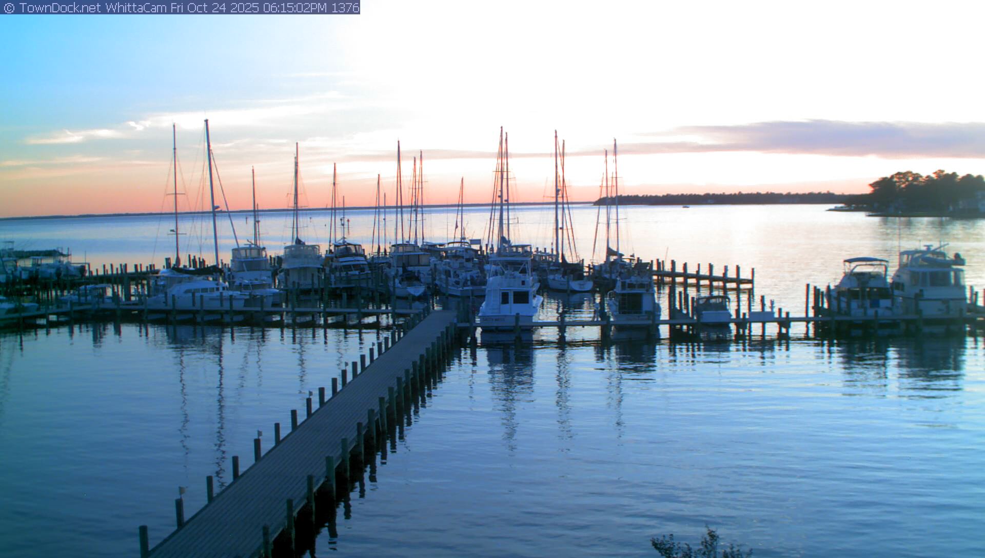 shows Whittaker Pointe Marina and the Whittaker Creek Channel entrance, with the Neuse River in the background. WhittaCam takes a new picture every five minutes from dawn til just before dusk. Click on the image to see a larger version. Once you see that larger version, you can click (see arrow at right) to go back in time and see recent photos. Harbor Cam currently takes photos from 6:30am to 6:40pm.