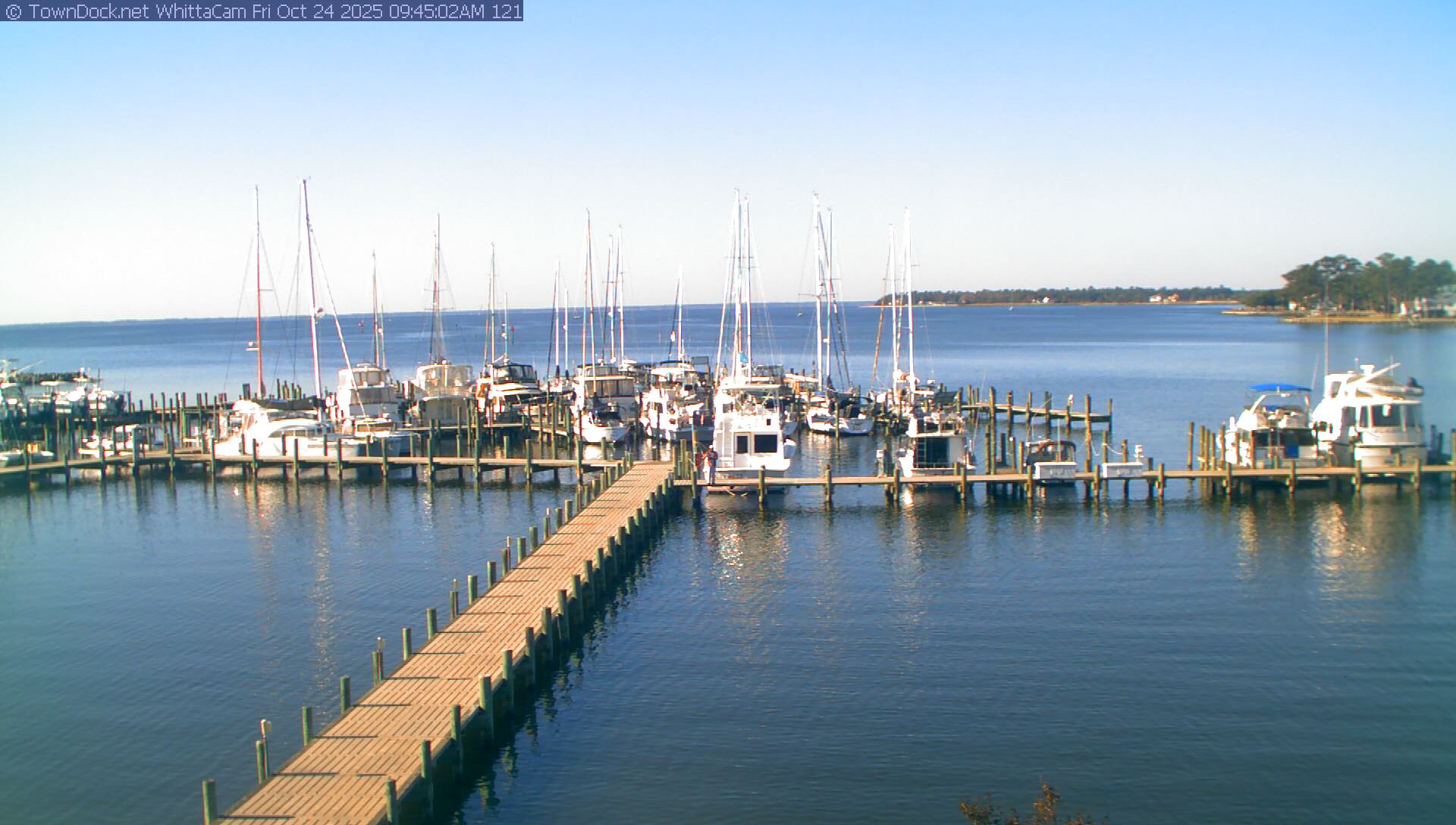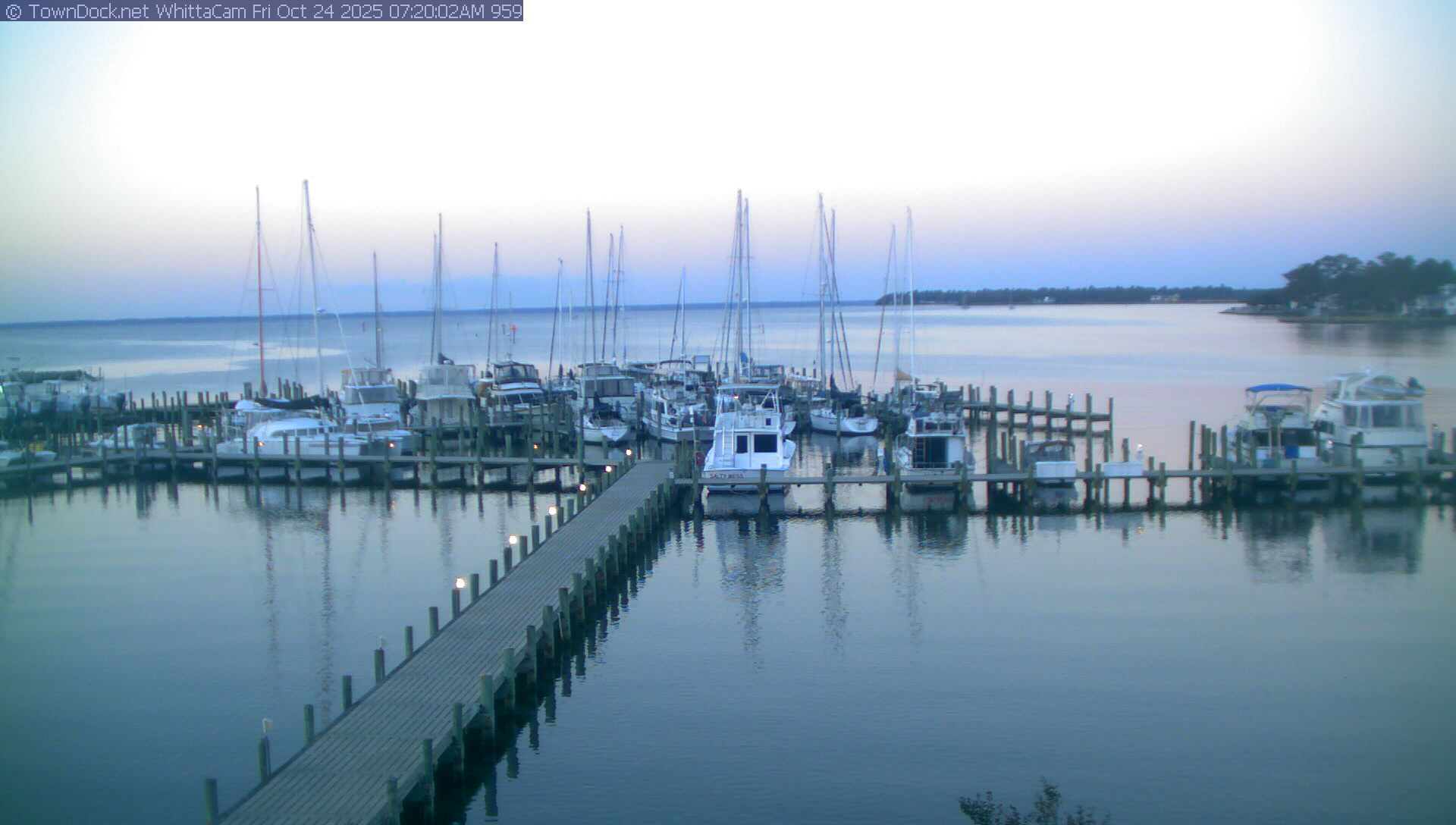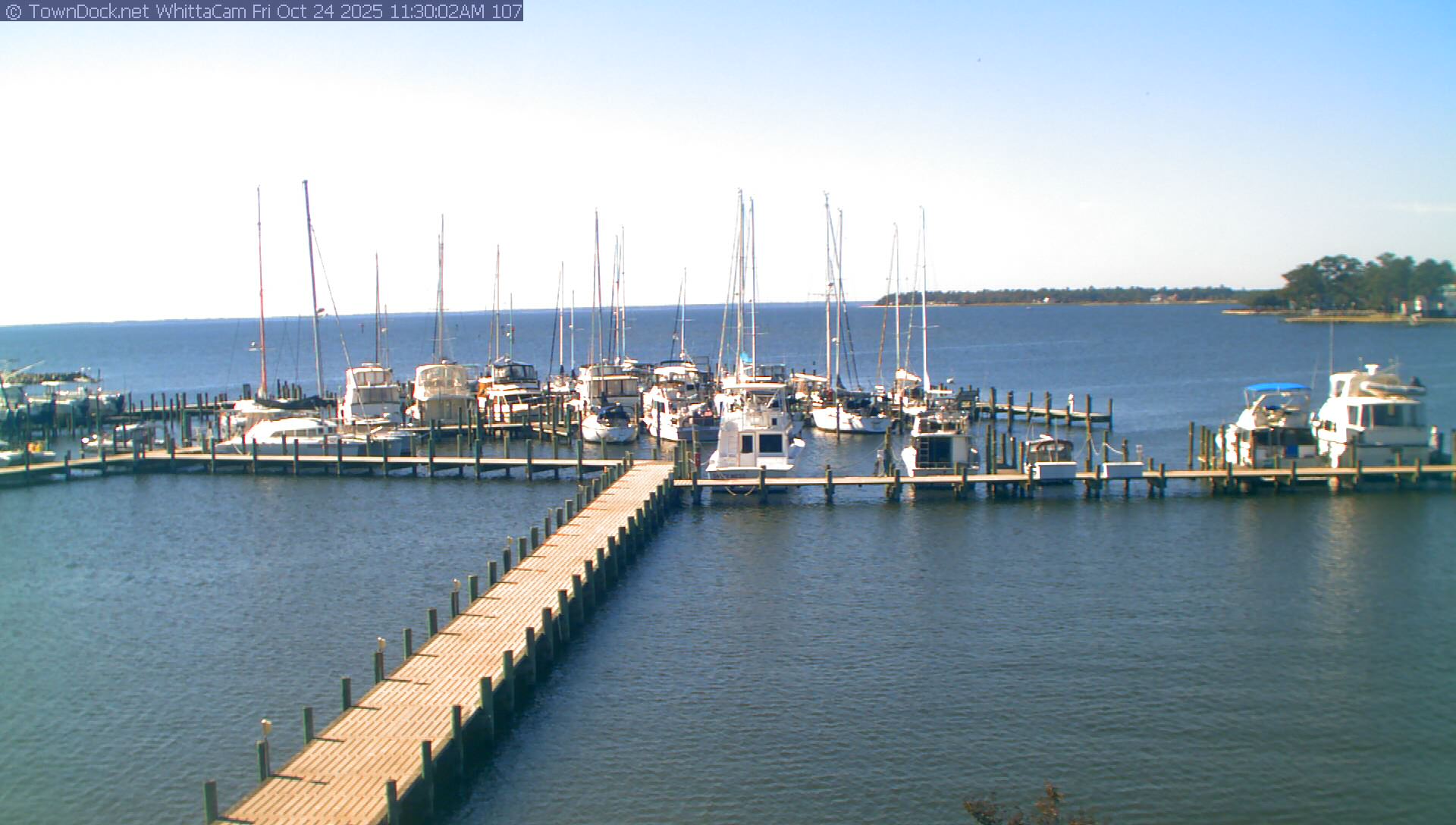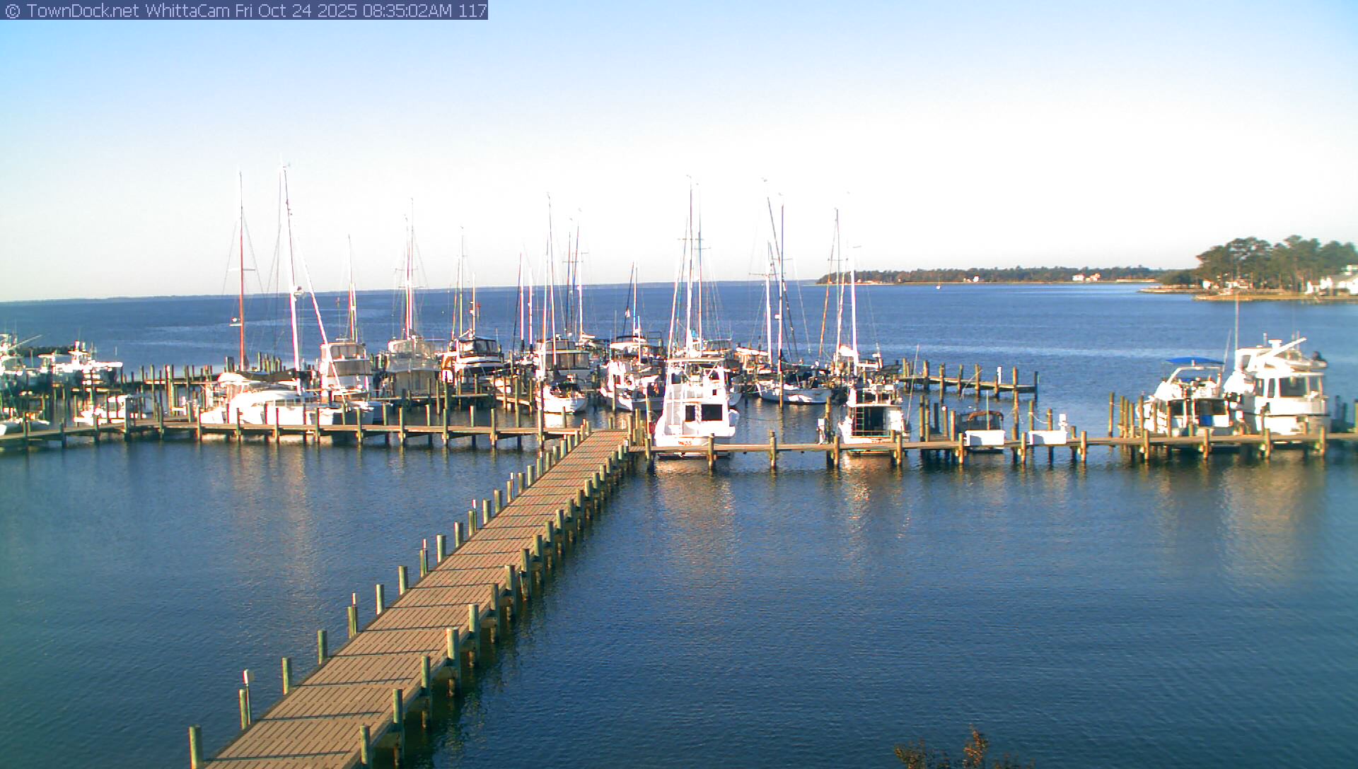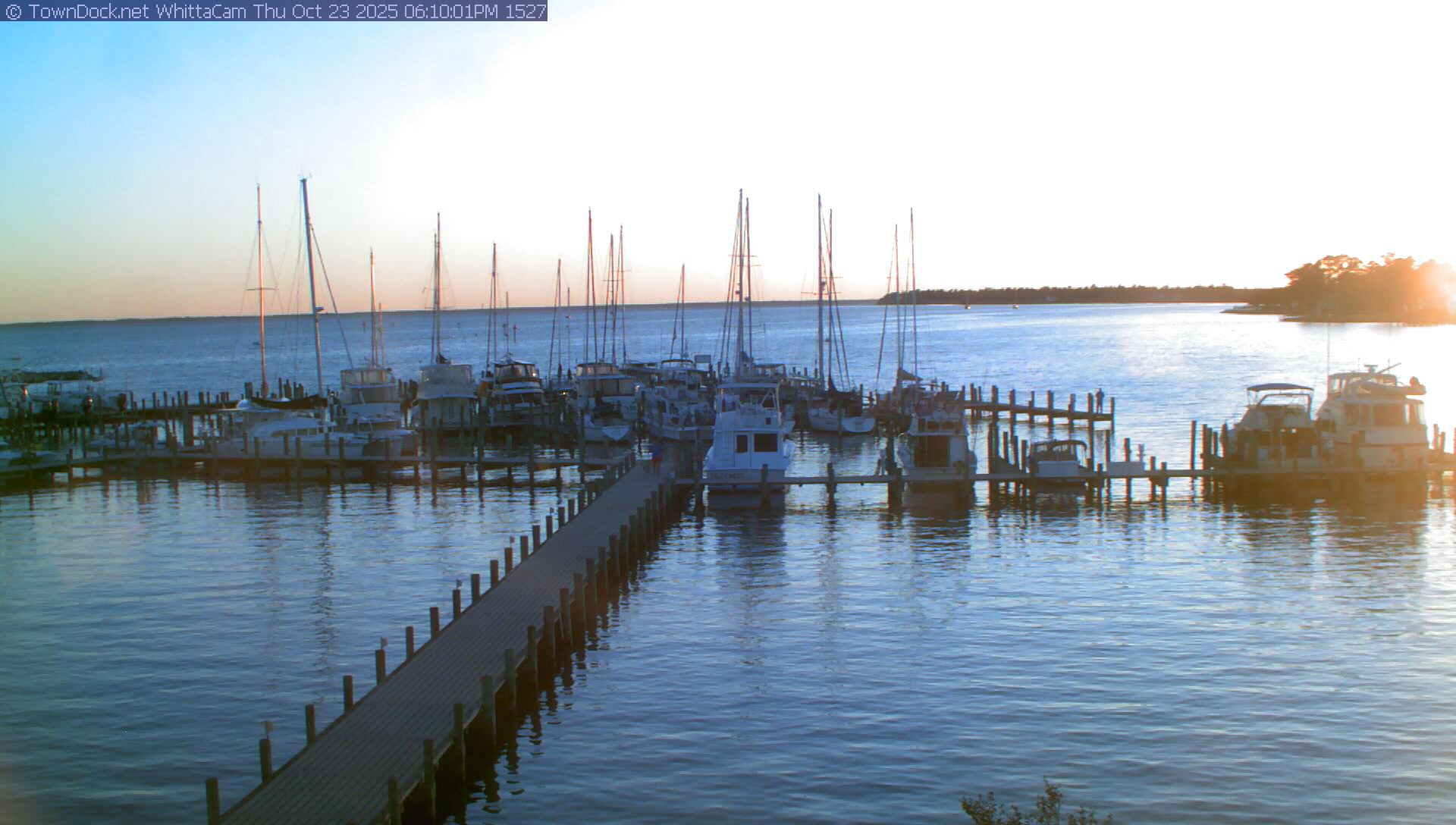shows Whittaker Pointe Marina and the Whittaker Creek Channel entrance, with the Neuse River in the background. WhittaCam takes a new picture every five minutes from dawn til just before dusk. Click on the image to see a larger version. Once you see that larger version, you can click (see arrow at right) to go back in time and see recent photos. Harbor Cam currently takes photos from 6:30am to 6:40pm.