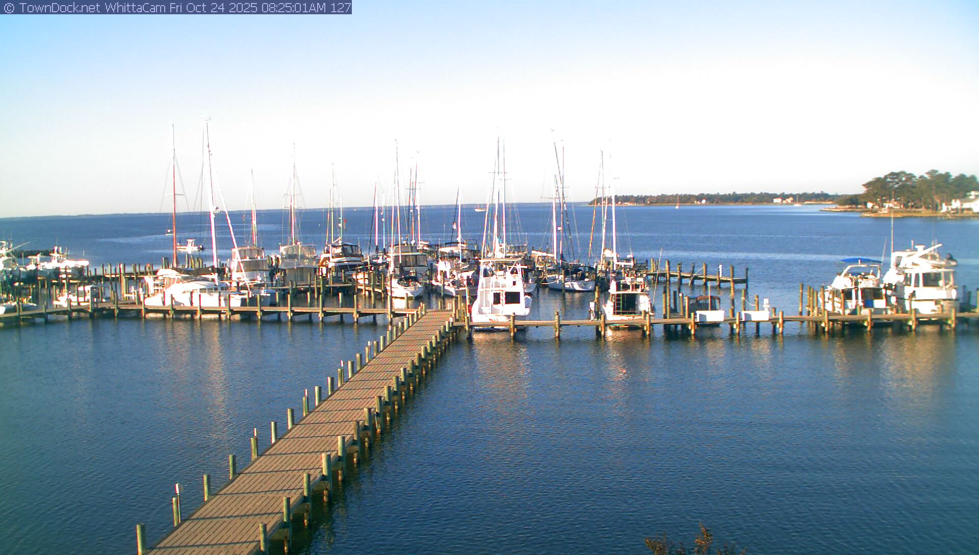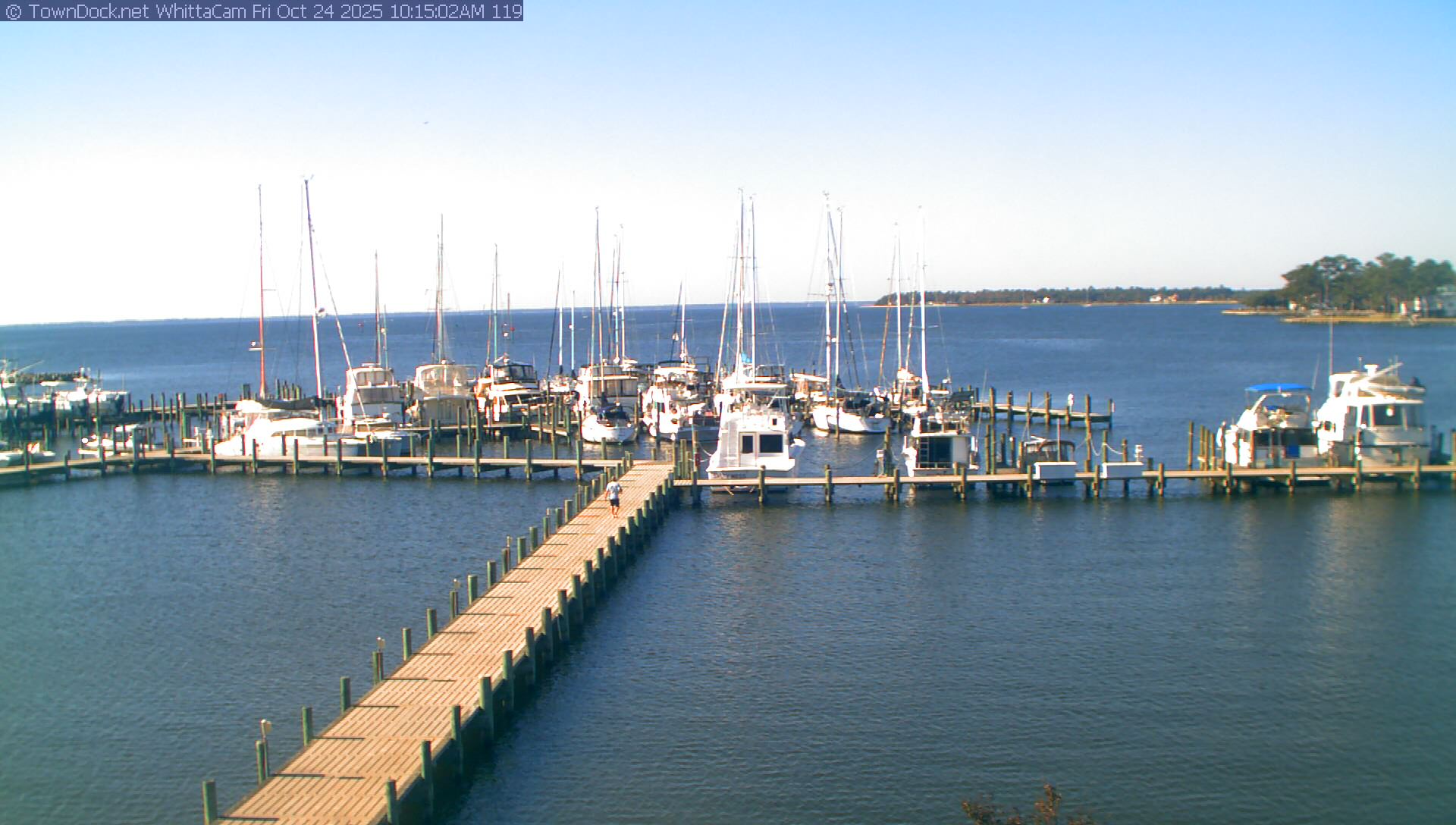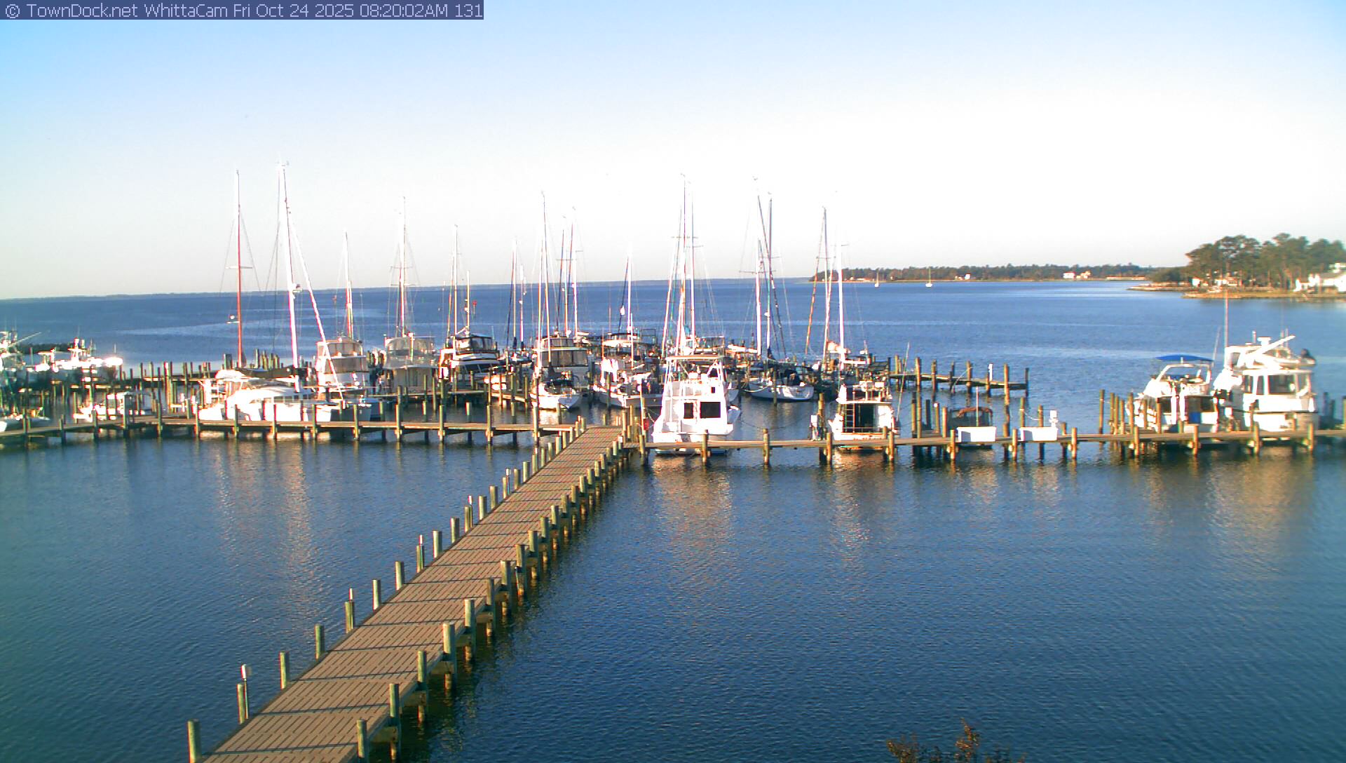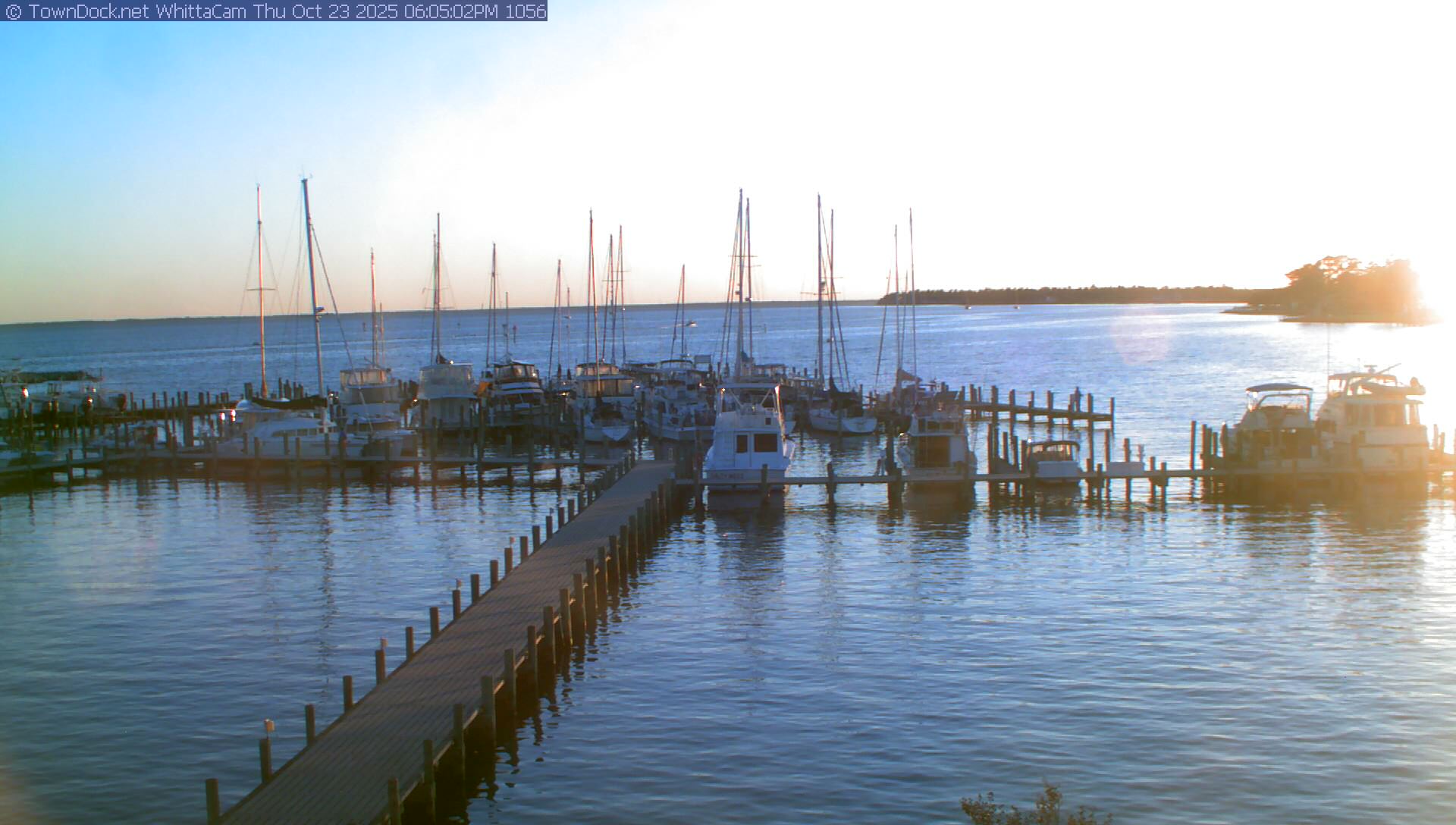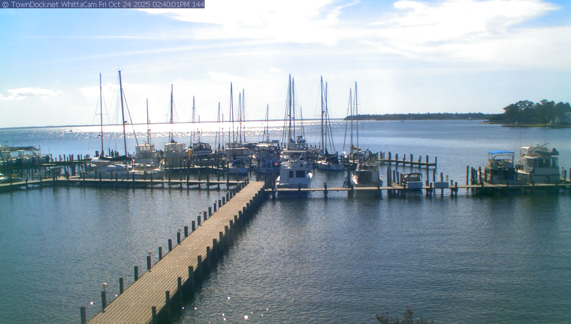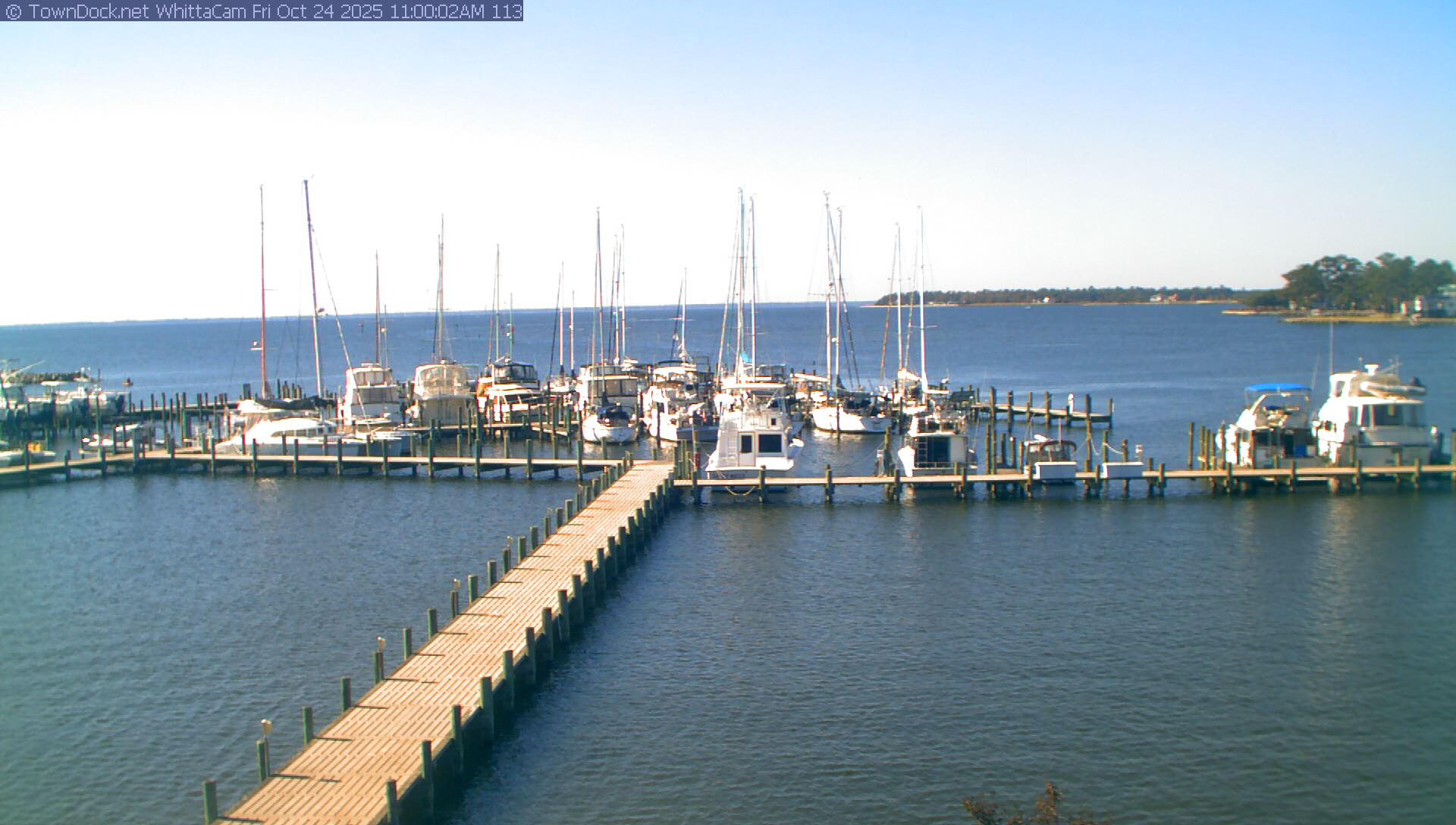 shows Whittaker Pointe Marina and the Whittaker Creek Channel entrance, with the Neuse River in the background. WhittaCam takes a new picture every five minutes from dawn til just before dusk. Click on the image to see a larger version. Once you see that larger version, you can click (see arrow at right) to go back in time and see recent photos. Harbor Cam currently takes photos from 6:30am to 6:40pm.