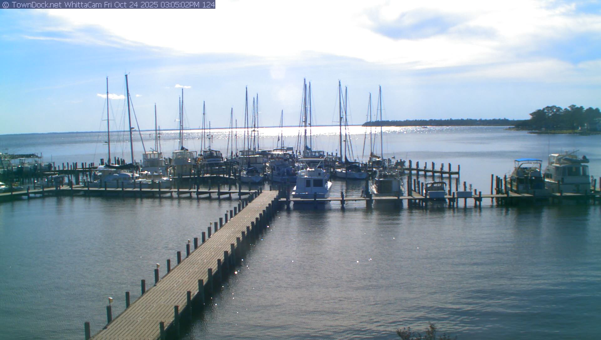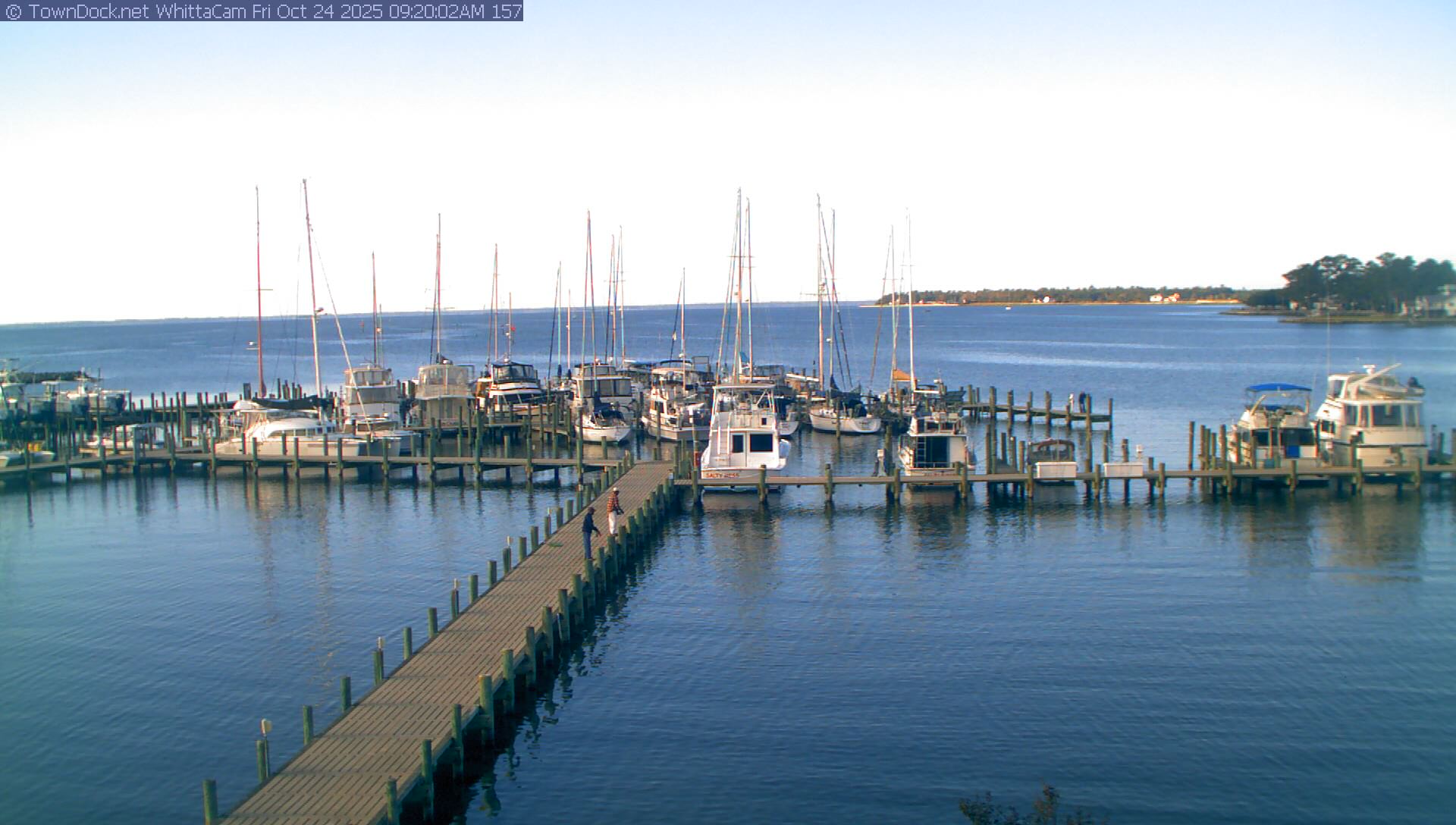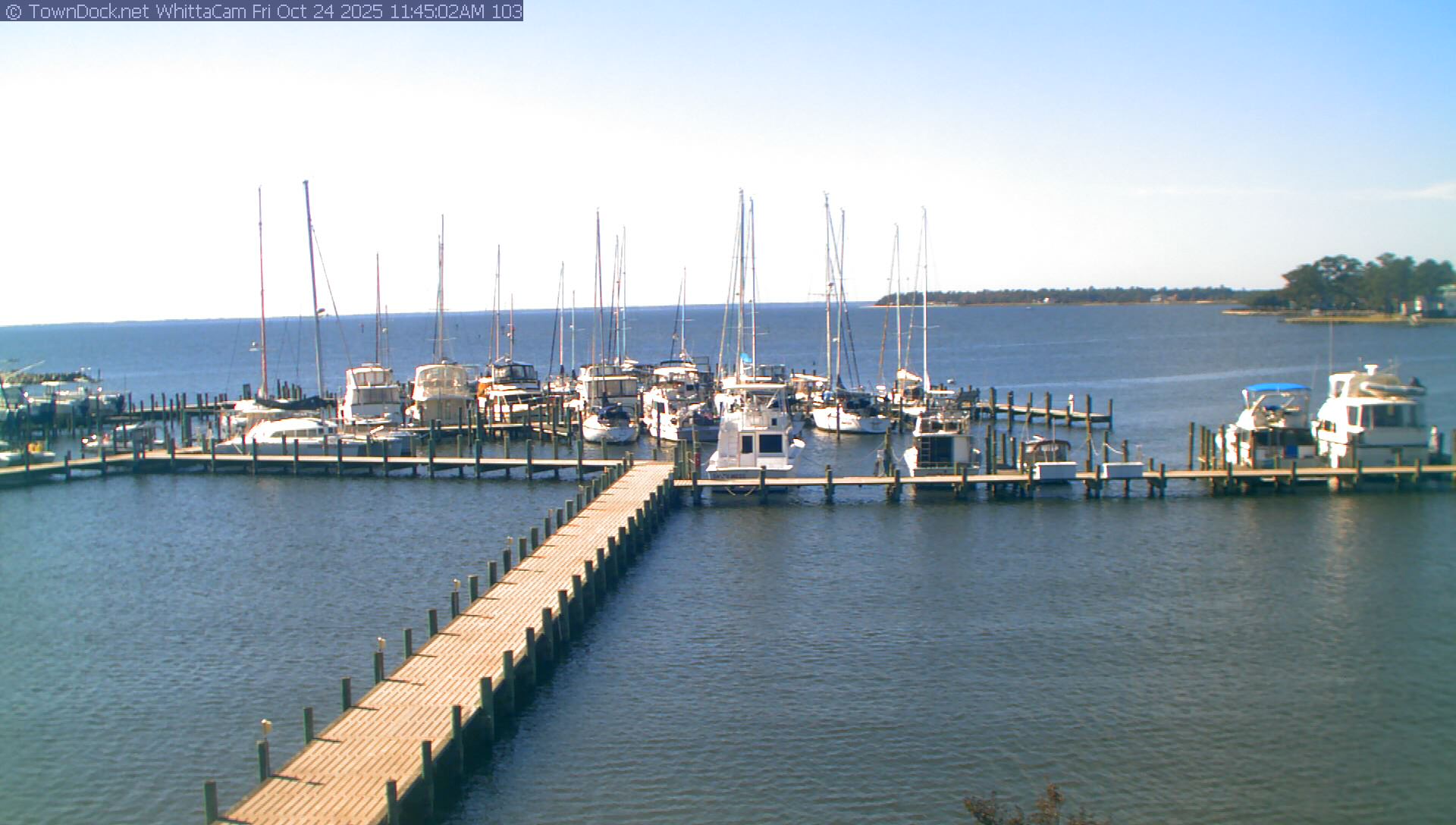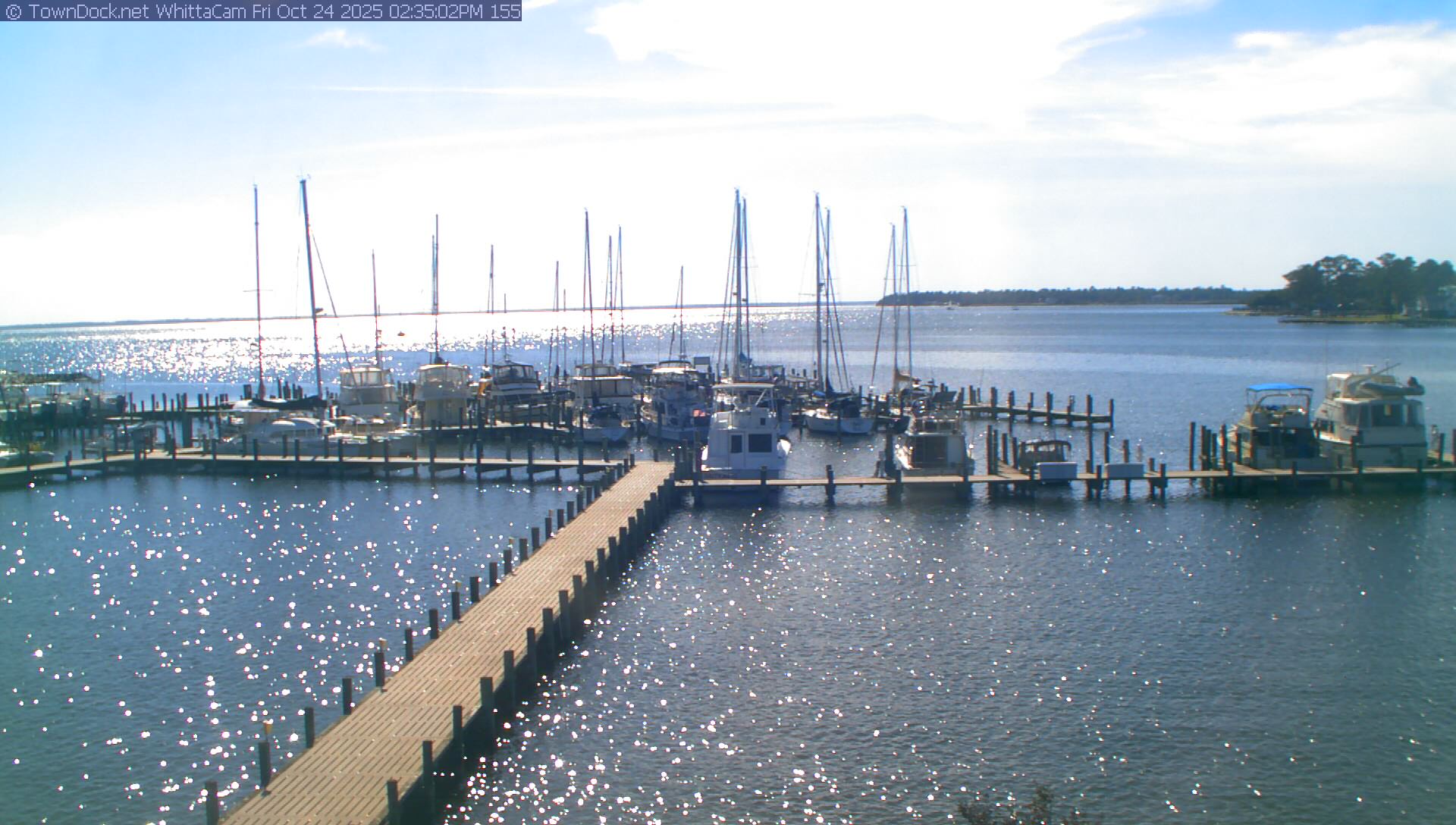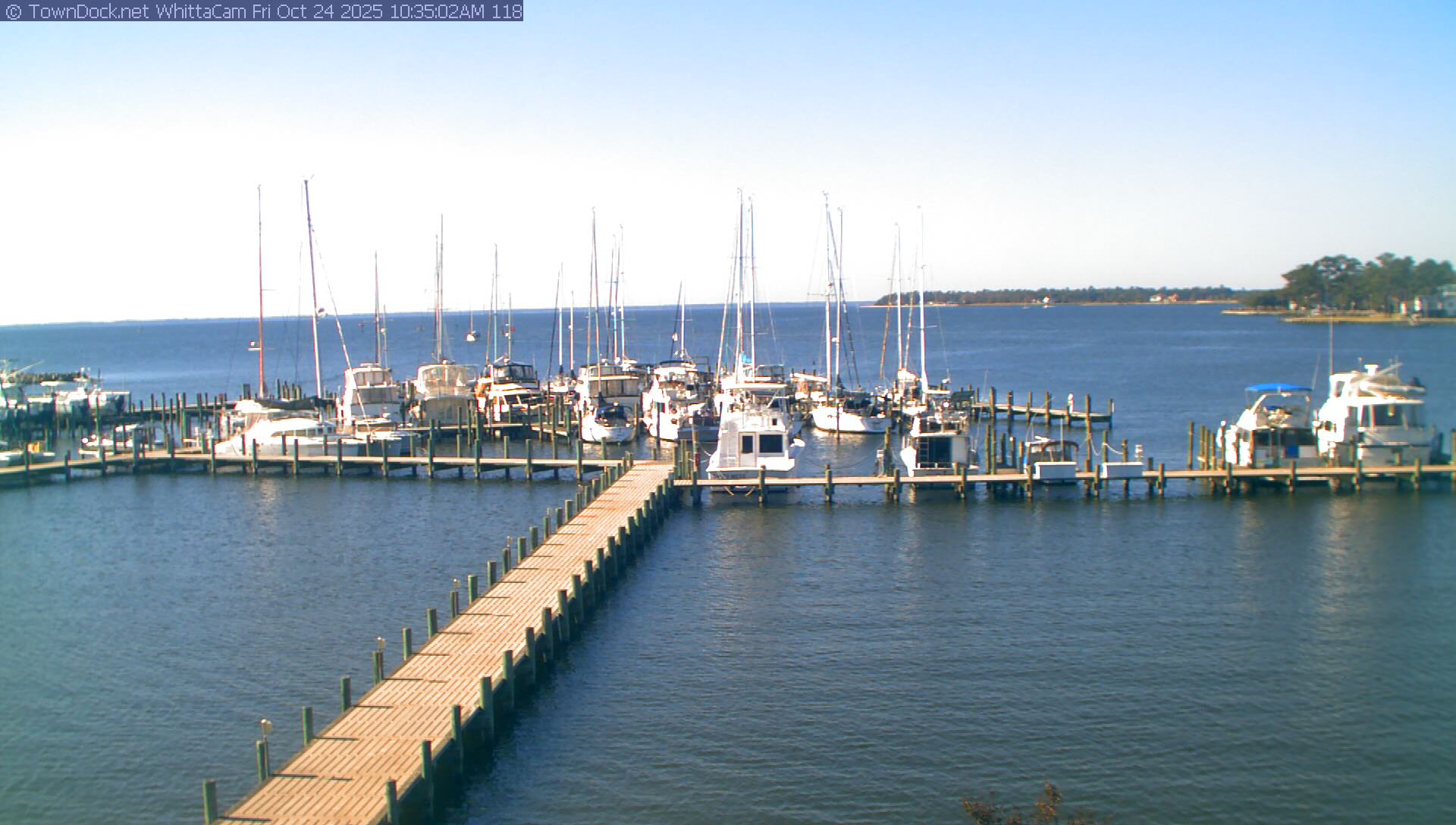 shows Whittaker Pointe Marina and the Whittaker Creek Channel entrance, with the Neuse River in the background. WhittaCam takes a new picture every five minutes from dawn til just before dusk. Click on the image to see a larger version. Once you see that larger version, you can click (see arrow at right) to go back in time and see recent photos. Harbor Cam currently takes photos from 6:30am to 6:40pm.