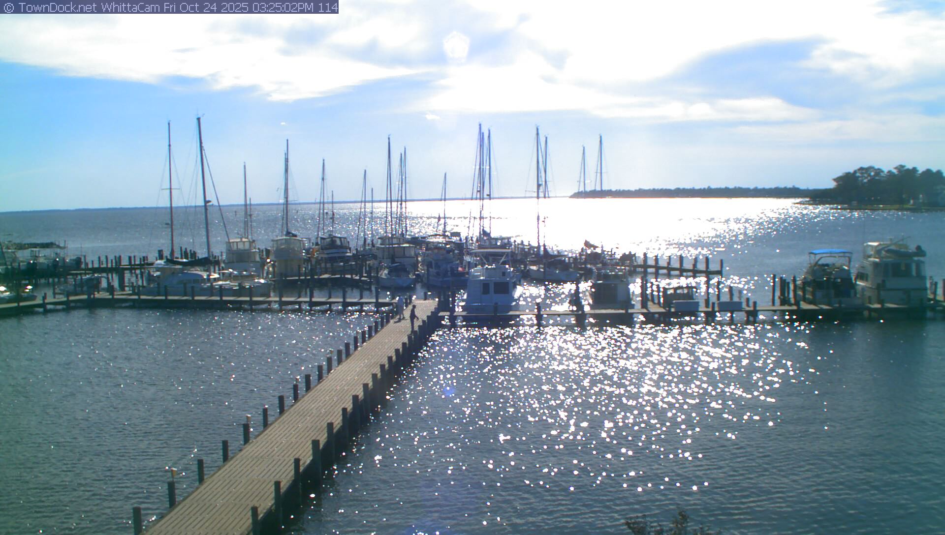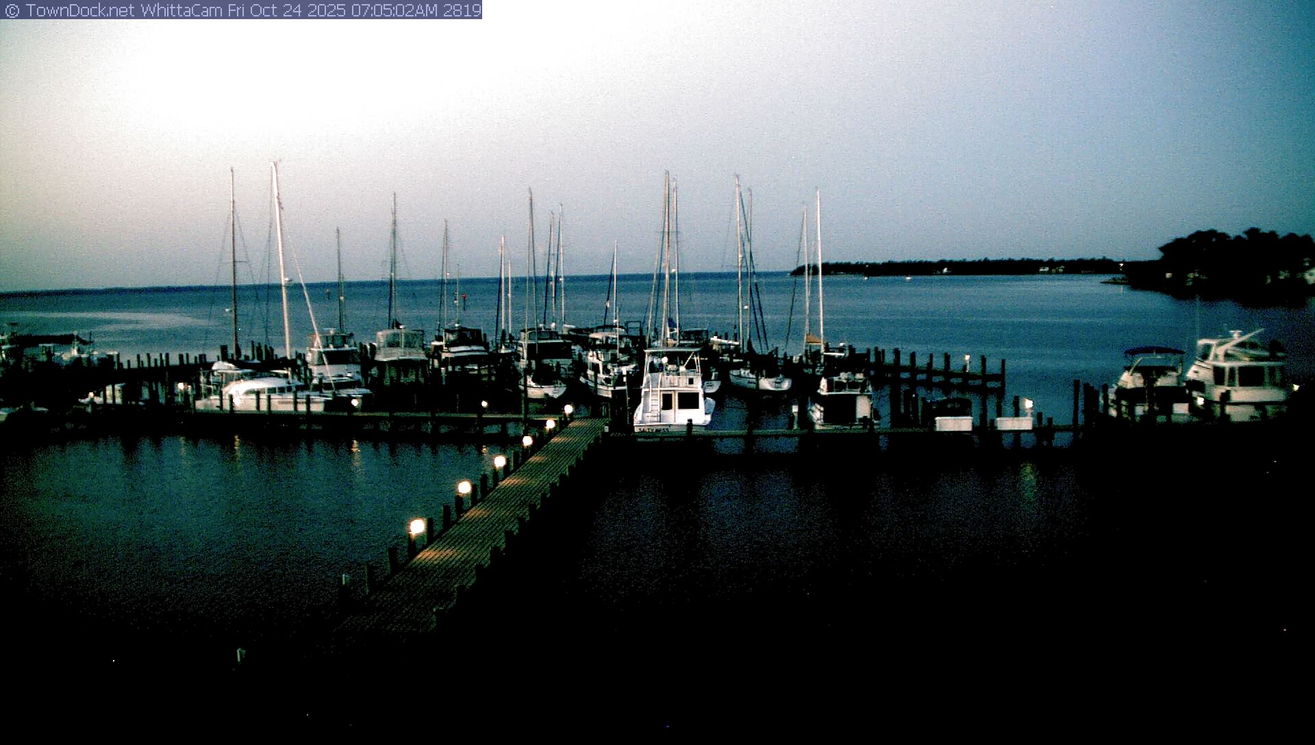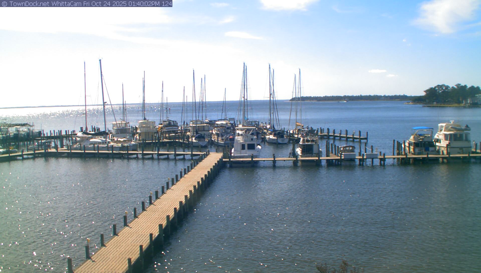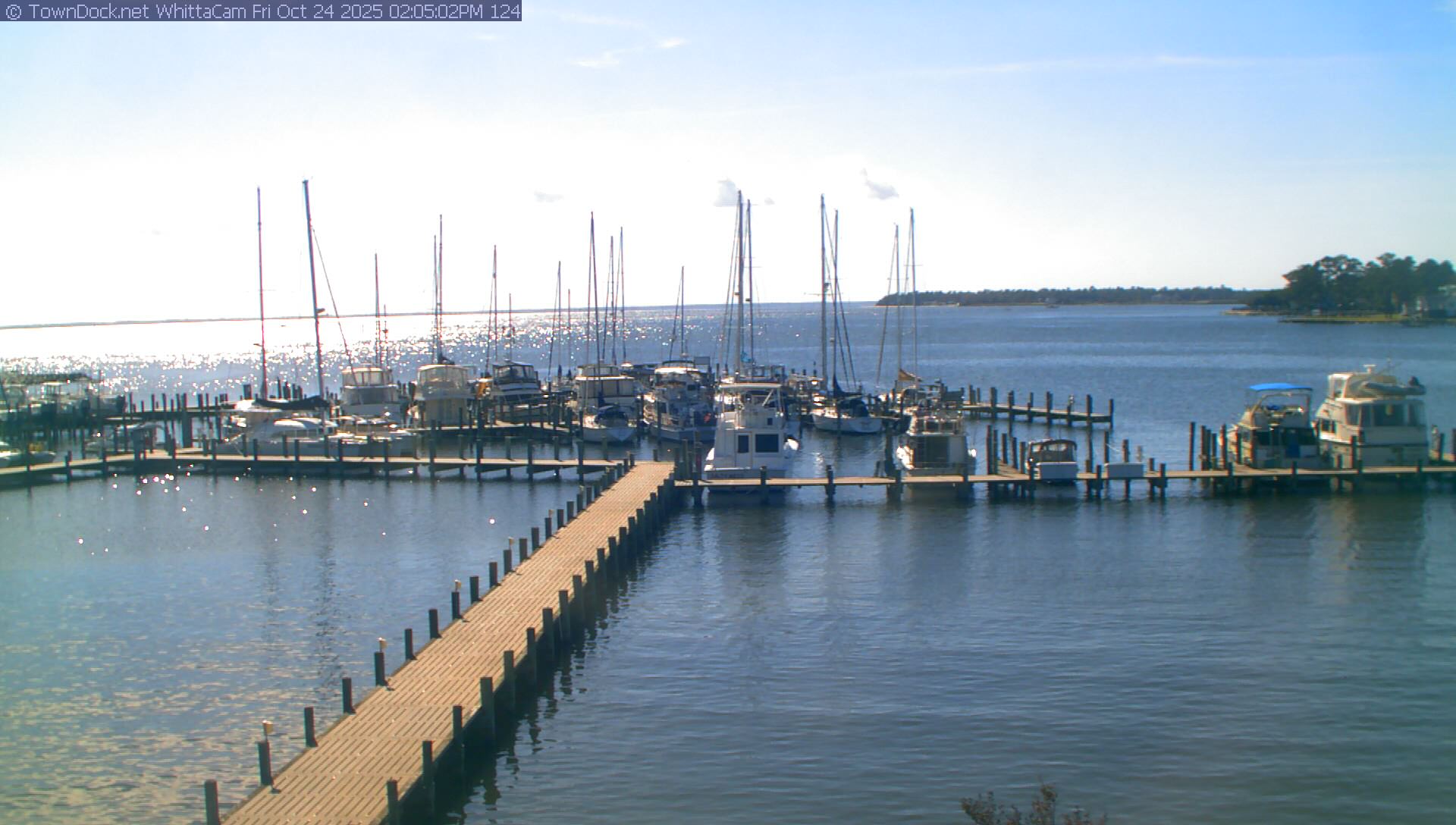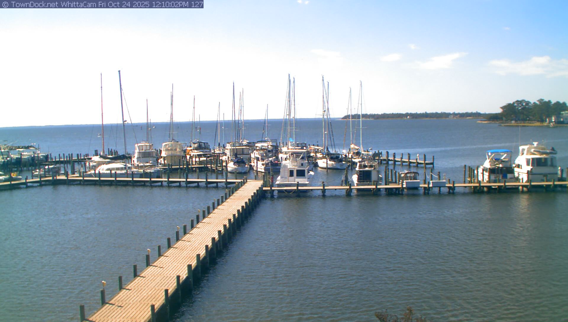 shows Whittaker Pointe Marina and the Whittaker Creek Channel entrance, with the Neuse River in the background. WhittaCam takes a new picture every five minutes from dawn til just before dusk. Click on the image to see a larger version. Once you see that larger version, you can click (see arrow at right) to go back in time and see recent photos. Harbor Cam currently takes photos from 6:30am to 6:40pm.