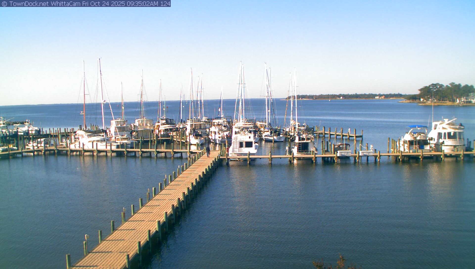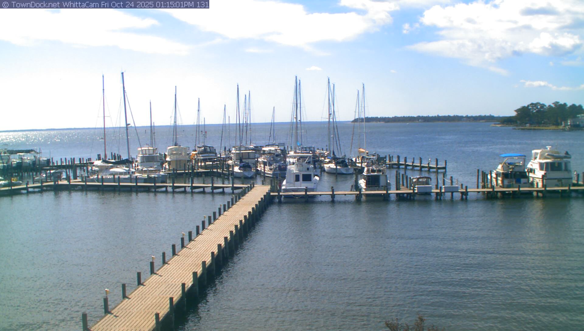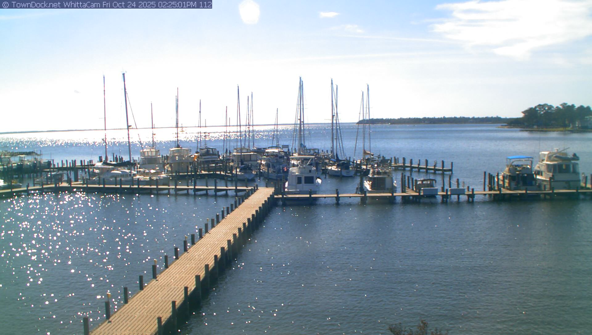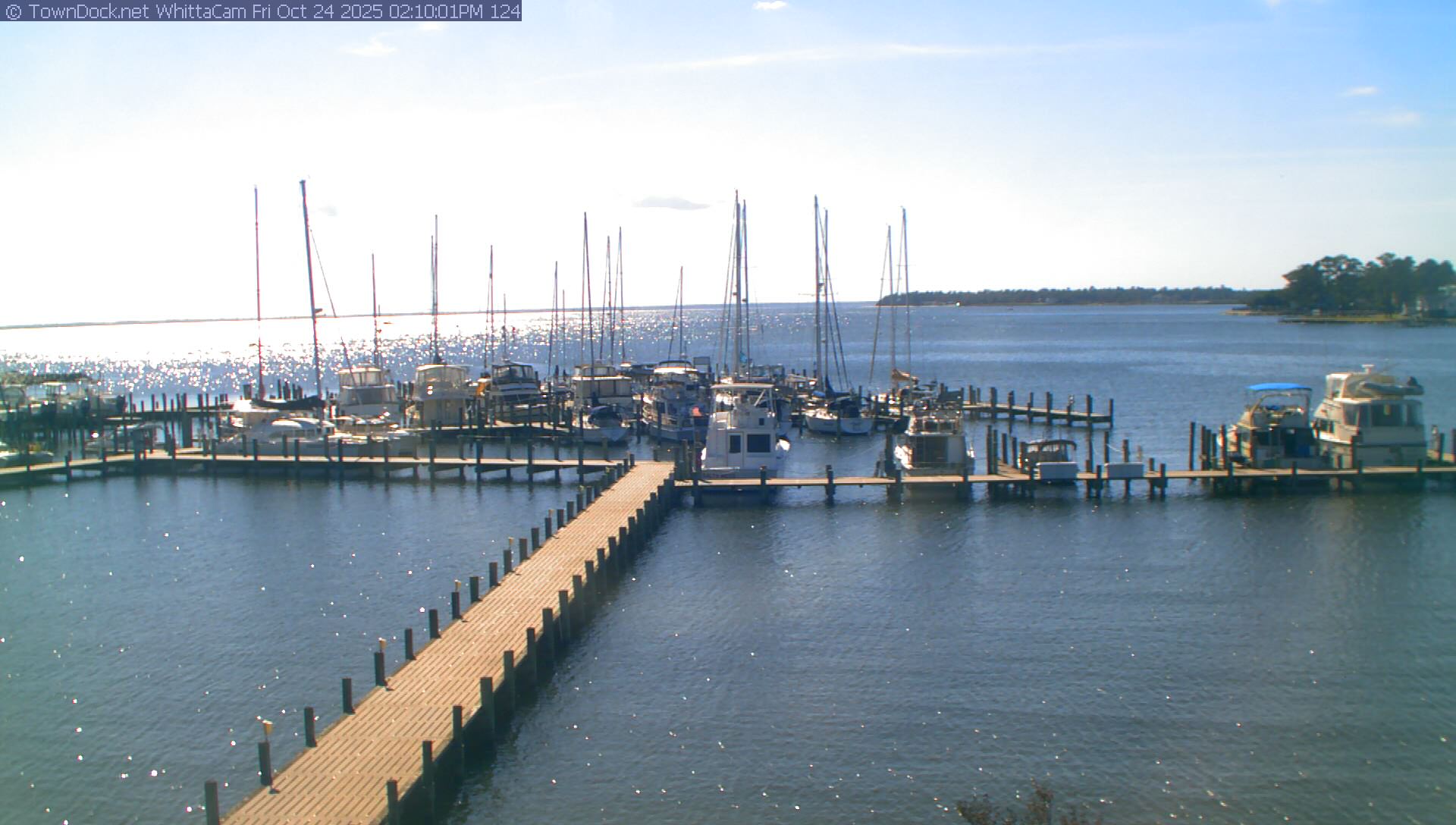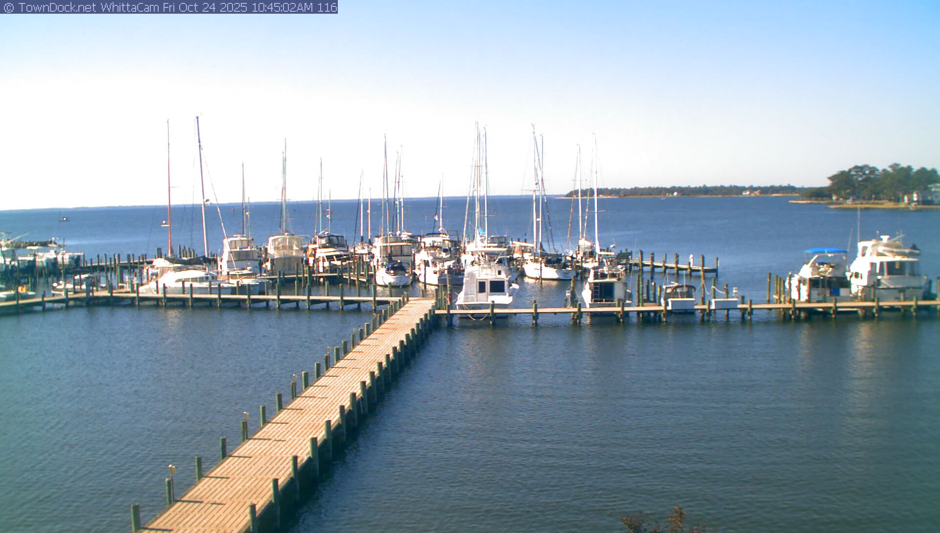shows Whittaker Pointe Marina and the Whittaker Creek Channel entrance, with the Neuse River in the background. WhittaCam takes a new picture every five minutes from dawn til just before dusk. Click on the image to see a larger version. Once you see that larger version, you can click (see arrow at right) to go back in time and see recent photos. Harbor Cam currently takes photos from 6:30am to 6:40pm.
