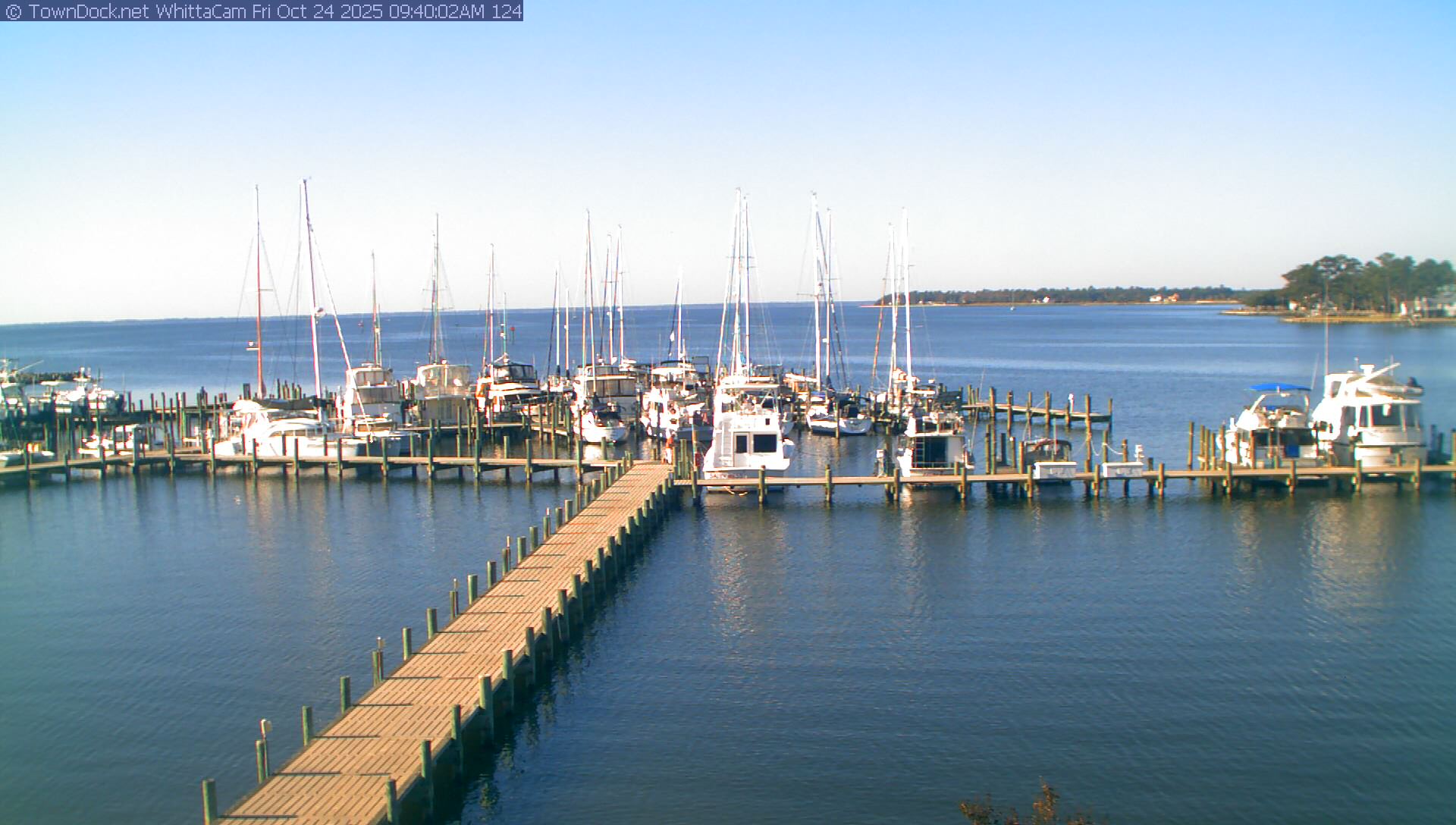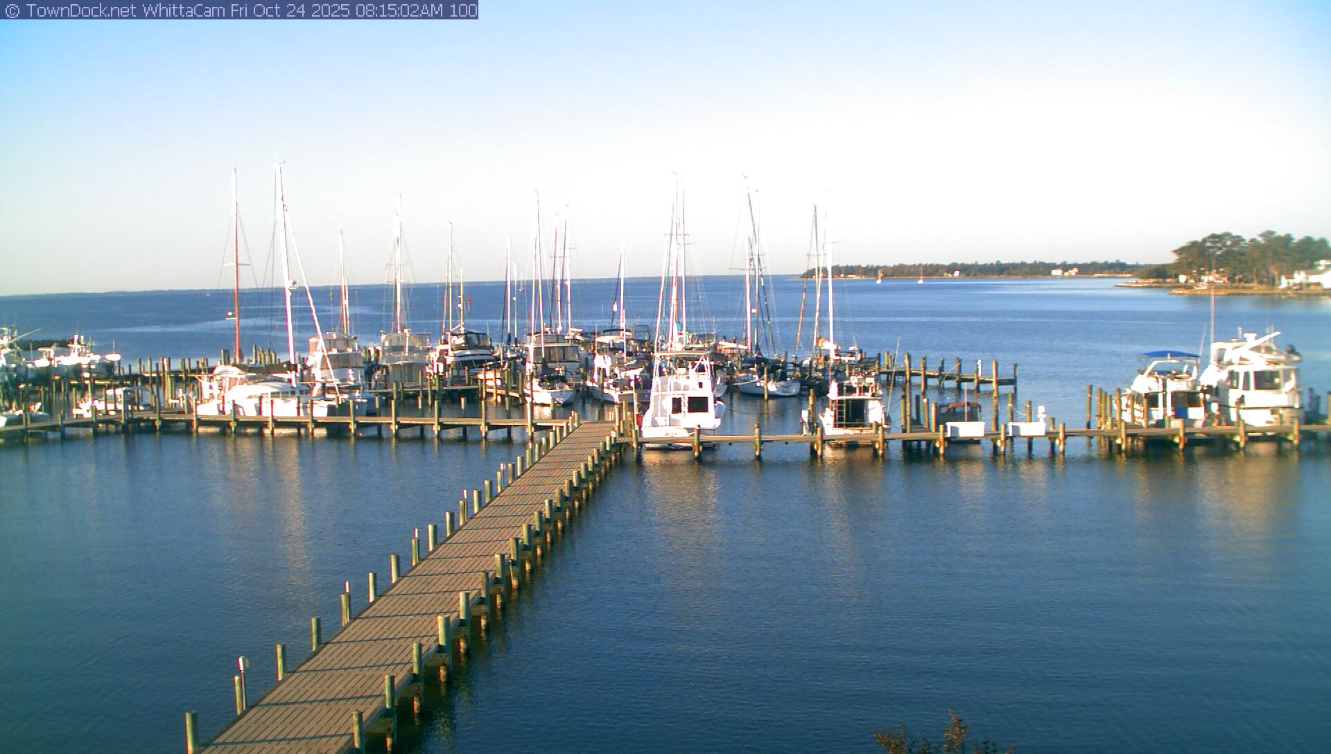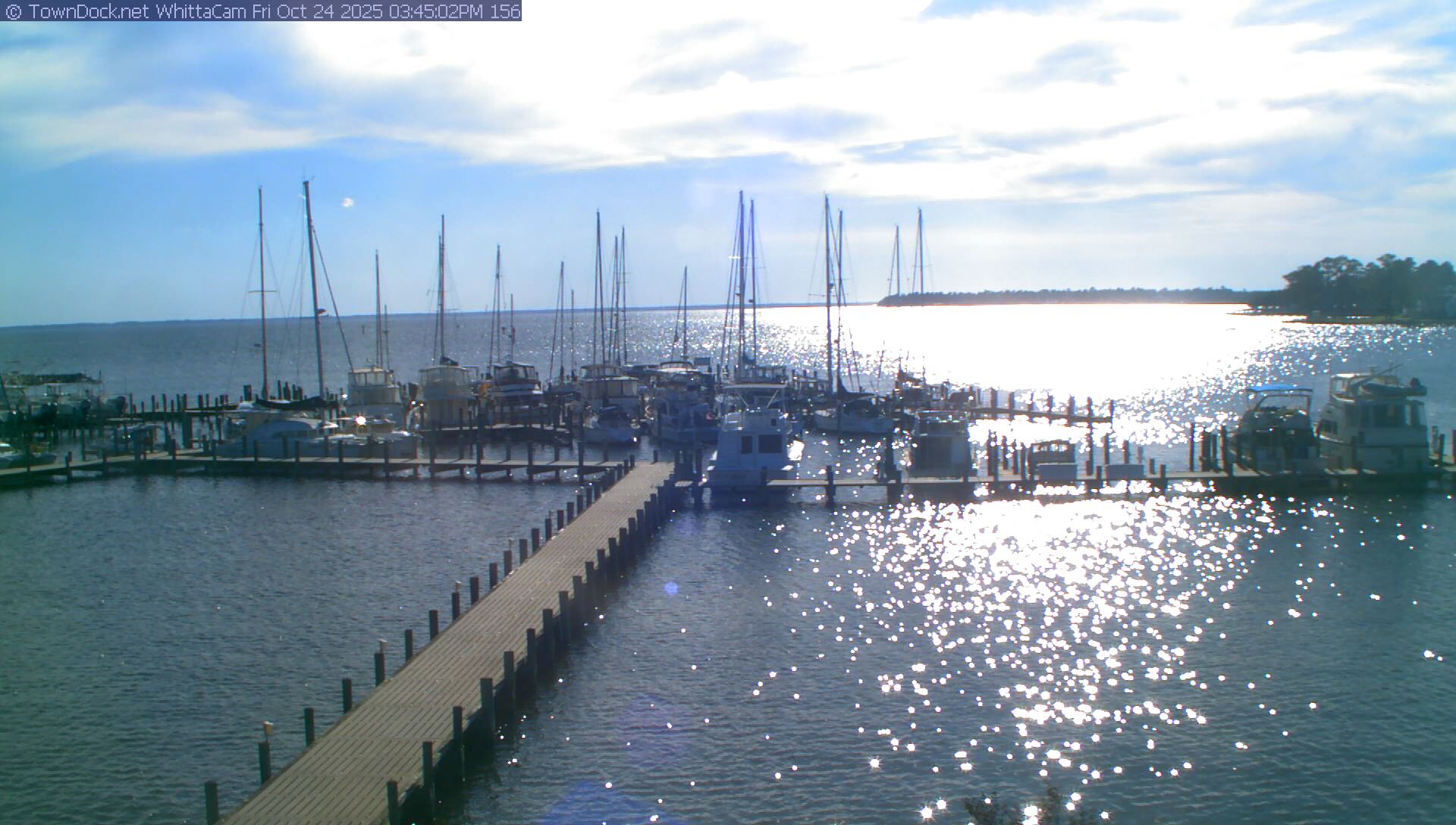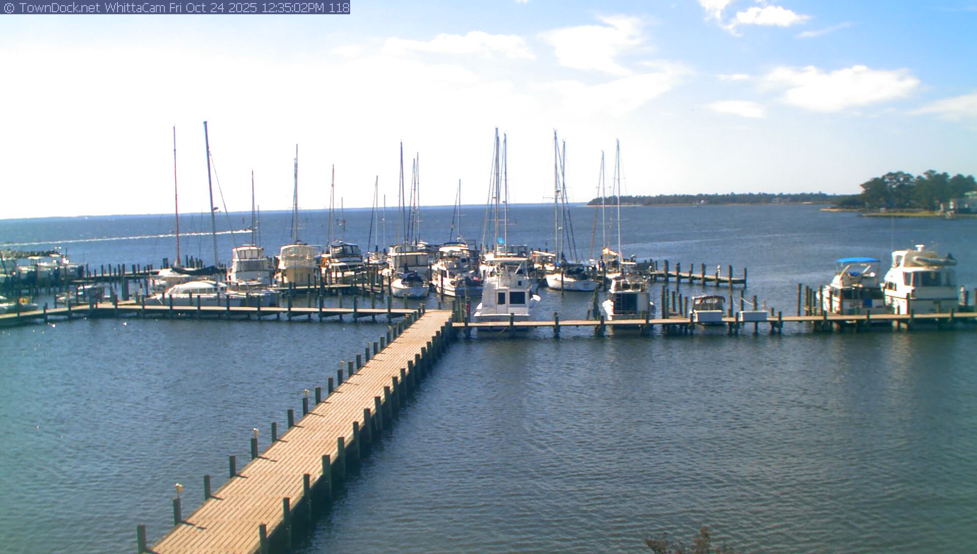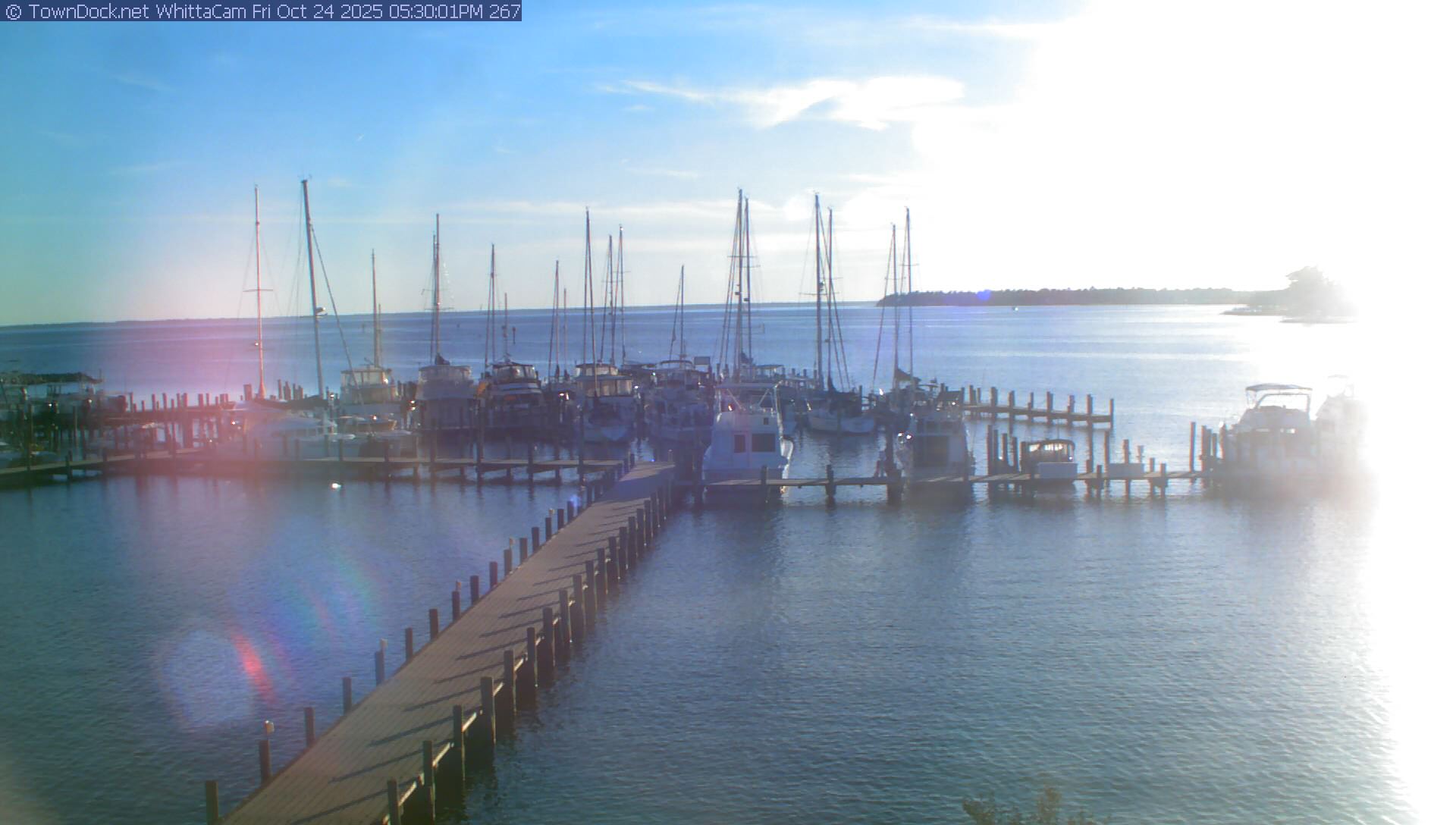 shows Whittaker Pointe Marina and the Whittaker Creek Channel entrance, with the Neuse River in the background. WhittaCam takes a new picture every five minutes from dawn til just before dusk. Click on the image to see a larger version. Once you see that larger version, you can click (see arrow at right) to go back in time and see recent photos. Harbor Cam currently takes photos from 6:30am to 6:40pm.