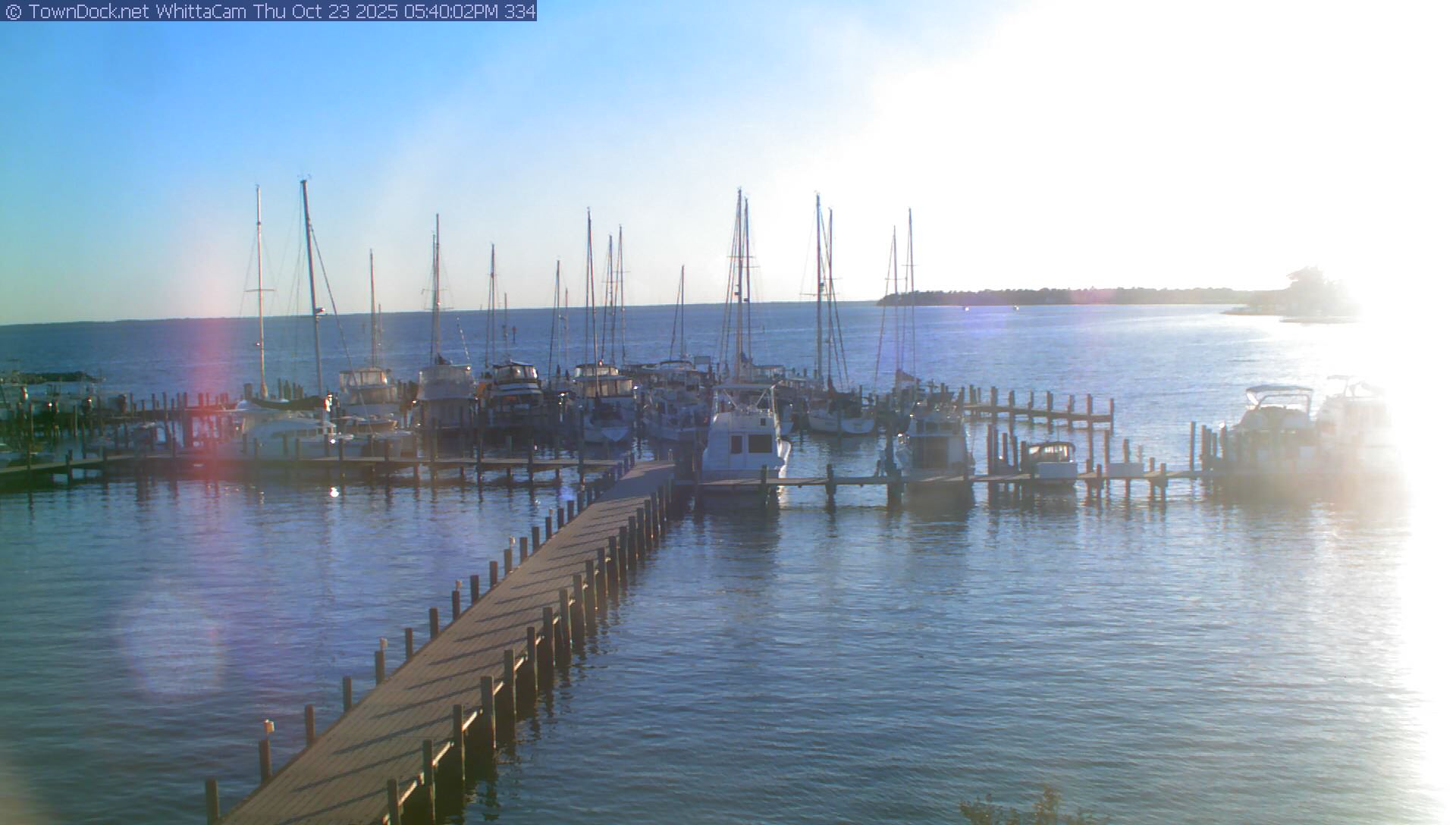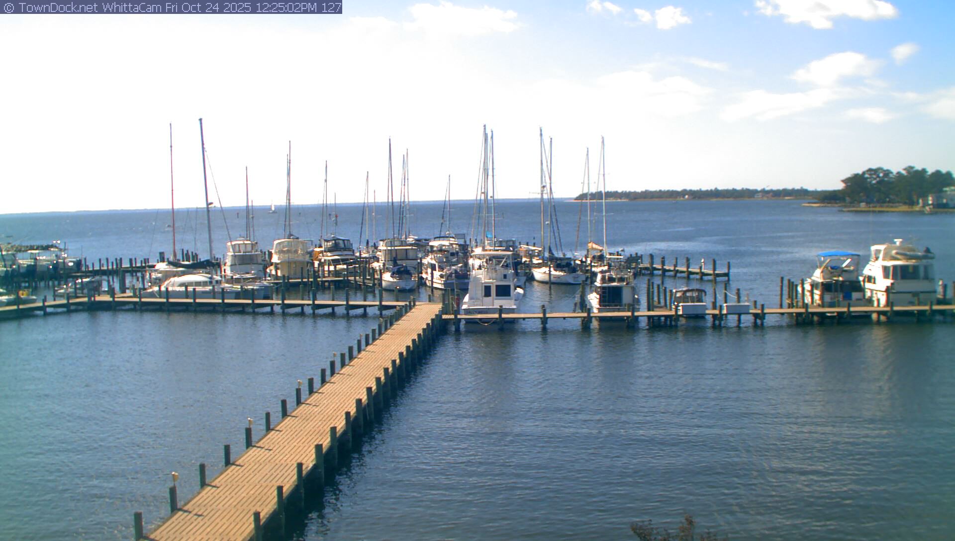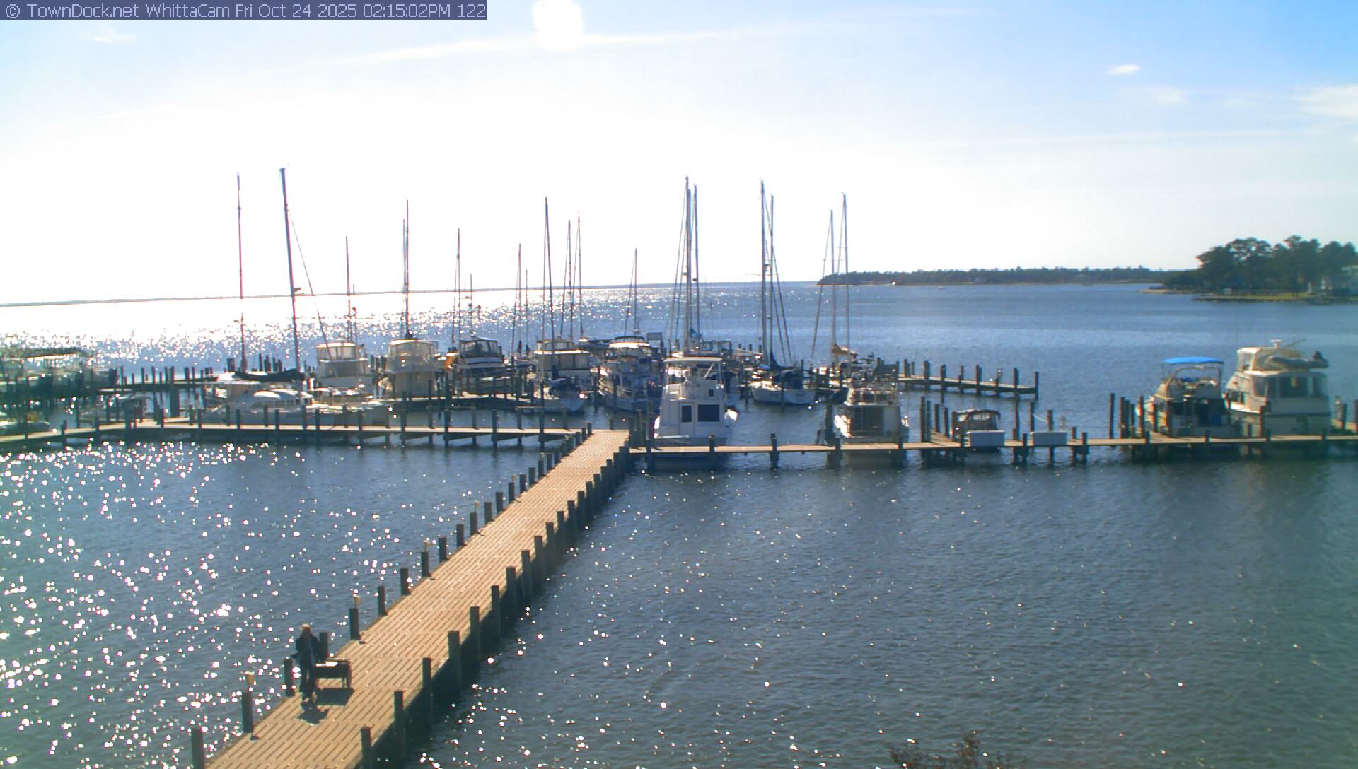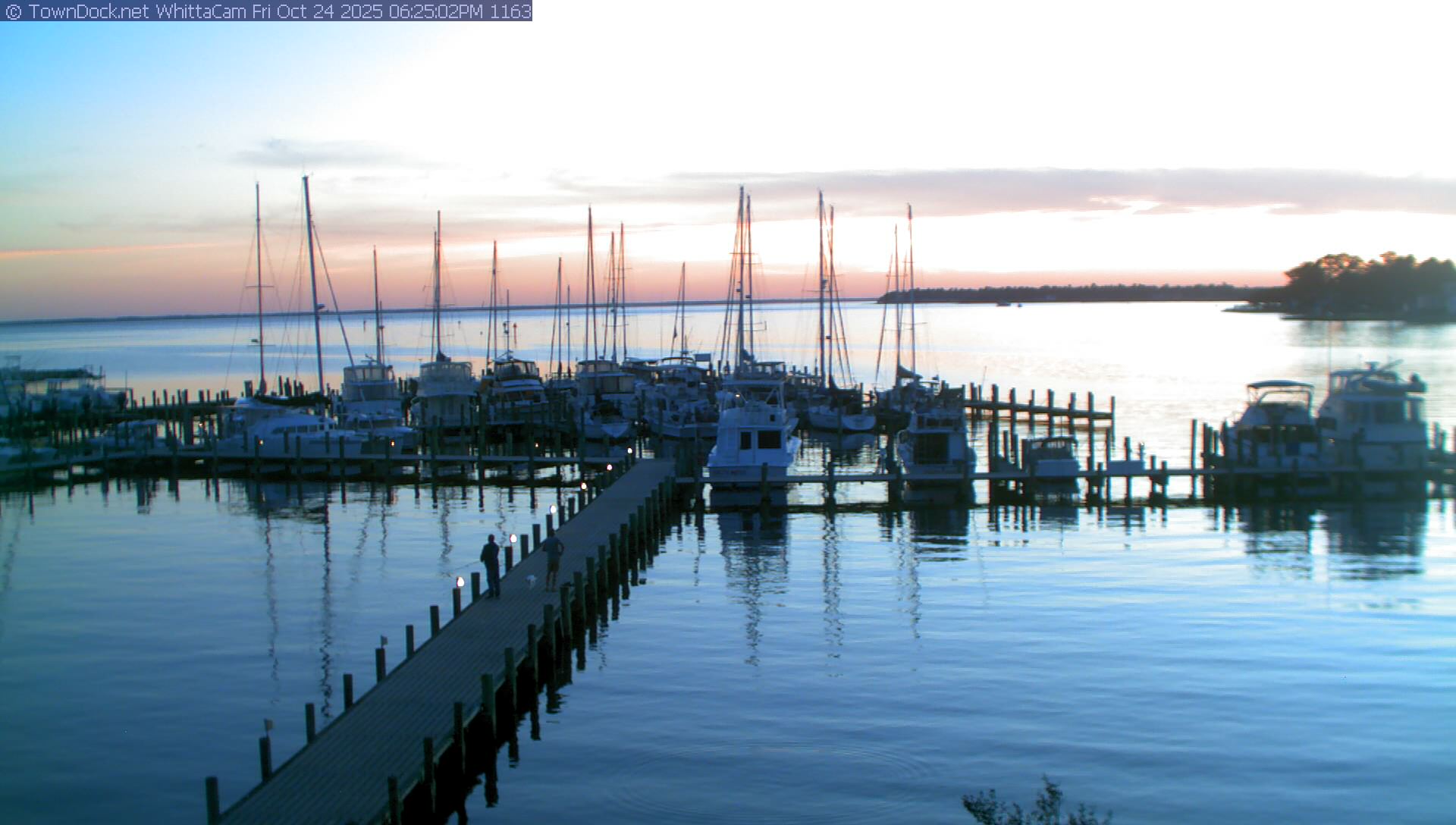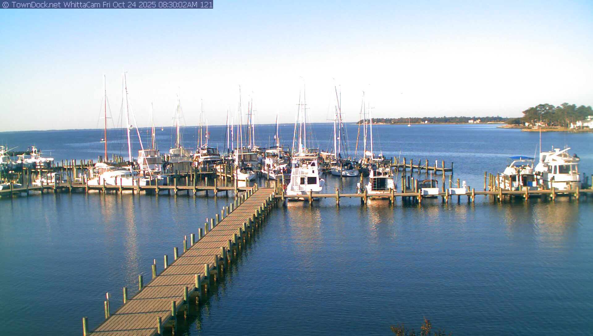 shows Whittaker Pointe Marina and the Whittaker Creek Channel entrance, with the Neuse River in the background. WhittaCam takes a new picture every five minutes from dawn til just before dusk. Click on the image to see a larger version. Once you see that larger version, you can click (see arrow at right) to go back in time and see recent photos. Harbor Cam currently takes photos from 6:30am to 6:40pm.