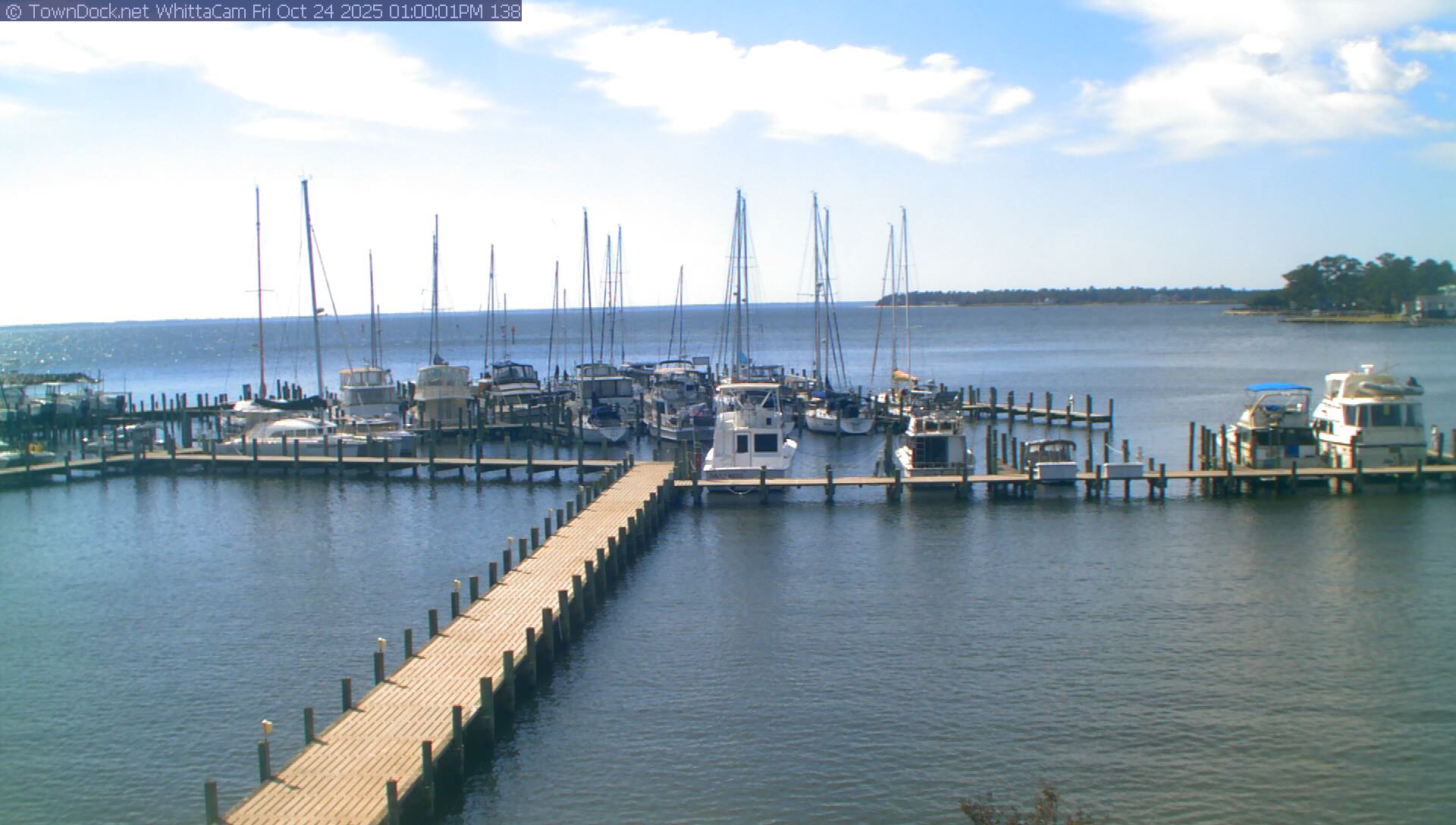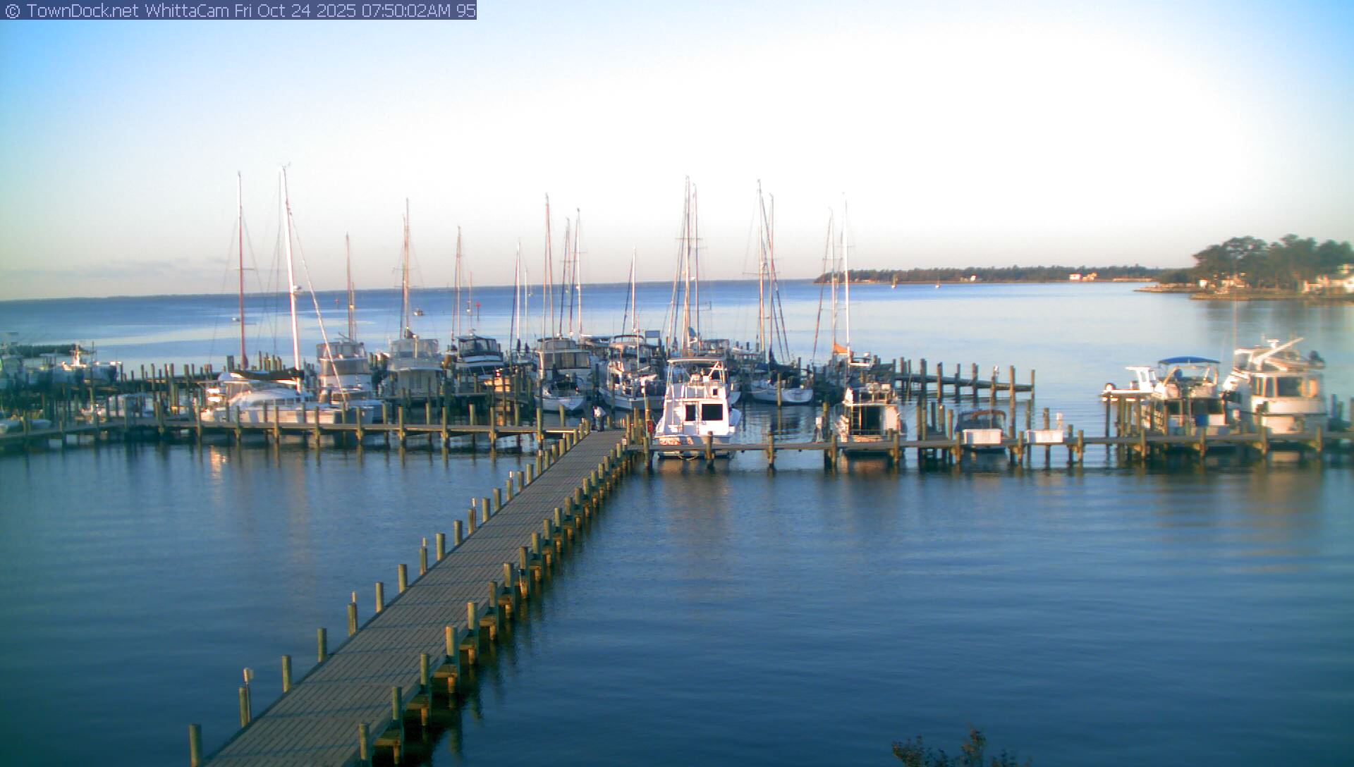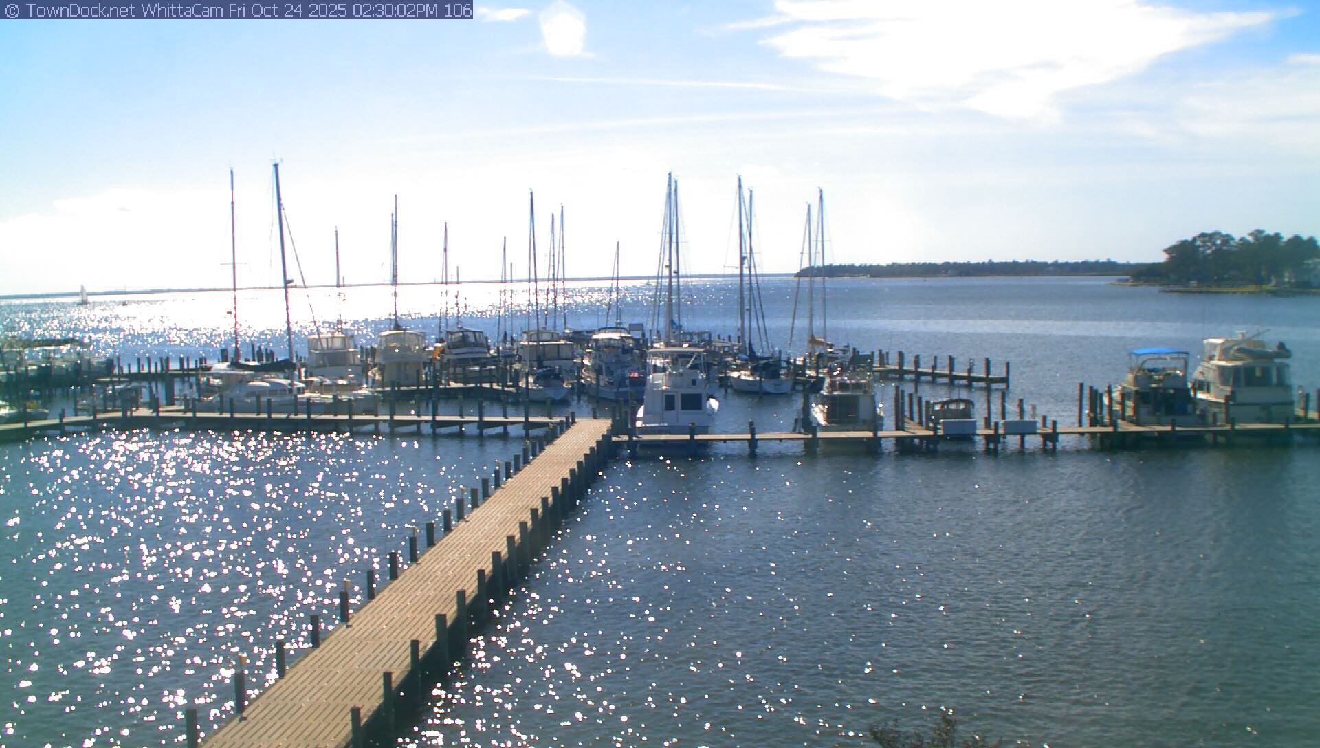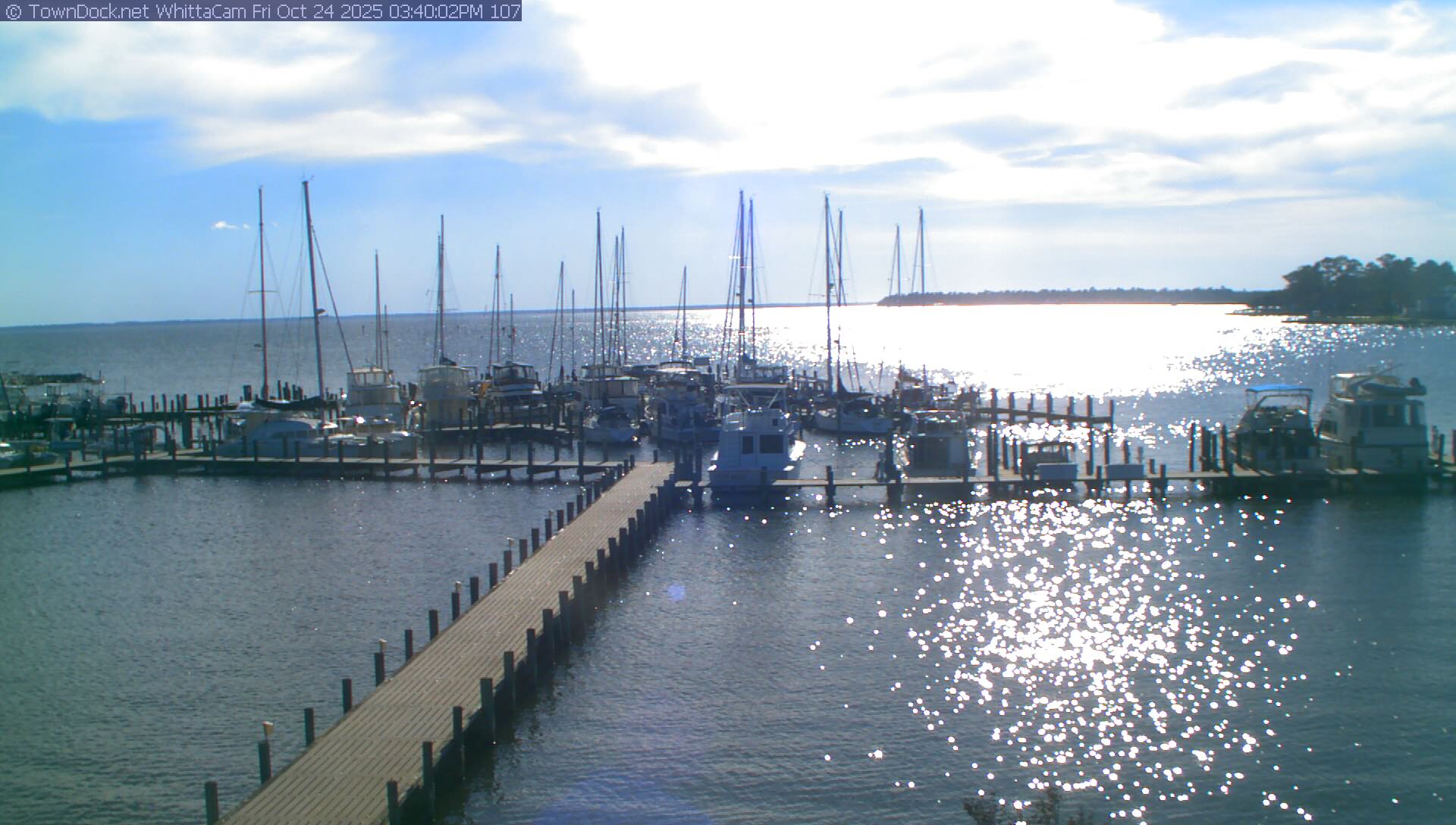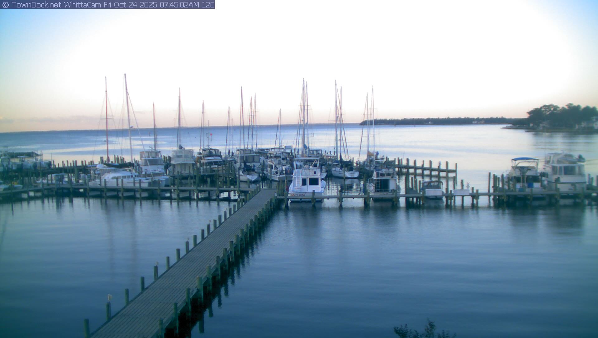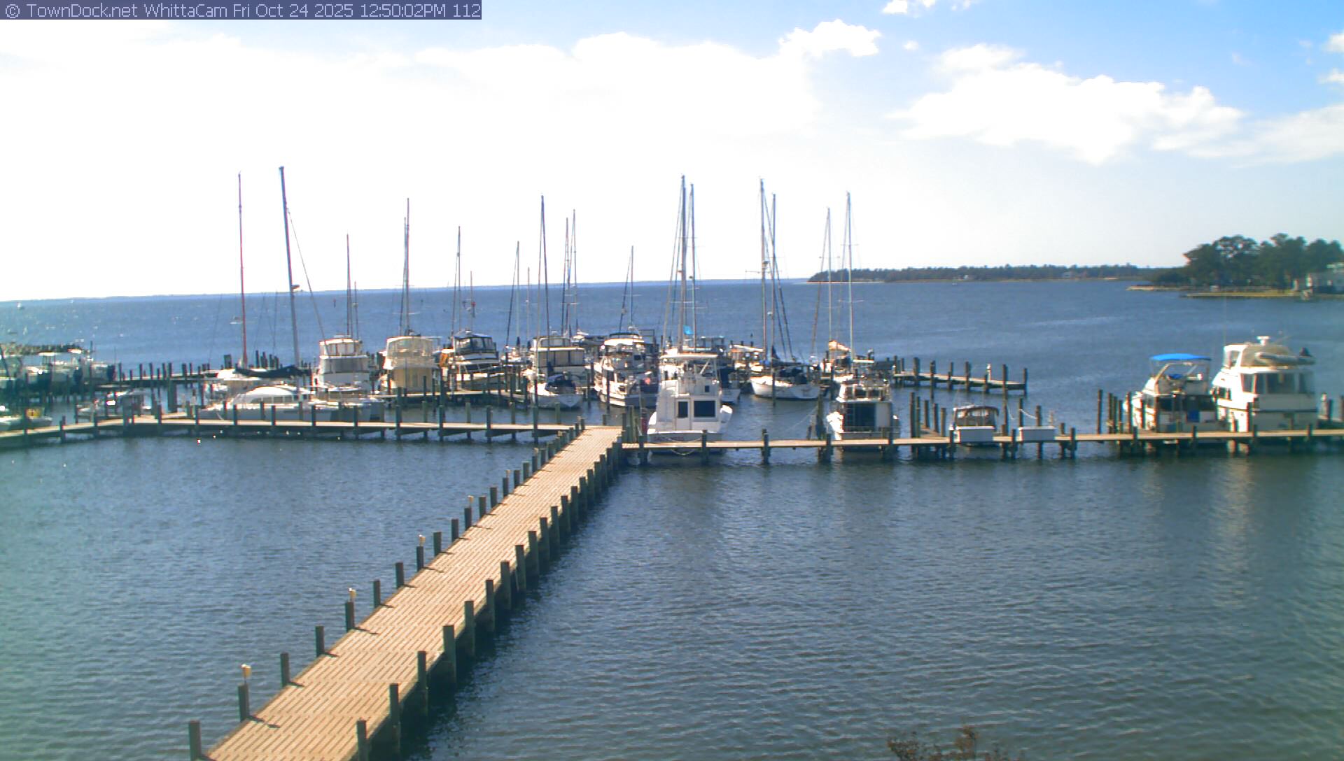 shows Whittaker Pointe Marina and the Whittaker Creek Channel entrance, with the Neuse River in the background. WhittaCam takes a new picture every five minutes from dawn til just before dusk. Click on the image to see a larger version. Once you see that larger version, you can click (see arrow at right) to go back in time and see recent photos. Harbor Cam currently takes photos from 6:30am to 6:40pm.