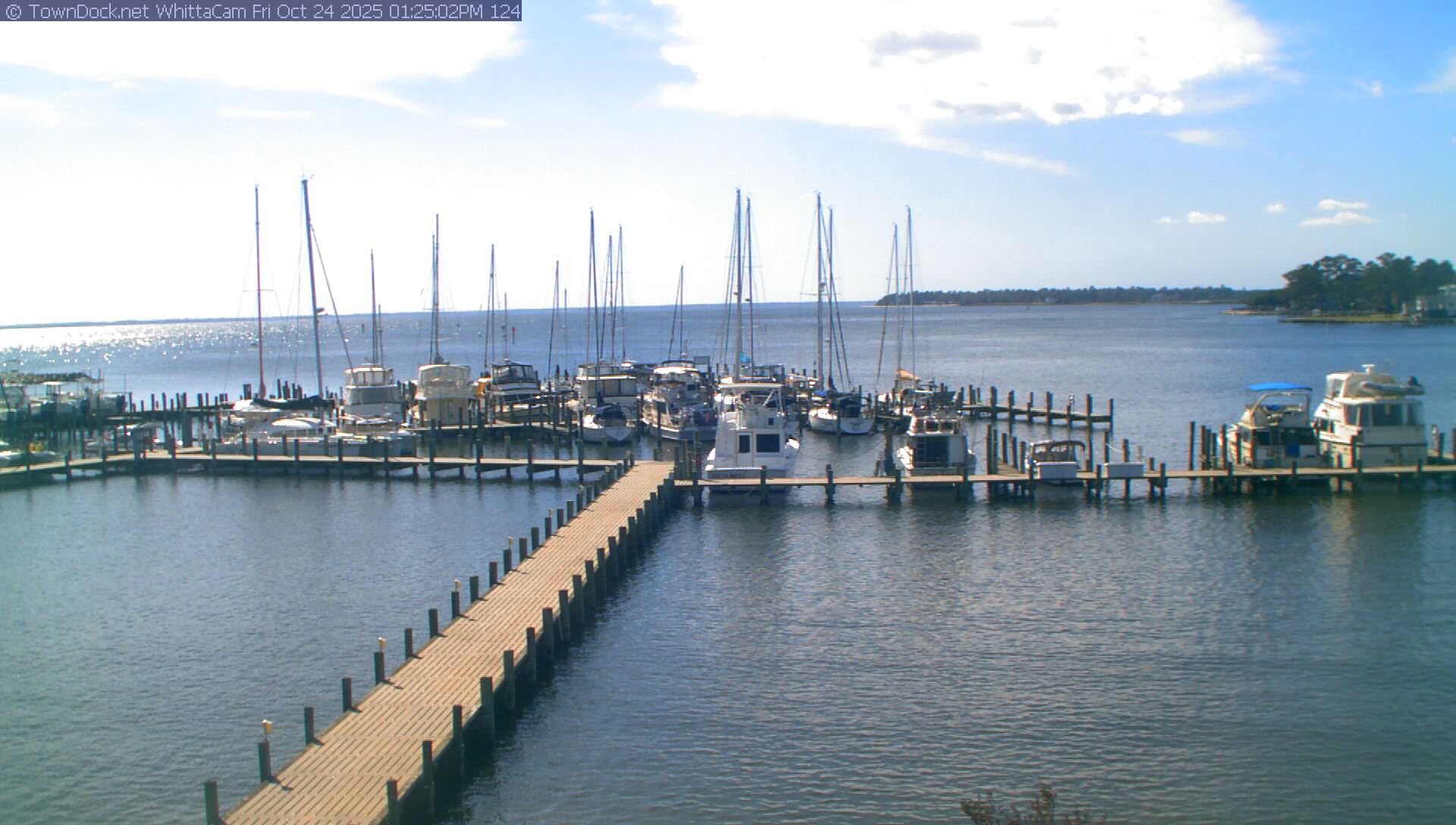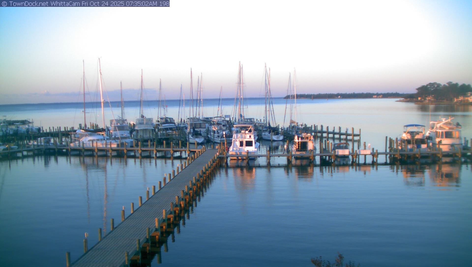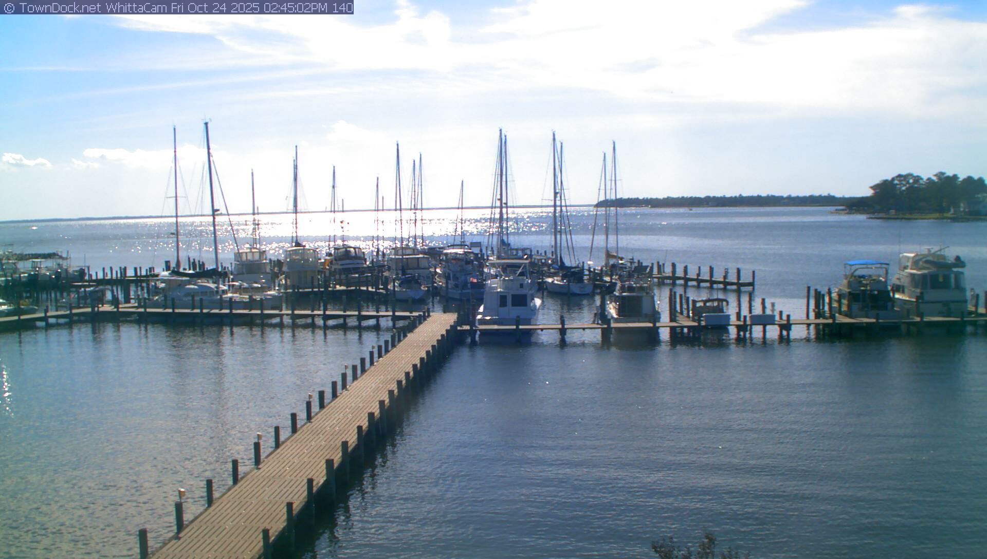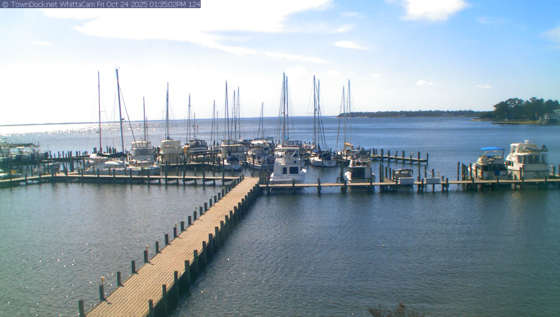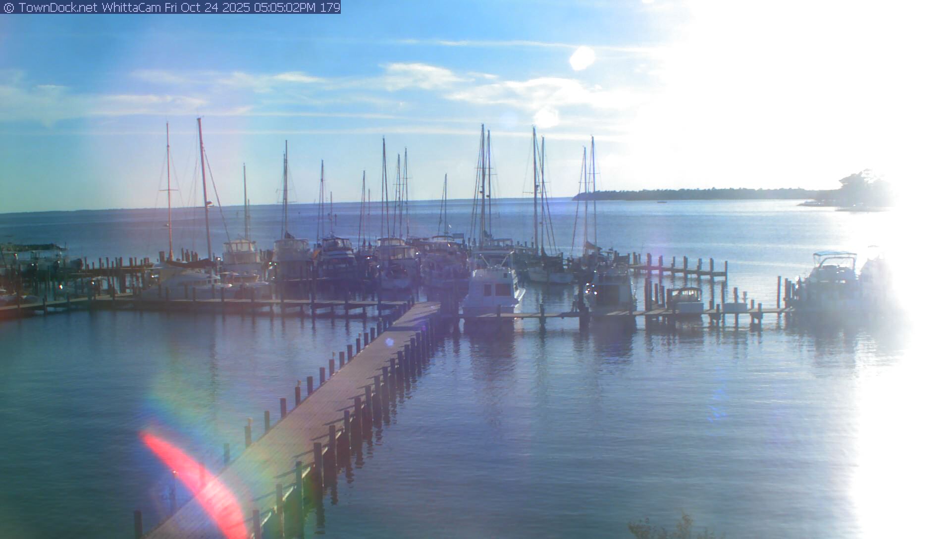 shows Whittaker Pointe Marina and the Whittaker Creek Channel entrance, with the Neuse River in the background. WhittaCam takes a new picture every five minutes from dawn til just before dusk. Click on the image to see a larger version. Once you see that larger version, you can click (see arrow at right) to go back in time and see recent photos. Harbor Cam currently takes photos from 6:30am to 6:40pm.