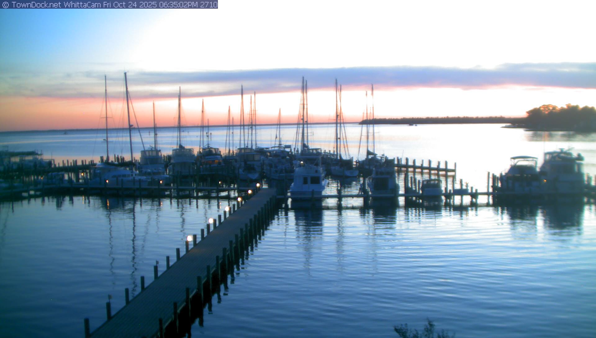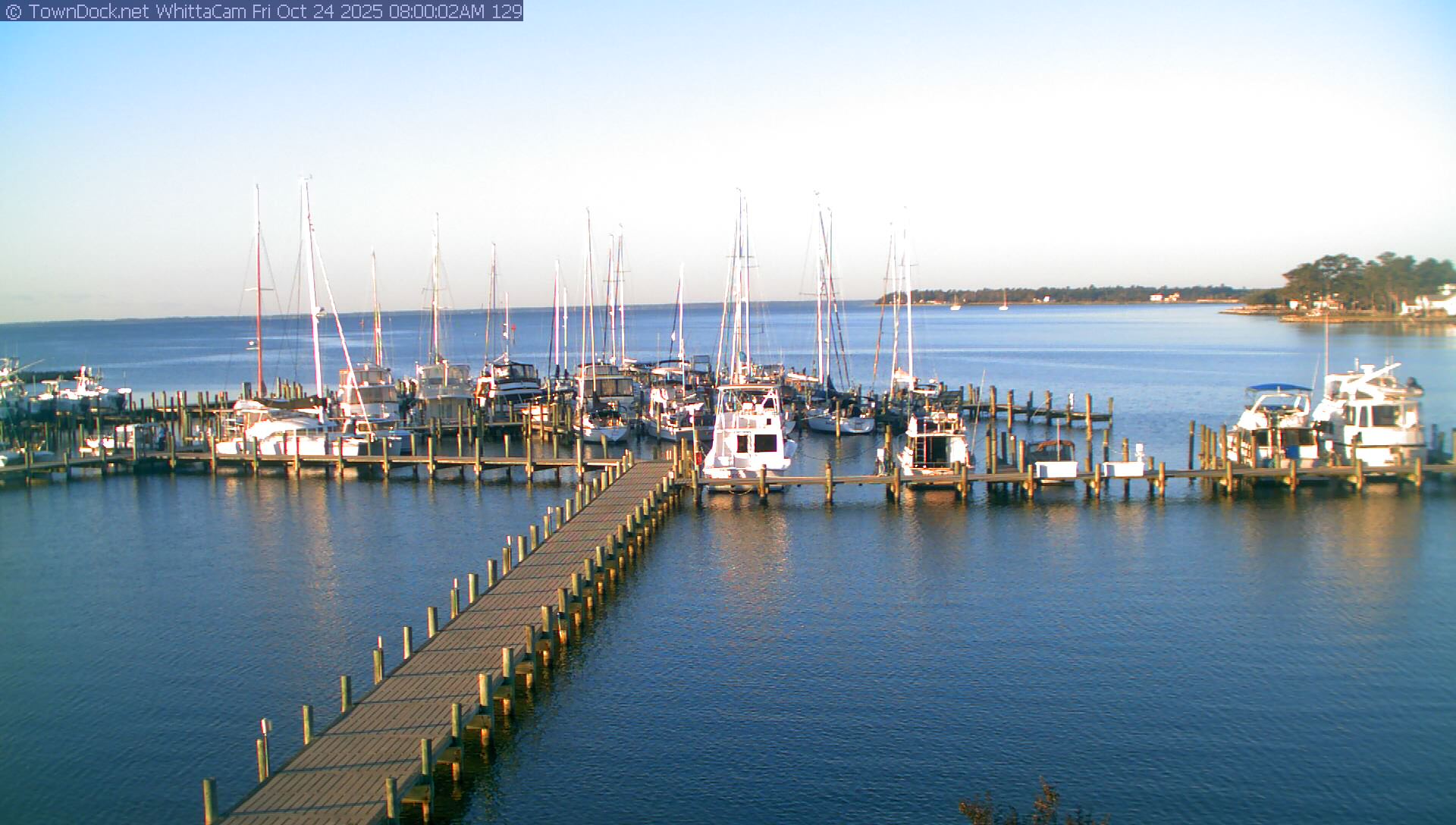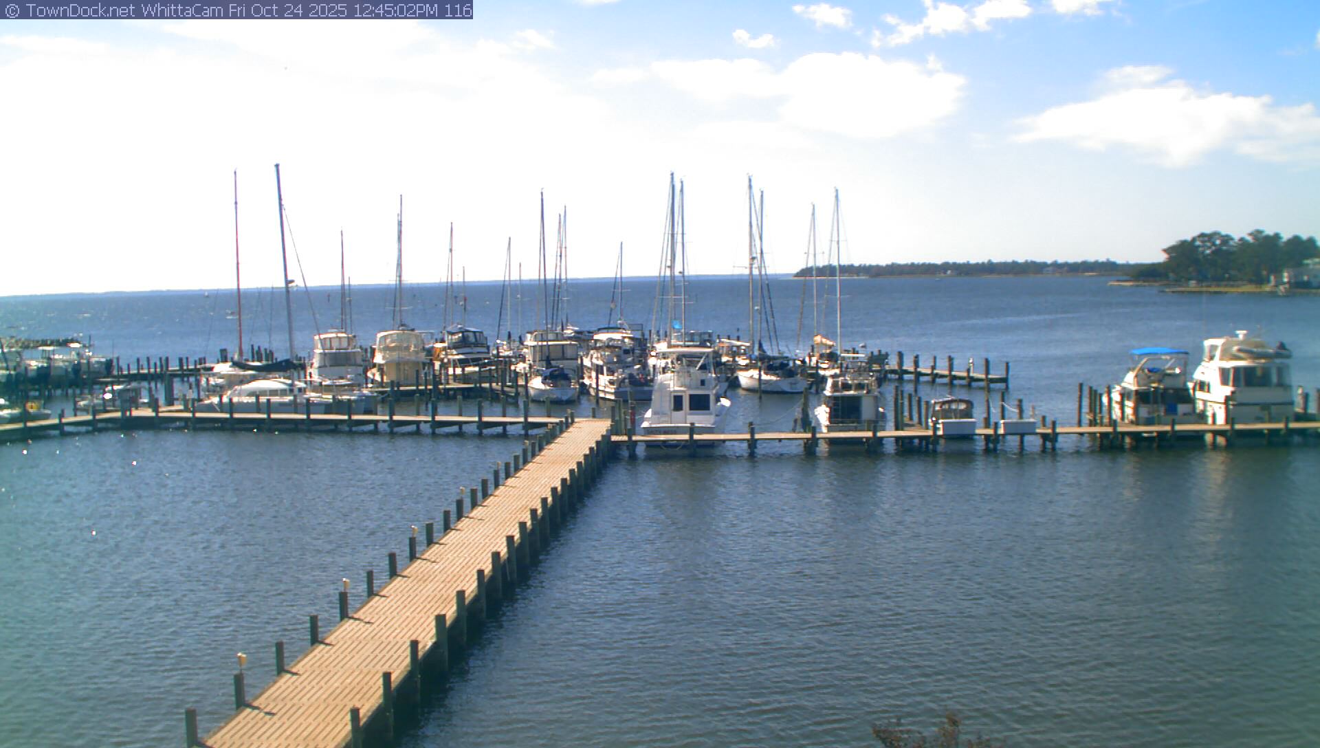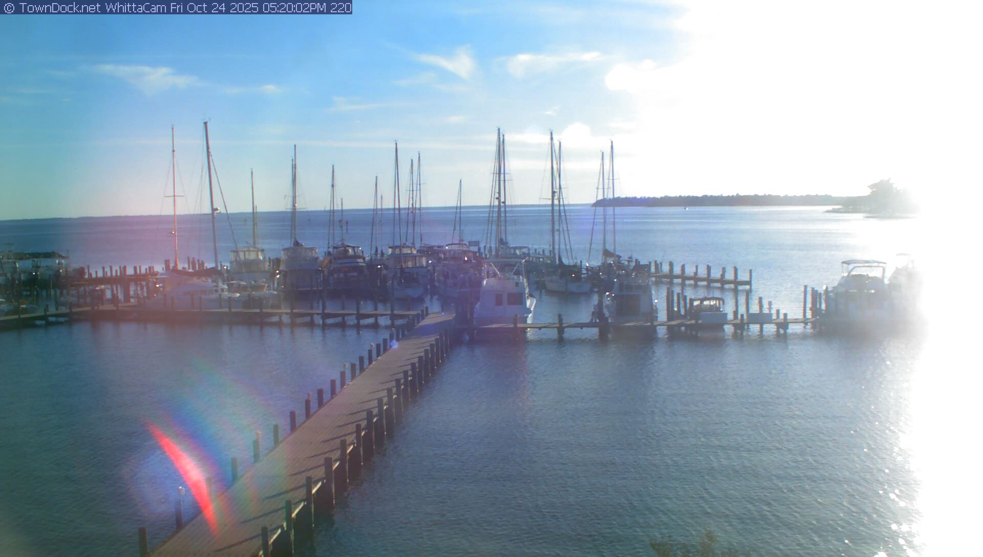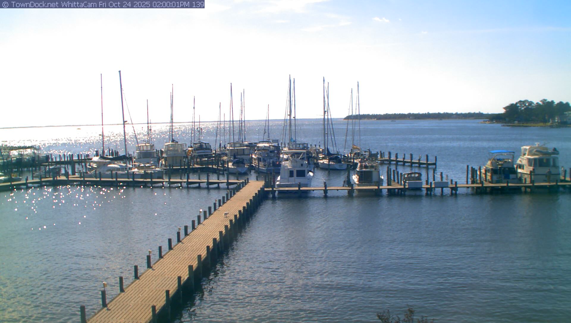 shows Whittaker Pointe Marina and the Whittaker Creek Channel entrance, with the Neuse River in the background. WhittaCam takes a new picture every five minutes from dawn til just before dusk. Click on the image to see a larger version. Once you see that larger version, you can click (see arrow at right) to go back in time and see recent photos. Harbor Cam currently takes photos from 6:30am to 6:40pm.