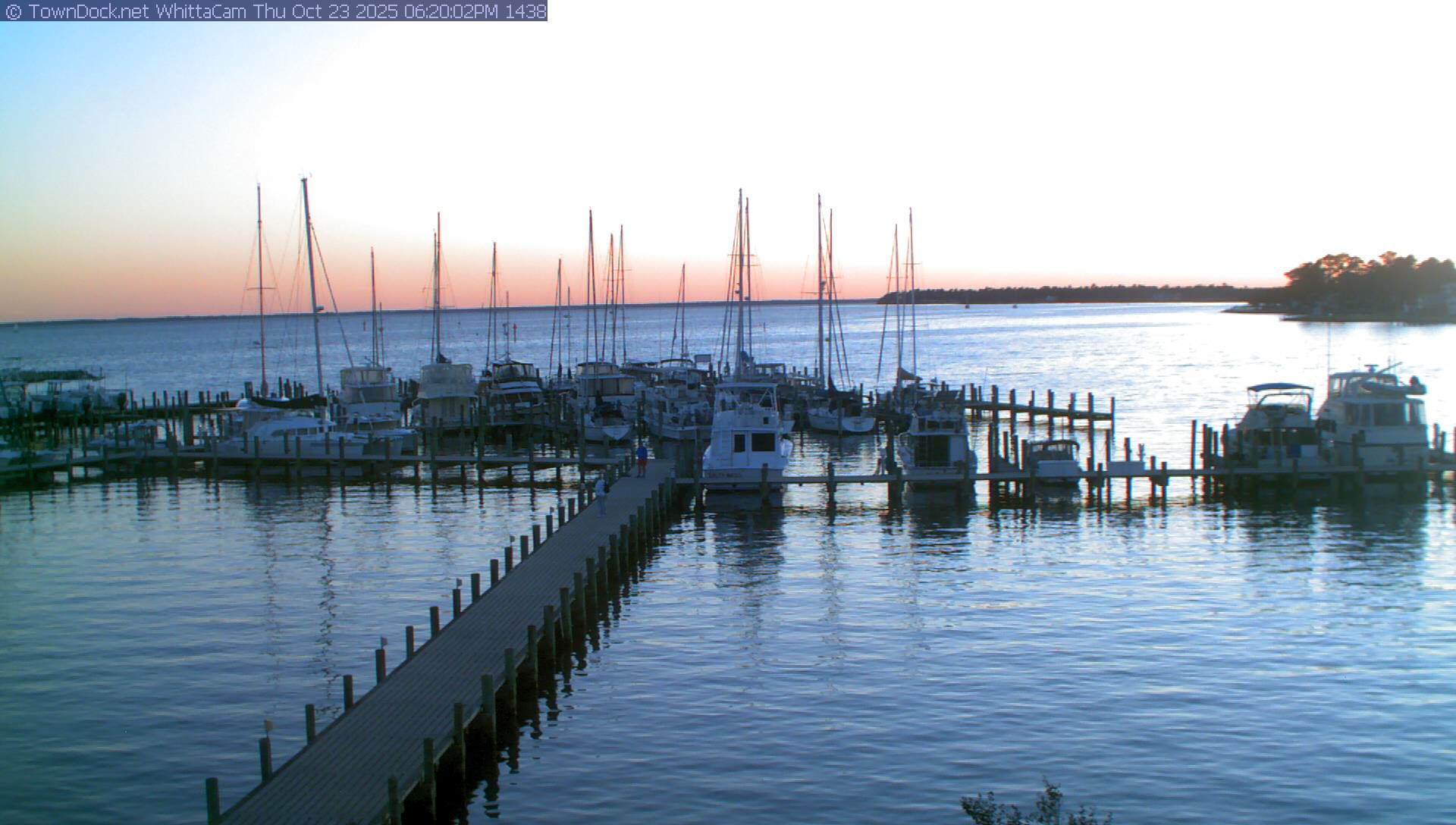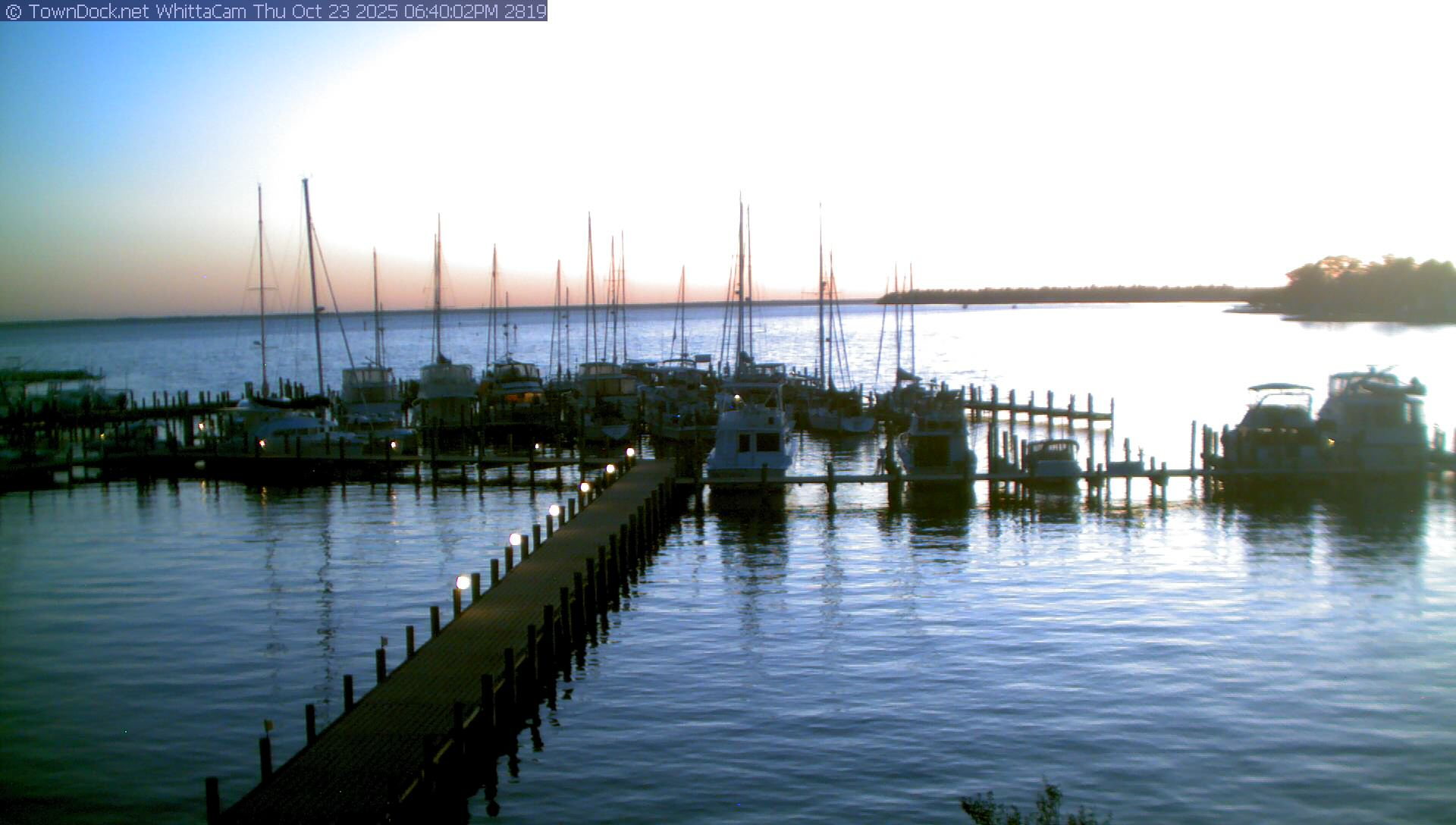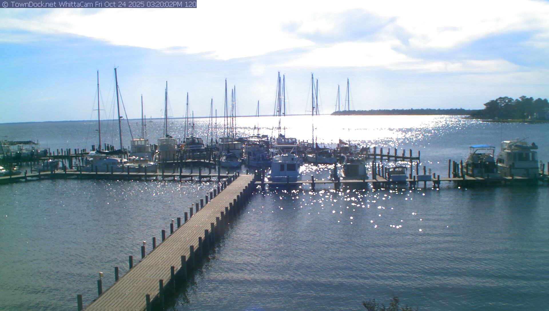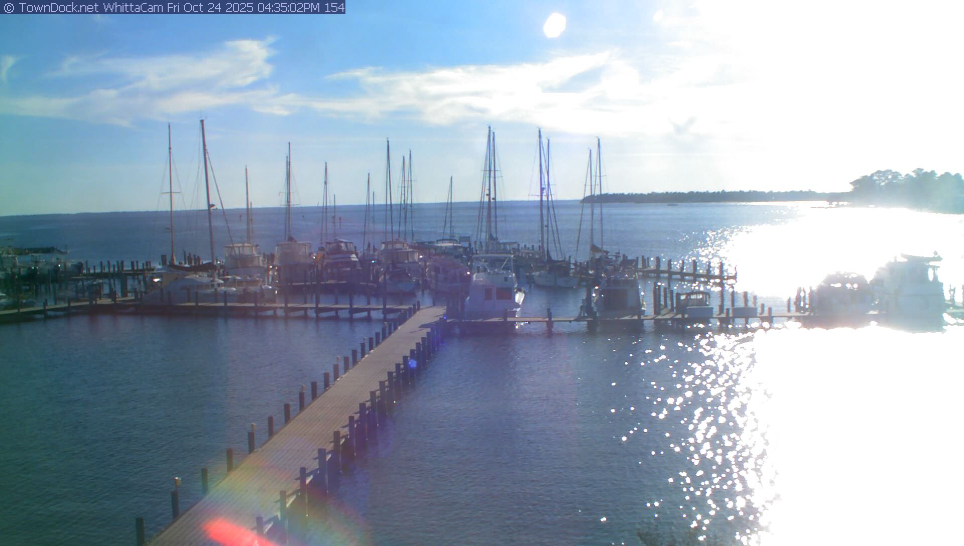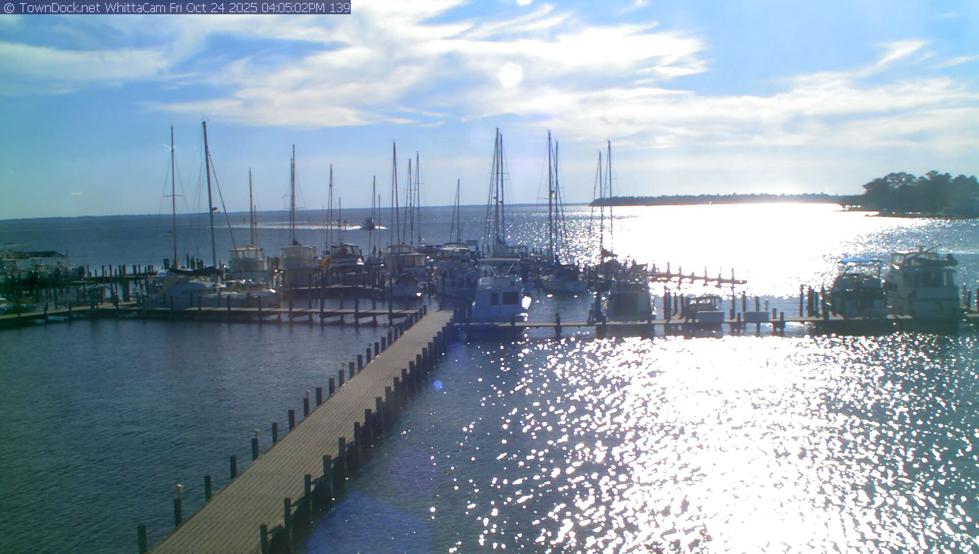 shows Whittaker Pointe Marina and the Whittaker Creek Channel entrance, with the Neuse River in the background. WhittaCam takes a new picture every five minutes from dawn til just before dusk. Click on the image to see a larger version. Once you see that larger version, you can click (see arrow at right) to go back in time and see recent photos. Harbor Cam currently takes photos from 6:30am to 6:40pm.