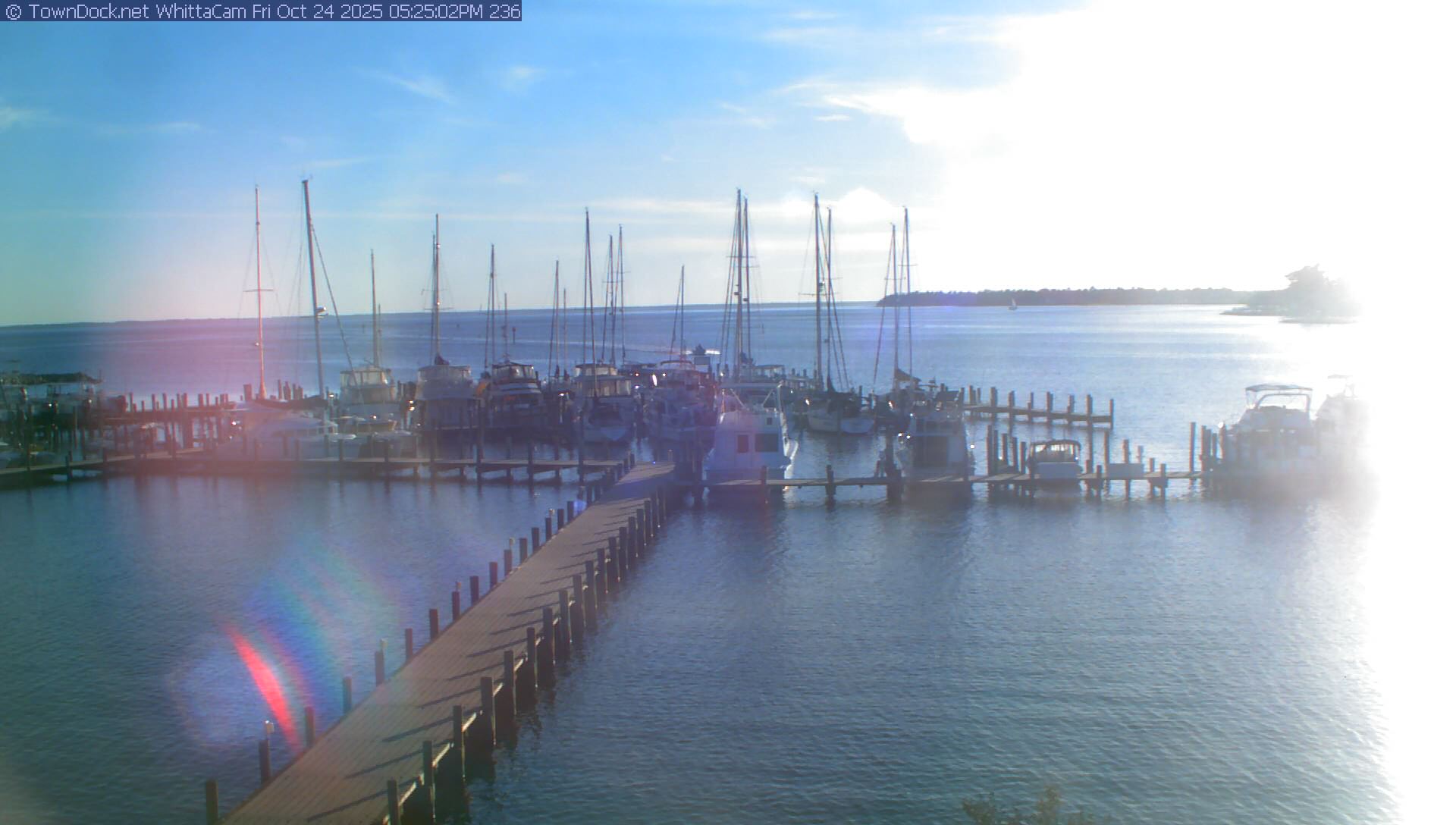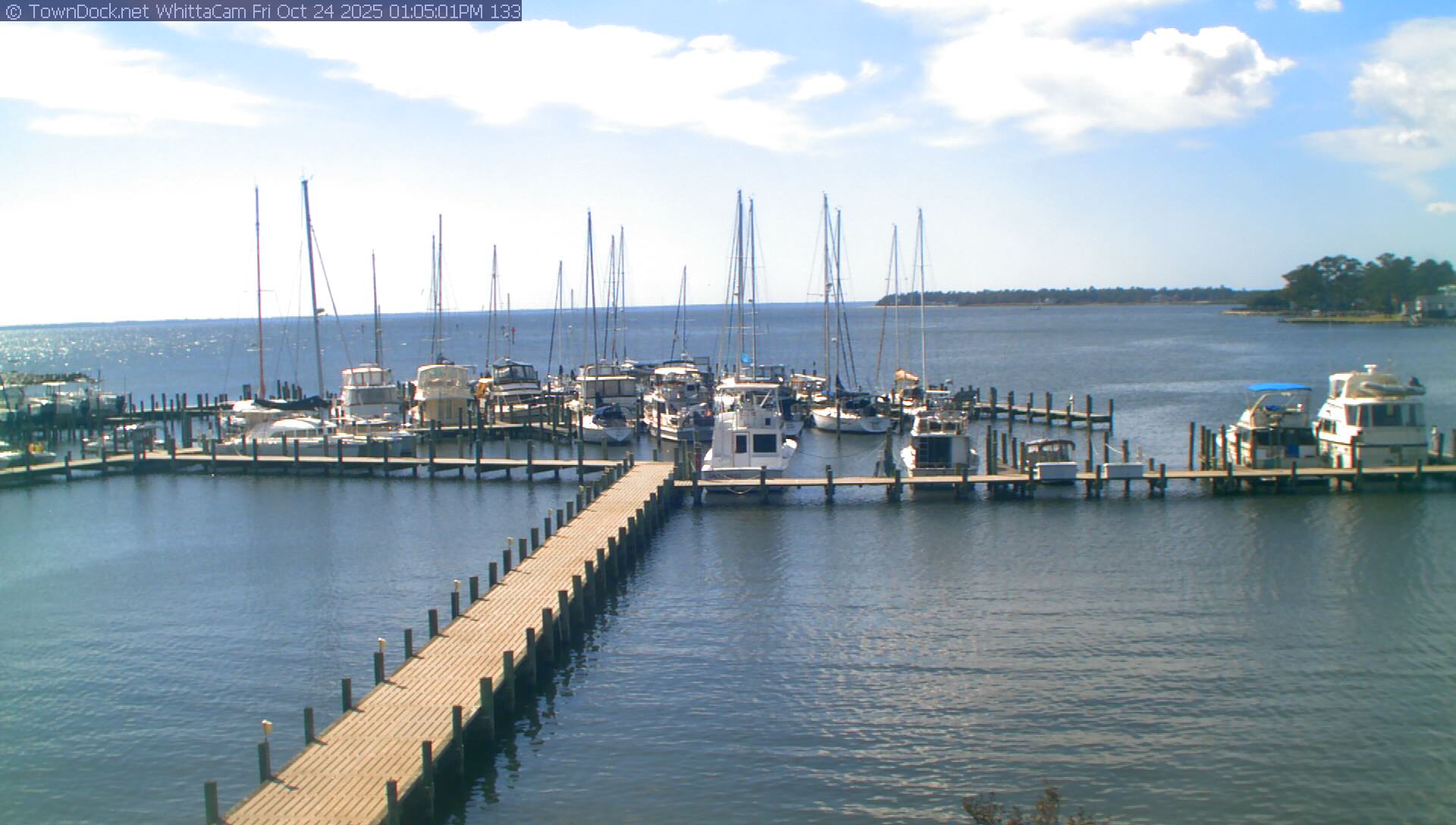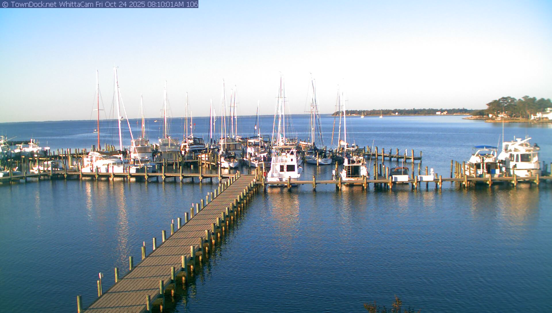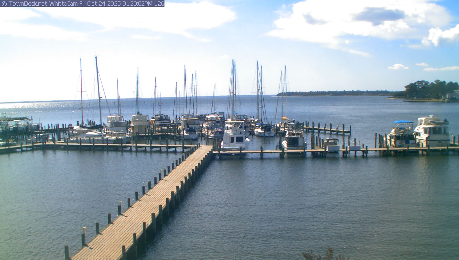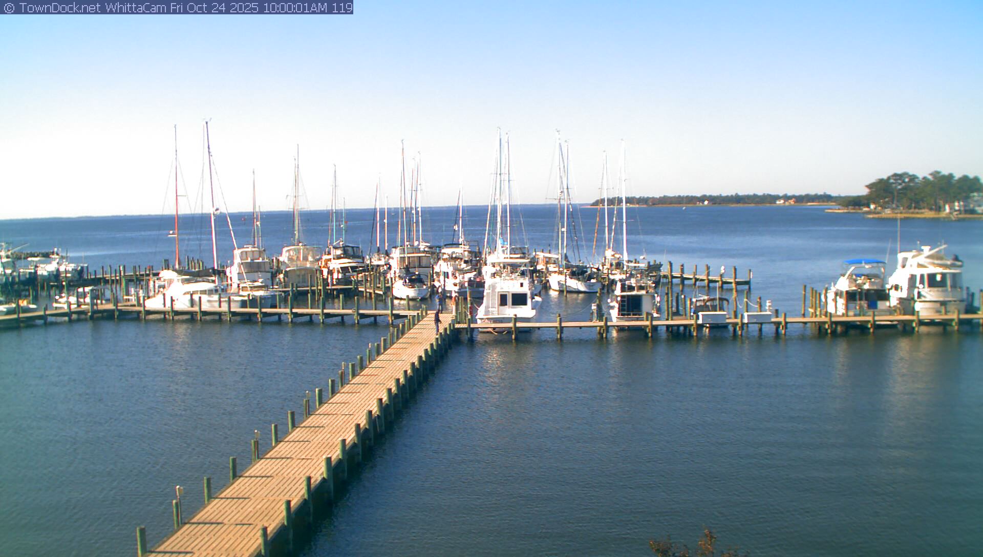 shows Whittaker Pointe Marina and the Whittaker Creek Channel entrance, with the Neuse River in the background. WhittaCam takes a new picture every five minutes from dawn til just before dusk. Click on the image to see a larger version. Once you see that larger version, you can click (see arrow at right) to go back in time and see recent photos. Harbor Cam currently takes photos from 6:30am to 6:40pm.