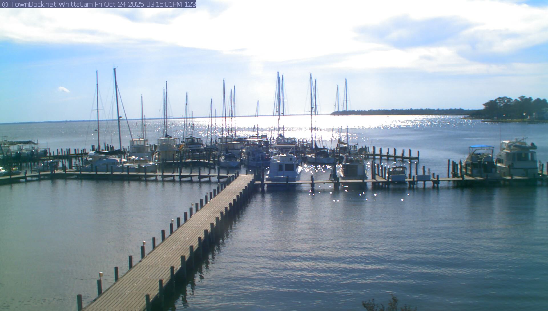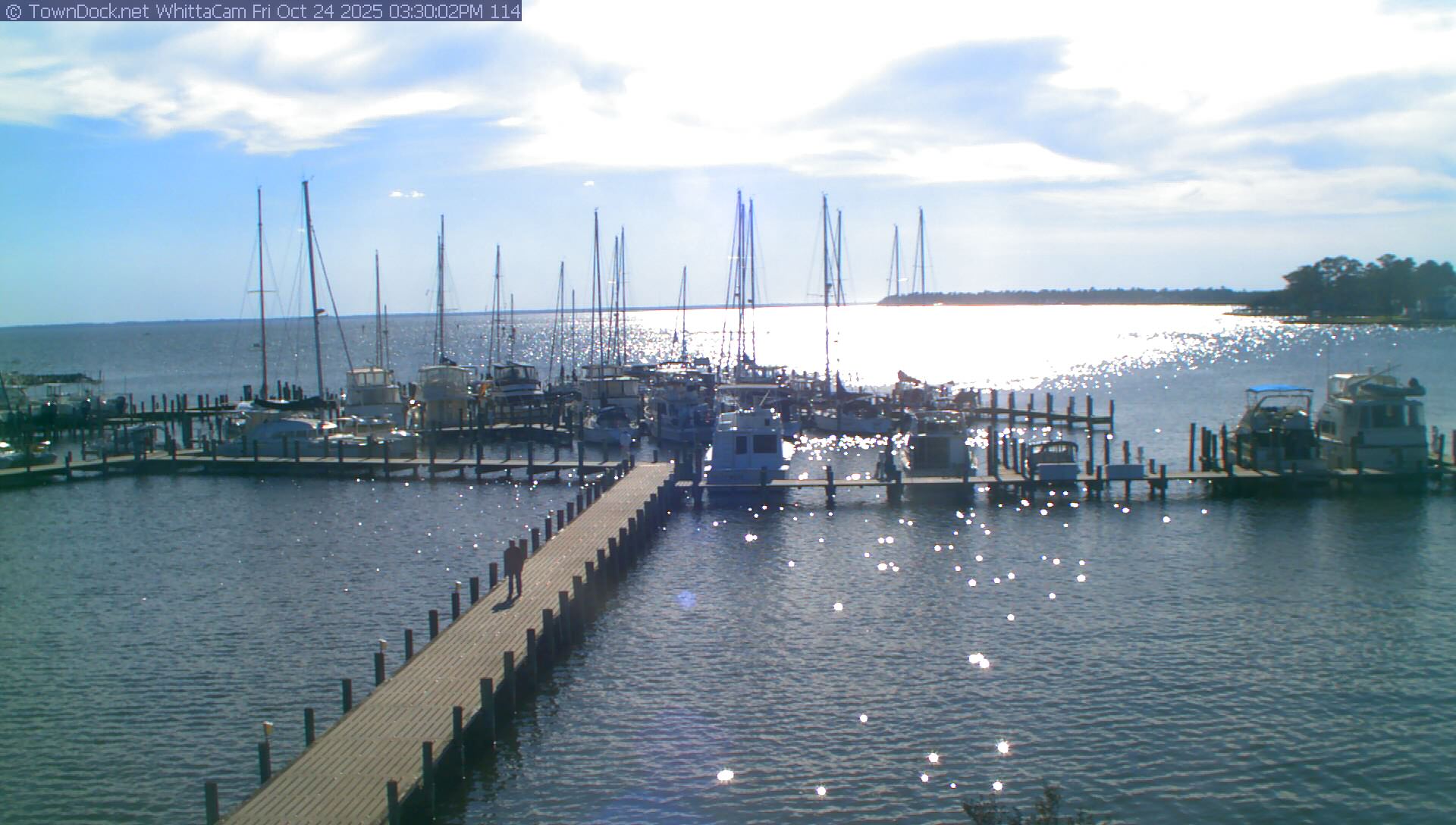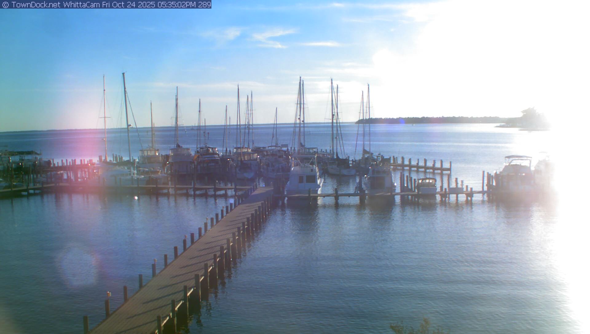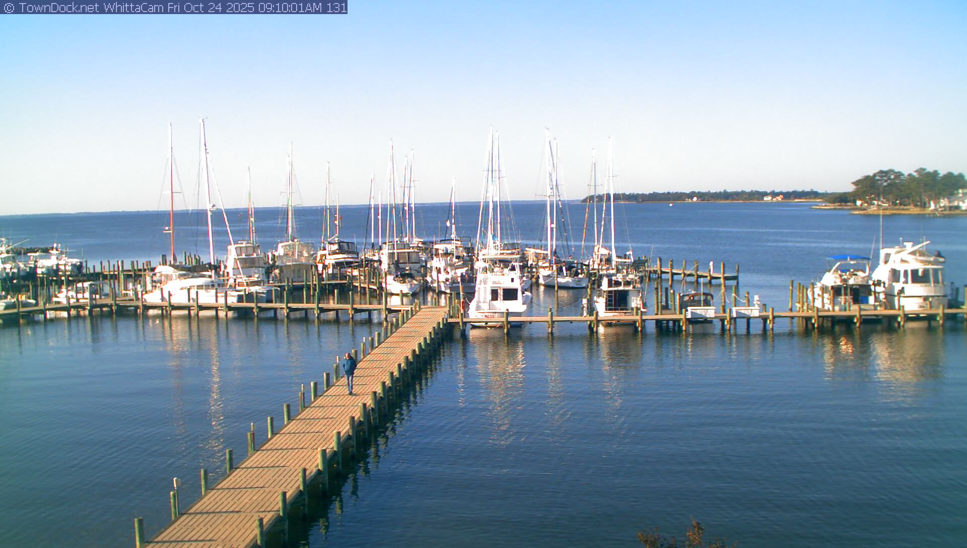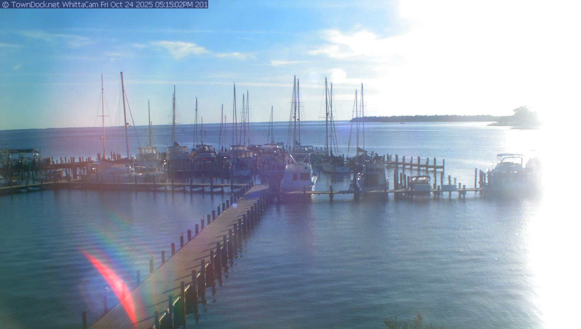 shows Whittaker Pointe Marina and the Whittaker Creek Channel entrance, with the Neuse River in the background. WhittaCam takes a new picture every five minutes from dawn til just before dusk. Click on the image to see a larger version. Once you see that larger version, you can click (see arrow at right) to go back in time and see recent photos. Harbor Cam currently takes photos from 6:30am to 6:40pm.