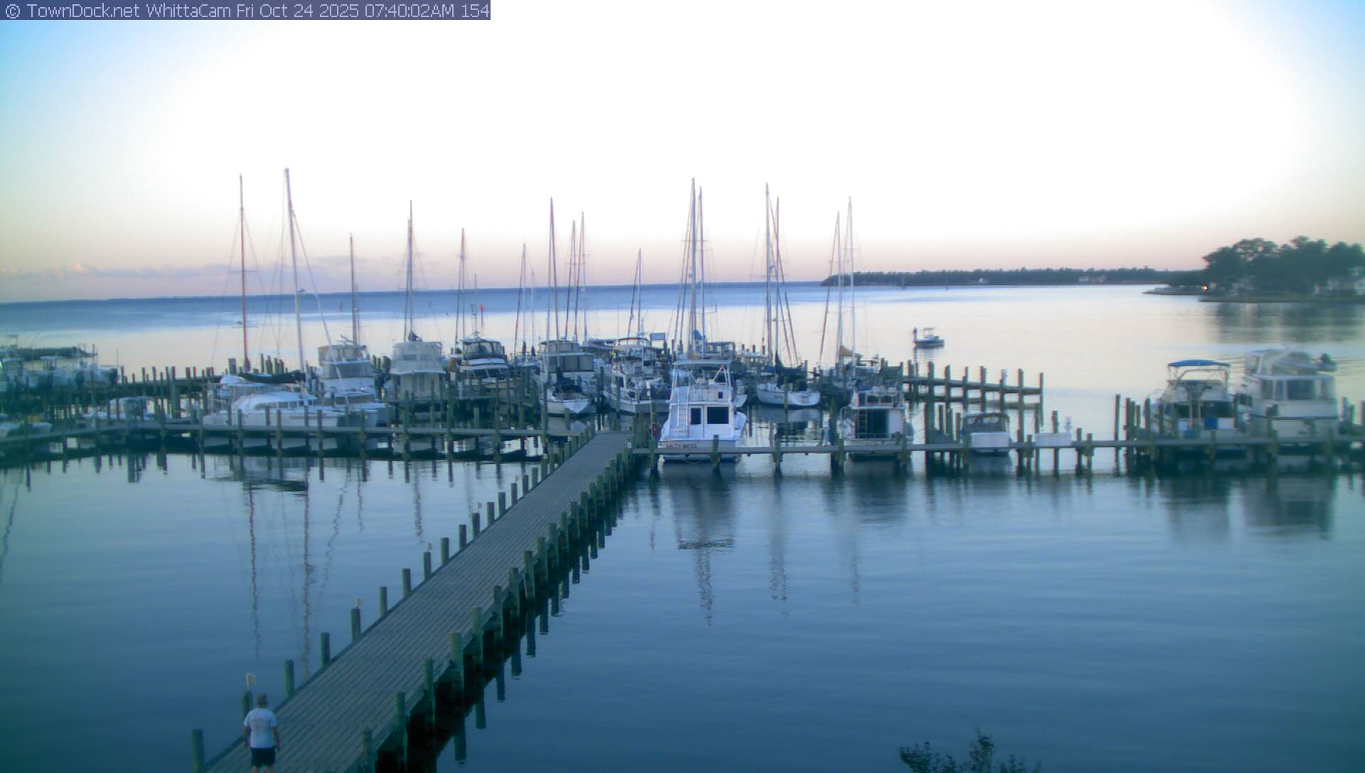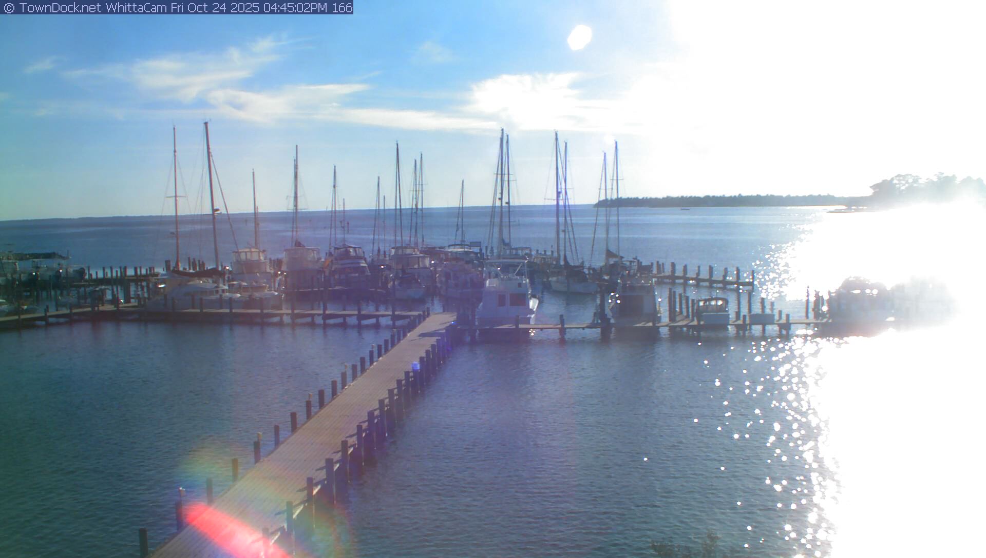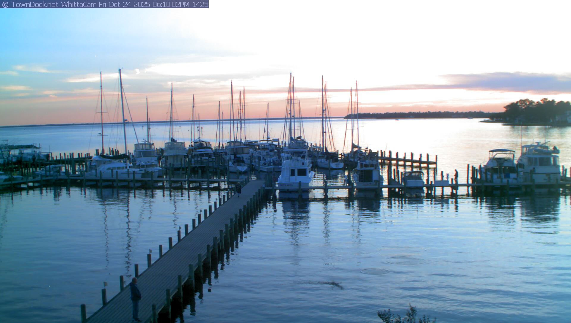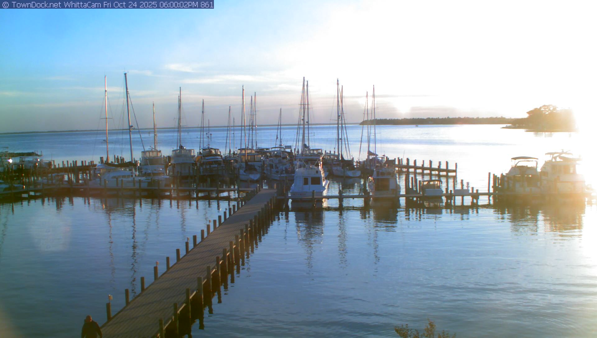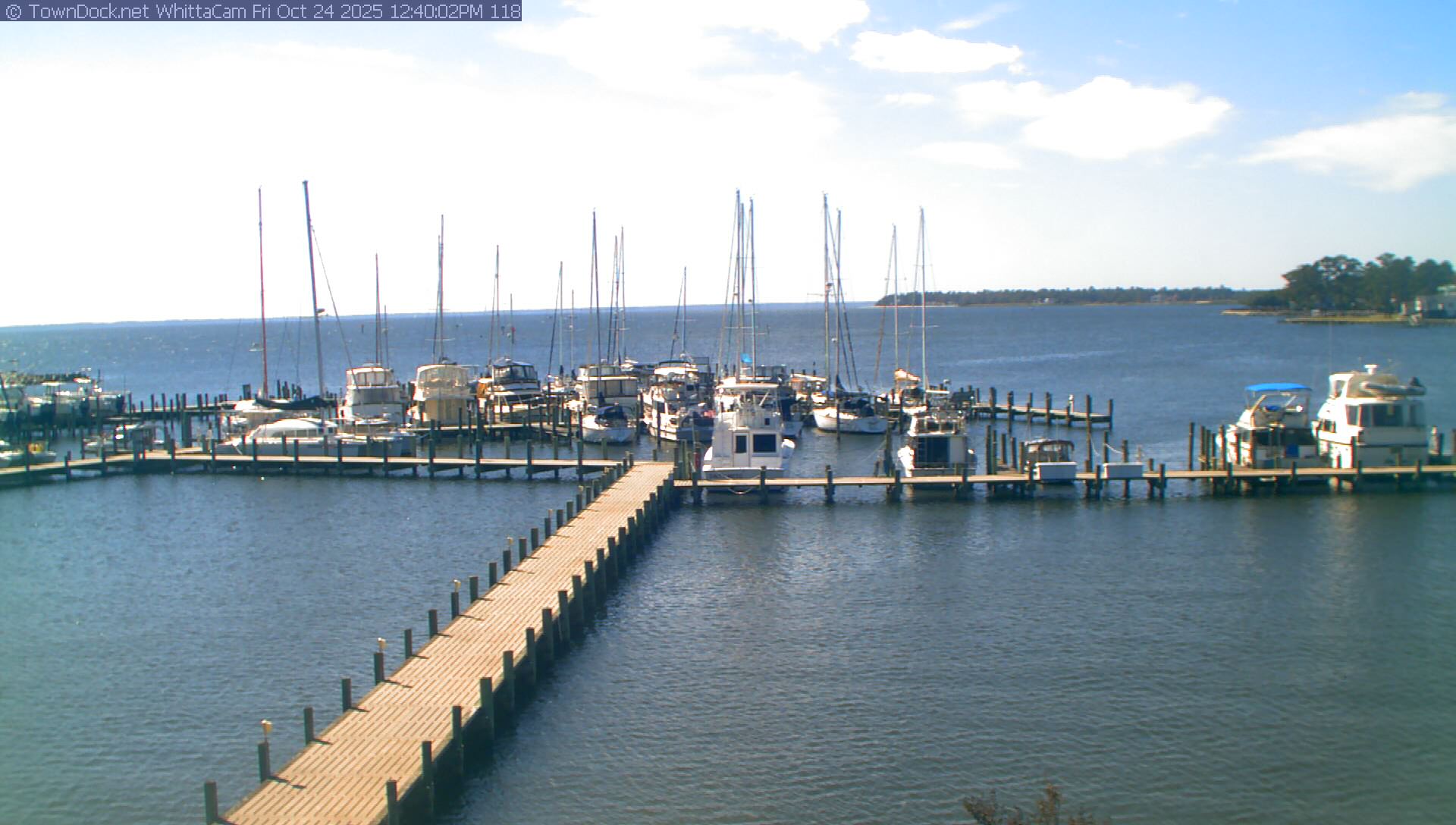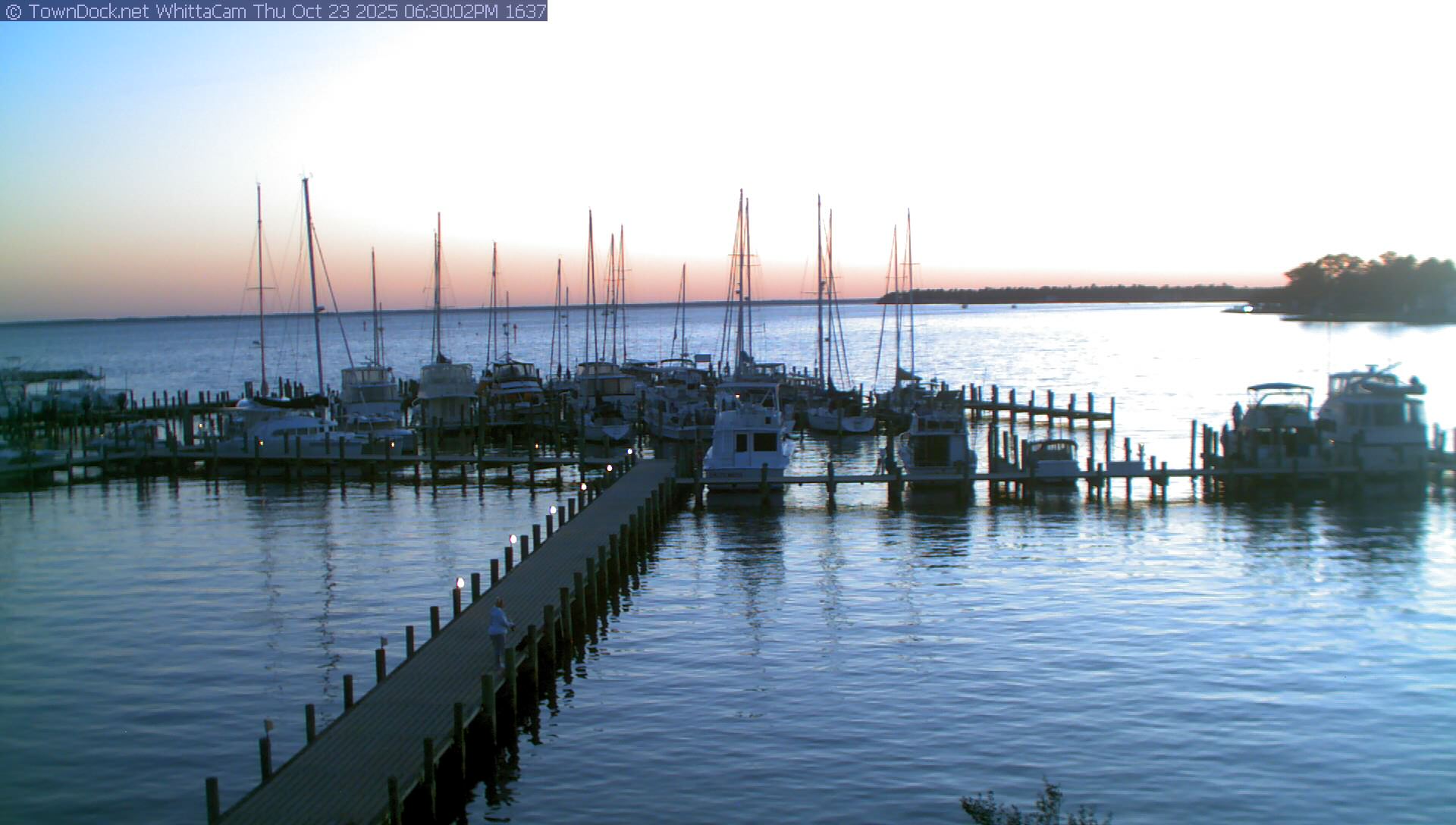 shows Whittaker Pointe Marina and the Whittaker Creek Channel entrance, with the Neuse River in the background. WhittaCam takes a new picture every five minutes from dawn til just before dusk. Click on the image to see a larger version. Once you see that larger version, you can click (see arrow at right) to go back in time and see recent photos. Harbor Cam currently takes photos from 6:30am to 6:40pm.