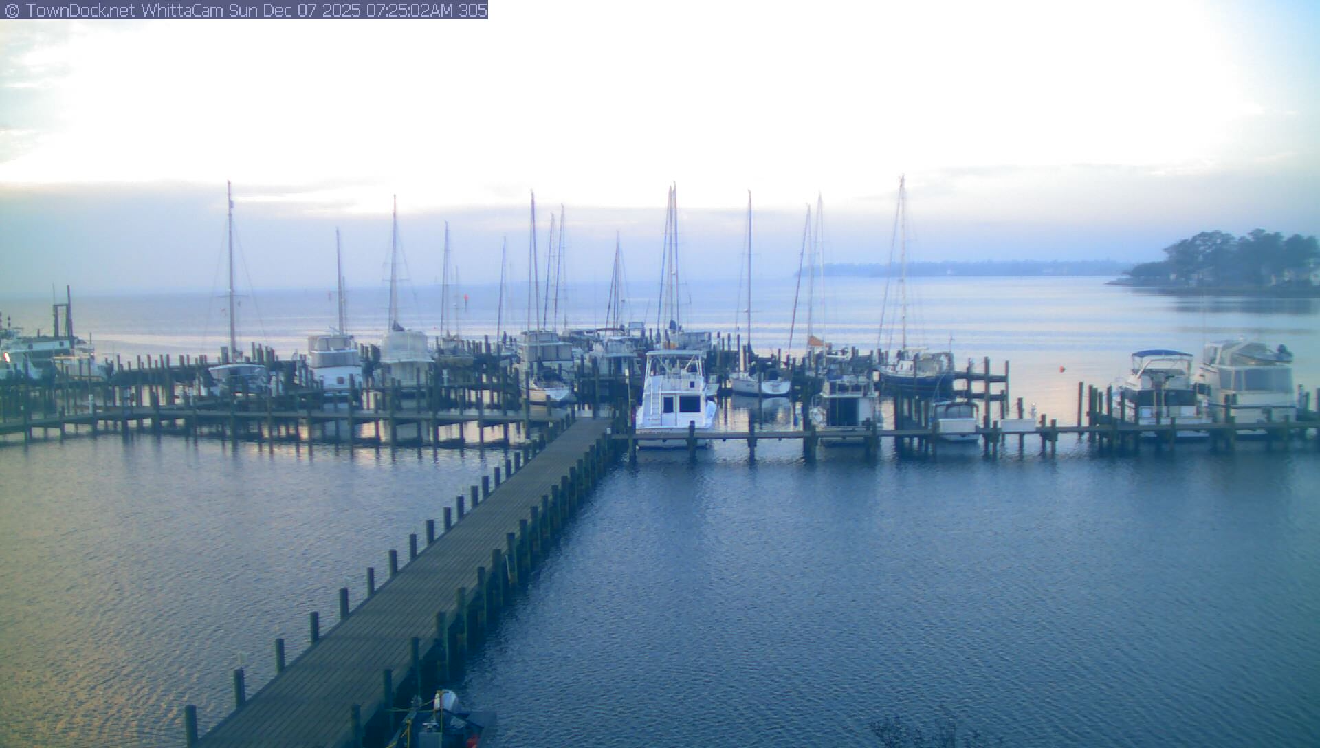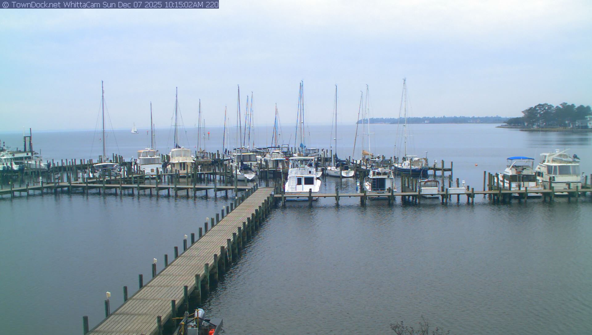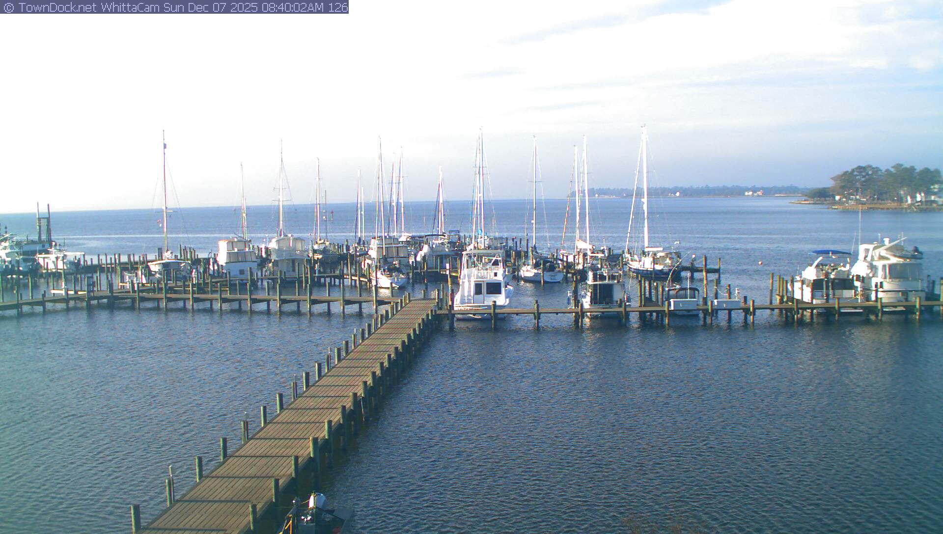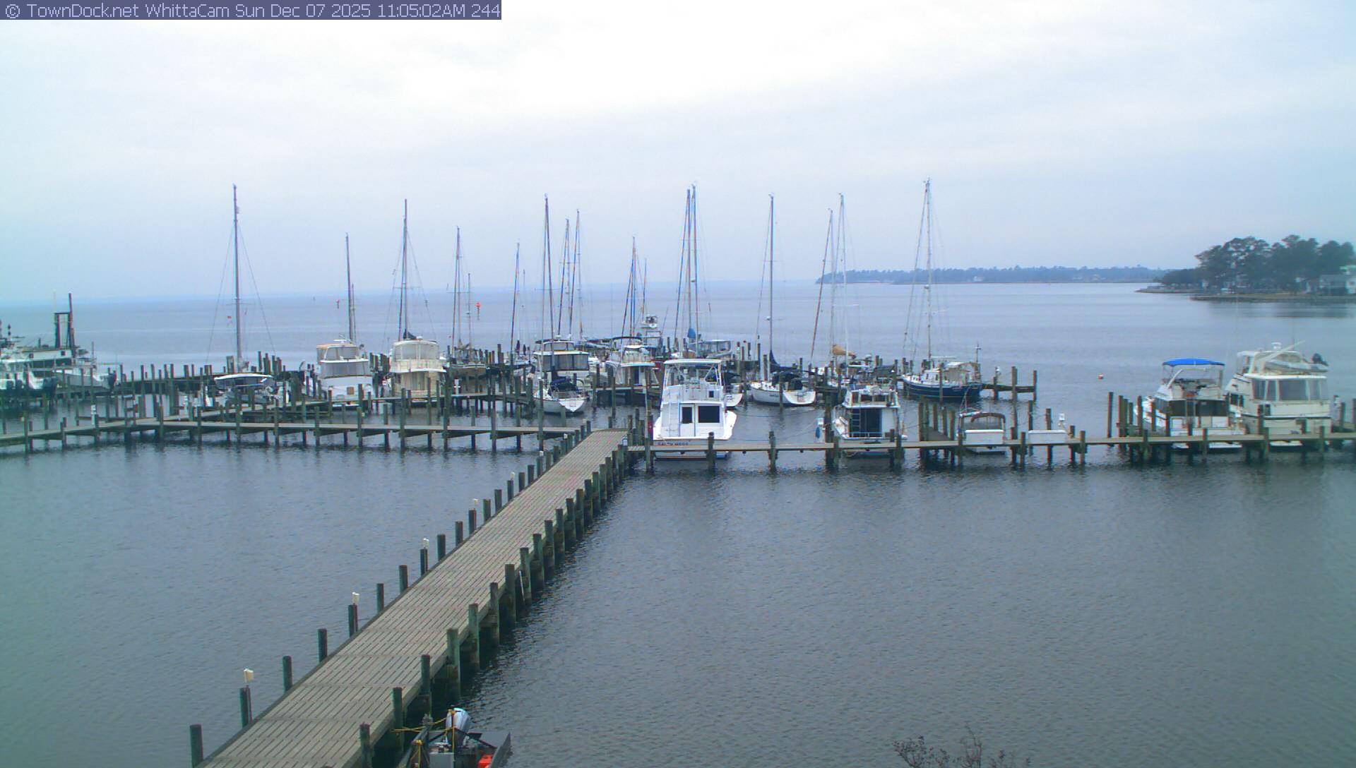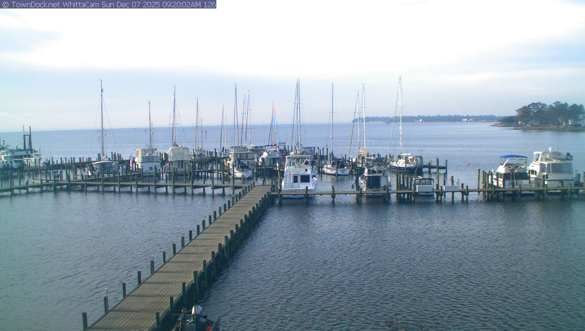 shows Whittaker Pointe Marina and the Whittaker Creek Channel entrance, with the Neuse River in the background. WhittaCam takes a new picture every five minutes from dawn til just before dusk. Click on the image to see a larger version. Once you see that larger version, you can click (see arrow at right) to go back in time and see recent photos. Harbor Cam currently takes photos from 6:00am to 5:20pm.