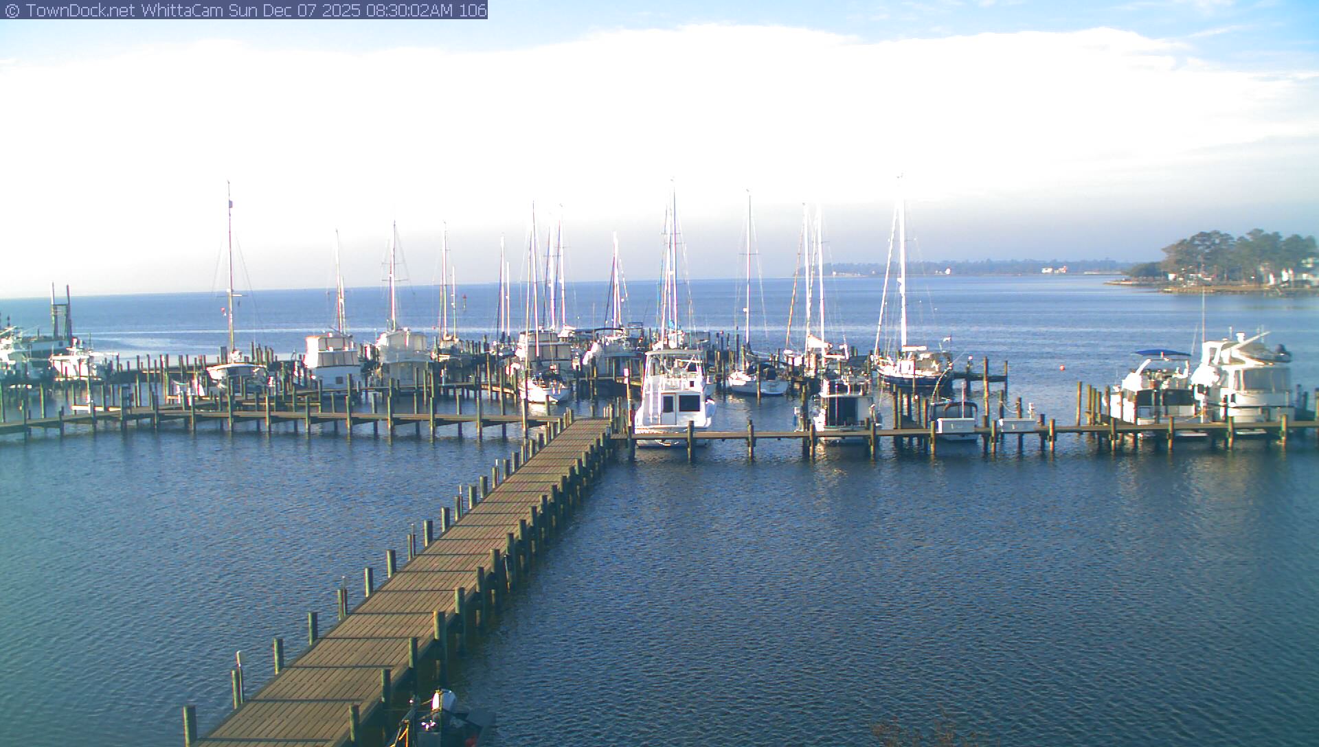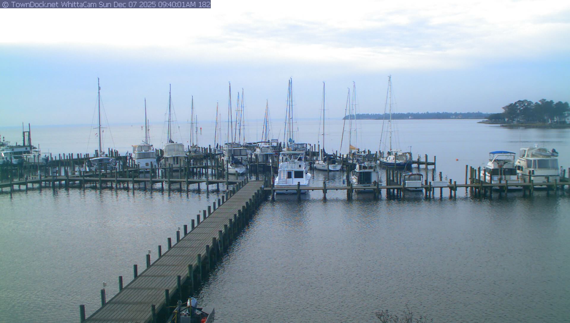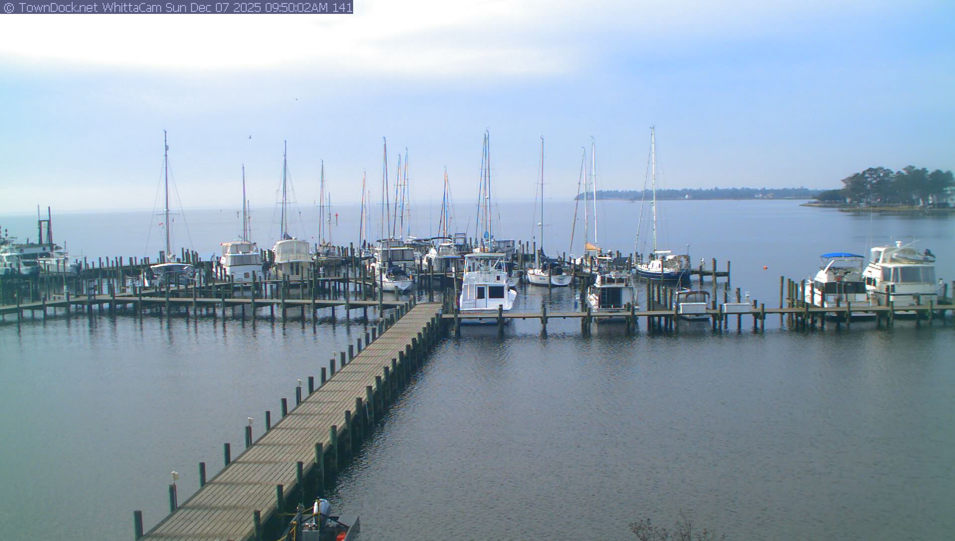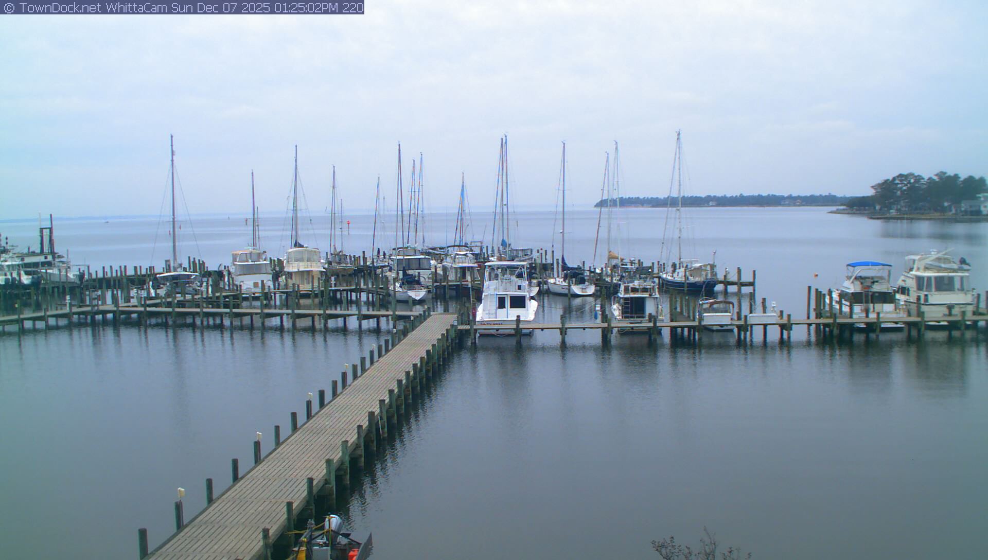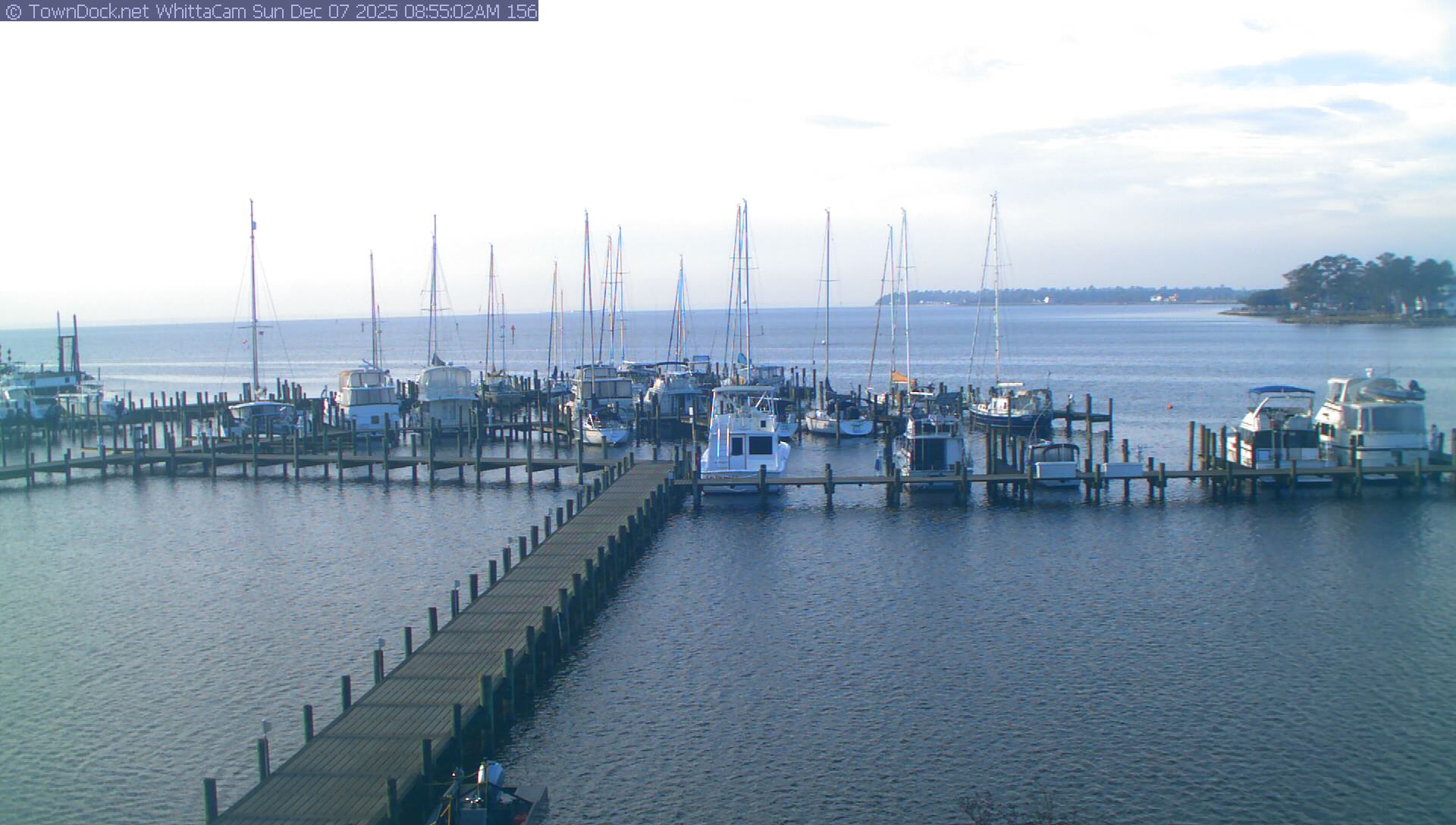 shows Whittaker Pointe Marina and the Whittaker Creek Channel entrance, with the Neuse River in the background. WhittaCam takes a new picture every five minutes from dawn til just before dusk. Click on the image to see a larger version. Once you see that larger version, you can click (see arrow at right) to go back in time and see recent photos. Harbor Cam currently takes photos from 6:00am to 5:20pm.