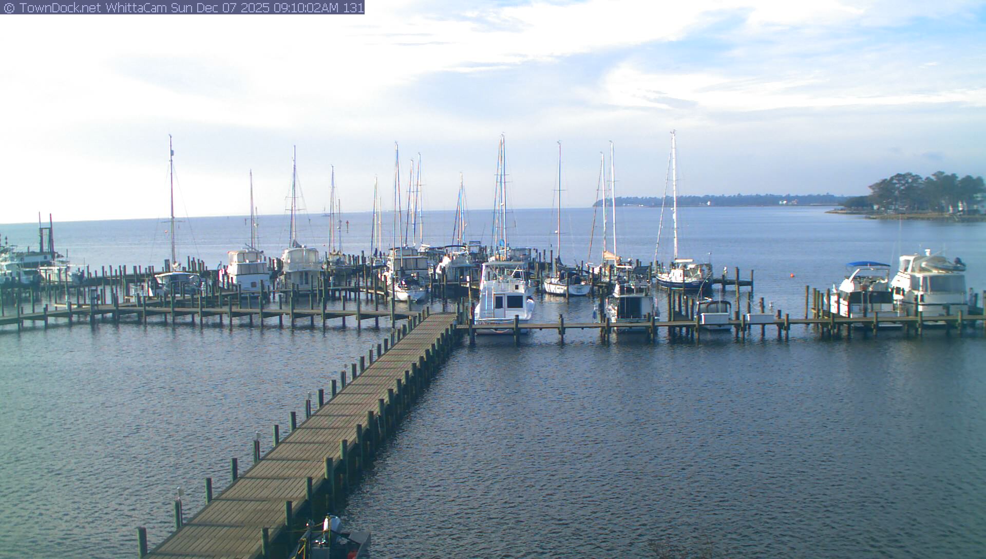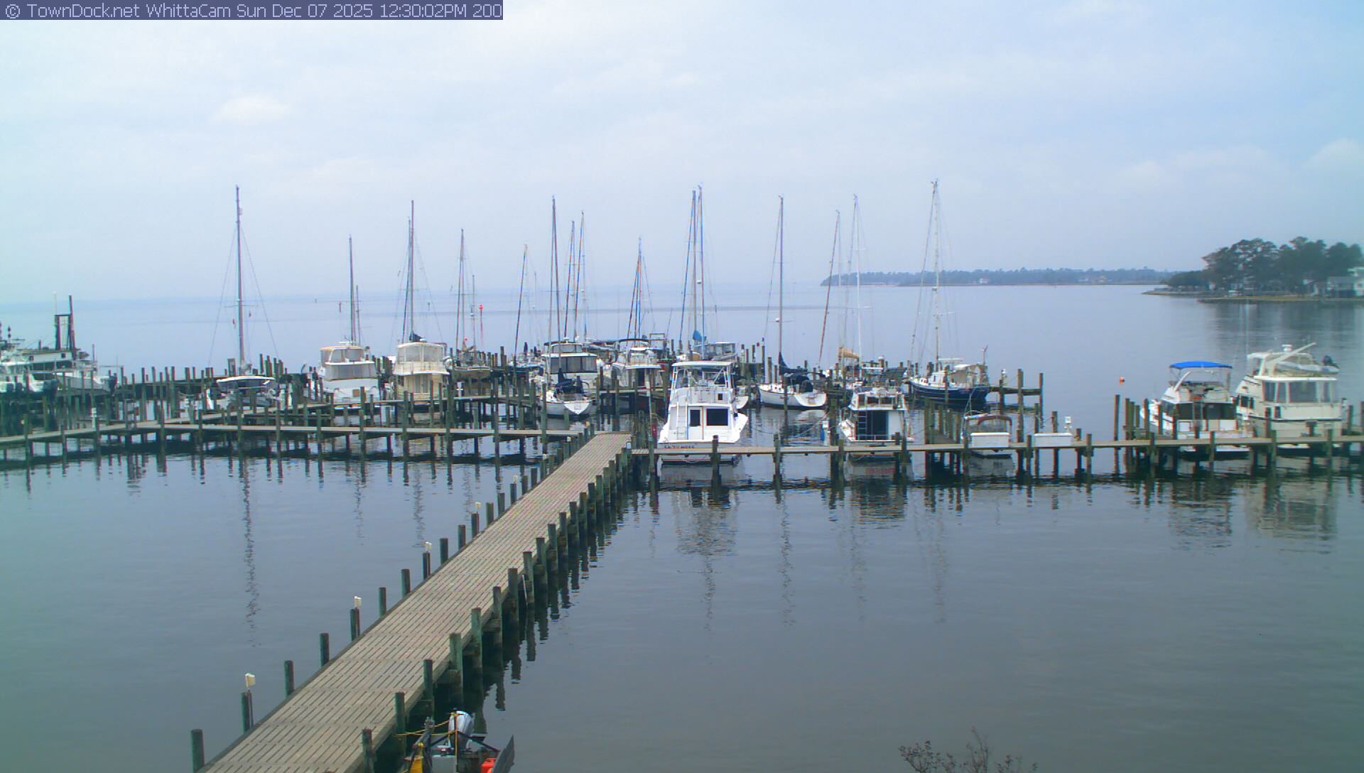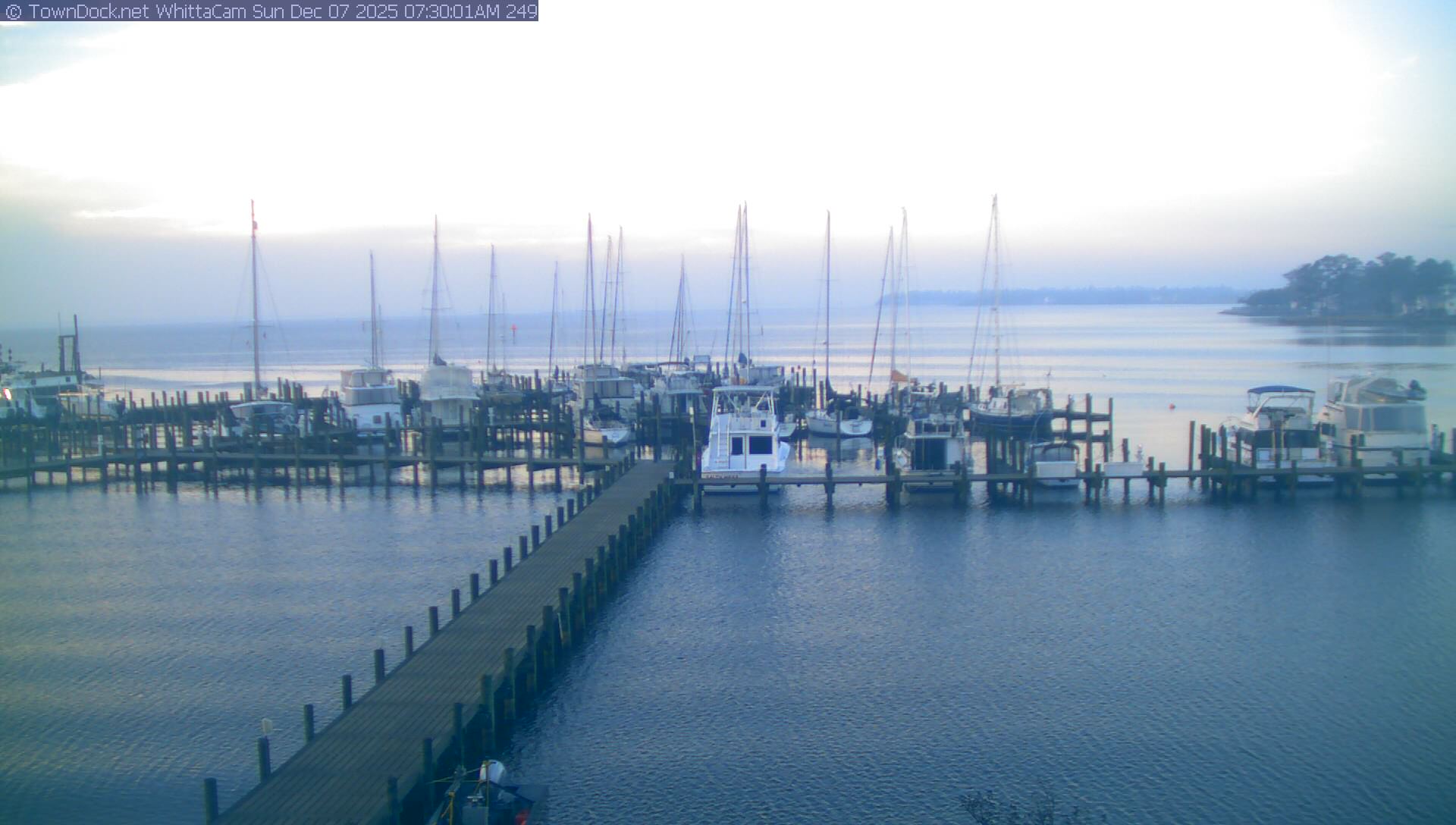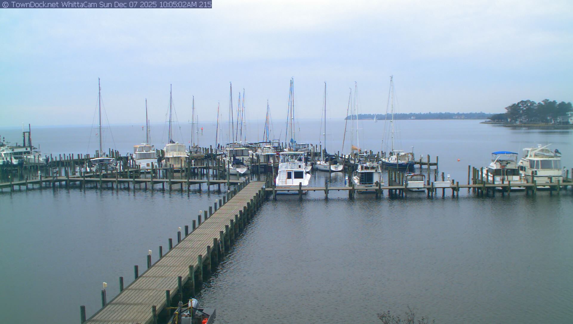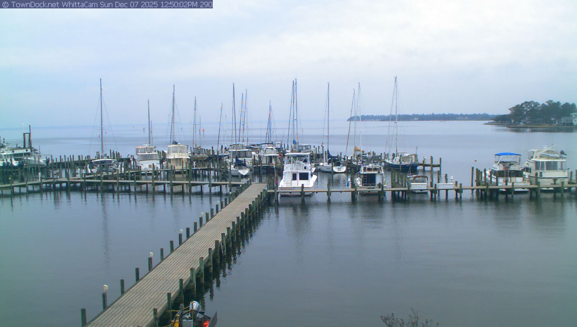 shows Whittaker Pointe Marina and the Whittaker Creek Channel entrance, with the Neuse River in the background. WhittaCam takes a new picture every five minutes from dawn til just before dusk. Click on the image to see a larger version. Once you see that larger version, you can click (see arrow at right) to go back in time and see recent photos. Harbor Cam currently takes photos from 6:00am to 5:20pm.