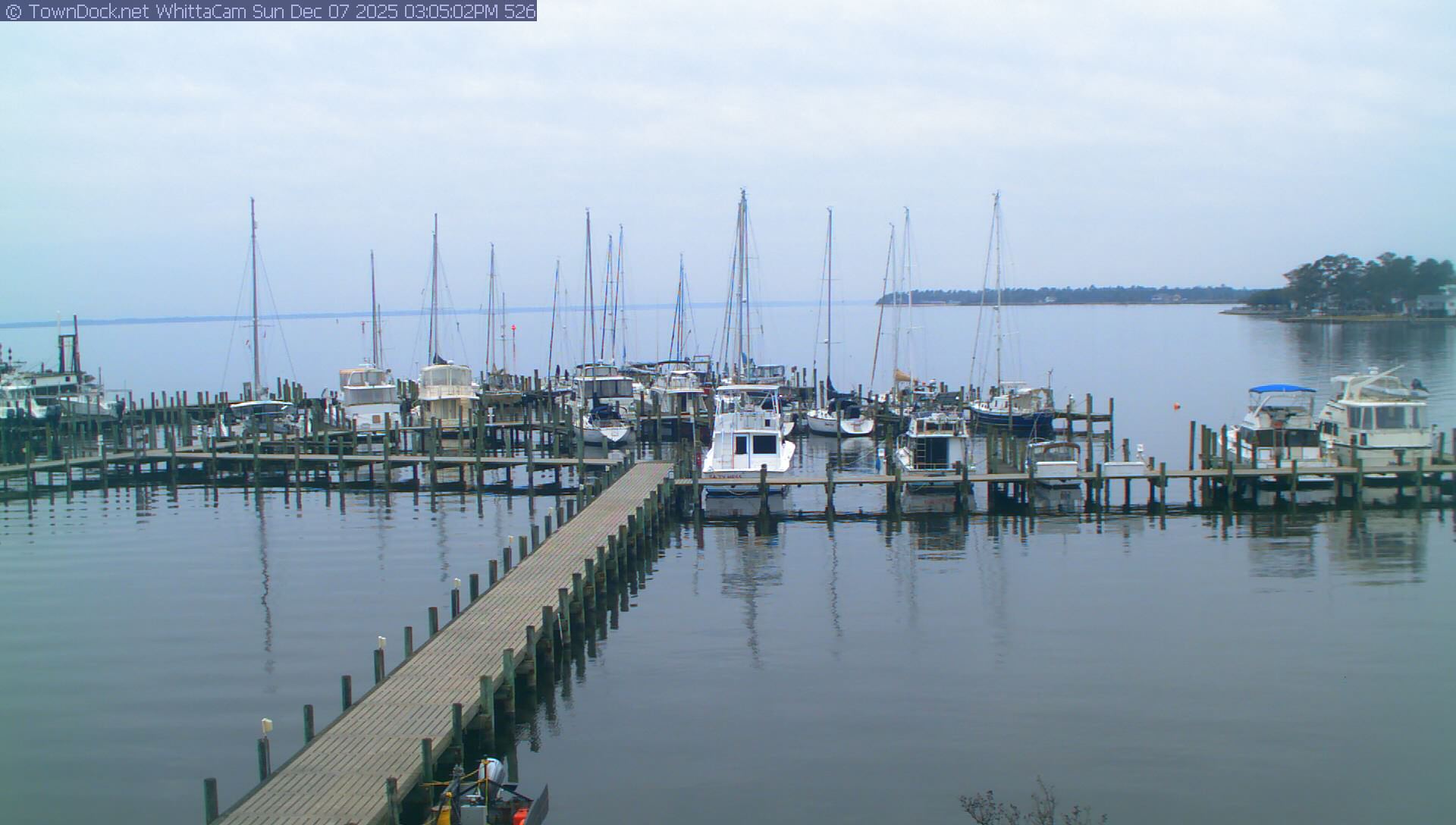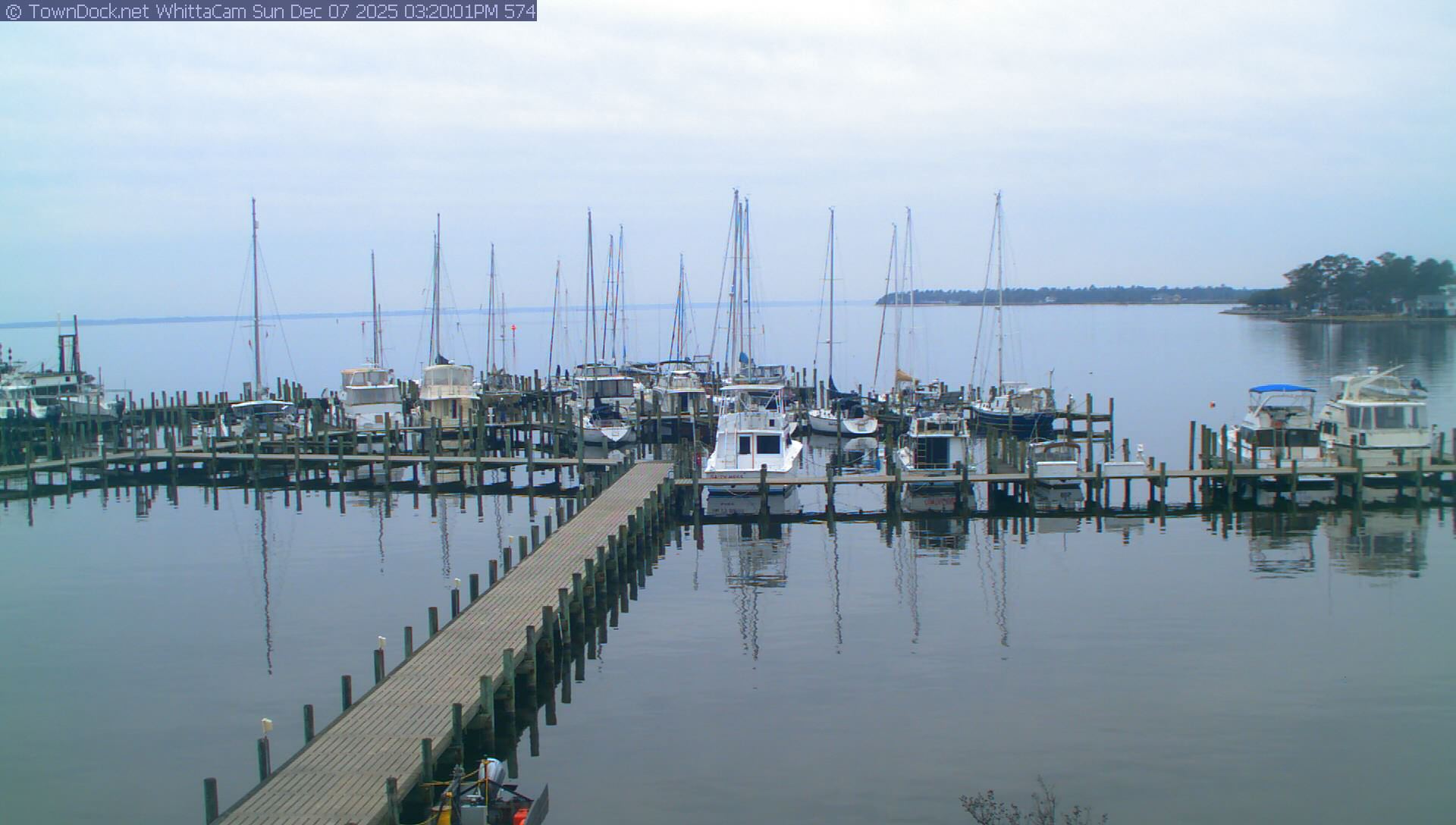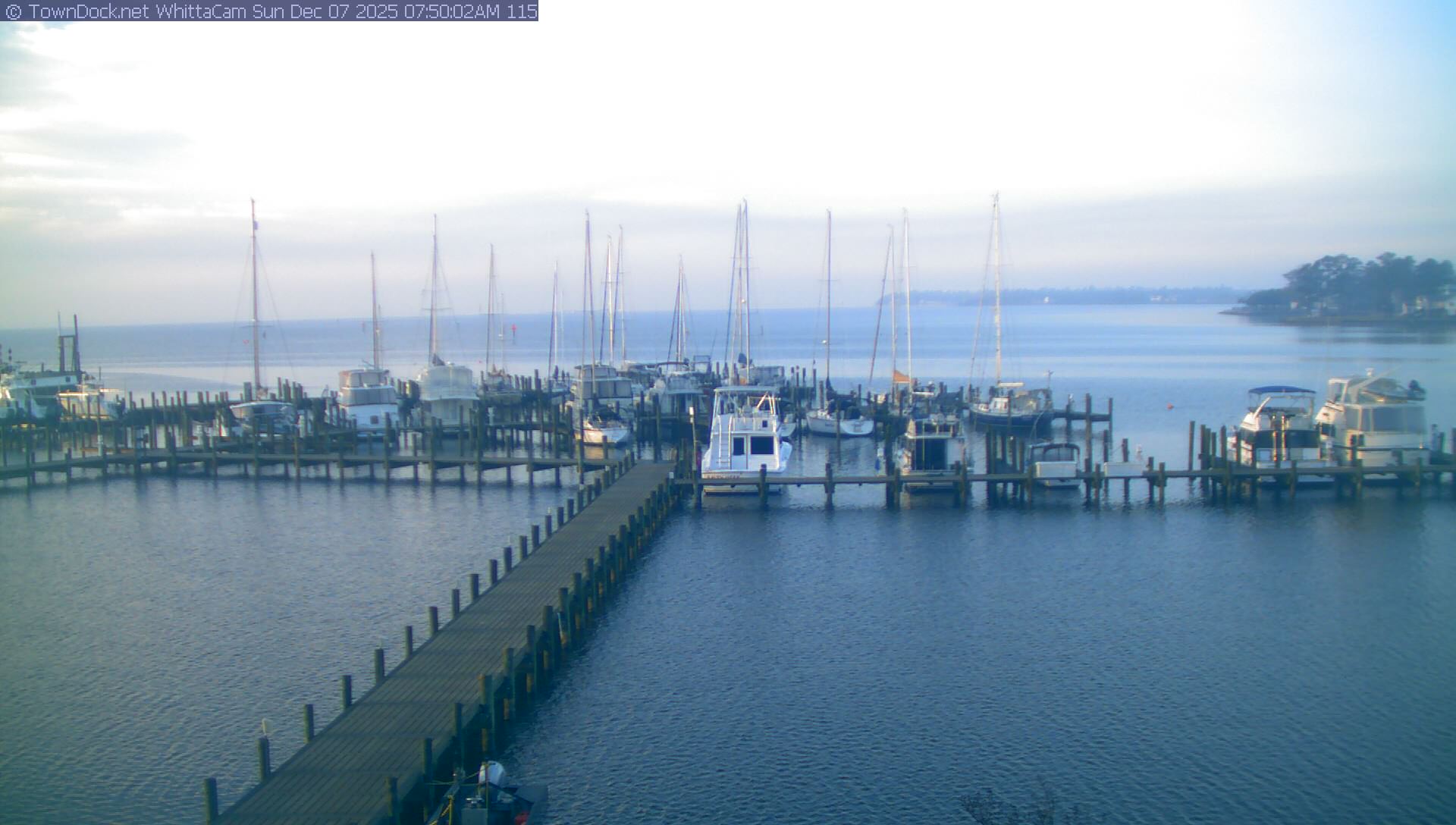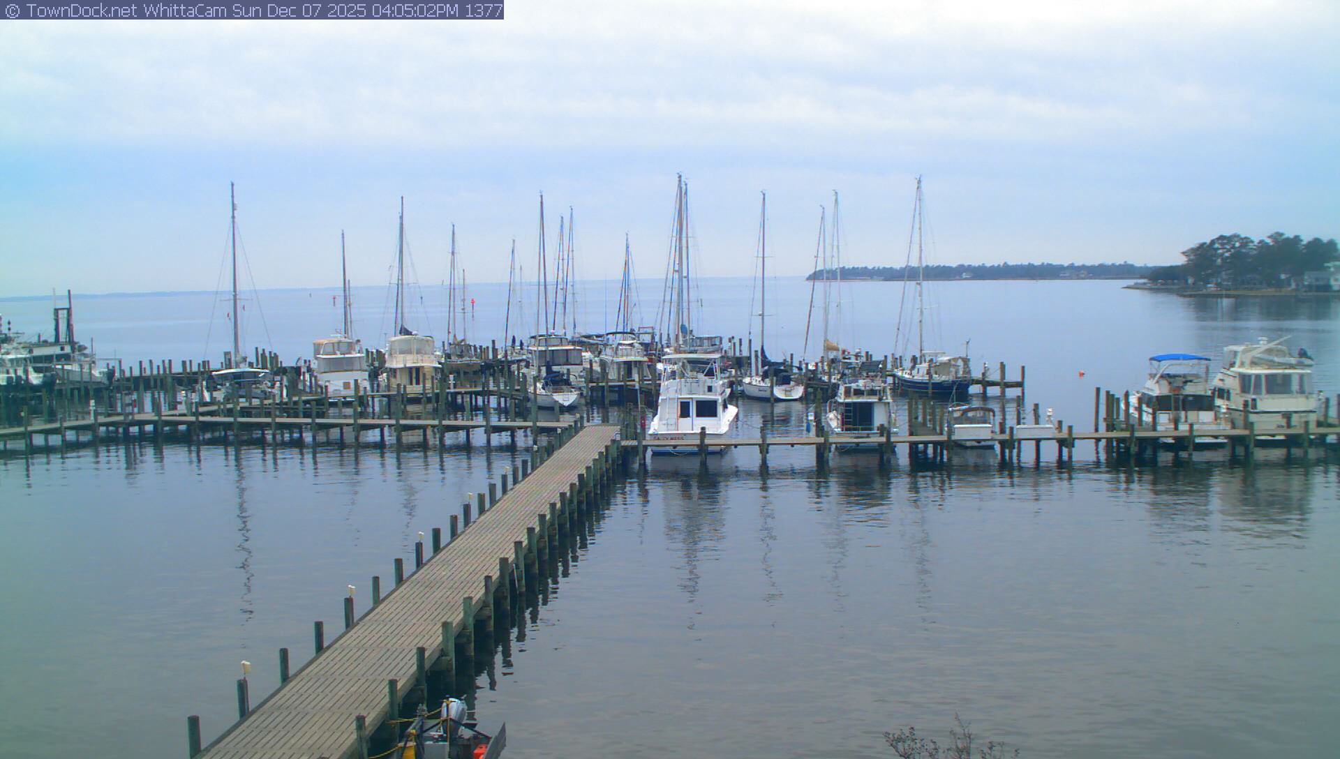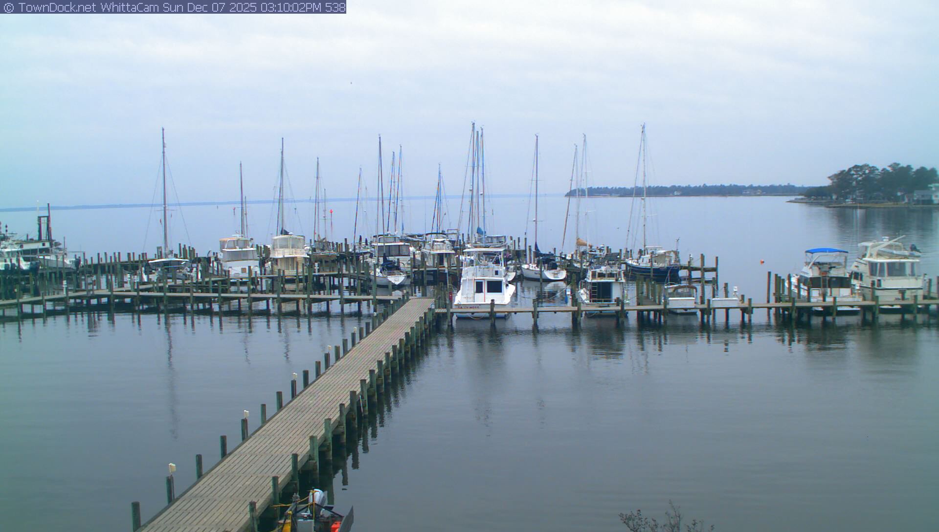 shows Whittaker Pointe Marina and the Whittaker Creek Channel entrance, with the Neuse River in the background. WhittaCam takes a new picture every five minutes from dawn til just before dusk. Click on the image to see a larger version. Once you see that larger version, you can click (see arrow at right) to go back in time and see recent photos. Harbor Cam currently takes photos from 6:00am to 5:20pm.