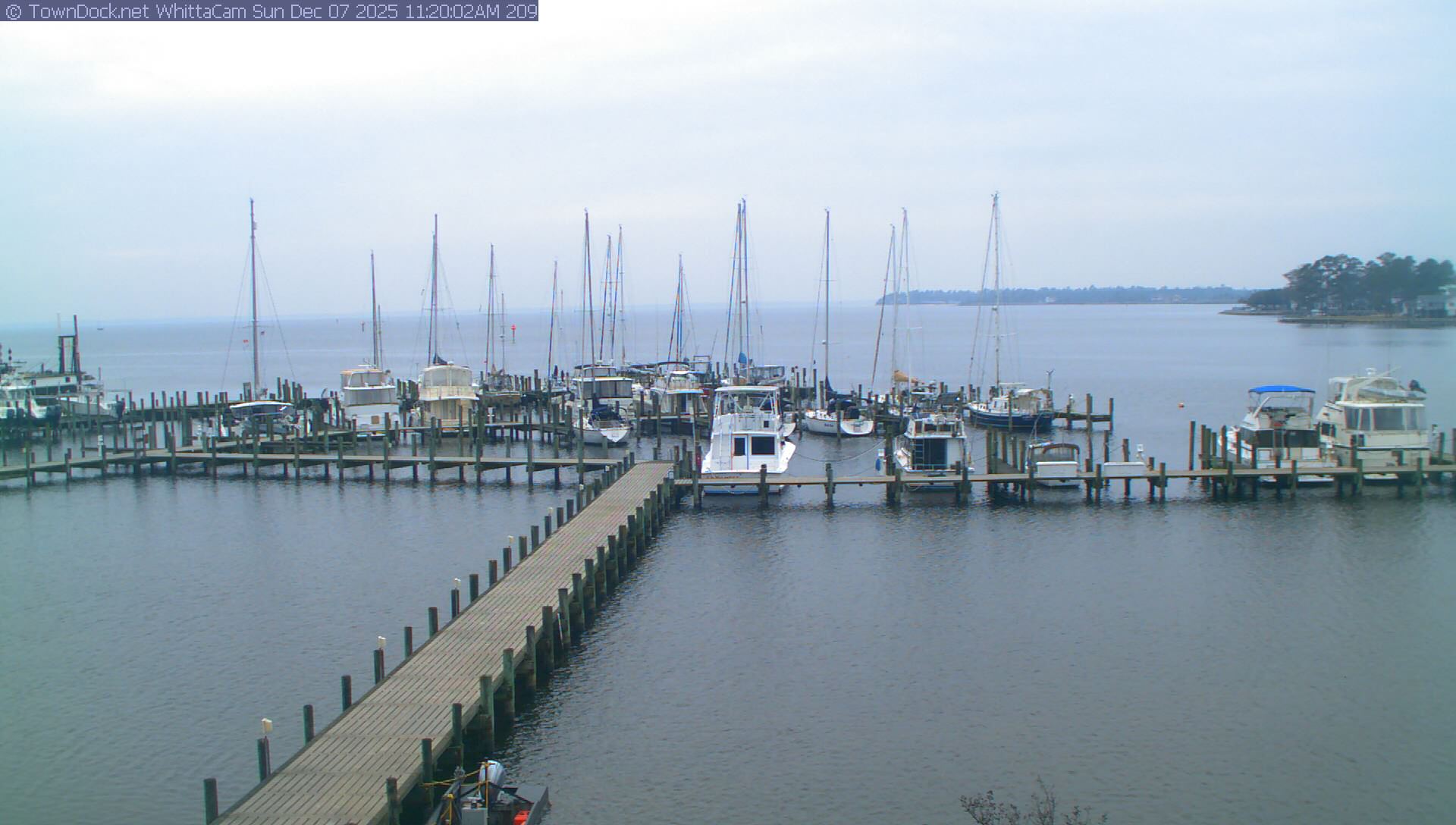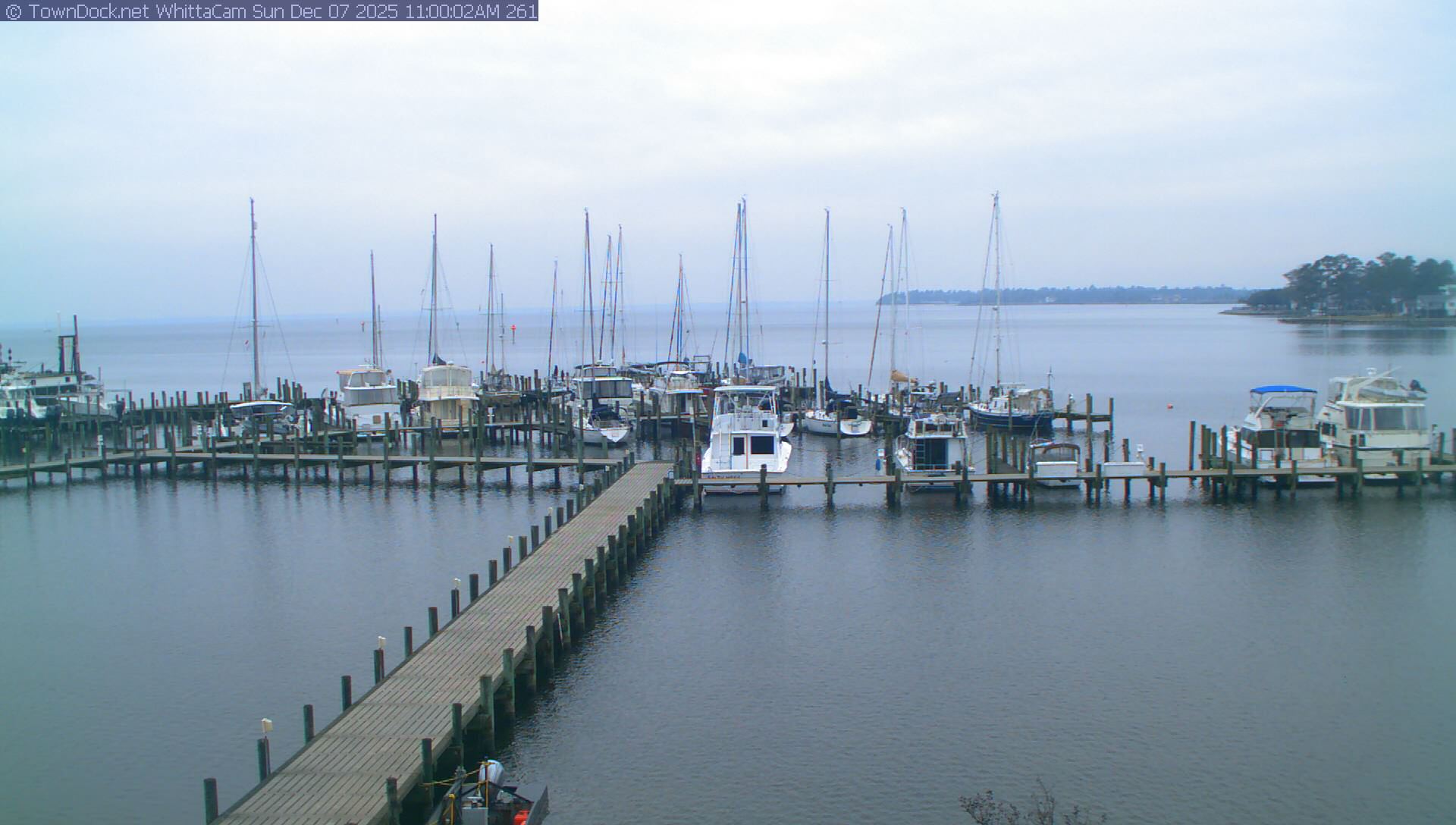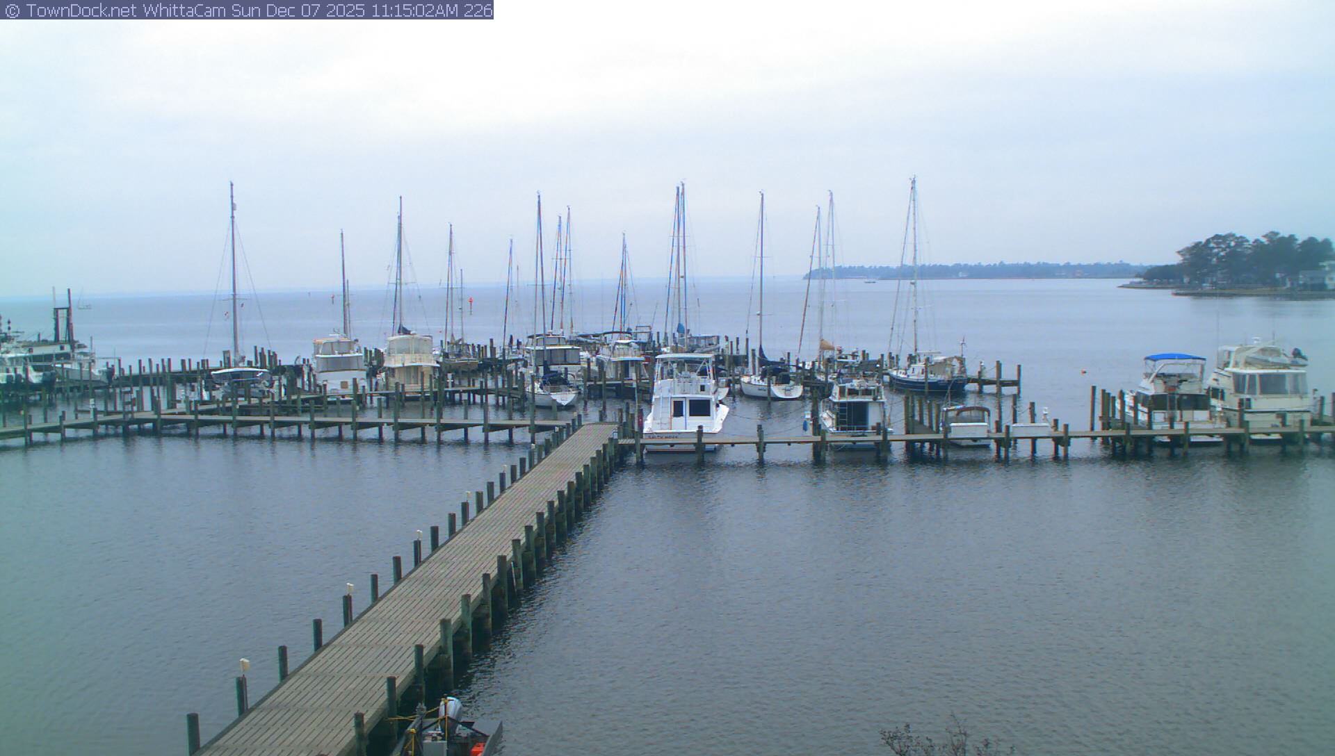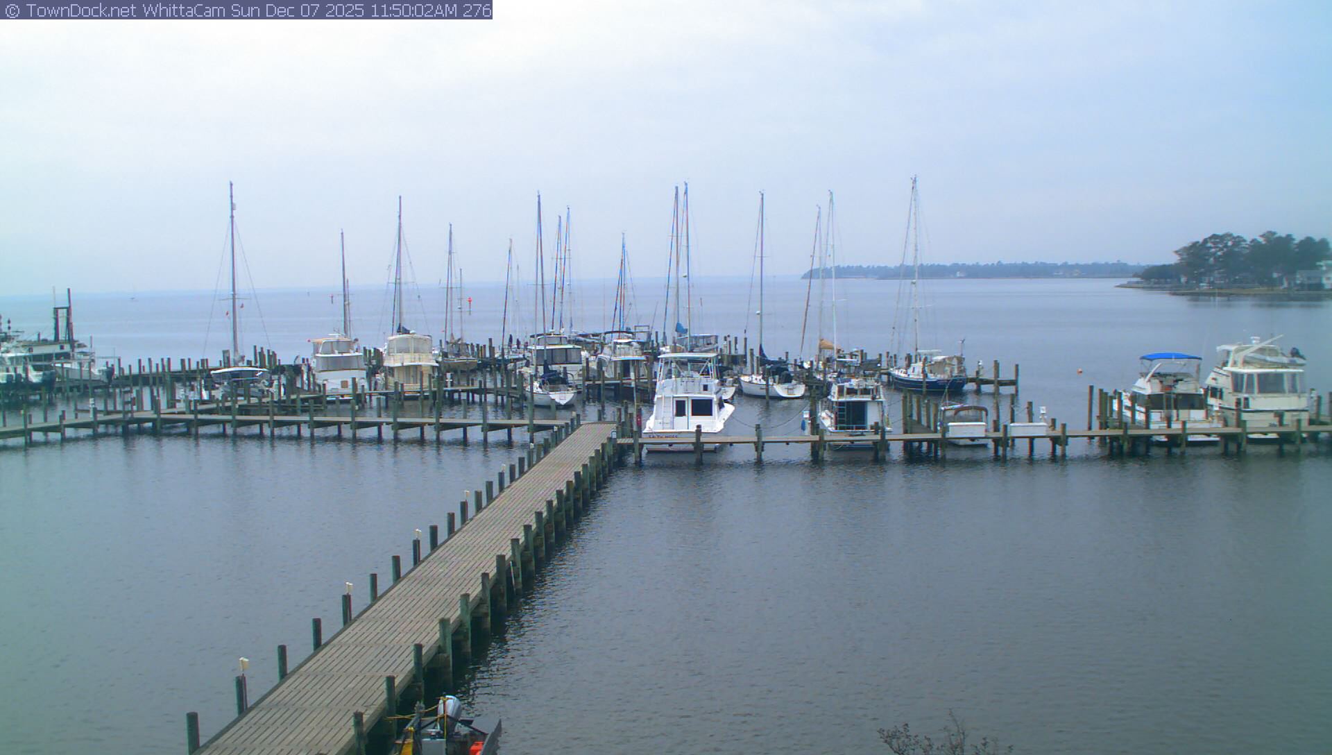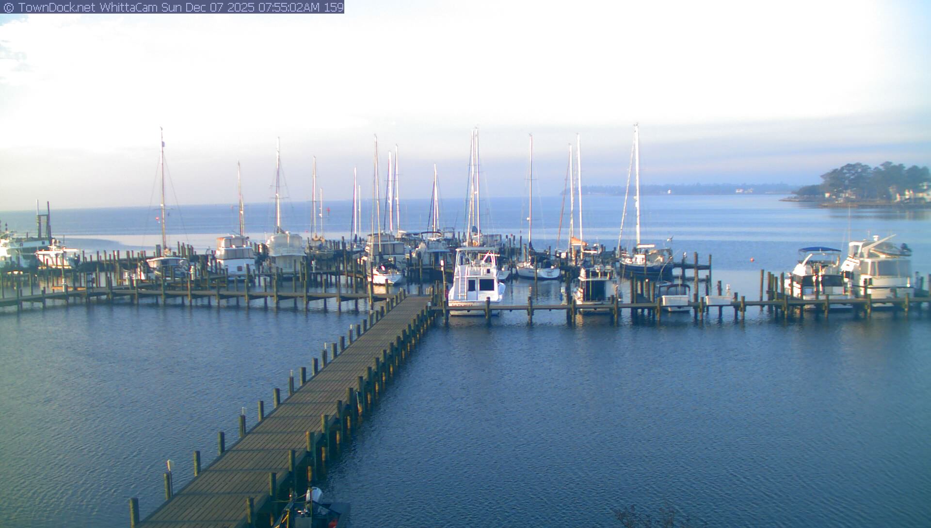 shows Whittaker Pointe Marina and the Whittaker Creek Channel entrance, with the Neuse River in the background. WhittaCam takes a new picture every five minutes from dawn til just before dusk. Click on the image to see a larger version. Once you see that larger version, you can click (see arrow at right) to go back in time and see recent photos. Harbor Cam currently takes photos from 6:00am to 5:20pm.