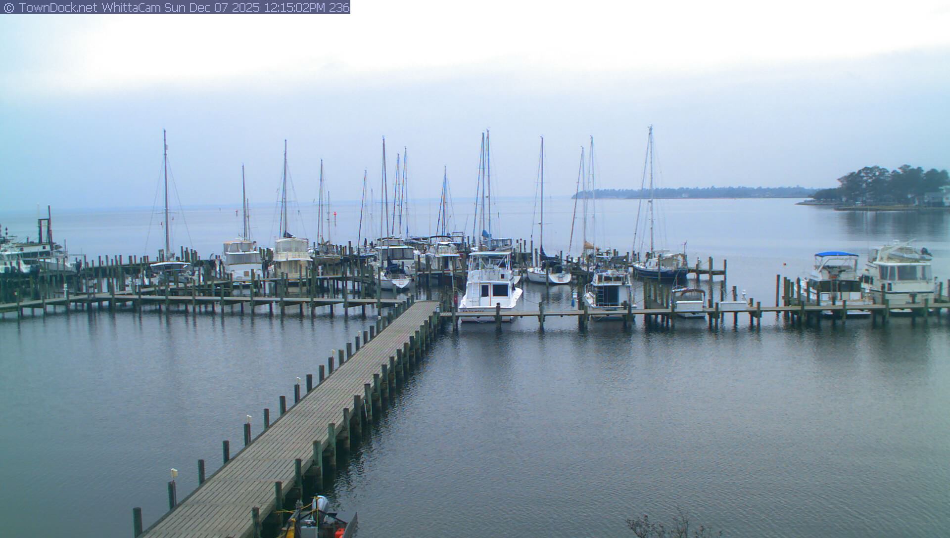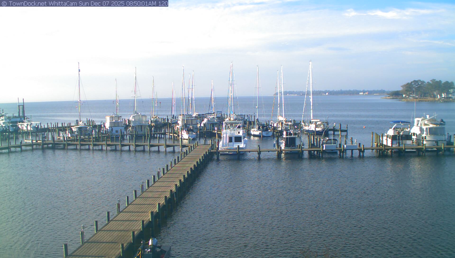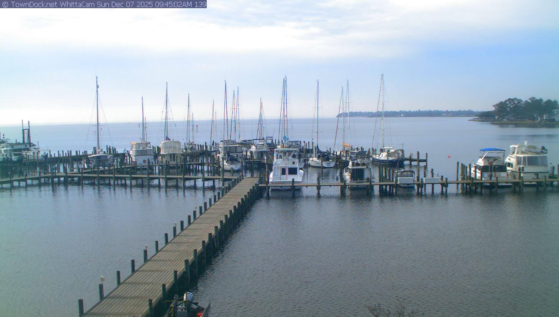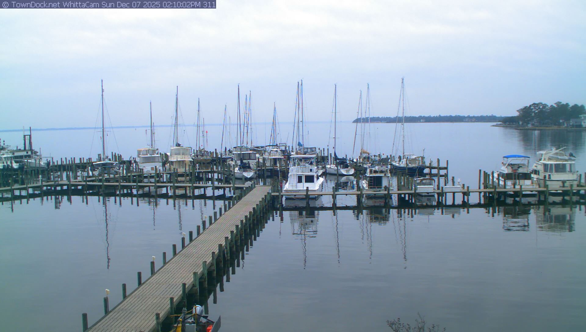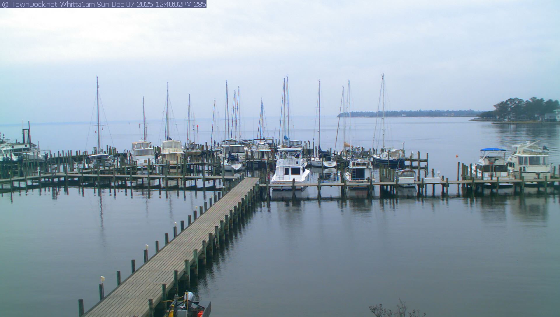 shows Whittaker Pointe Marina and the Whittaker Creek Channel entrance, with the Neuse River in the background. WhittaCam takes a new picture every five minutes from dawn til just before dusk. Click on the image to see a larger version. Once you see that larger version, you can click (see arrow at right) to go back in time and see recent photos. Harbor Cam currently takes photos from 6:00am to 5:20pm.