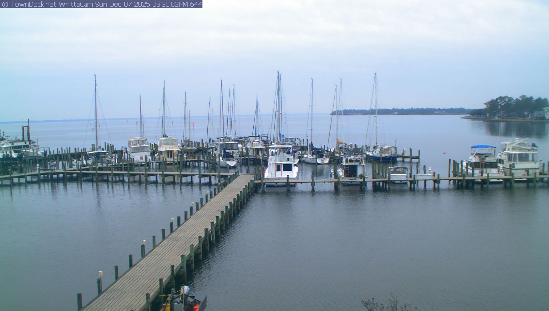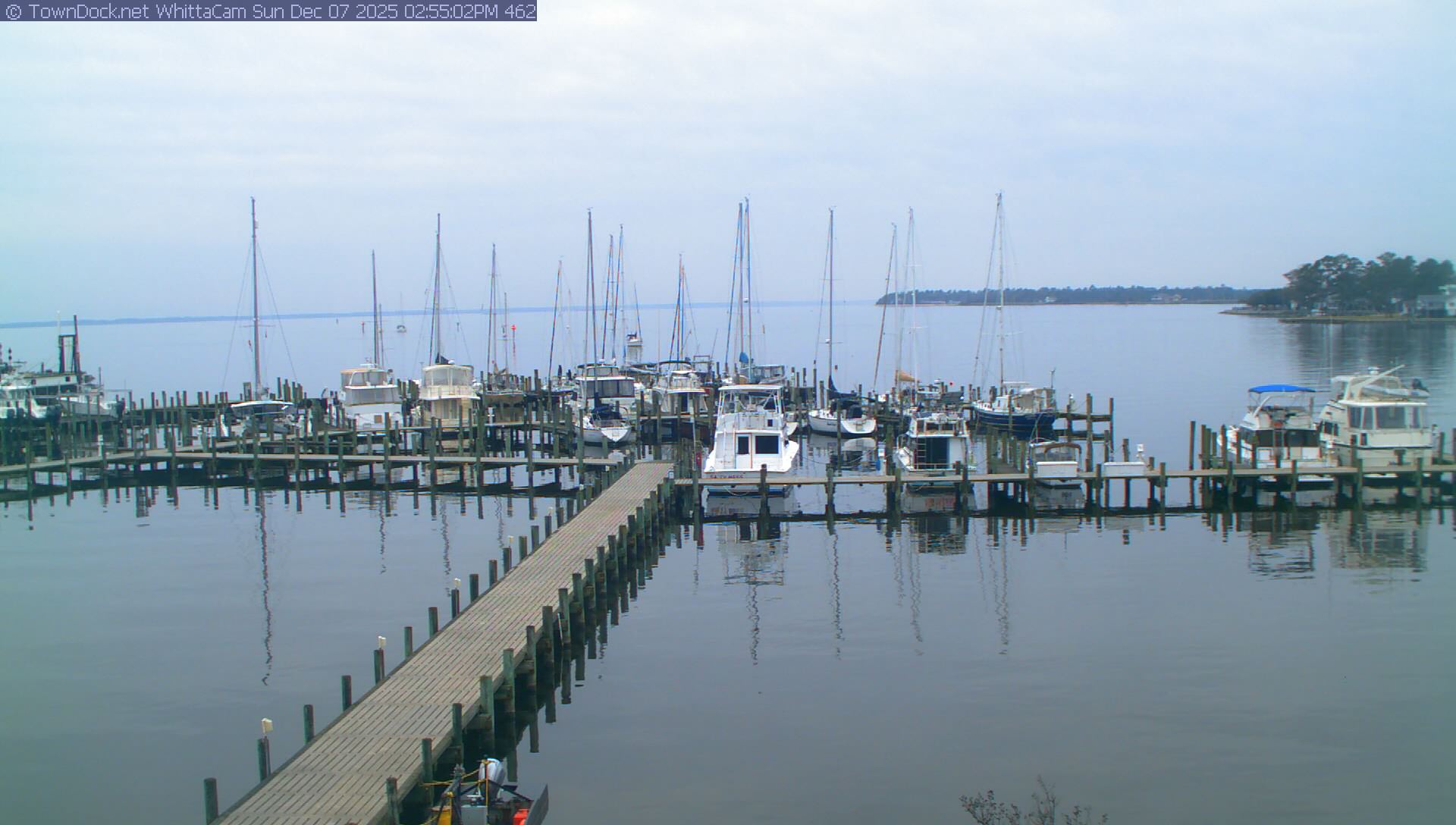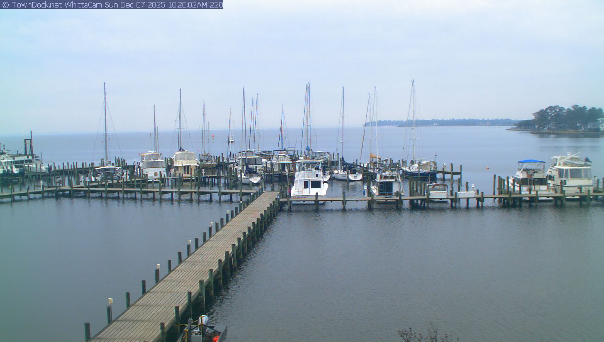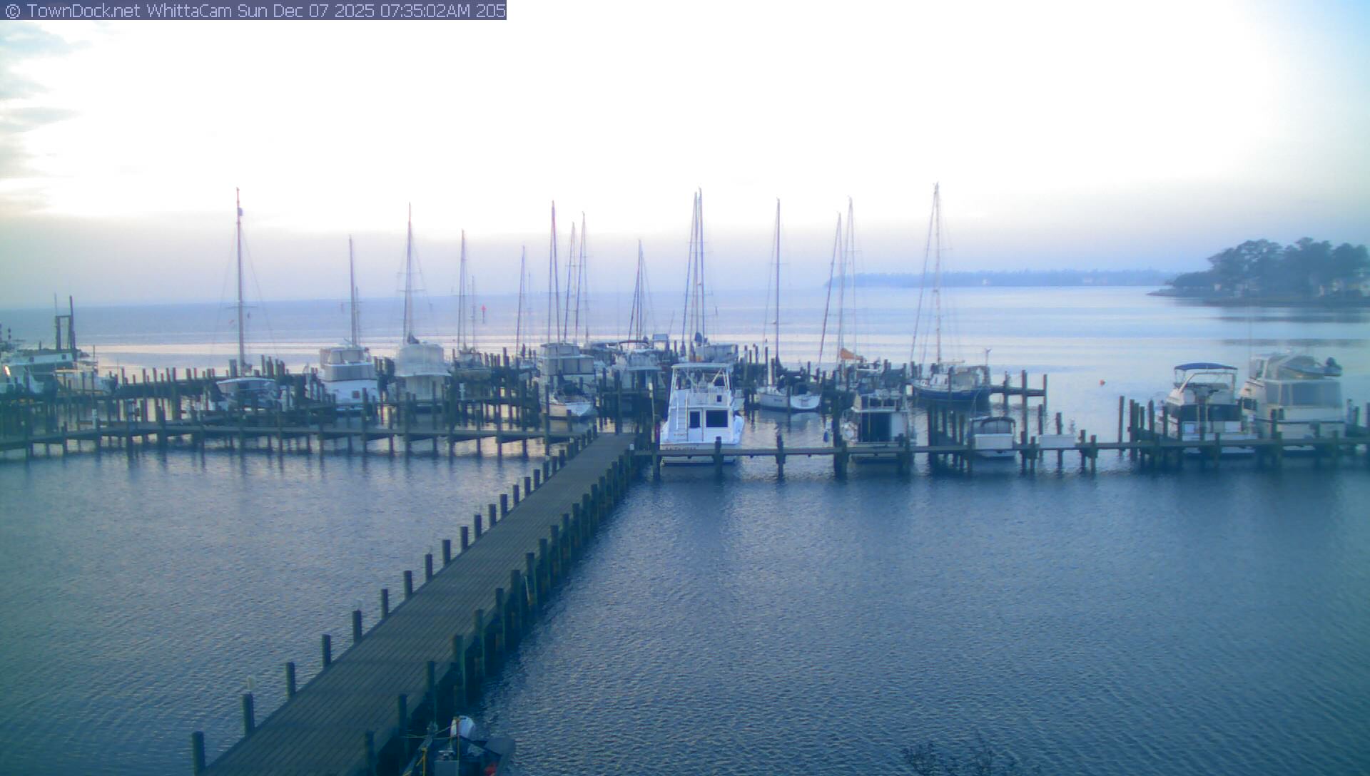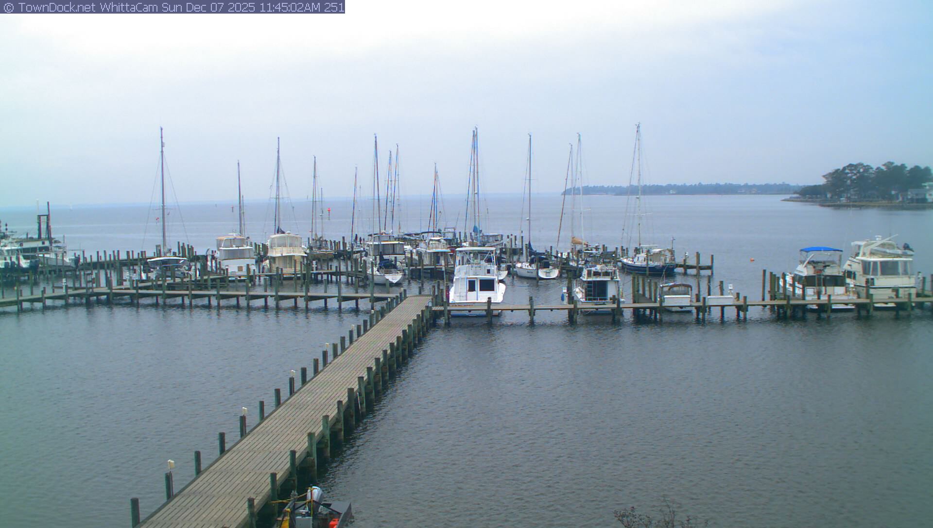 shows Whittaker Pointe Marina and the Whittaker Creek Channel entrance, with the Neuse River in the background. WhittaCam takes a new picture every five minutes from dawn til just before dusk. Click on the image to see a larger version. Once you see that larger version, you can click (see arrow at right) to go back in time and see recent photos. Harbor Cam currently takes photos from 6:00am to 5:20pm.