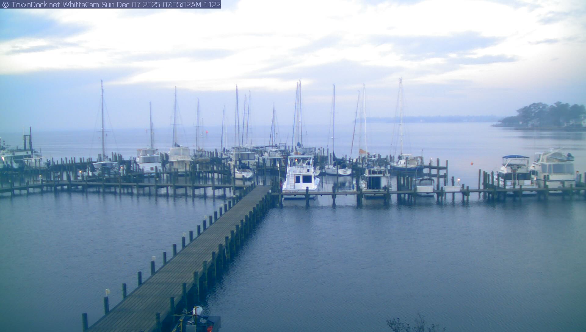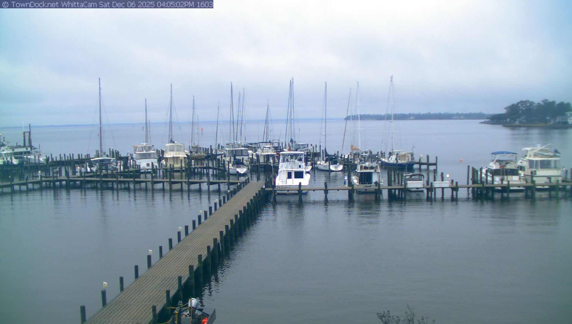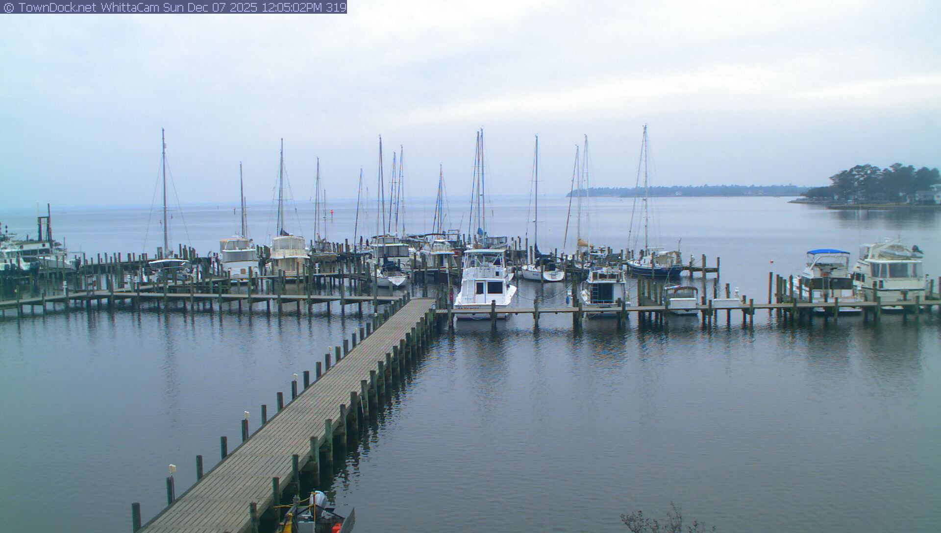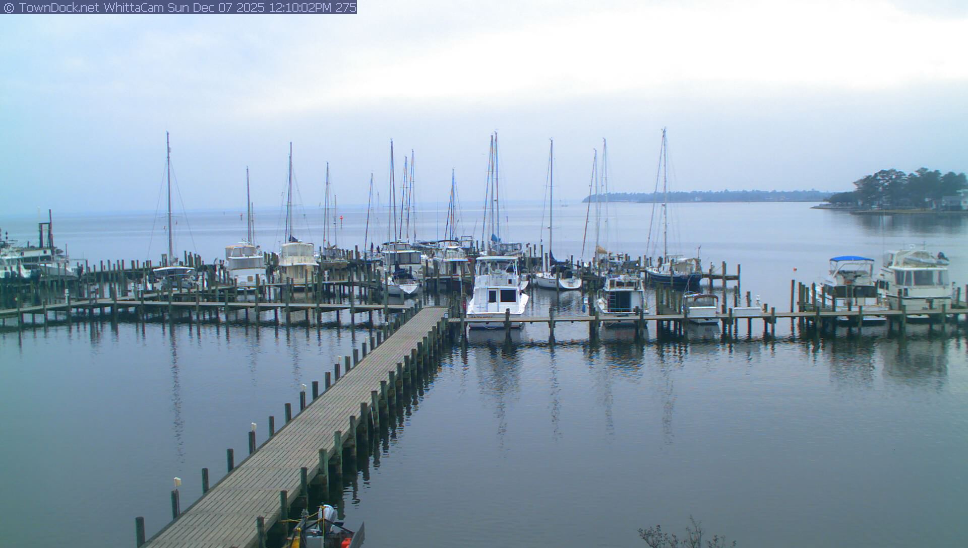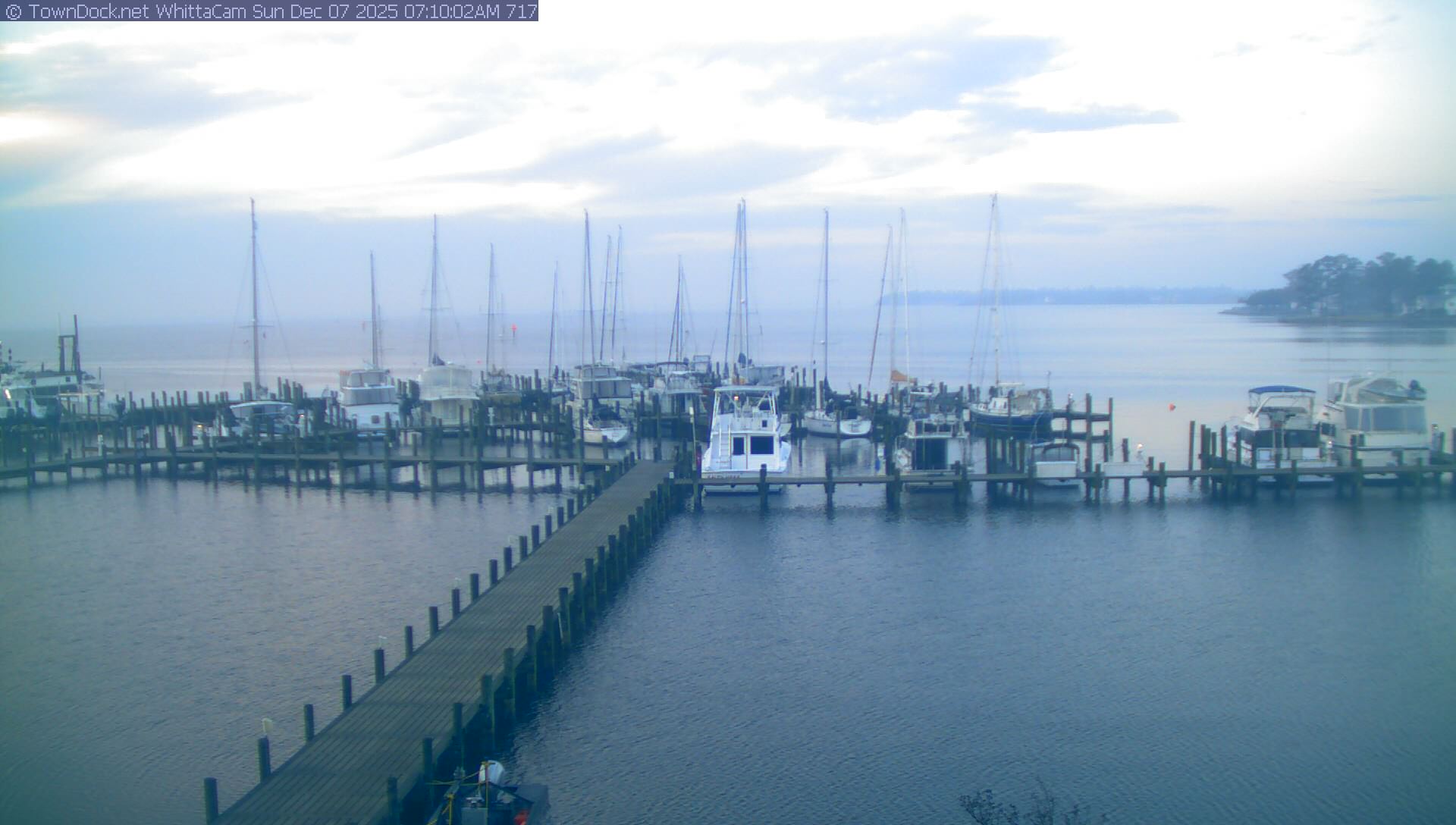 shows Whittaker Pointe Marina and the Whittaker Creek Channel entrance, with the Neuse River in the background. WhittaCam takes a new picture every five minutes from dawn til just before dusk. Click on the image to see a larger version. Once you see that larger version, you can click (see arrow at right) to go back in time and see recent photos. Harbor Cam currently takes photos from 6:00am to 5:20pm.