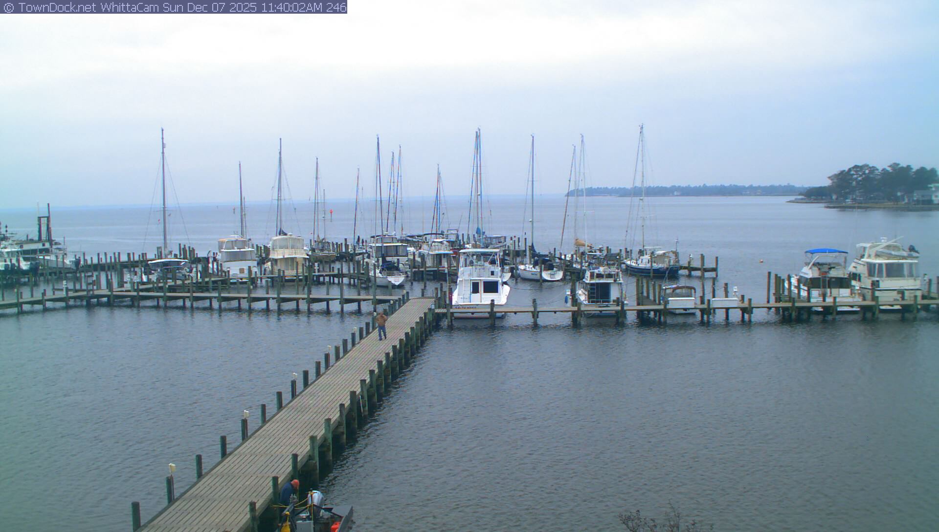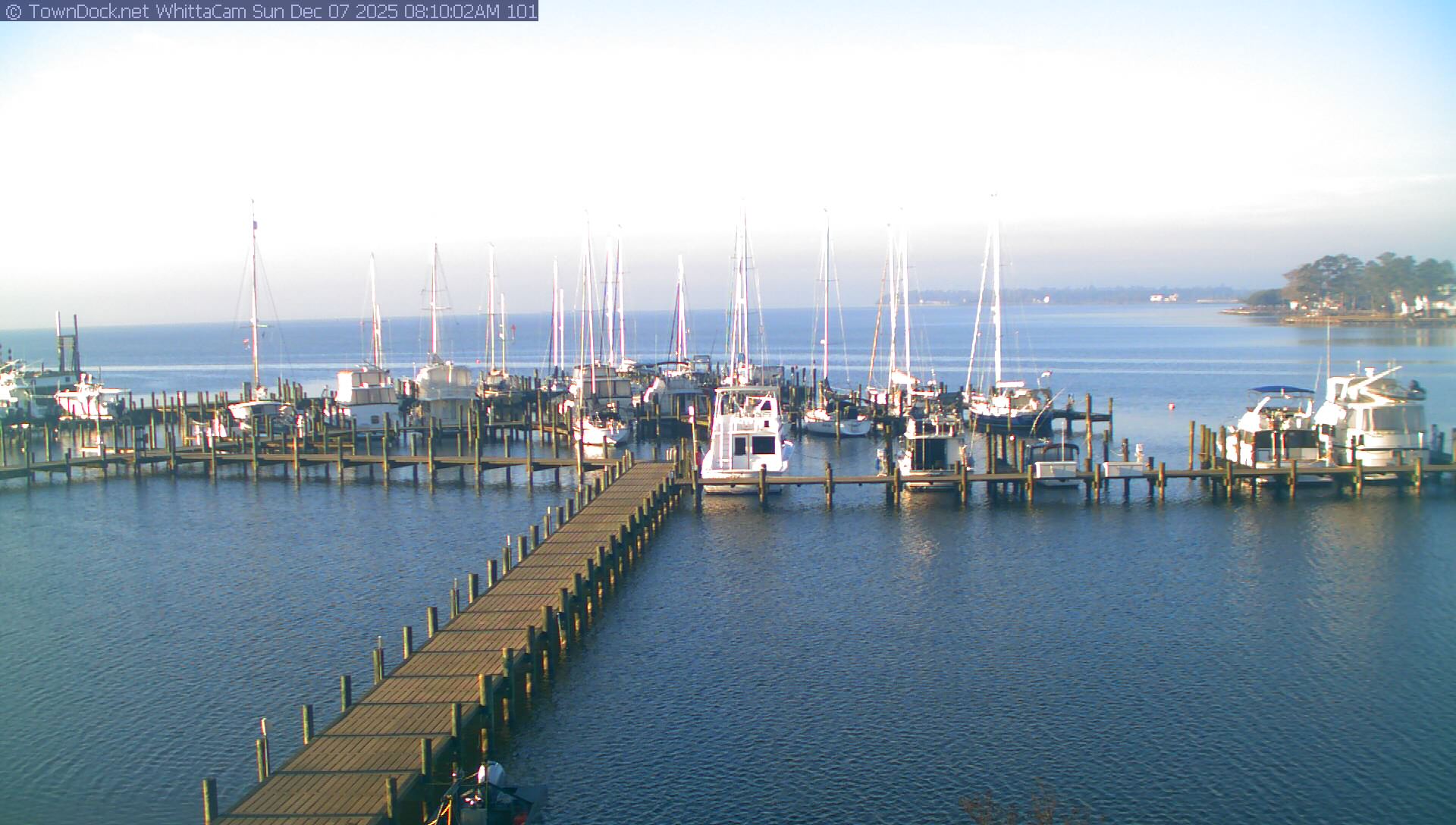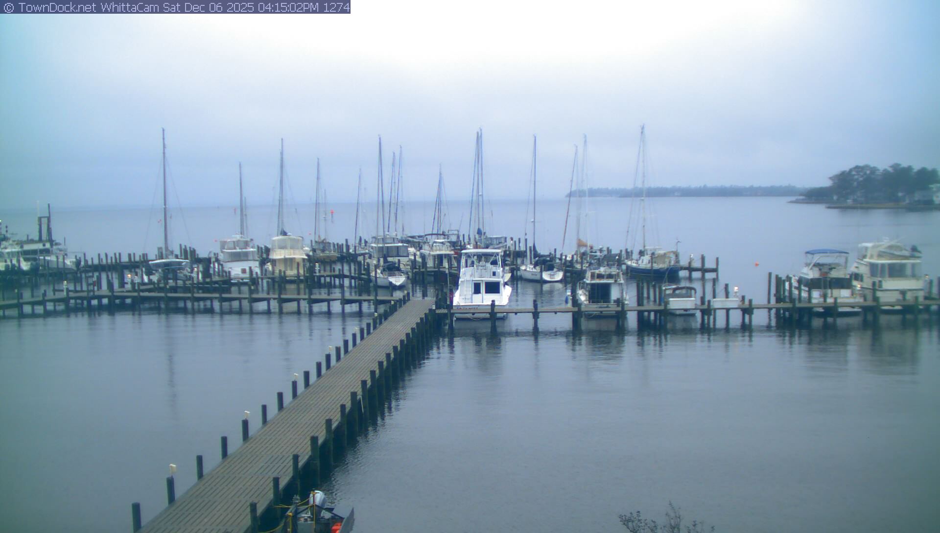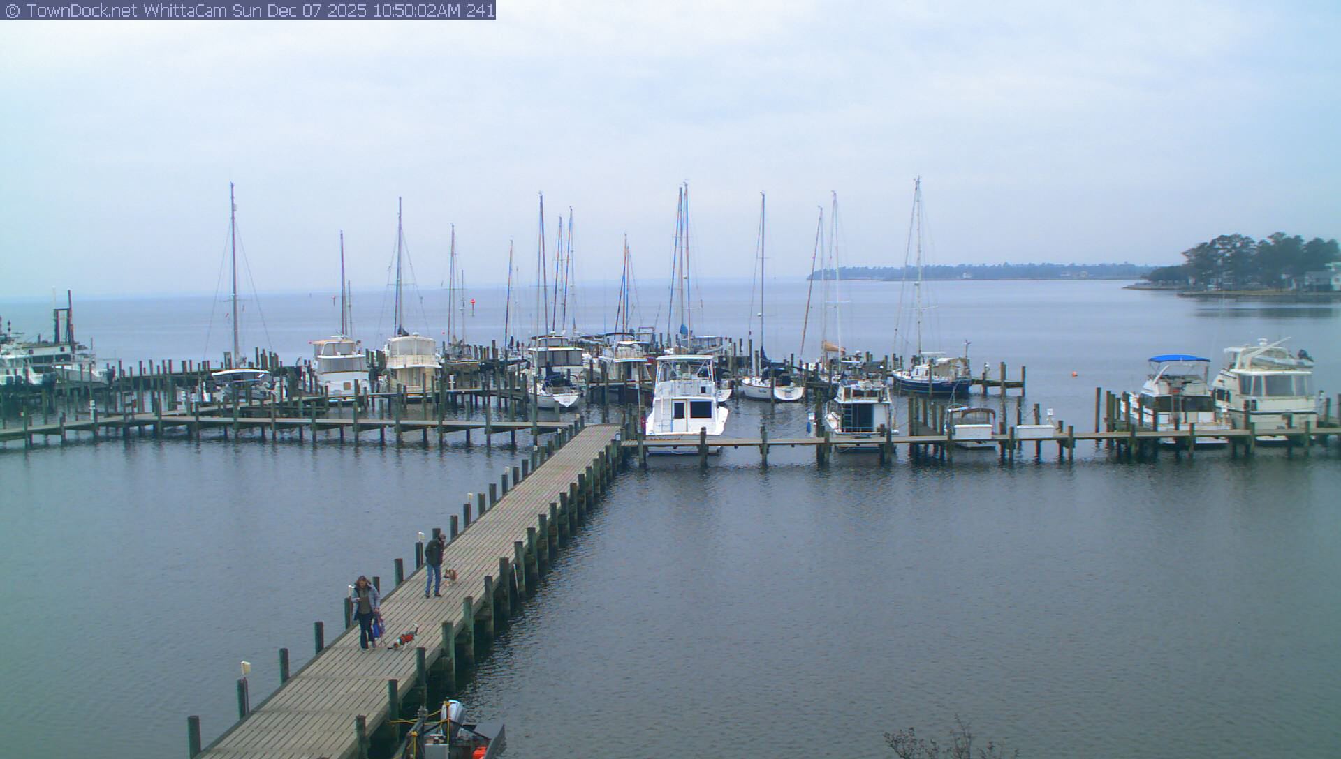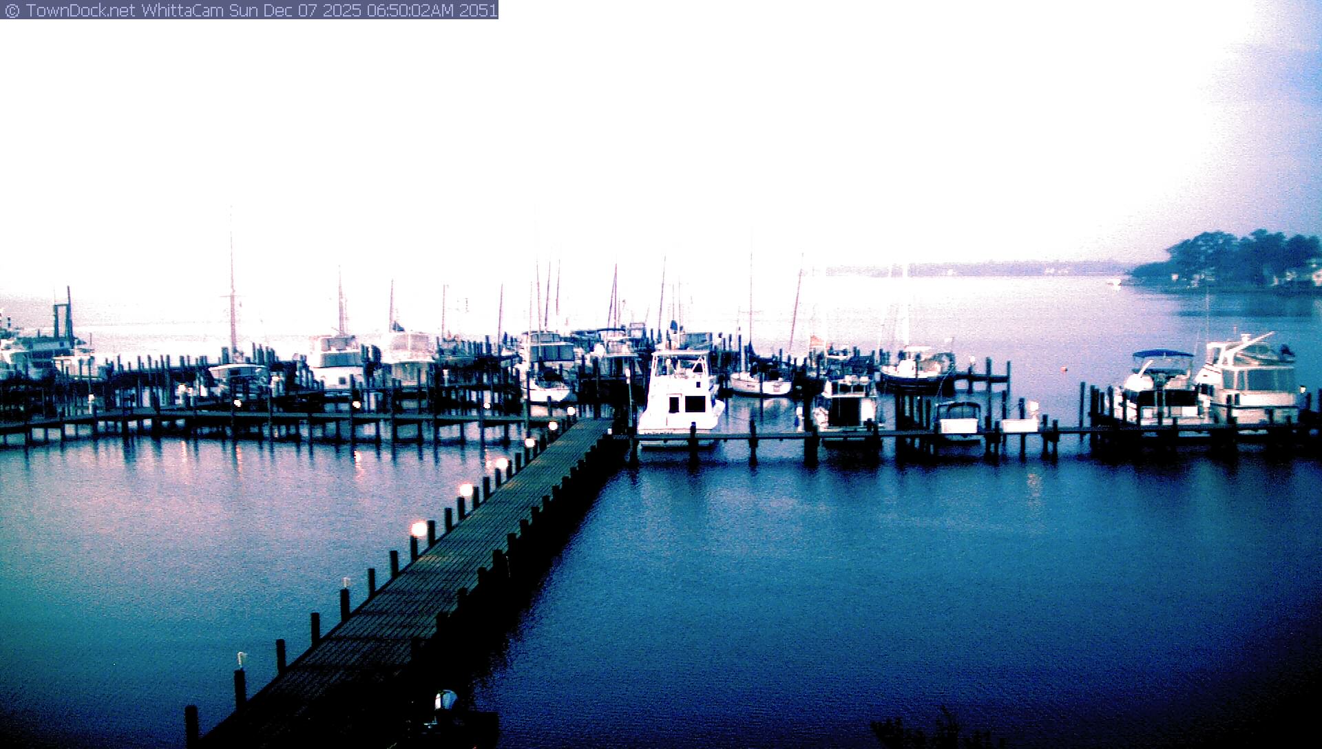 shows Whittaker Pointe Marina and the Whittaker Creek Channel entrance, with the Neuse River in the background. WhittaCam takes a new picture every five minutes from dawn til just before dusk. Click on the image to see a larger version. Once you see that larger version, you can click (see arrow at right) to go back in time and see recent photos. Harbor Cam currently takes photos from 6:00am to 5:20pm.