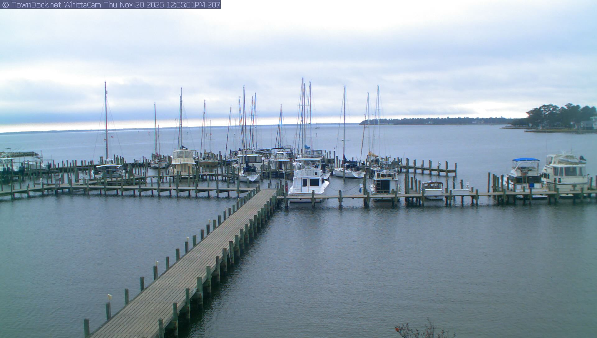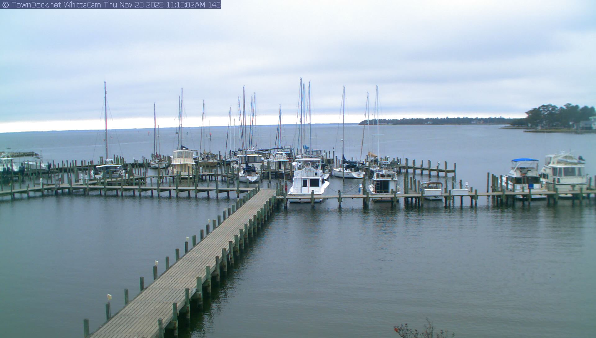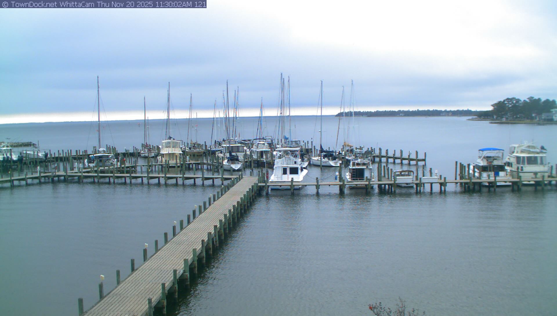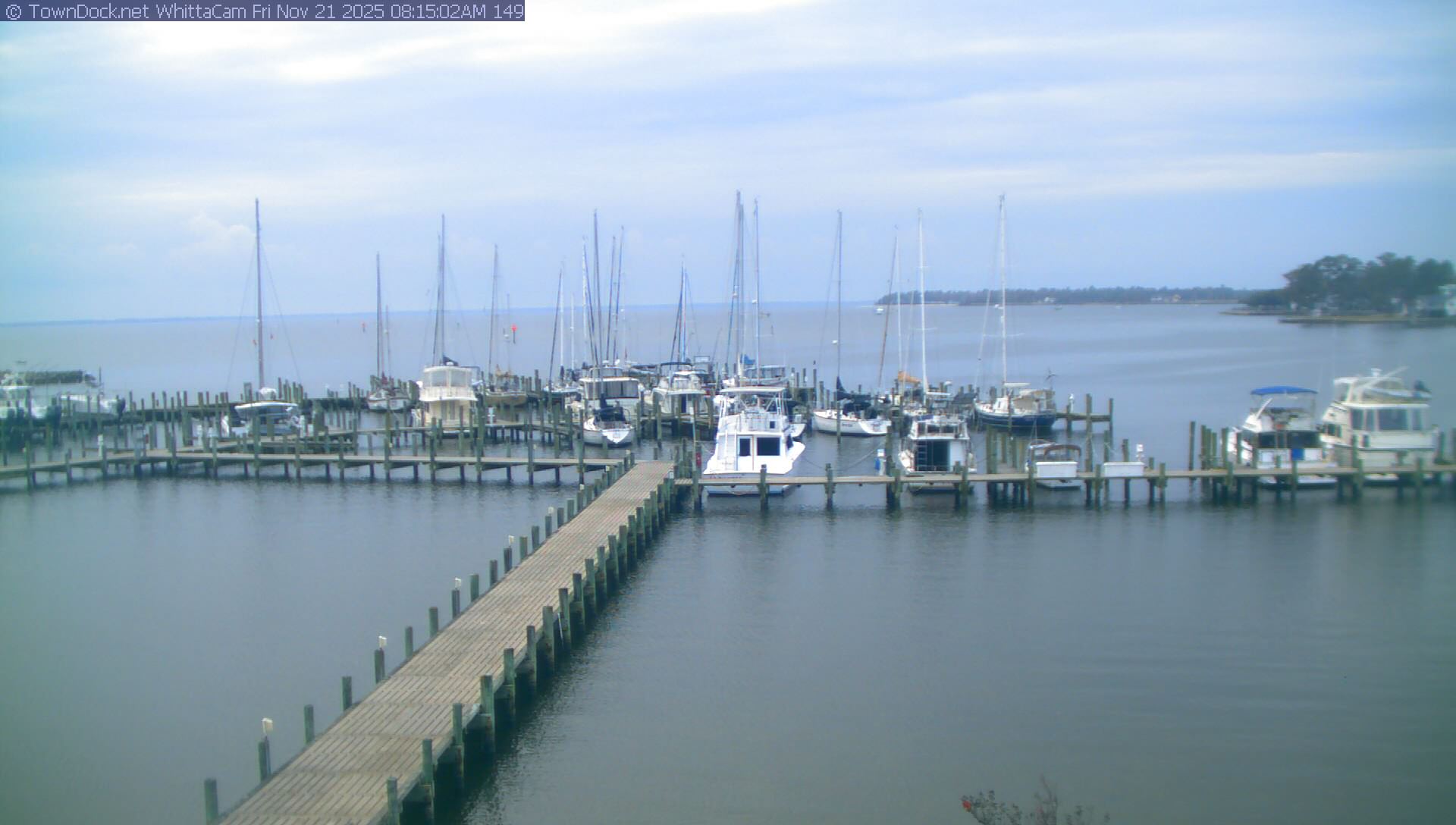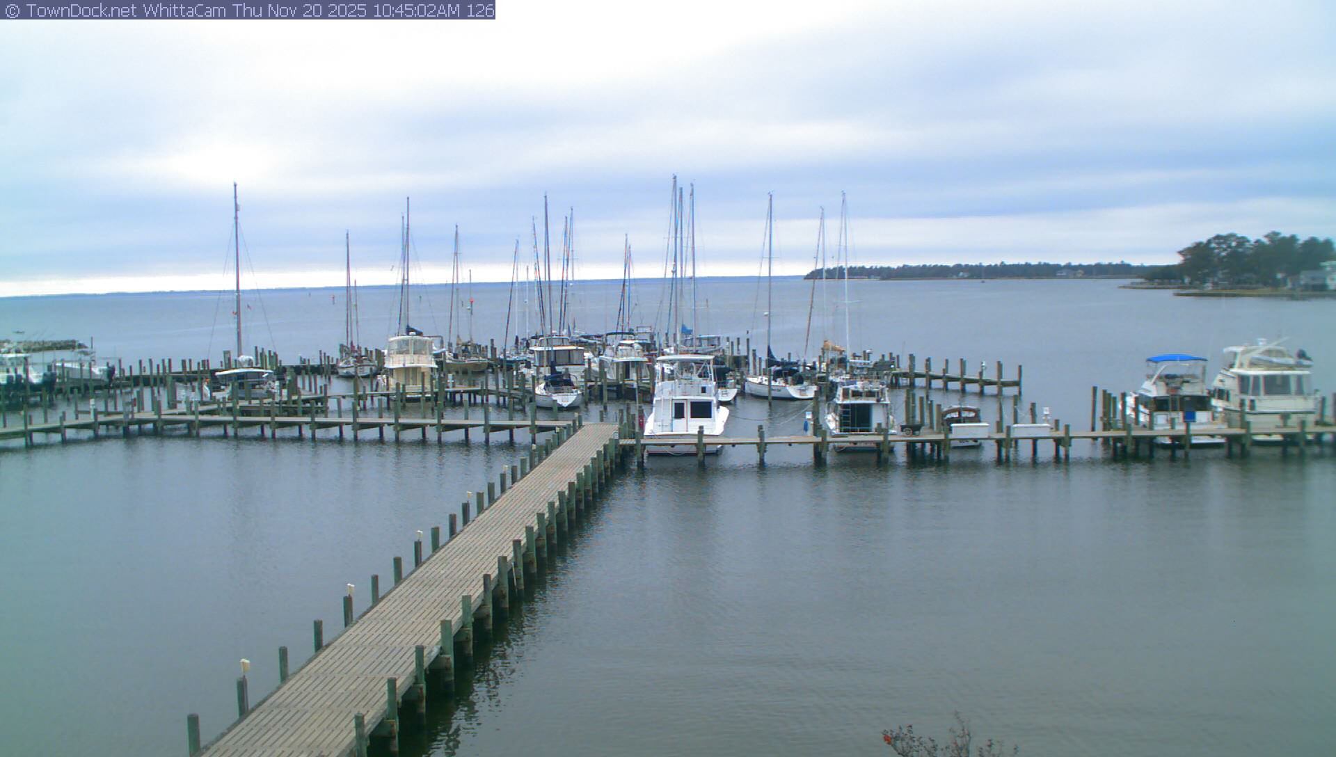 shows Whittaker Pointe Marina and the Whittaker Creek Channel entrance, with the Neuse River in the background. WhittaCam takes a new picture every five minutes from dawn til just before dusk. Click on the image to see a larger version. Once you see that larger version, you can click (see arrow at right) to go back in time and see recent photos. Harbor Cam currently takes photos from 6:30am to 5:00pm.