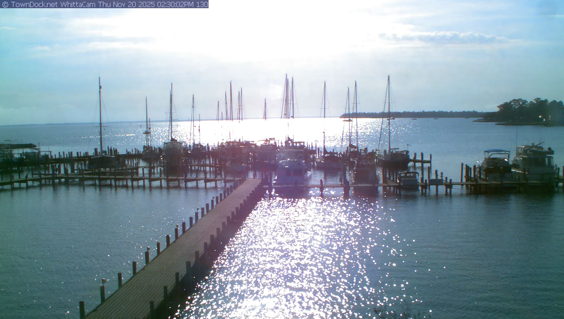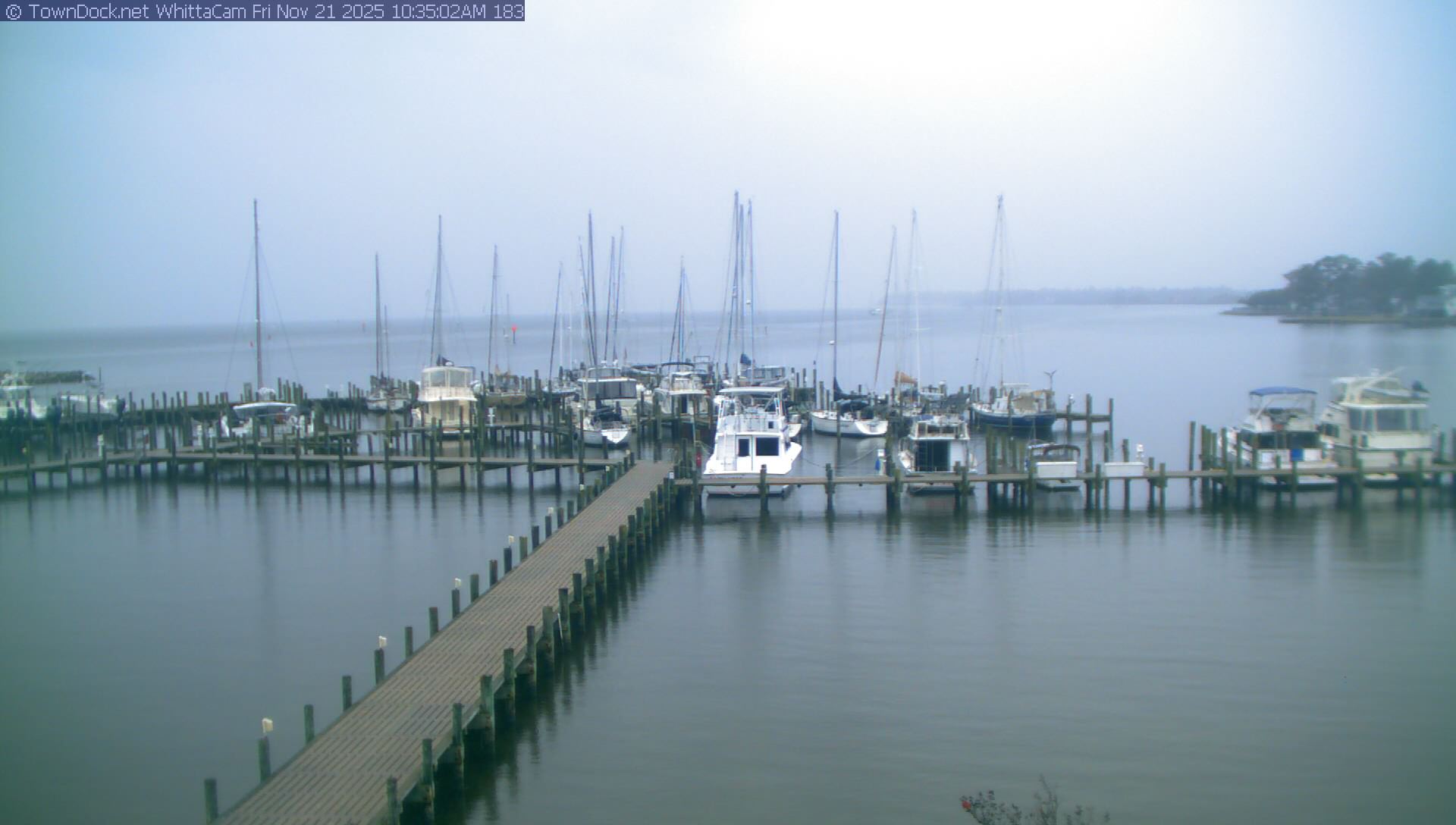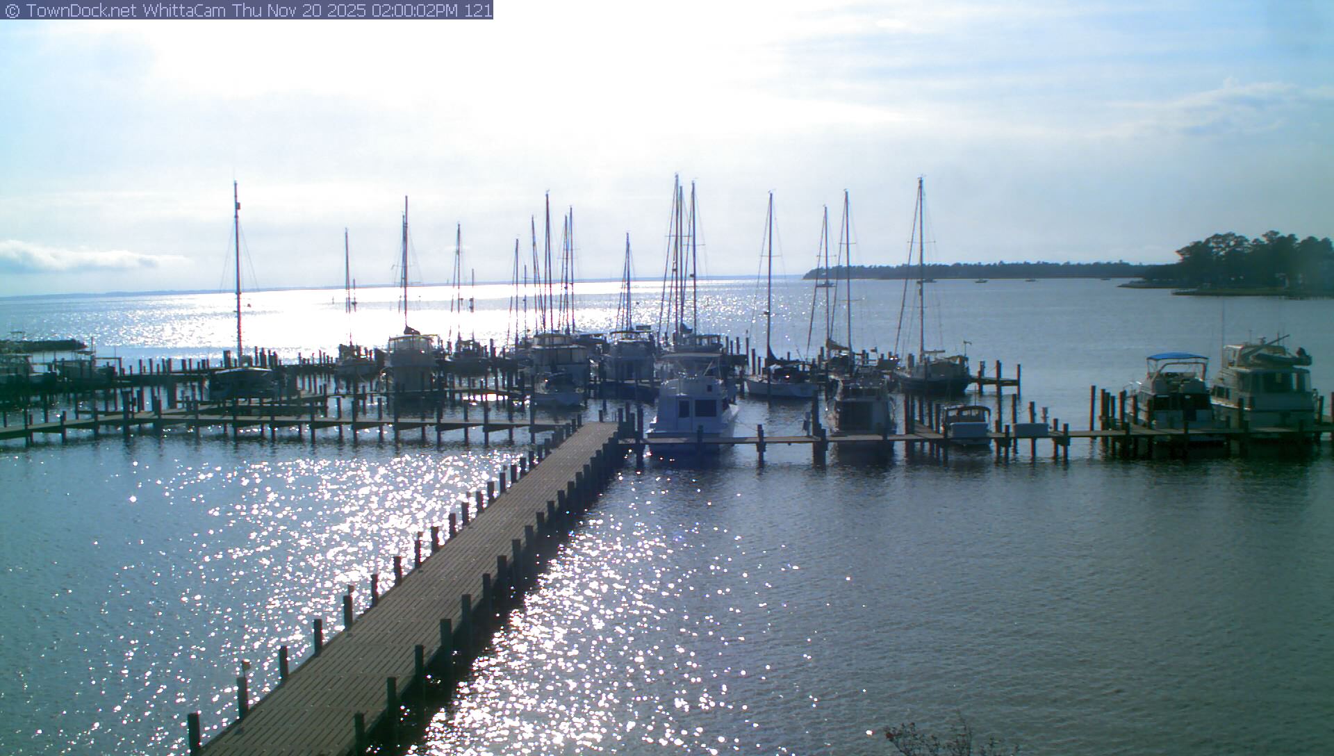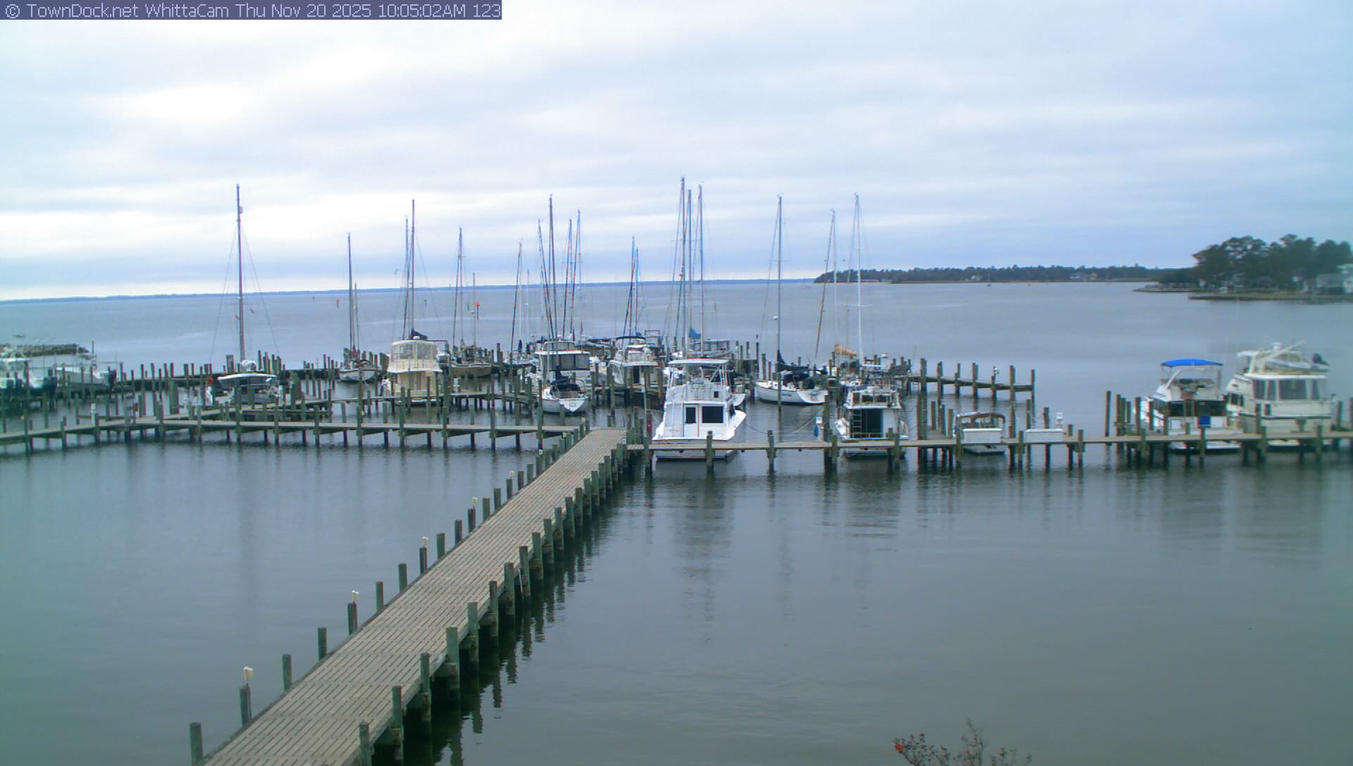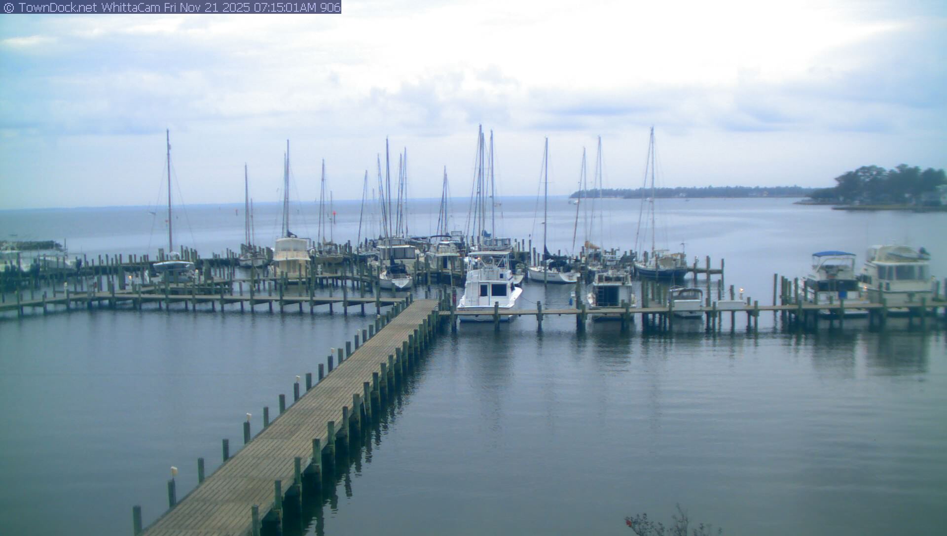 shows Whittaker Pointe Marina and the Whittaker Creek Channel entrance, with the Neuse River in the background. WhittaCam takes a new picture every five minutes from dawn til just before dusk. Click on the image to see a larger version. Once you see that larger version, you can click (see arrow at right) to go back in time and see recent photos. Harbor Cam currently takes photos from 6:30am to 5:00pm.