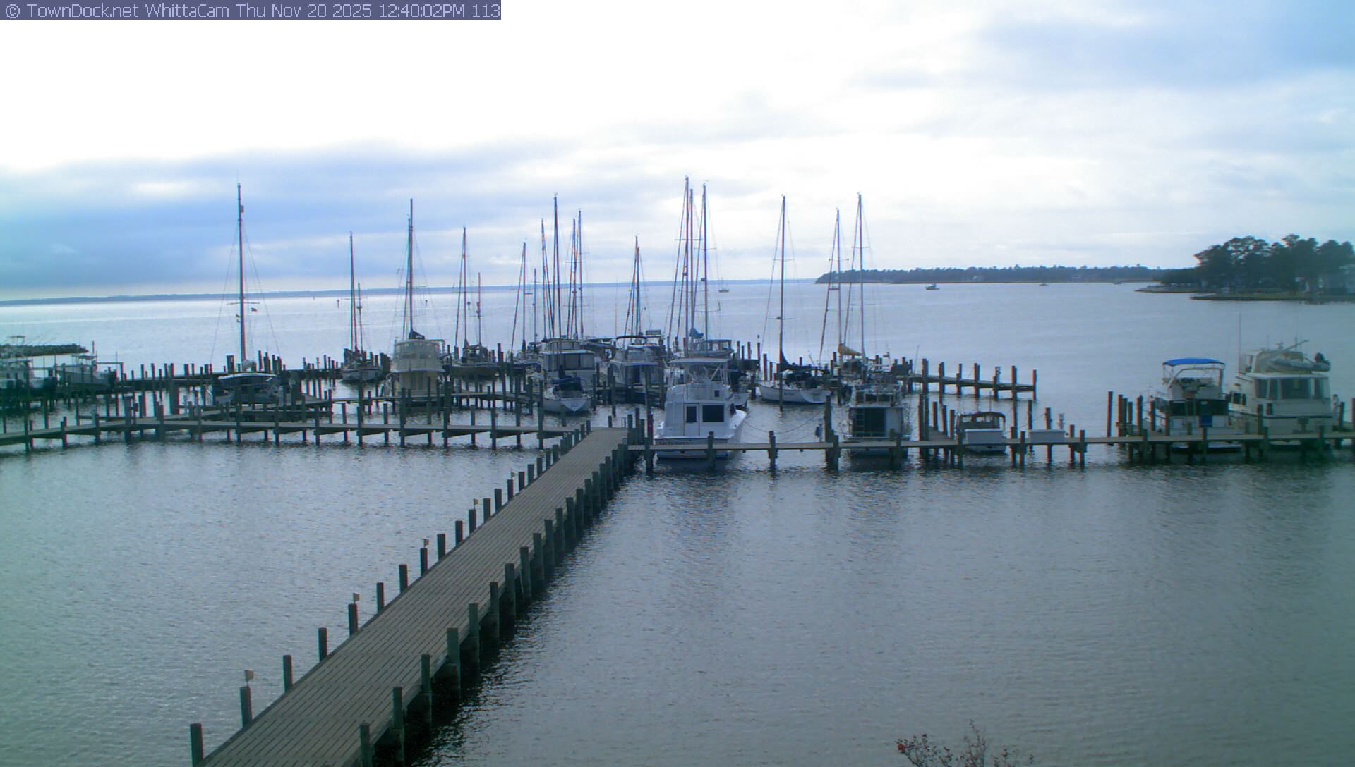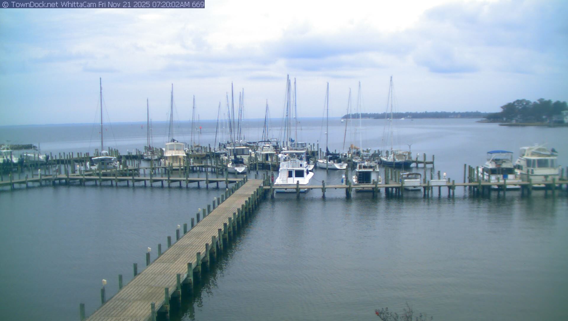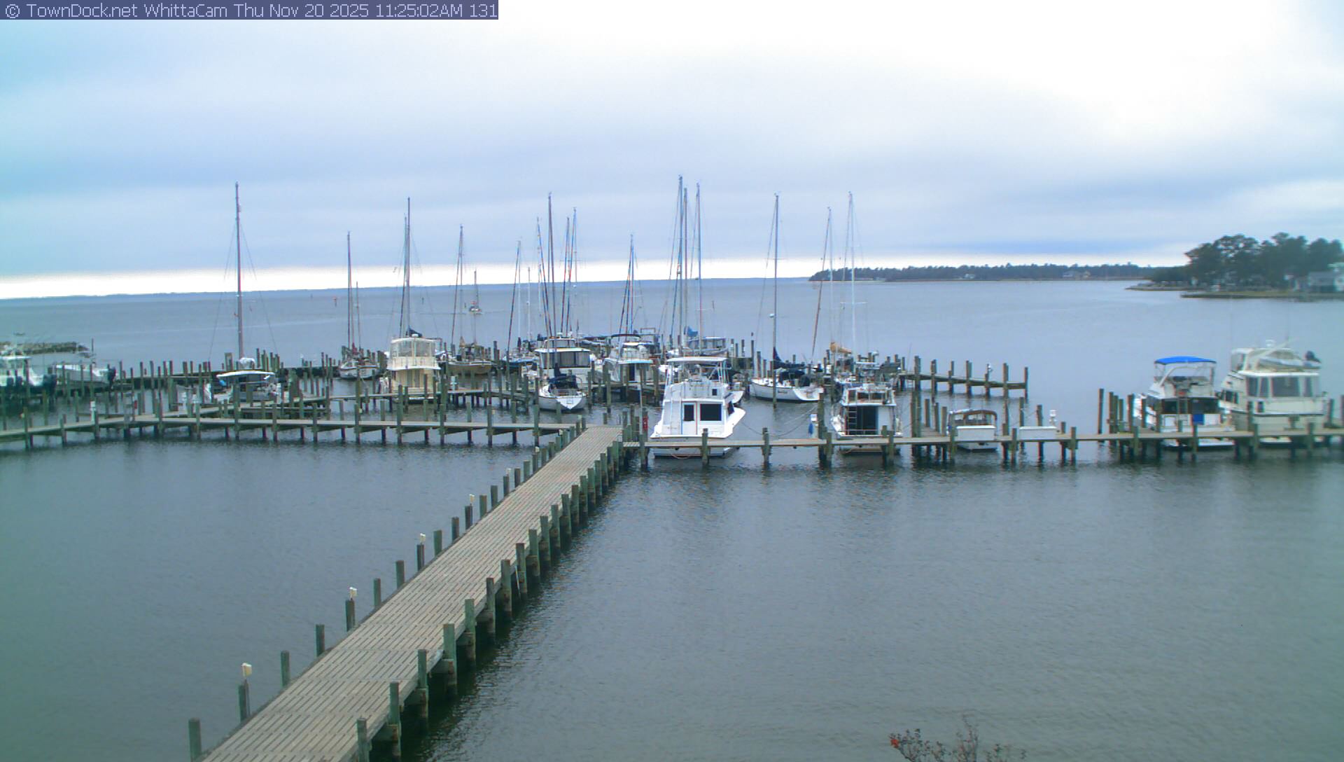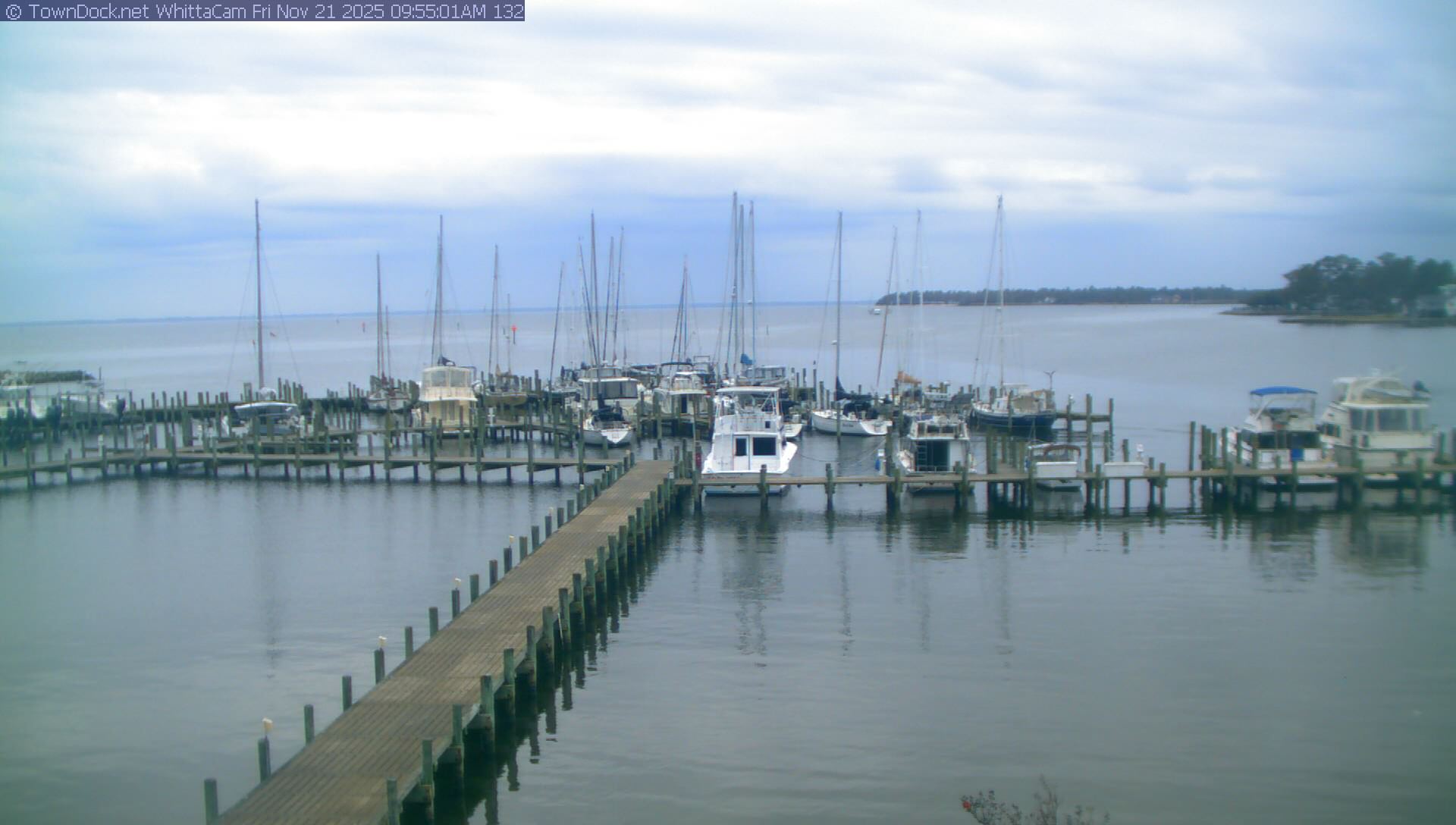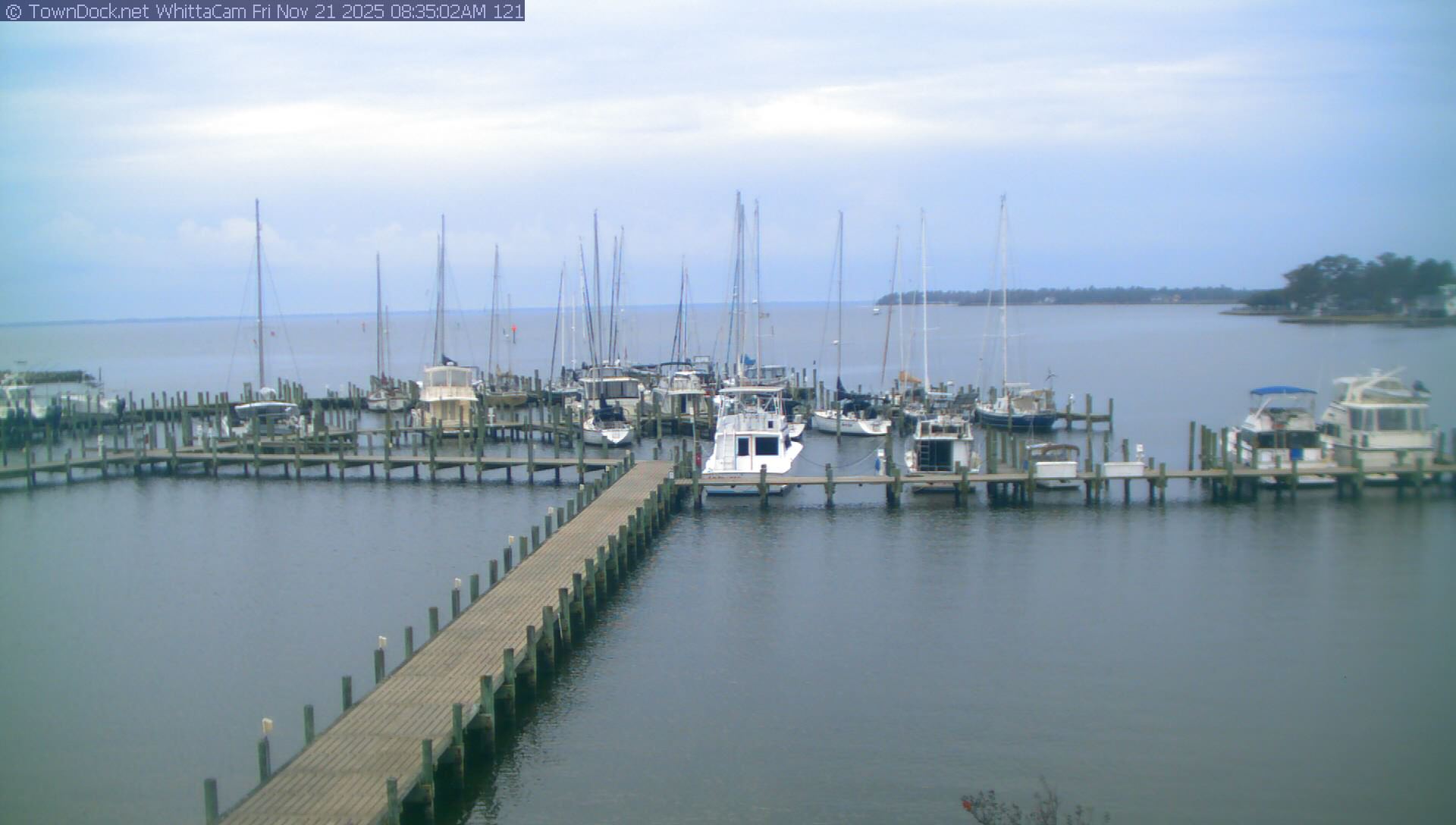 shows Whittaker Pointe Marina and the Whittaker Creek Channel entrance, with the Neuse River in the background. WhittaCam takes a new picture every five minutes from dawn til just before dusk. Click on the image to see a larger version. Once you see that larger version, you can click (see arrow at right) to go back in time and see recent photos. Harbor Cam currently takes photos from 6:30am to 5:00pm.