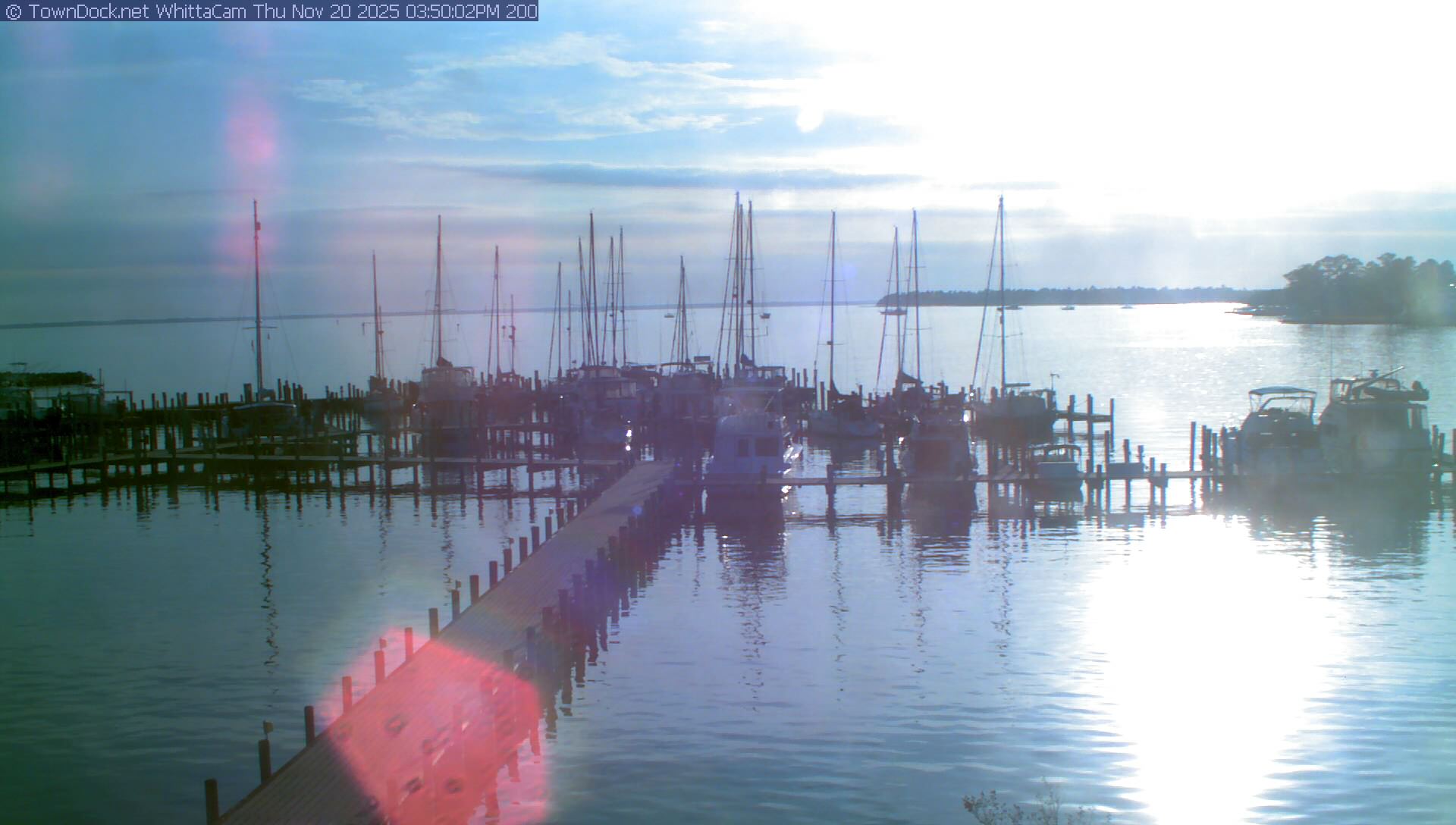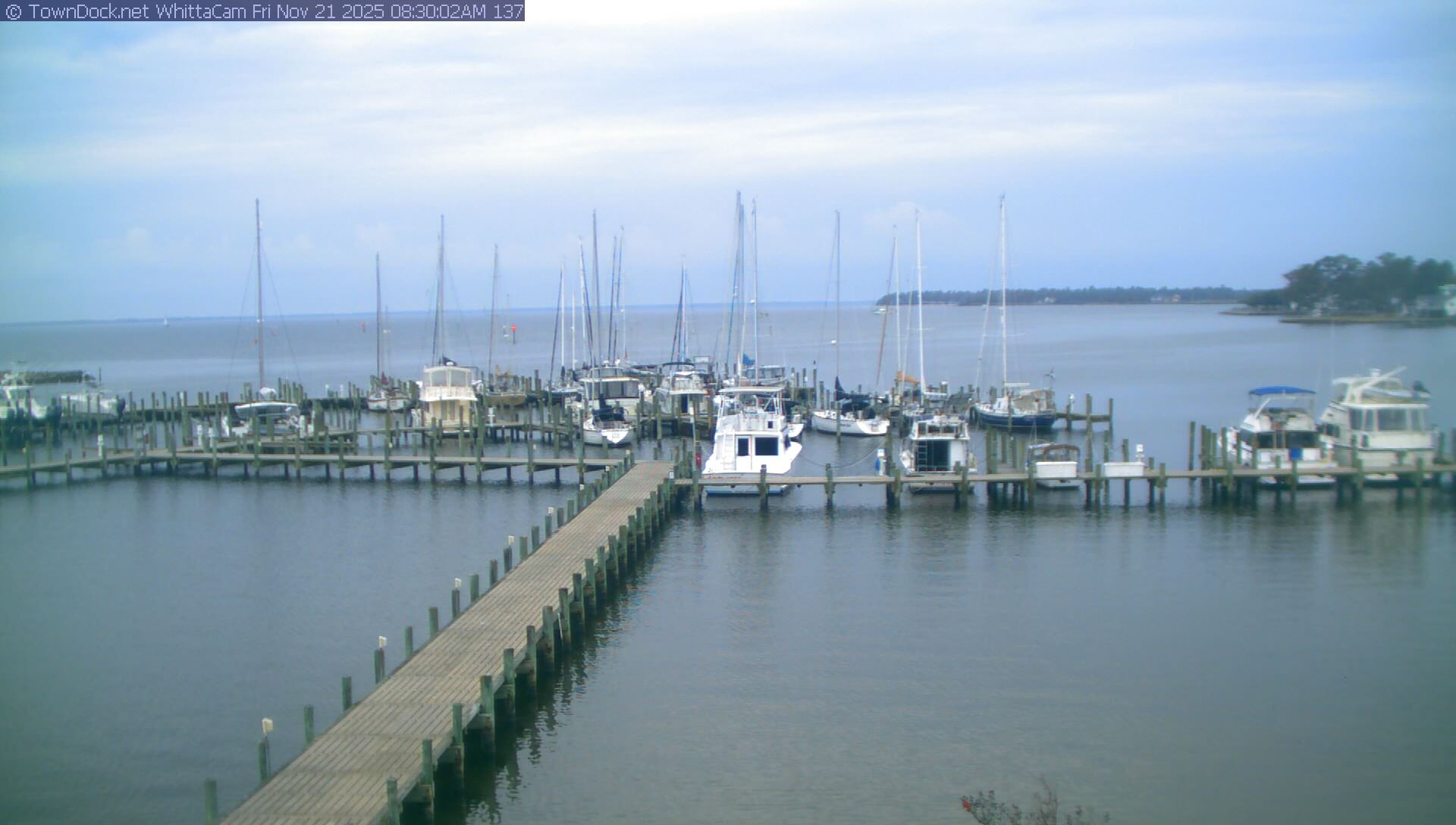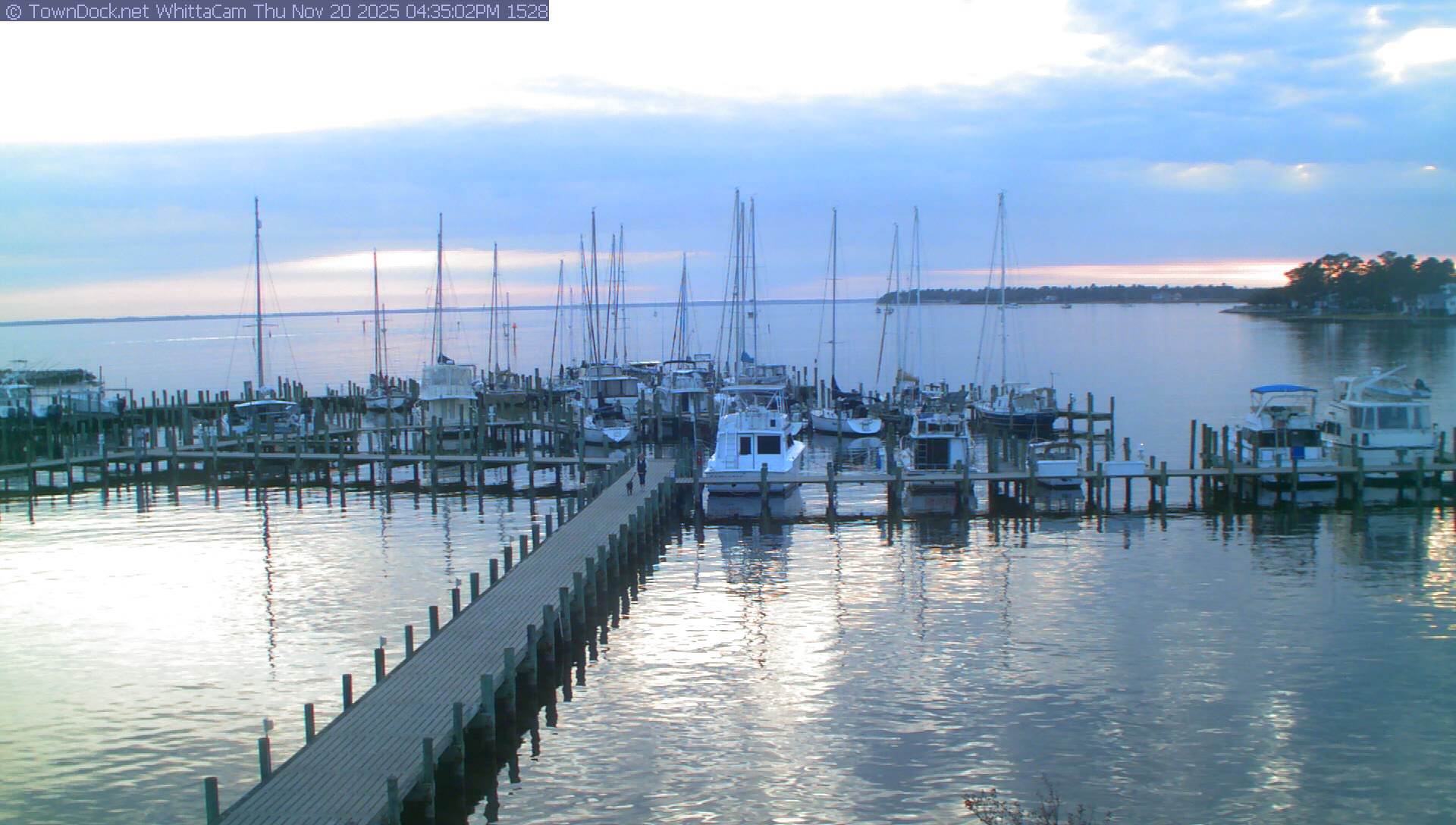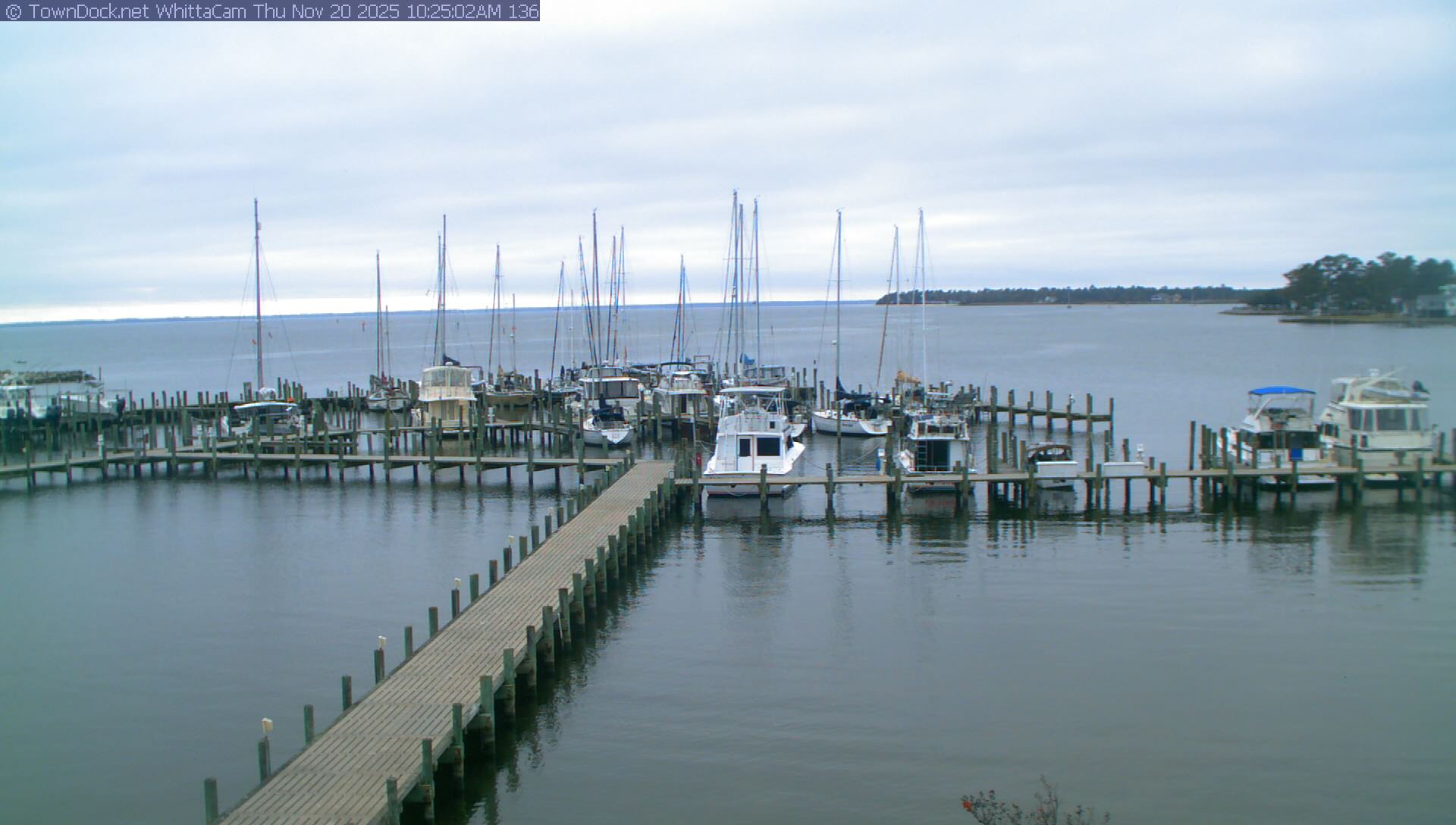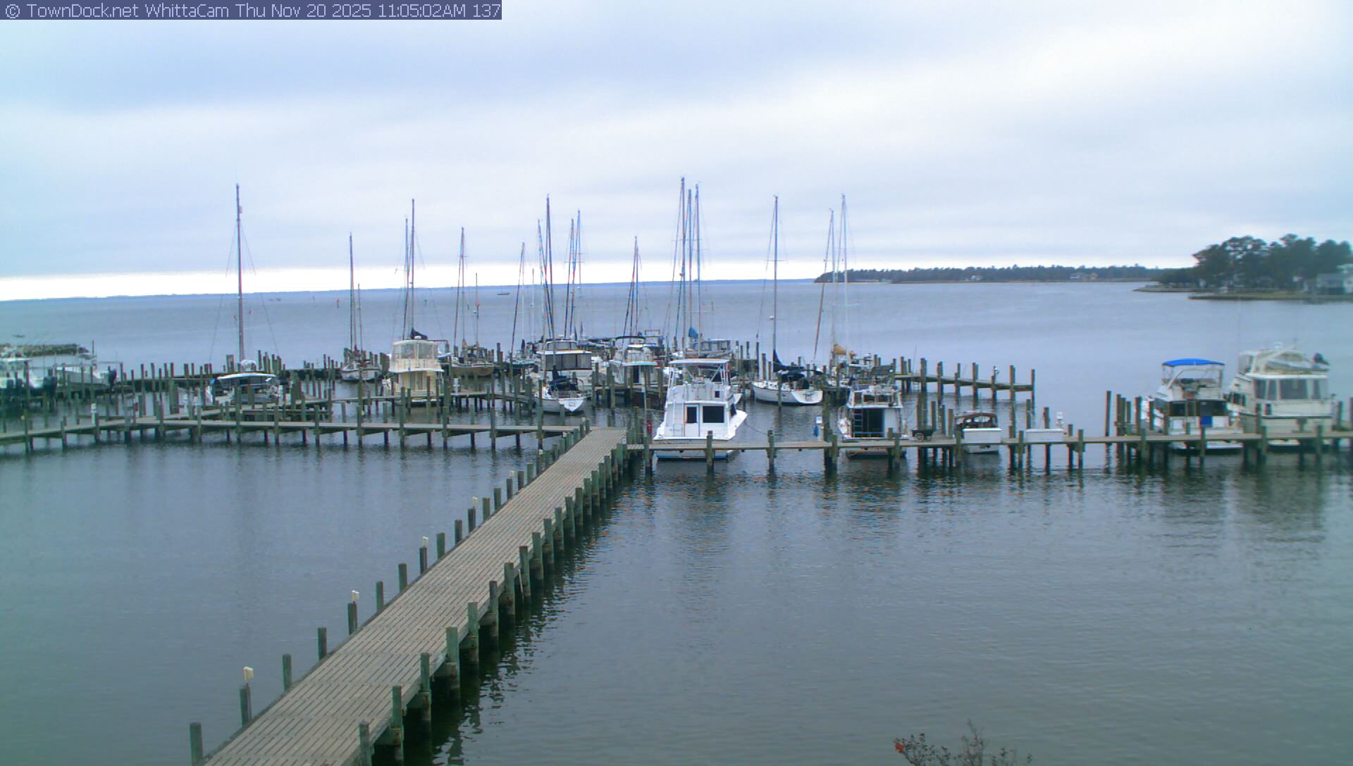 shows Whittaker Pointe Marina and the Whittaker Creek Channel entrance, with the Neuse River in the background. WhittaCam takes a new picture every five minutes from dawn til just before dusk. Click on the image to see a larger version. Once you see that larger version, you can click (see arrow at right) to go back in time and see recent photos. Harbor Cam currently takes photos from 6:30am to 5:00pm.