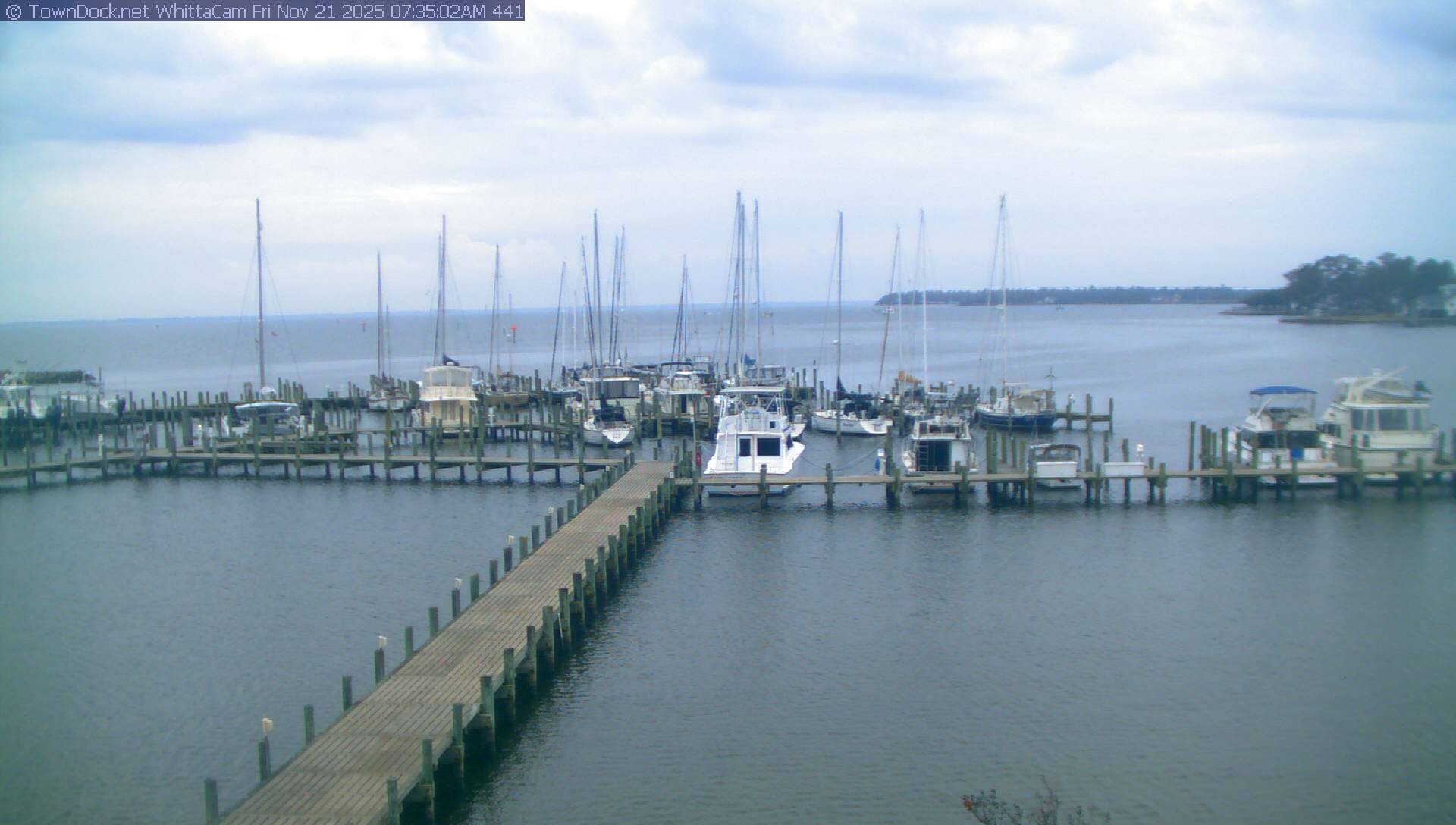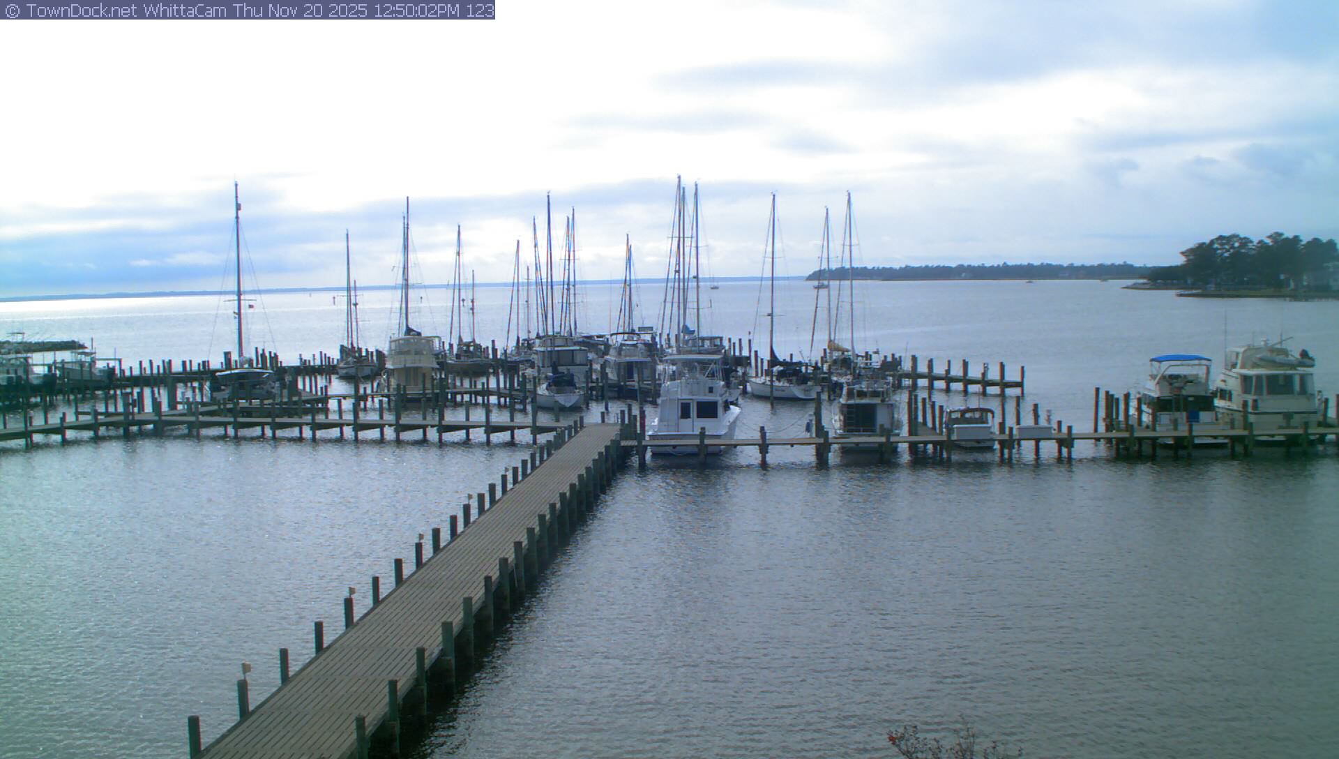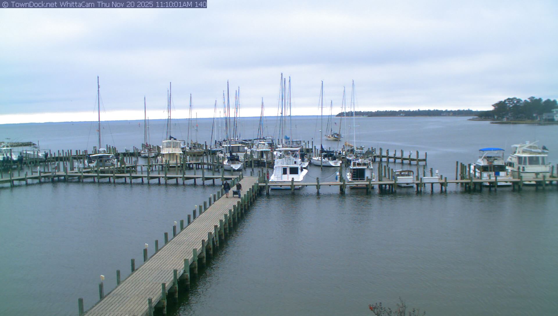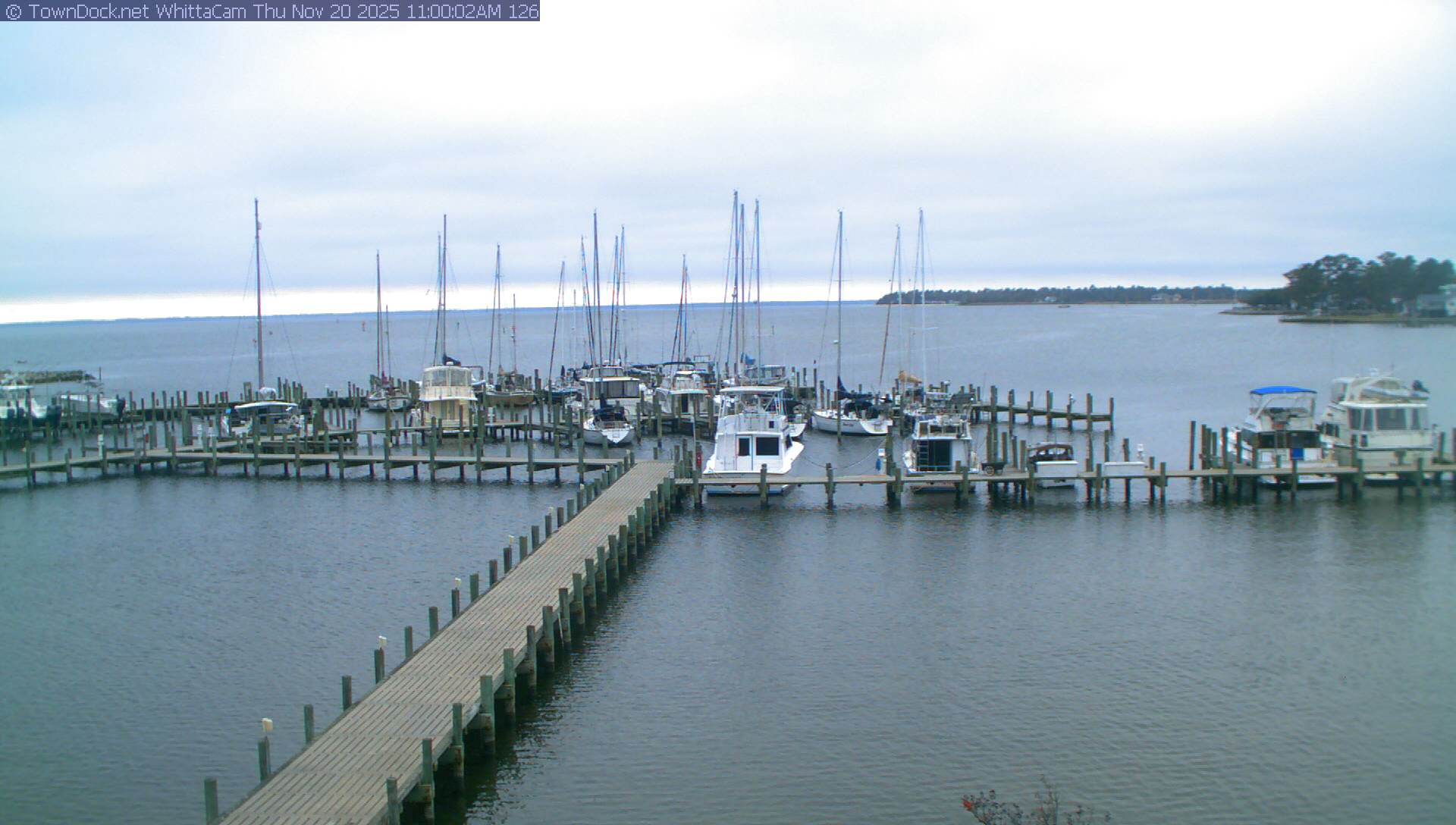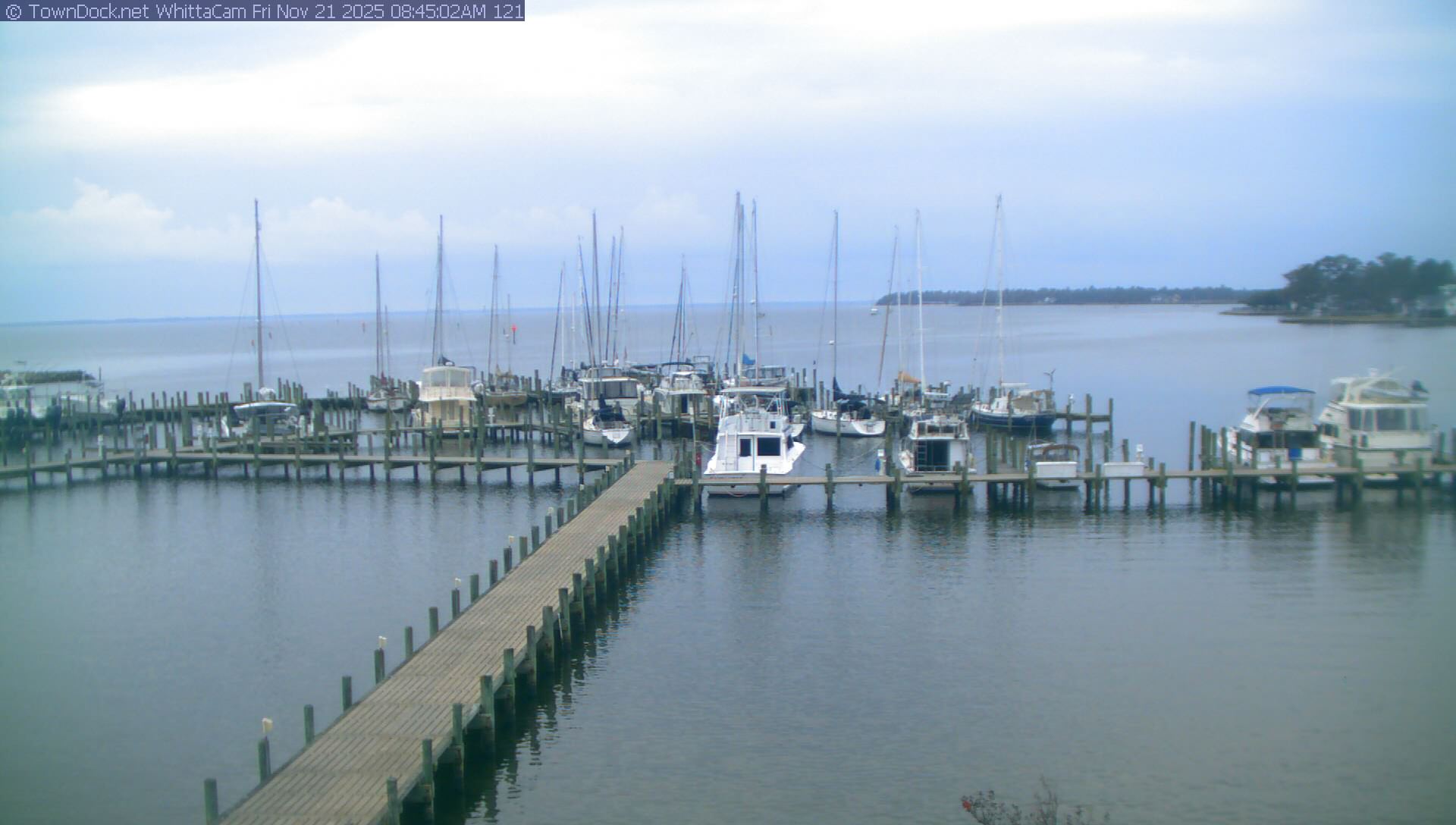 shows Whittaker Pointe Marina and the Whittaker Creek Channel entrance, with the Neuse River in the background. WhittaCam takes a new picture every five minutes from dawn til just before dusk. Click on the image to see a larger version. Once you see that larger version, you can click (see arrow at right) to go back in time and see recent photos. Harbor Cam currently takes photos from 6:30am to 5:00pm.