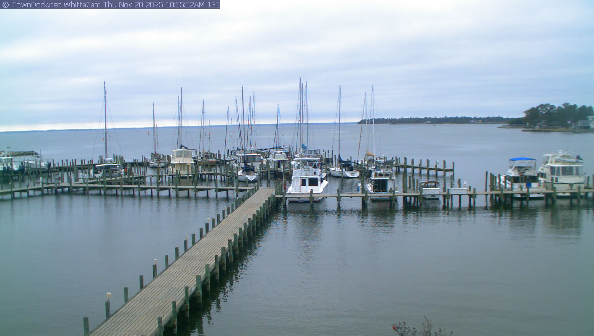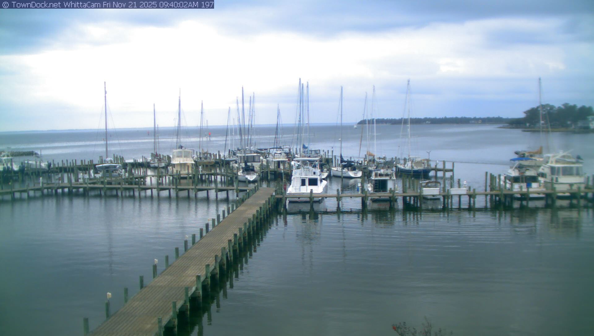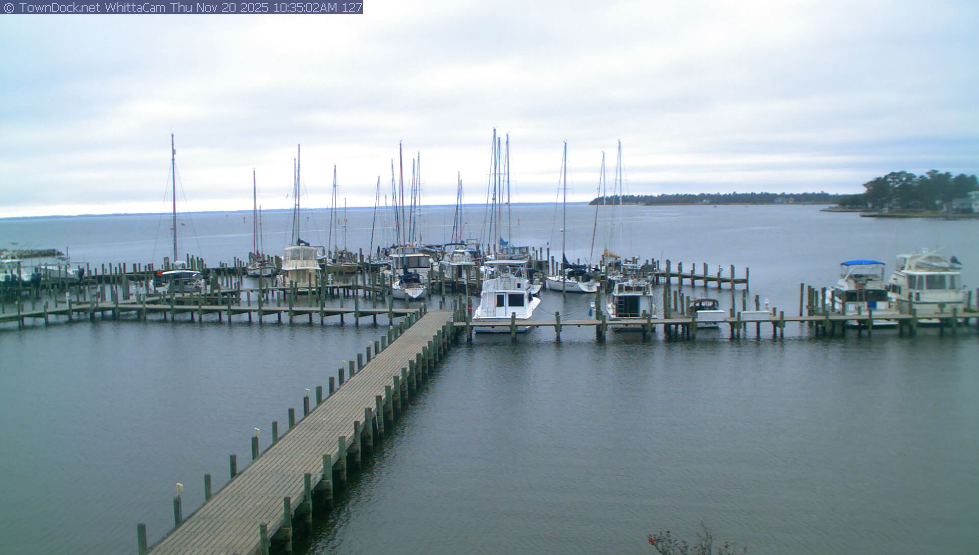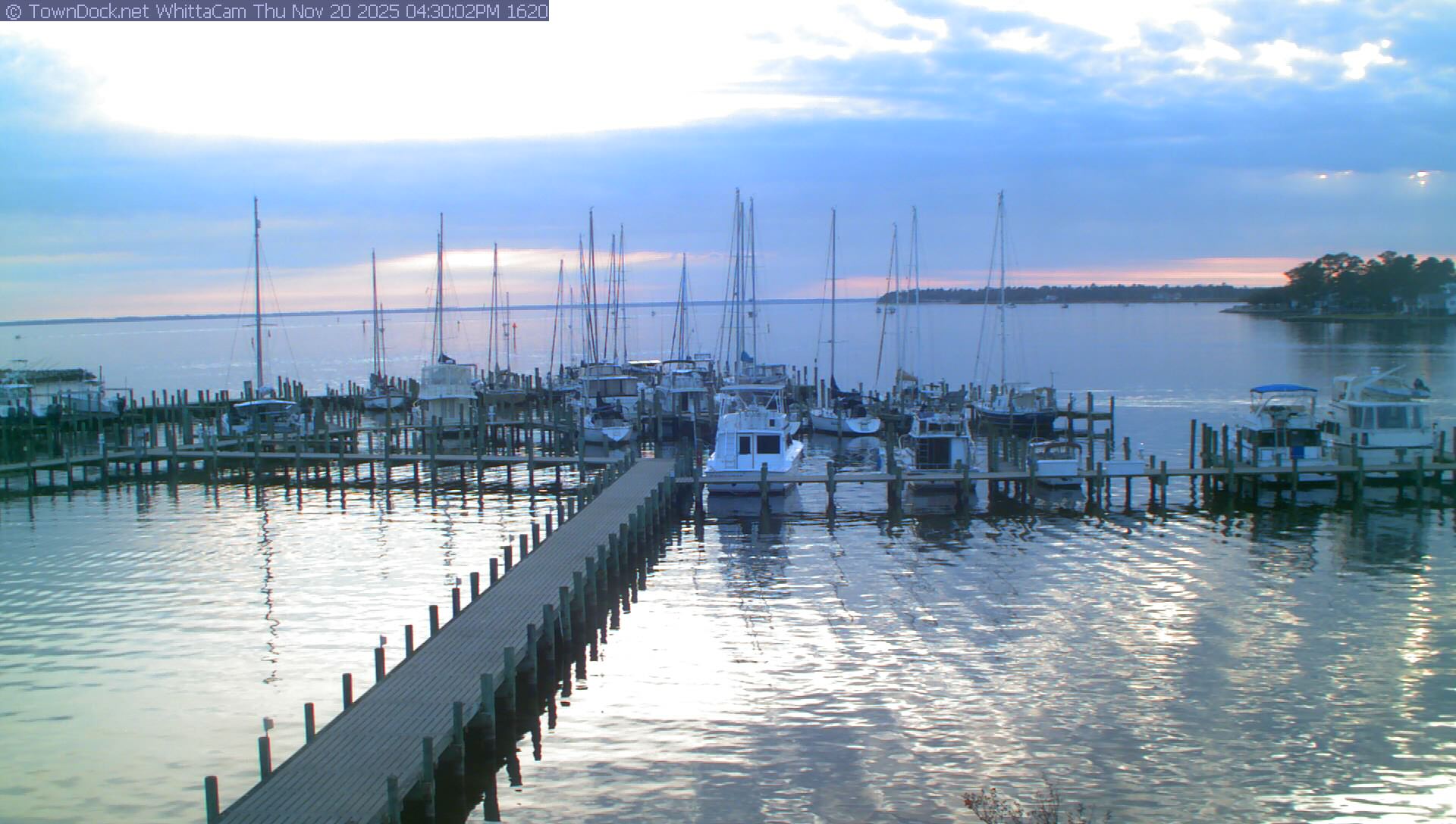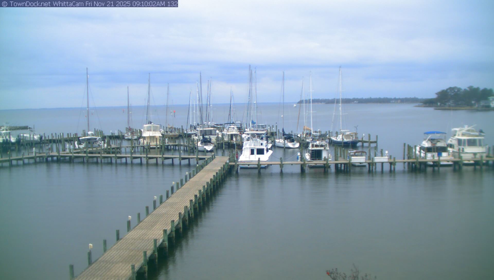 shows Whittaker Pointe Marina and the Whittaker Creek Channel entrance, with the Neuse River in the background. WhittaCam takes a new picture every five minutes from dawn til just before dusk. Click on the image to see a larger version. Once you see that larger version, you can click (see arrow at right) to go back in time and see recent photos. Harbor Cam currently takes photos from 6:30am to 5:00pm.