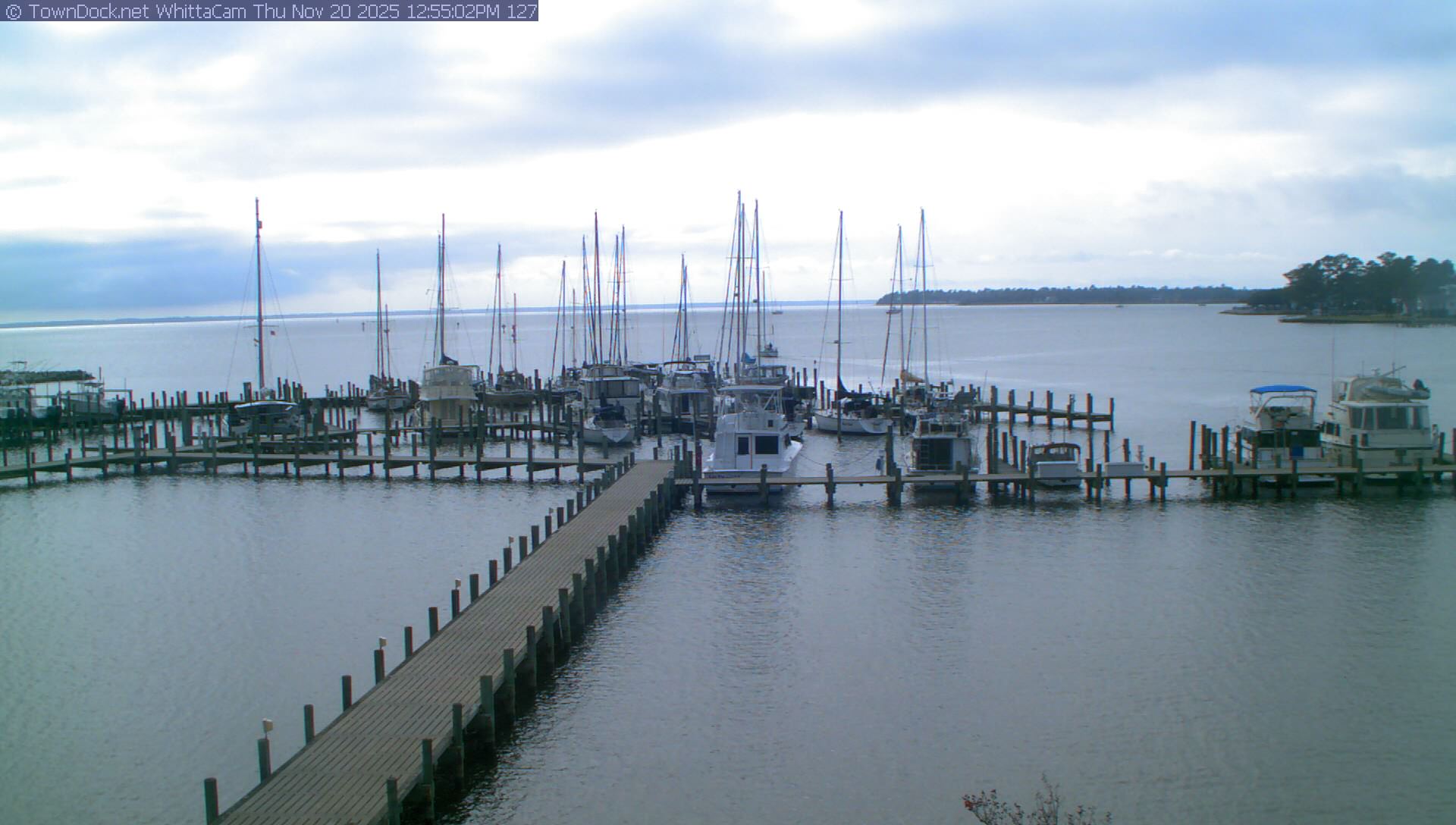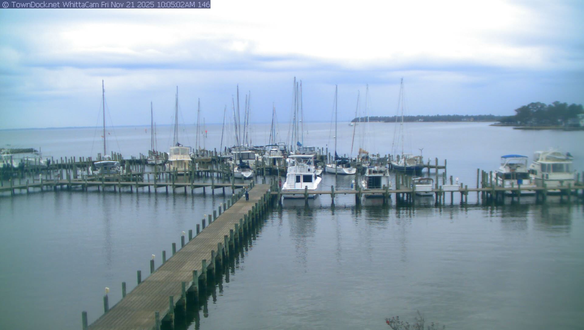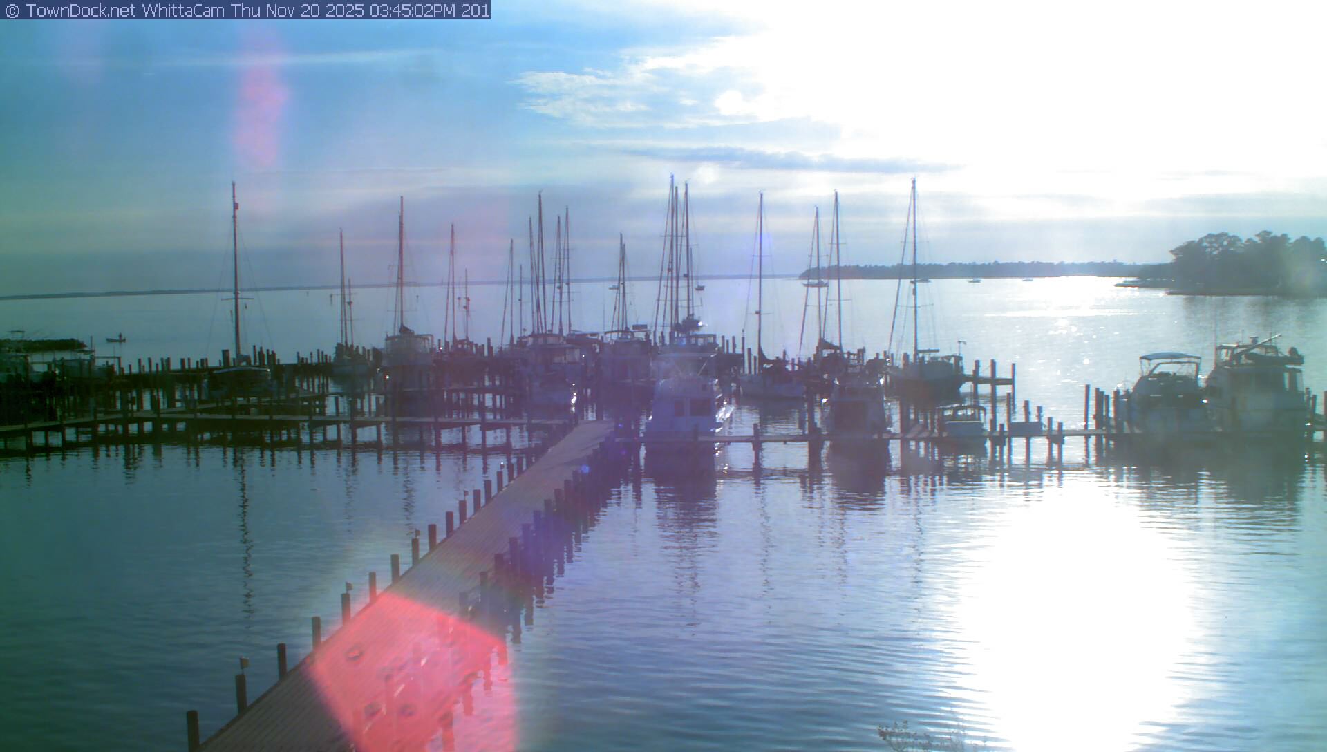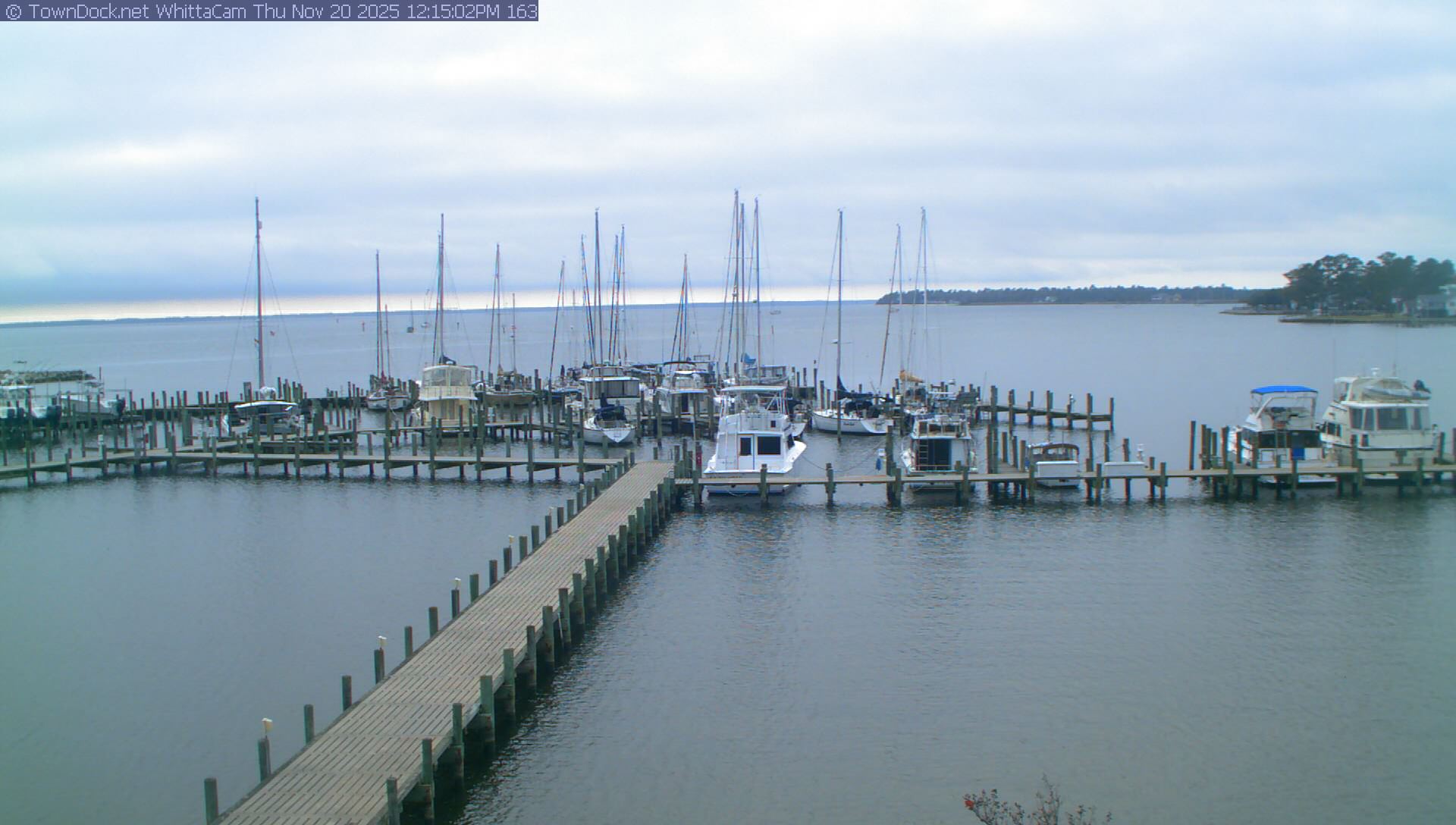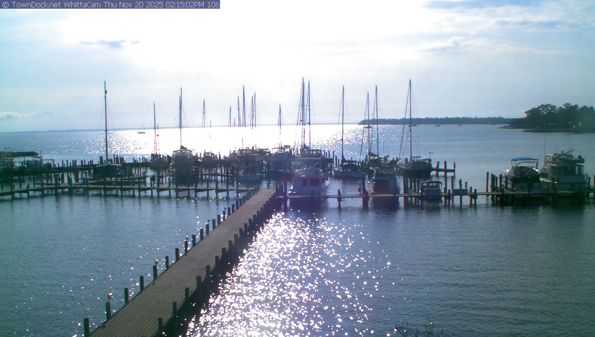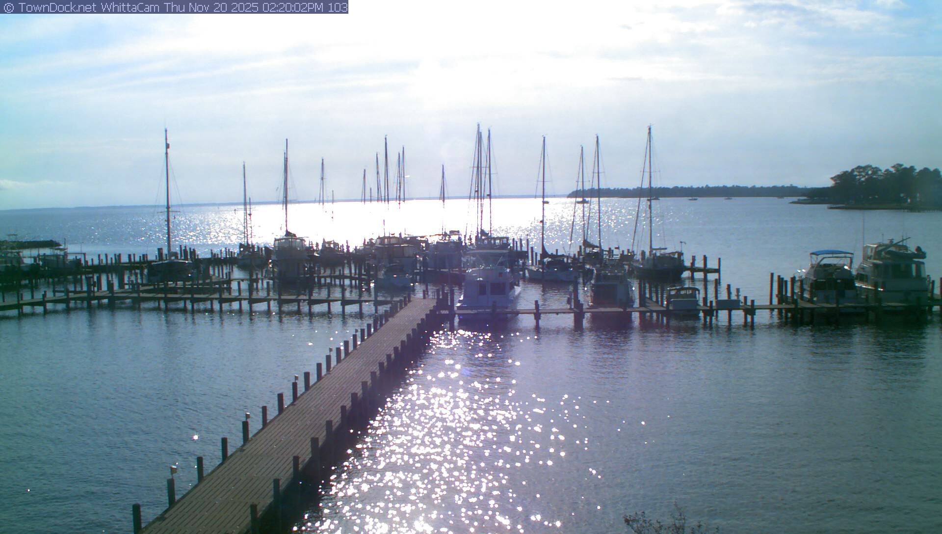 shows Whittaker Pointe Marina and the Whittaker Creek Channel entrance, with the Neuse River in the background. WhittaCam takes a new picture every five minutes from dawn til just before dusk. Click on the image to see a larger version. Once you see that larger version, you can click (see arrow at right) to go back in time and see recent photos. Harbor Cam currently takes photos from 6:30am to 5:00pm.