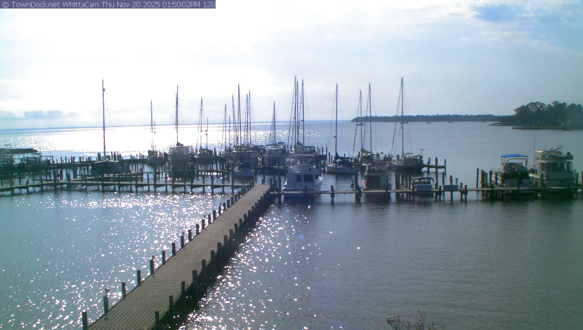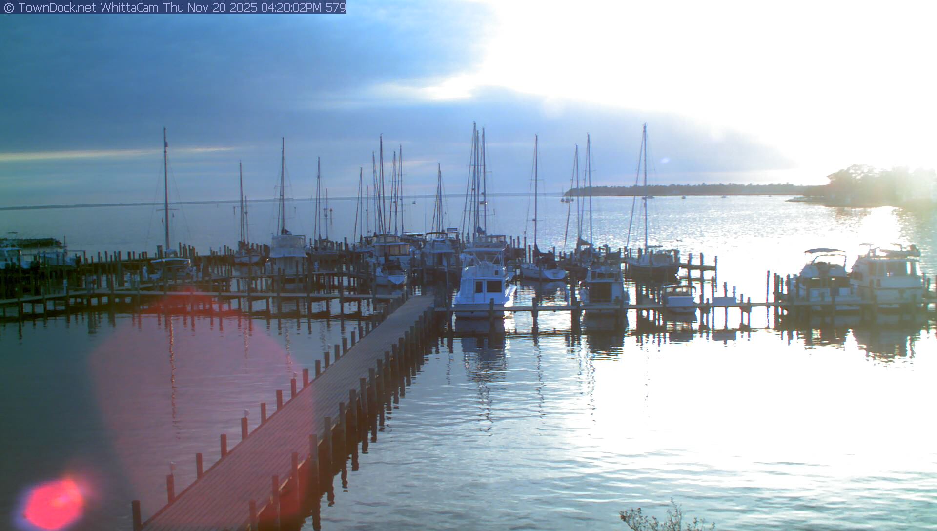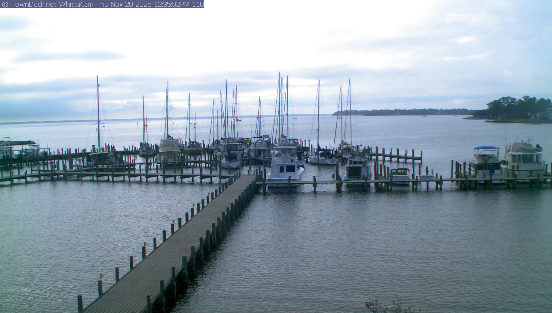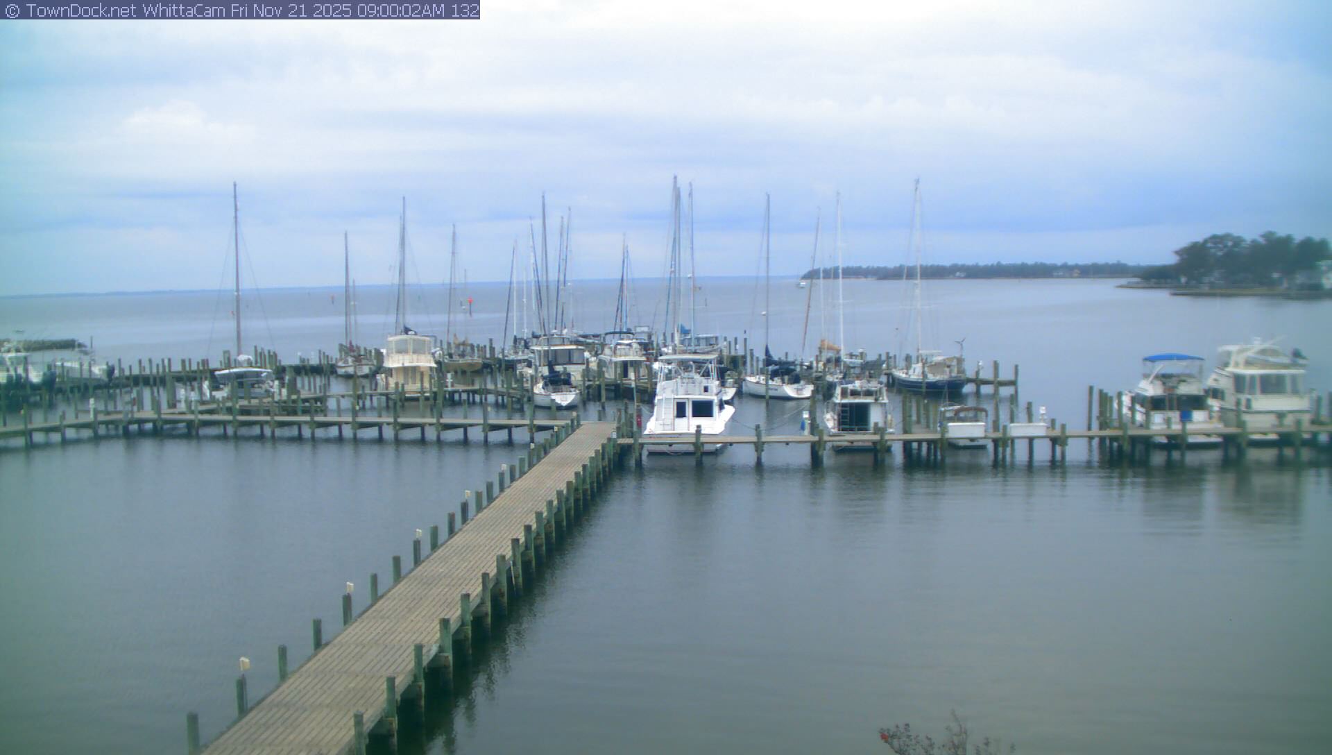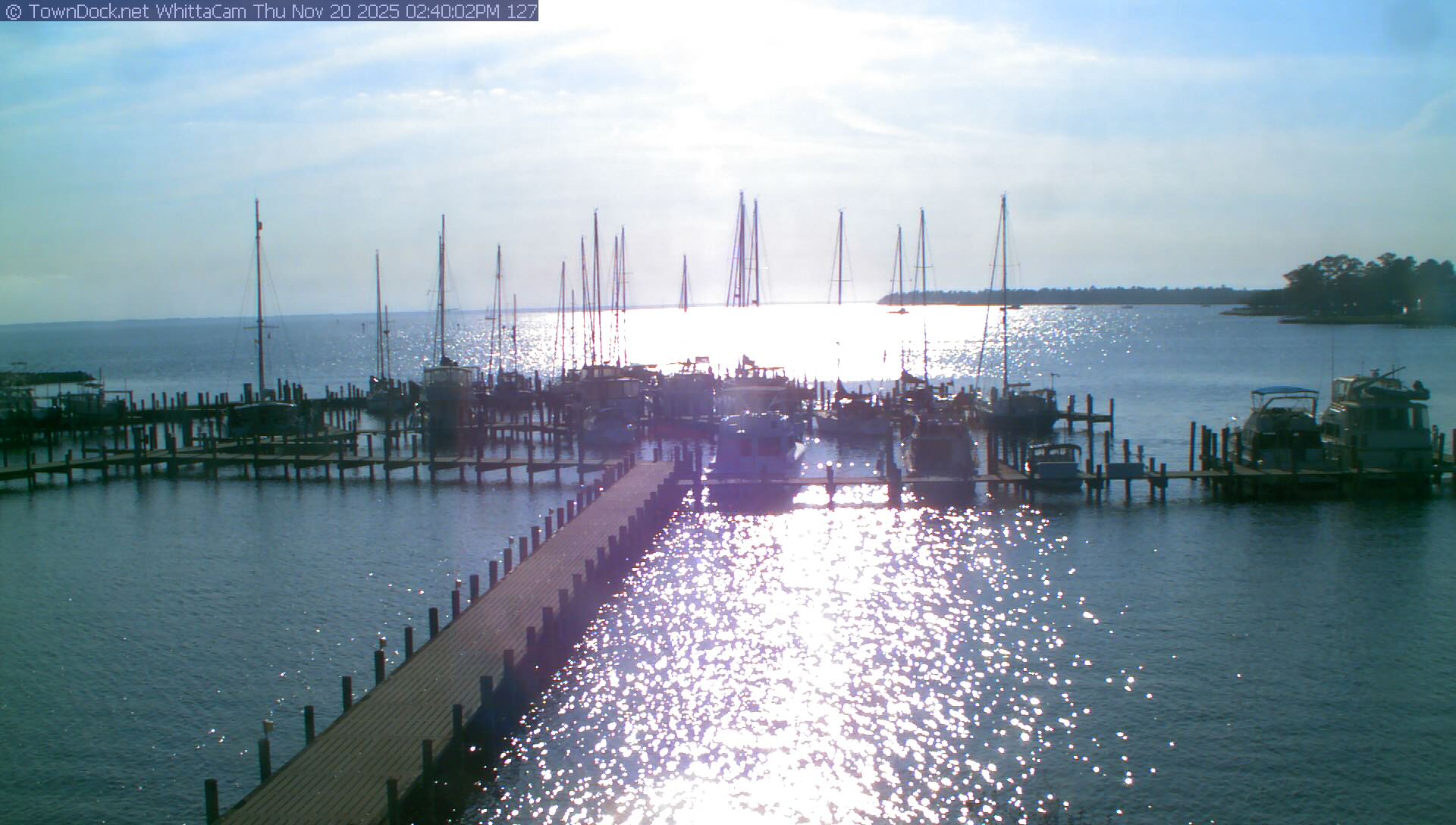 shows Whittaker Pointe Marina and the Whittaker Creek Channel entrance, with the Neuse River in the background. WhittaCam takes a new picture every five minutes from dawn til just before dusk. Click on the image to see a larger version. Once you see that larger version, you can click (see arrow at right) to go back in time and see recent photos. Harbor Cam currently takes photos from 6:30am to 5:00pm.