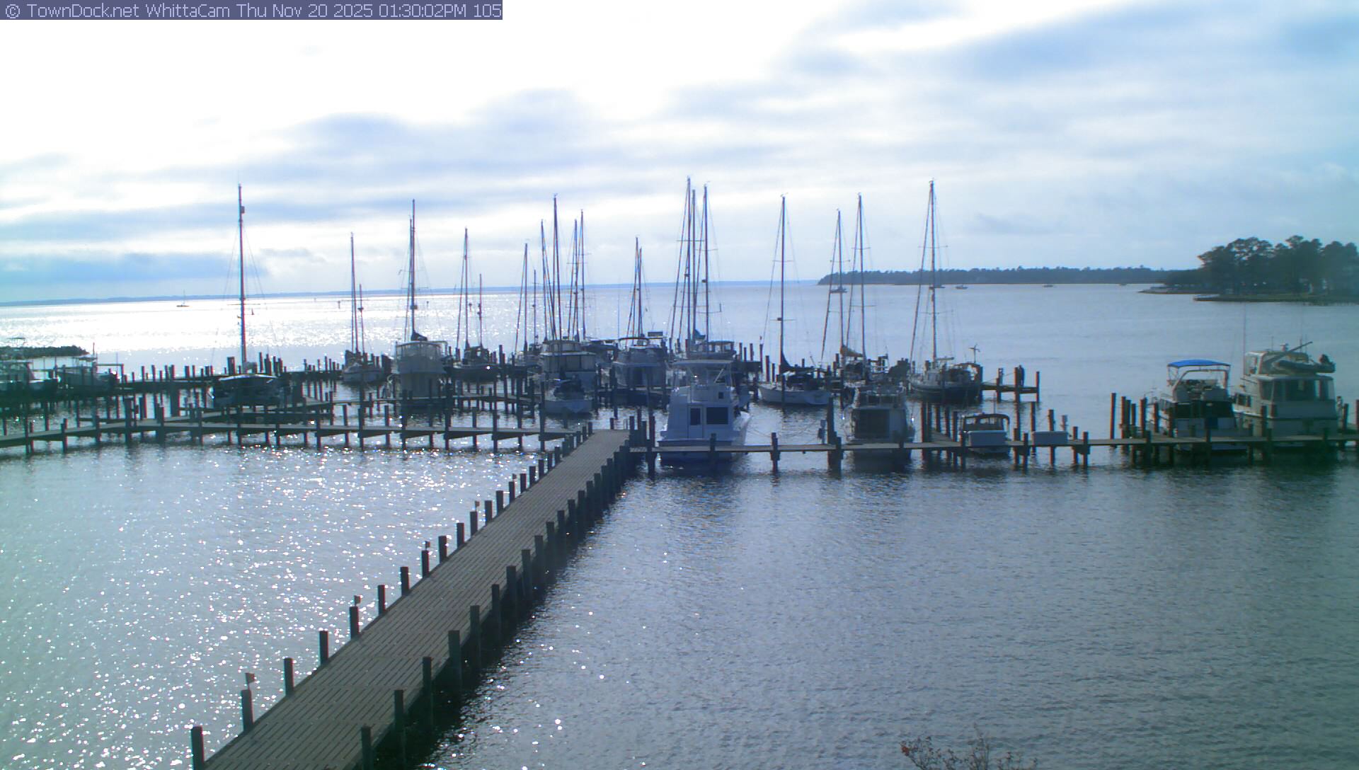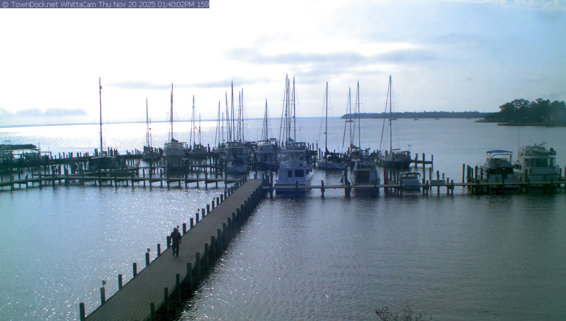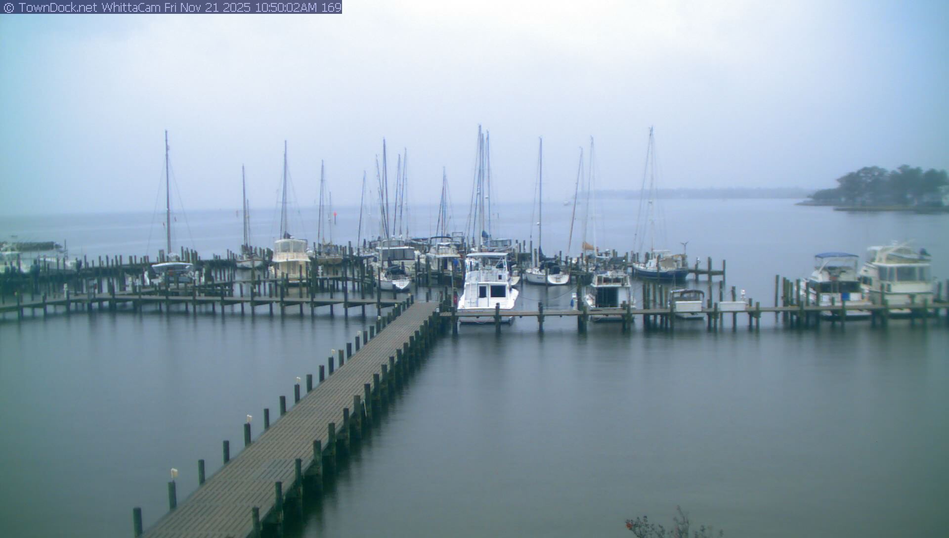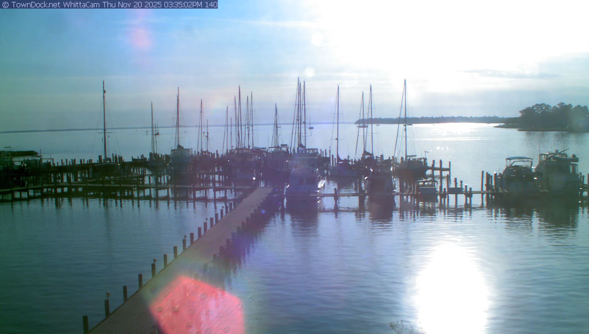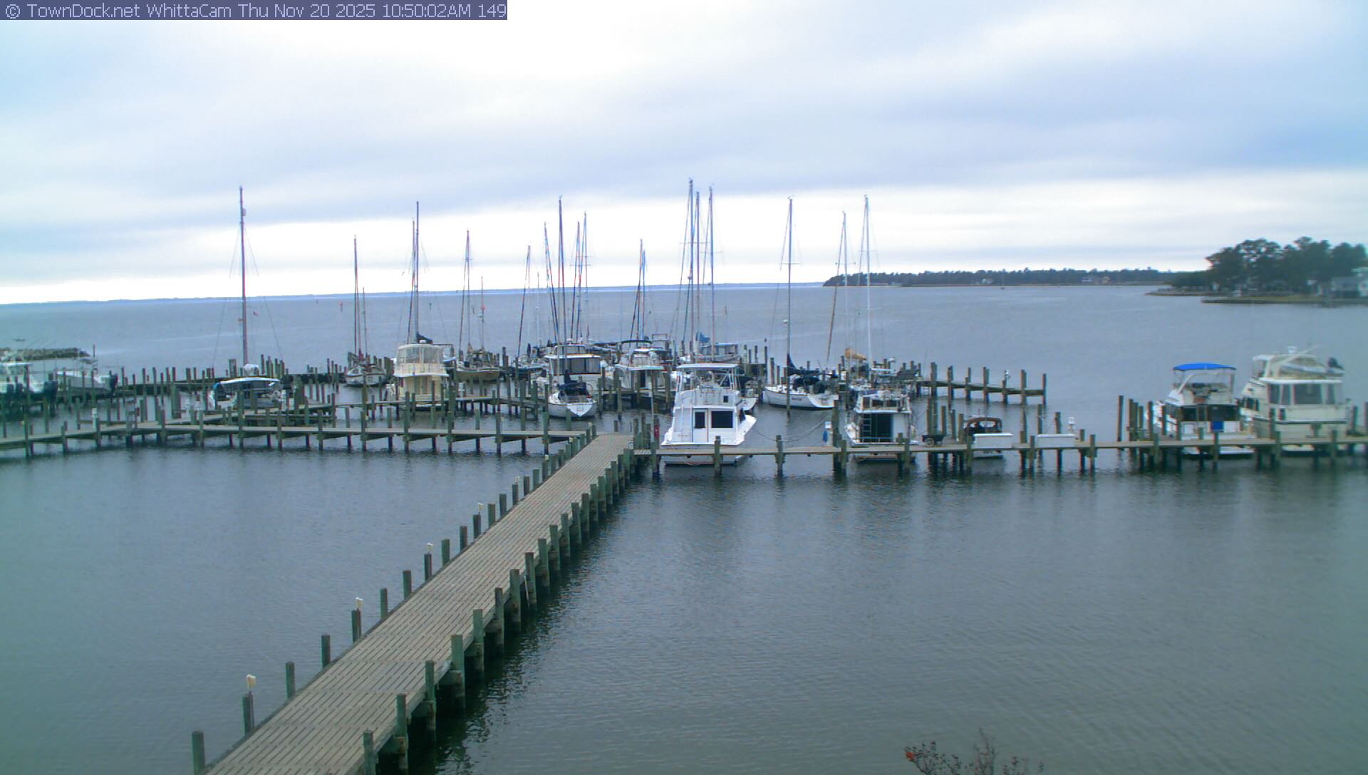 shows Whittaker Pointe Marina and the Whittaker Creek Channel entrance, with the Neuse River in the background. WhittaCam takes a new picture every five minutes from dawn til just before dusk. Click on the image to see a larger version. Once you see that larger version, you can click (see arrow at right) to go back in time and see recent photos. Harbor Cam currently takes photos from 6:30am to 5:00pm.