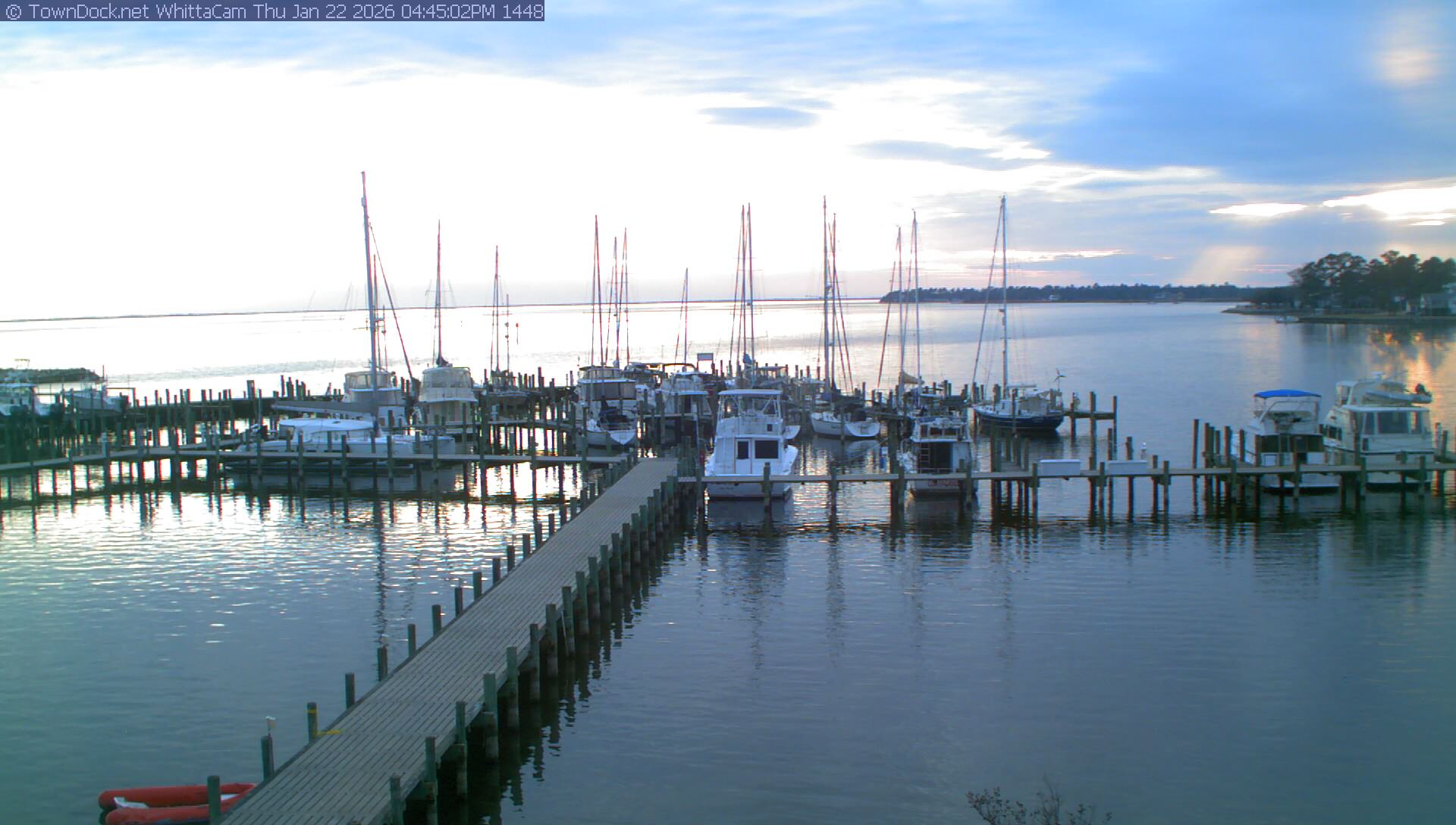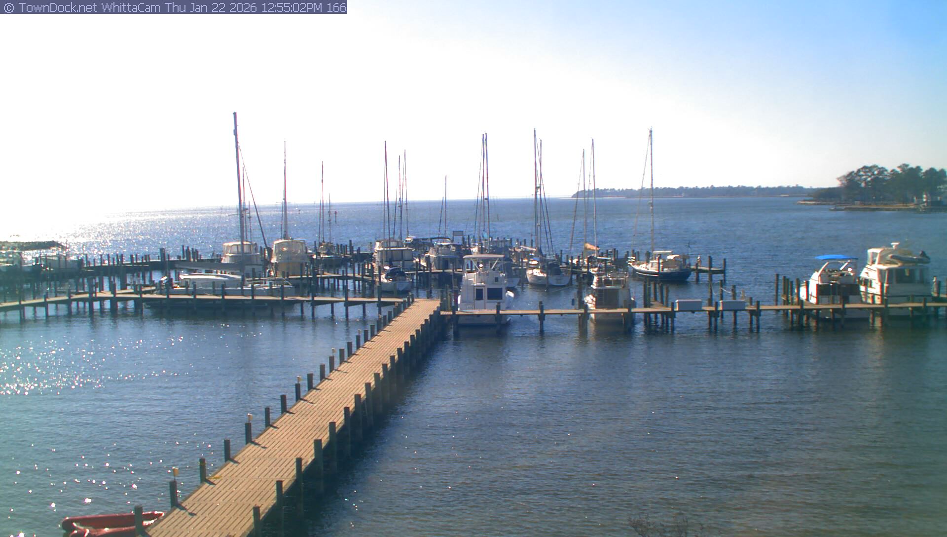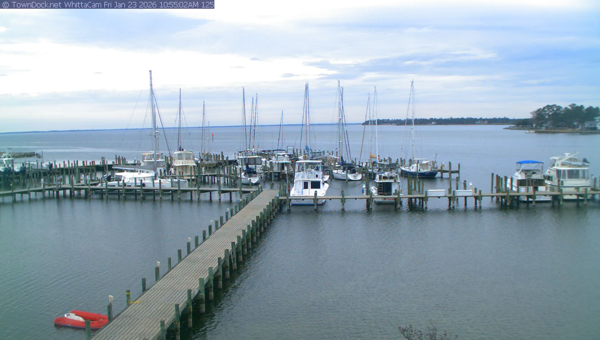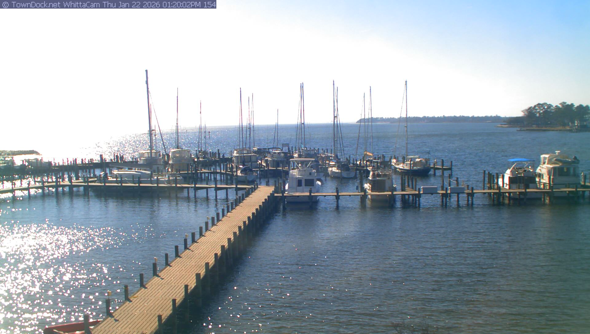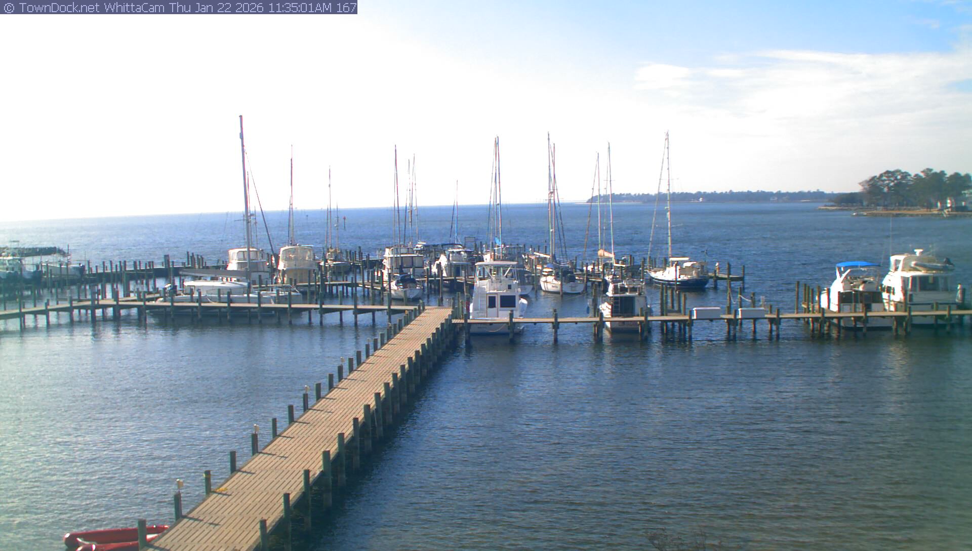 shows Whittaker Pointe Marina and the Whittaker Creek Channel entrance, with the Neuse River in the background. WhittaCam takes a new picture every five minutes from dawn til just before dusk. Click on the image to see a larger version. Once you see that larger version, you can click (see arrow at right) to go back in time and see recent photos. Harbor Cam currently takes photos from 6:00am to 5:00pm.