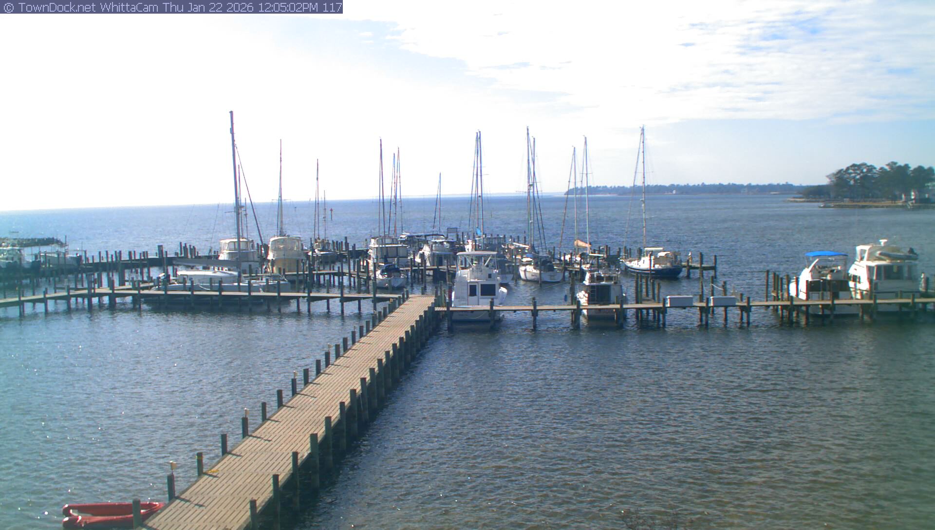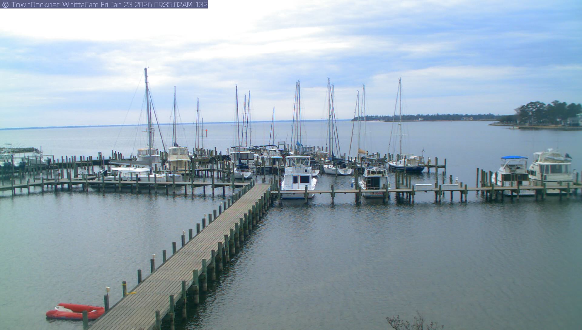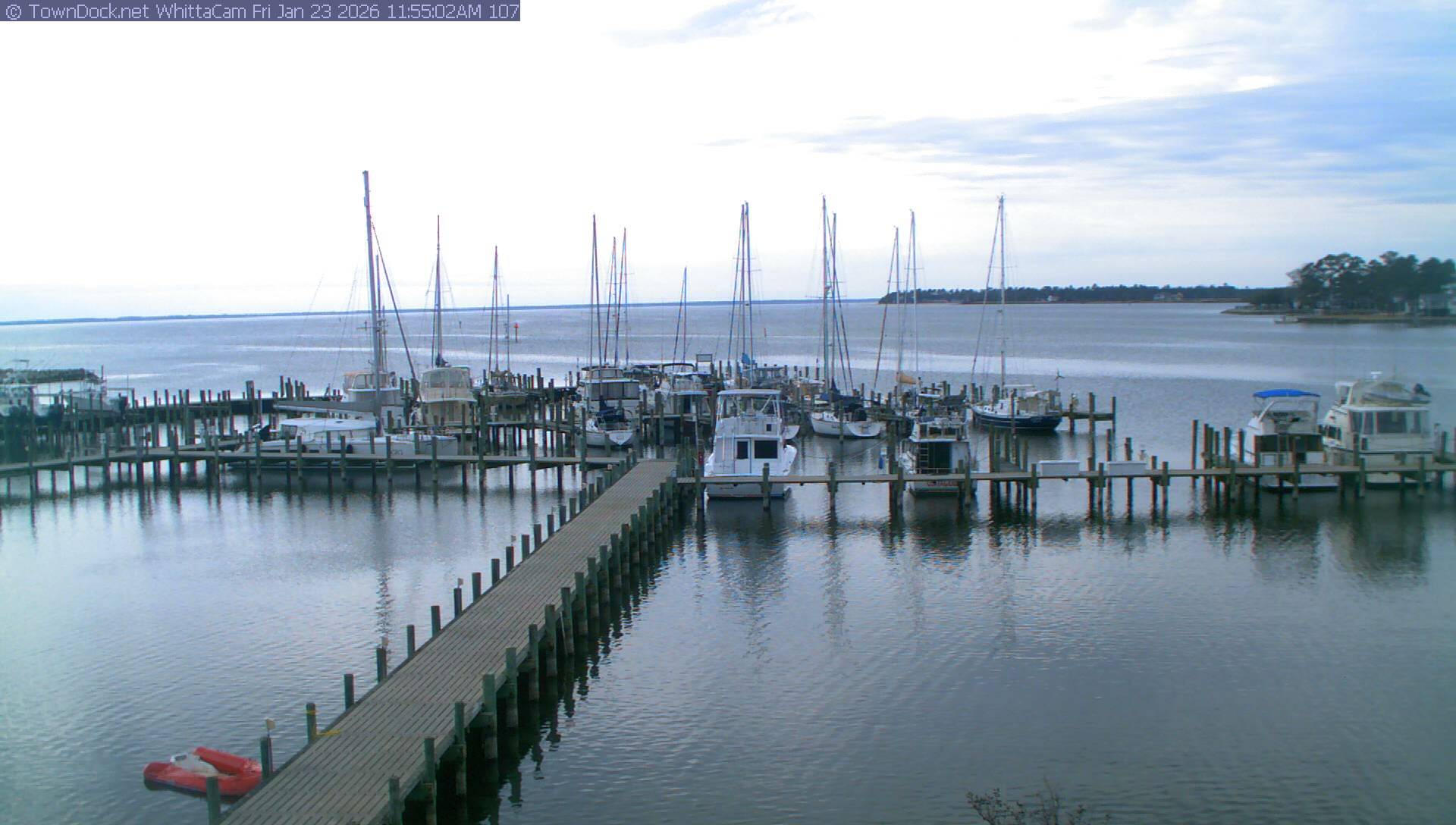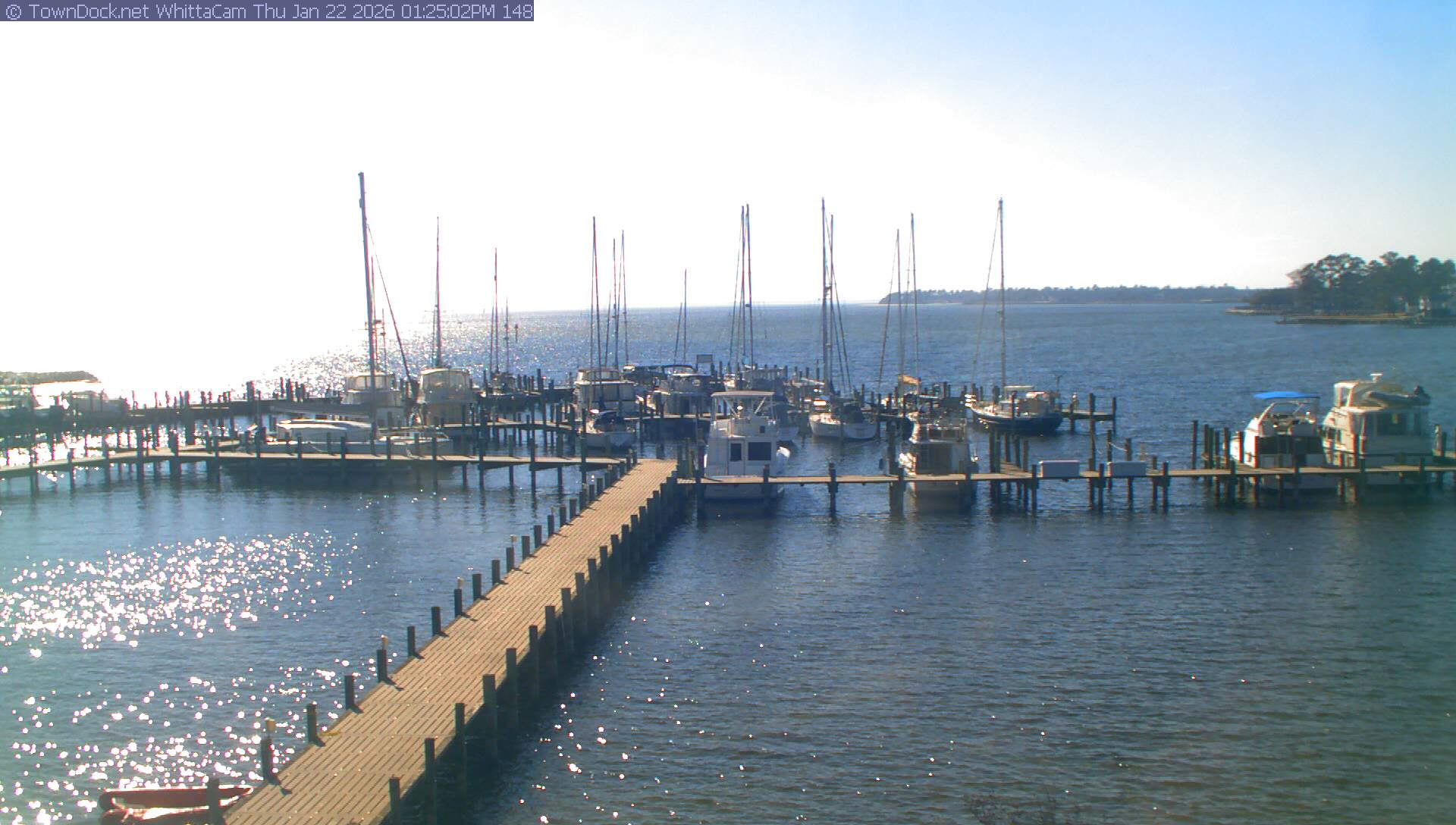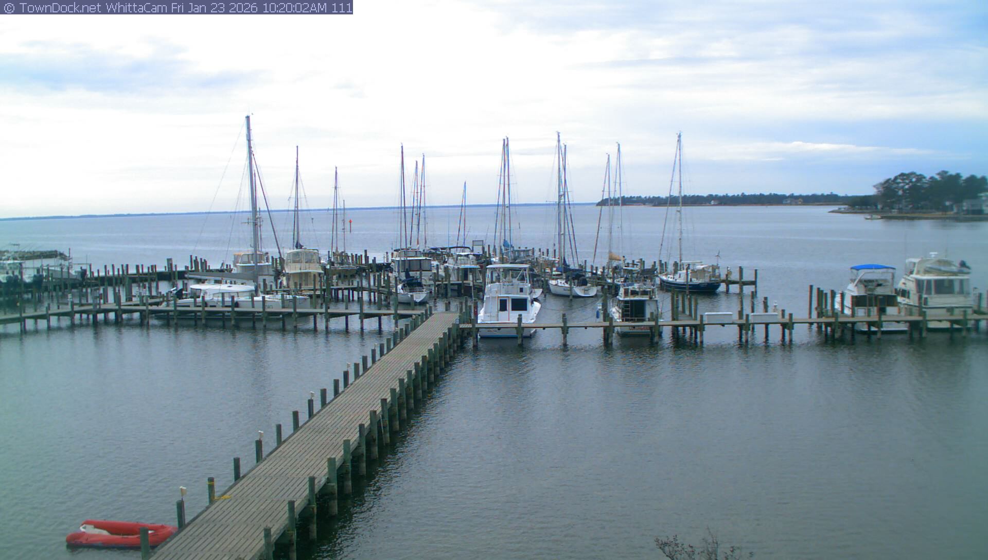 shows Whittaker Pointe Marina and the Whittaker Creek Channel entrance, with the Neuse River in the background. WhittaCam takes a new picture every five minutes from dawn til just before dusk. Click on the image to see a larger version. Once you see that larger version, you can click (see arrow at right) to go back in time and see recent photos. Harbor Cam currently takes photos from 6:00am to 5:00pm.