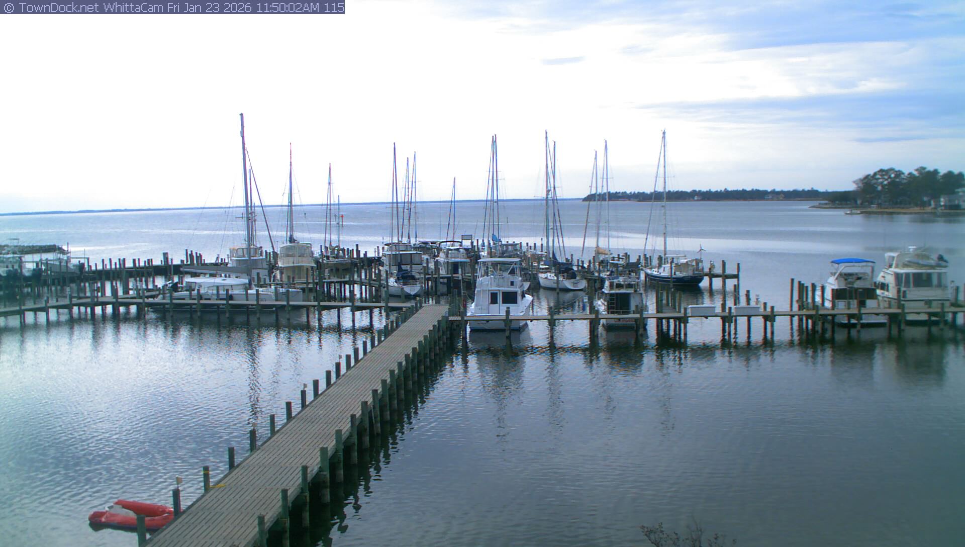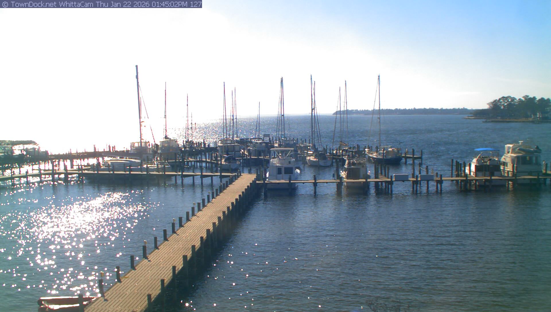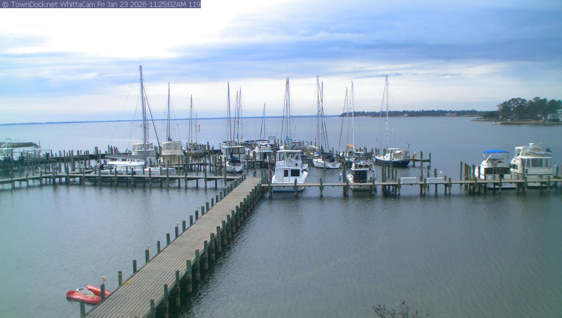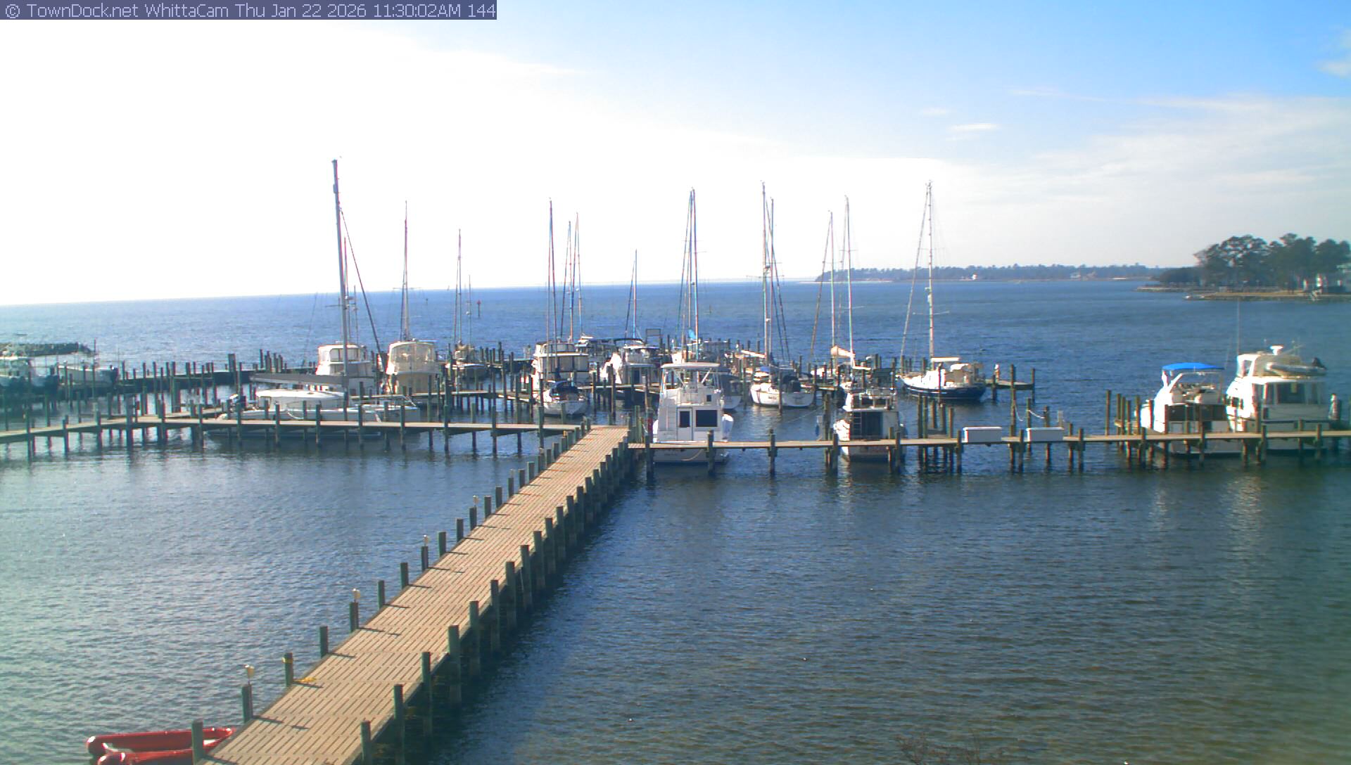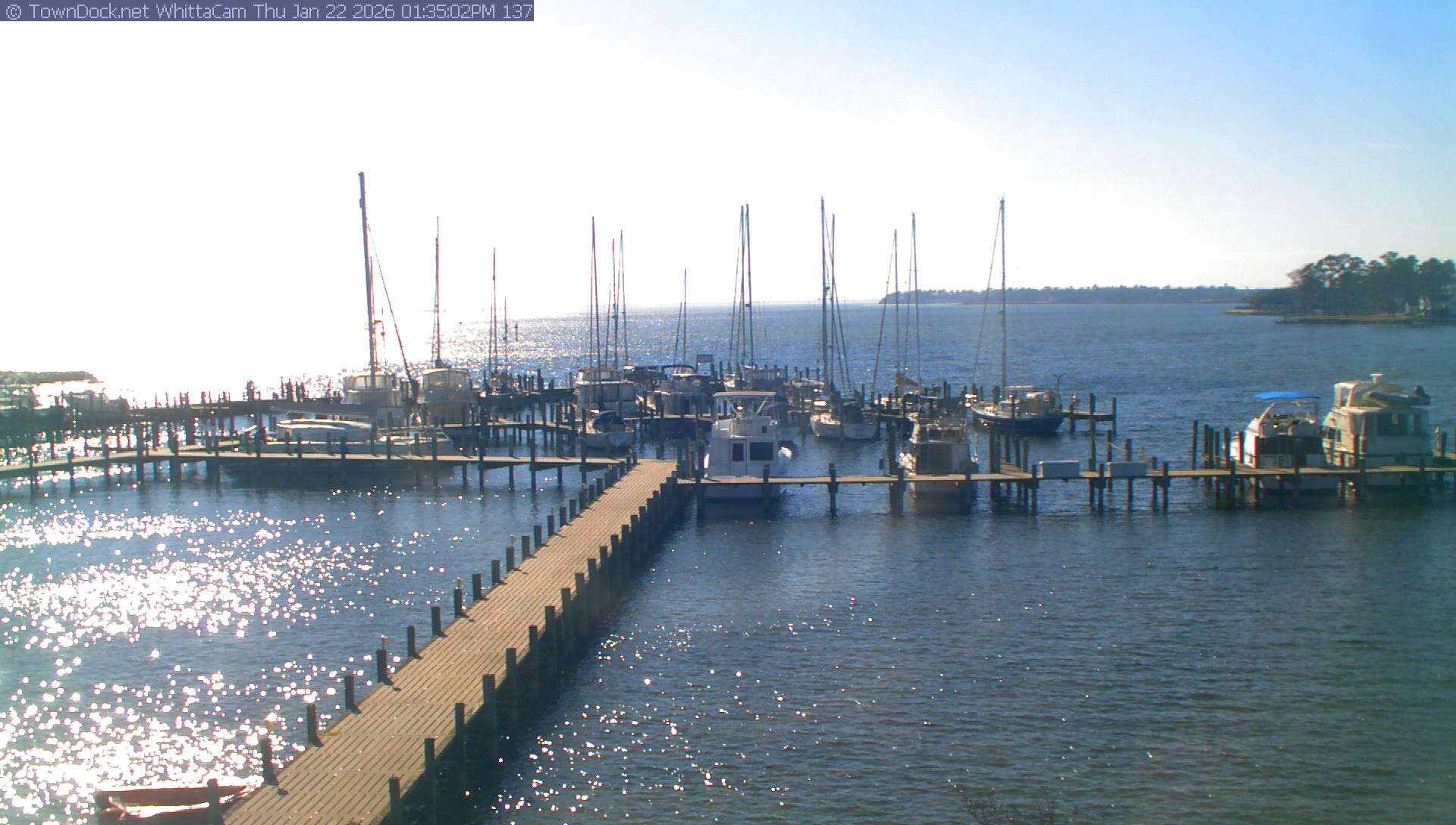 shows Whittaker Pointe Marina and the Whittaker Creek Channel entrance, with the Neuse River in the background. WhittaCam takes a new picture every five minutes from dawn til just before dusk. Click on the image to see a larger version. Once you see that larger version, you can click (see arrow at right) to go back in time and see recent photos. Harbor Cam currently takes photos from 6:00am to 5:00pm.